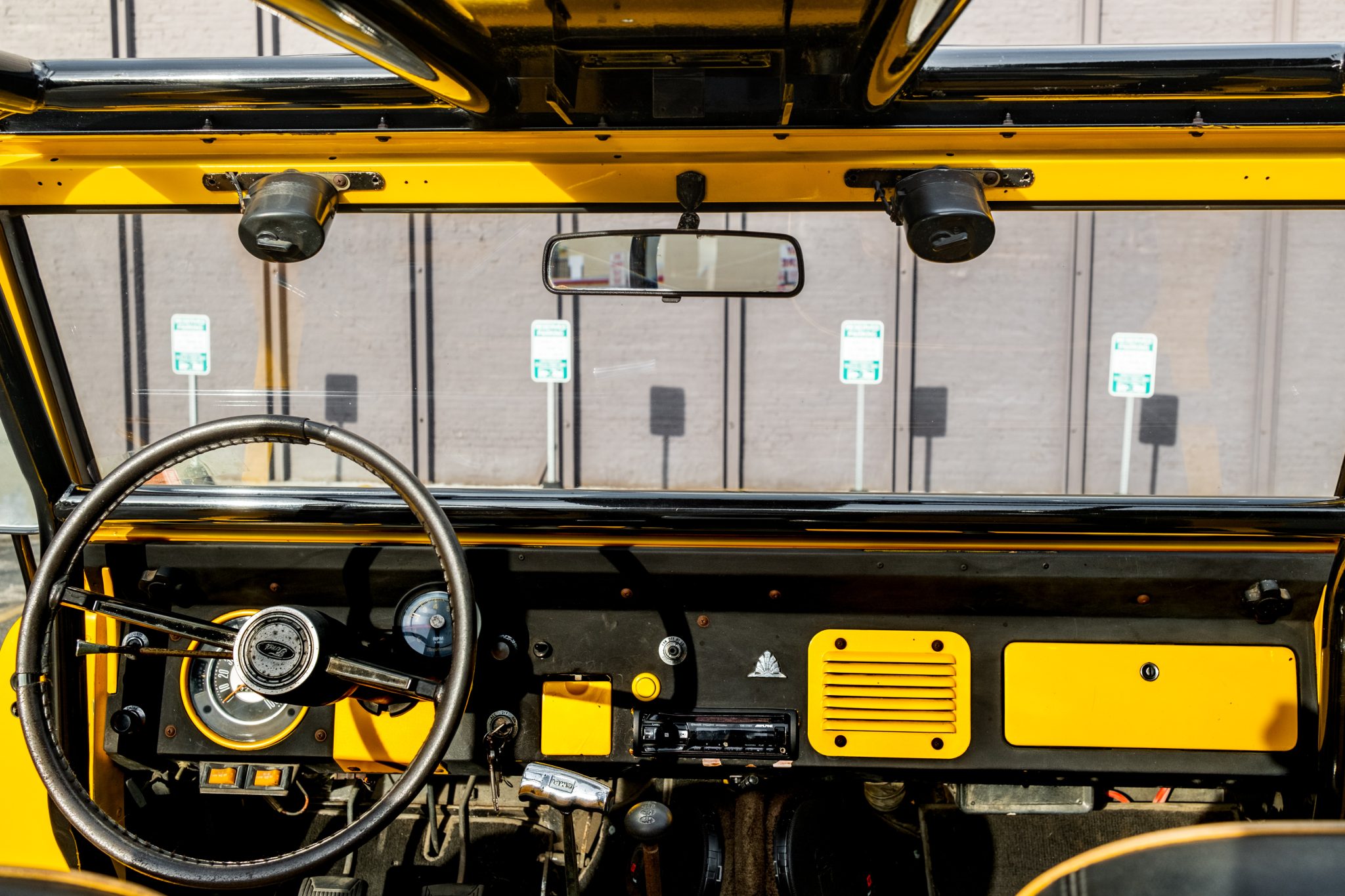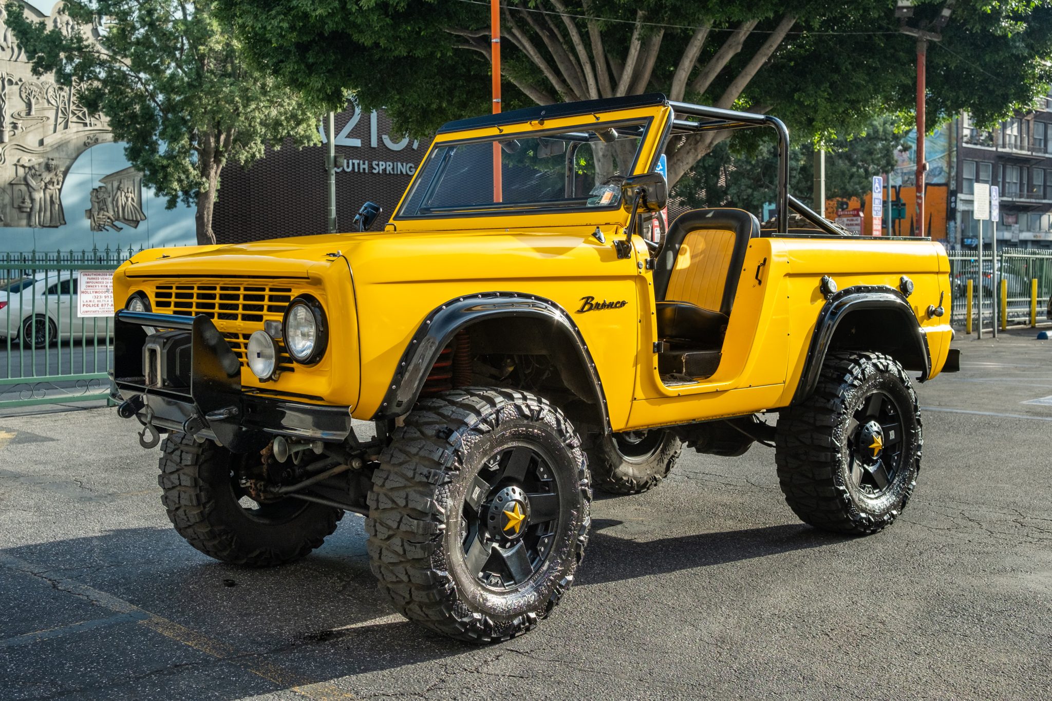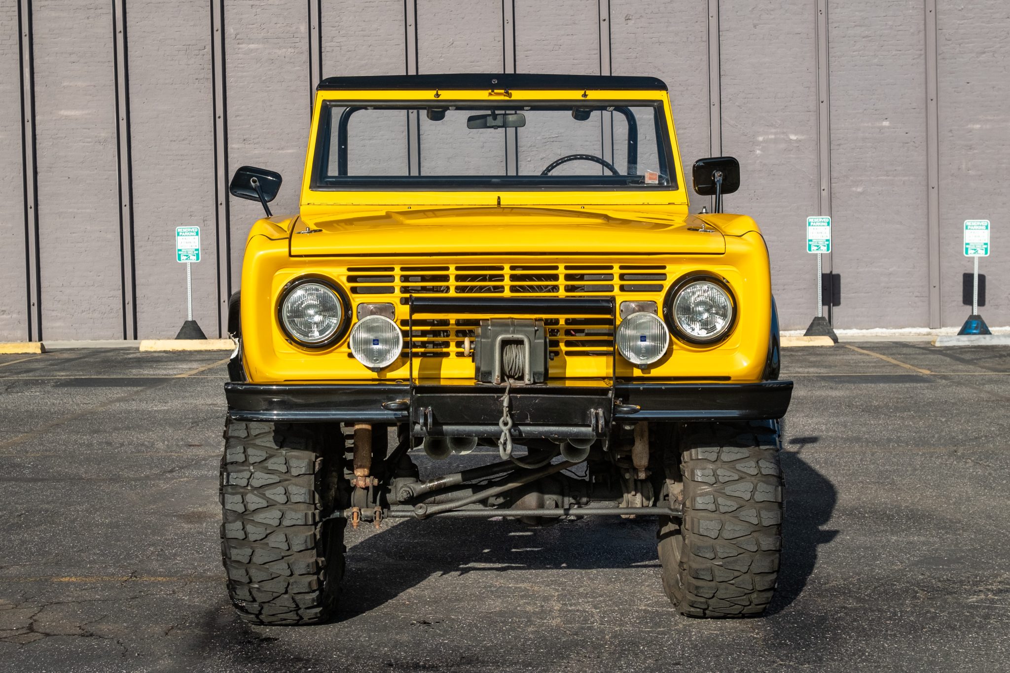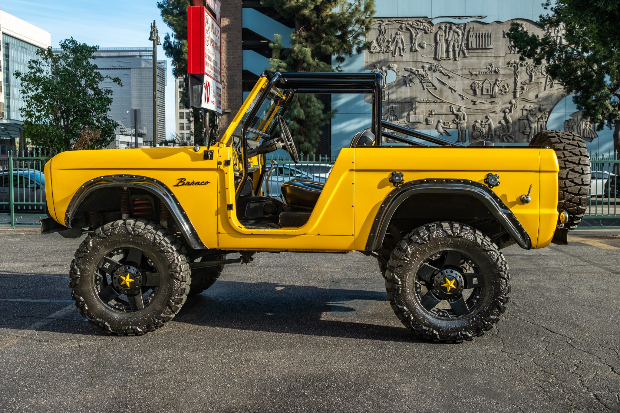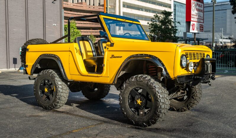 This 1966 Ford Bronco Roadster rides on a lifted suspension and 18″ XD Series wheels mounted with 35×12.5″ Nitto tires. The truck is powered by a 302ci V8 linked to a three-speed manual transmission and a dual-range transfer case, and it has been repainted yellow over black and yellow vinyl upholstery. Additional equipment includes a winch, a receiver hitch, a swing-away tire carrier, and an aftermarket stereo and speakers.