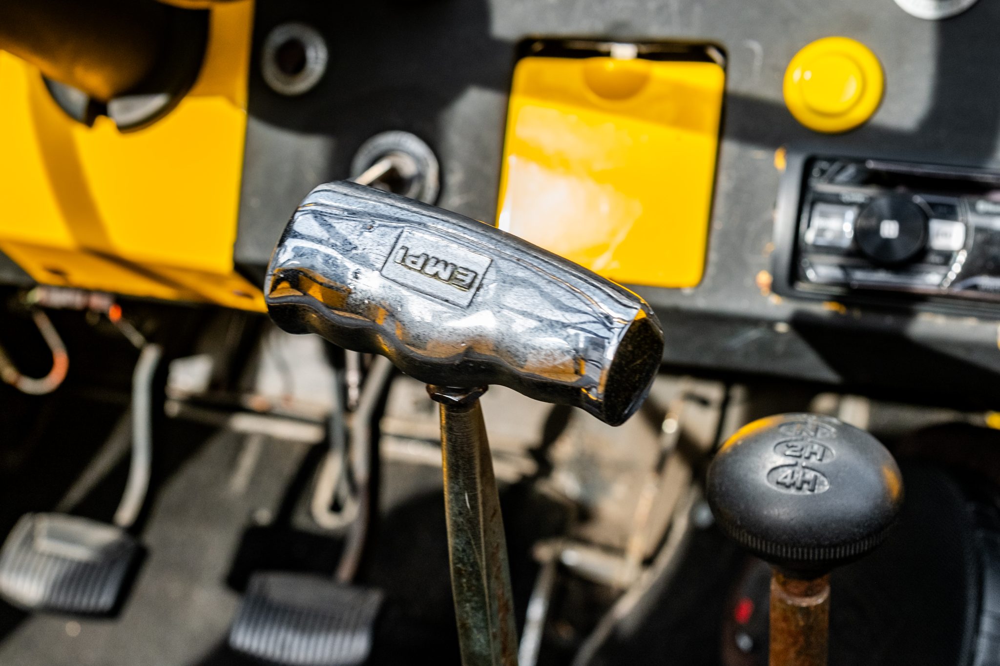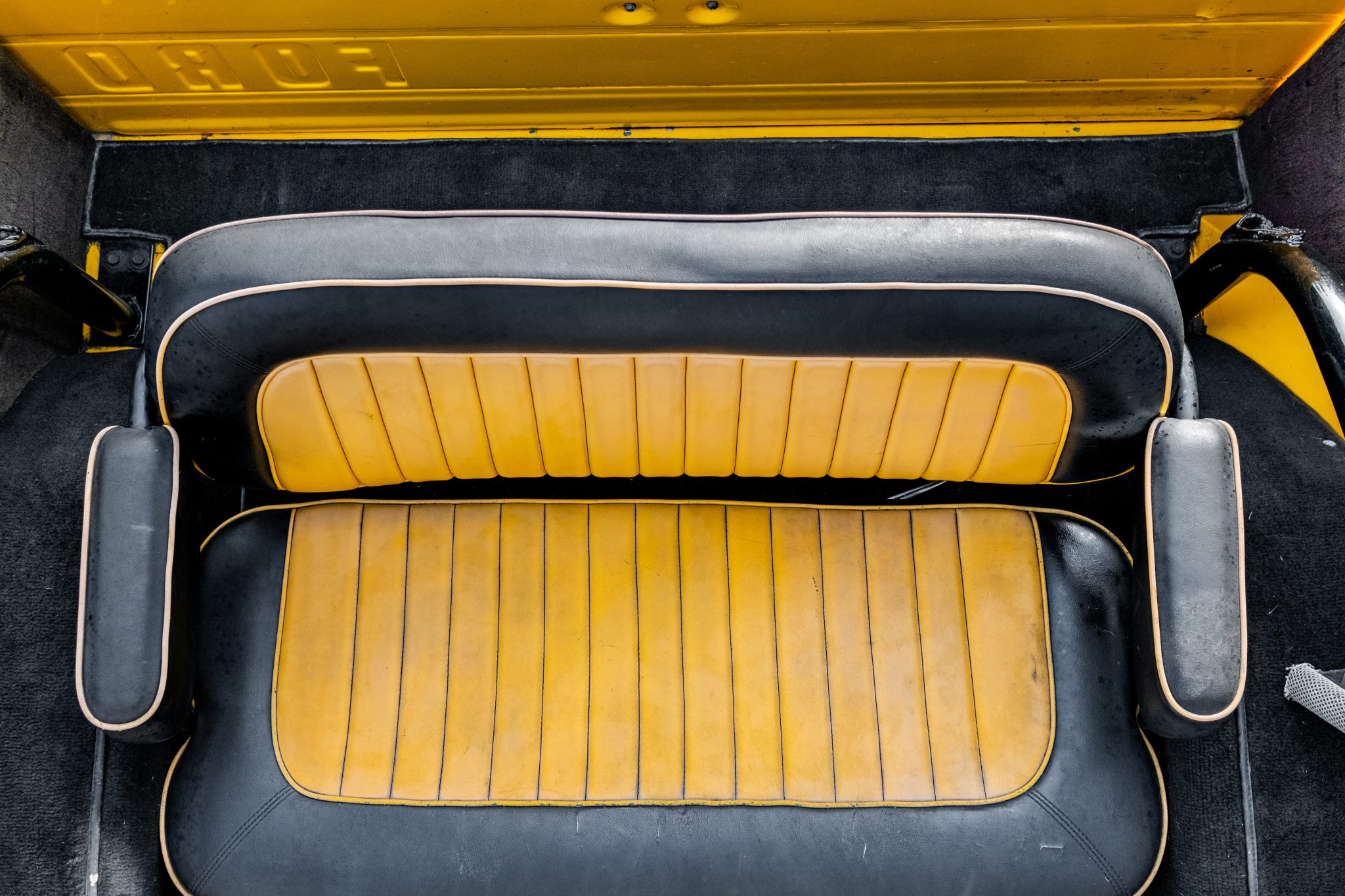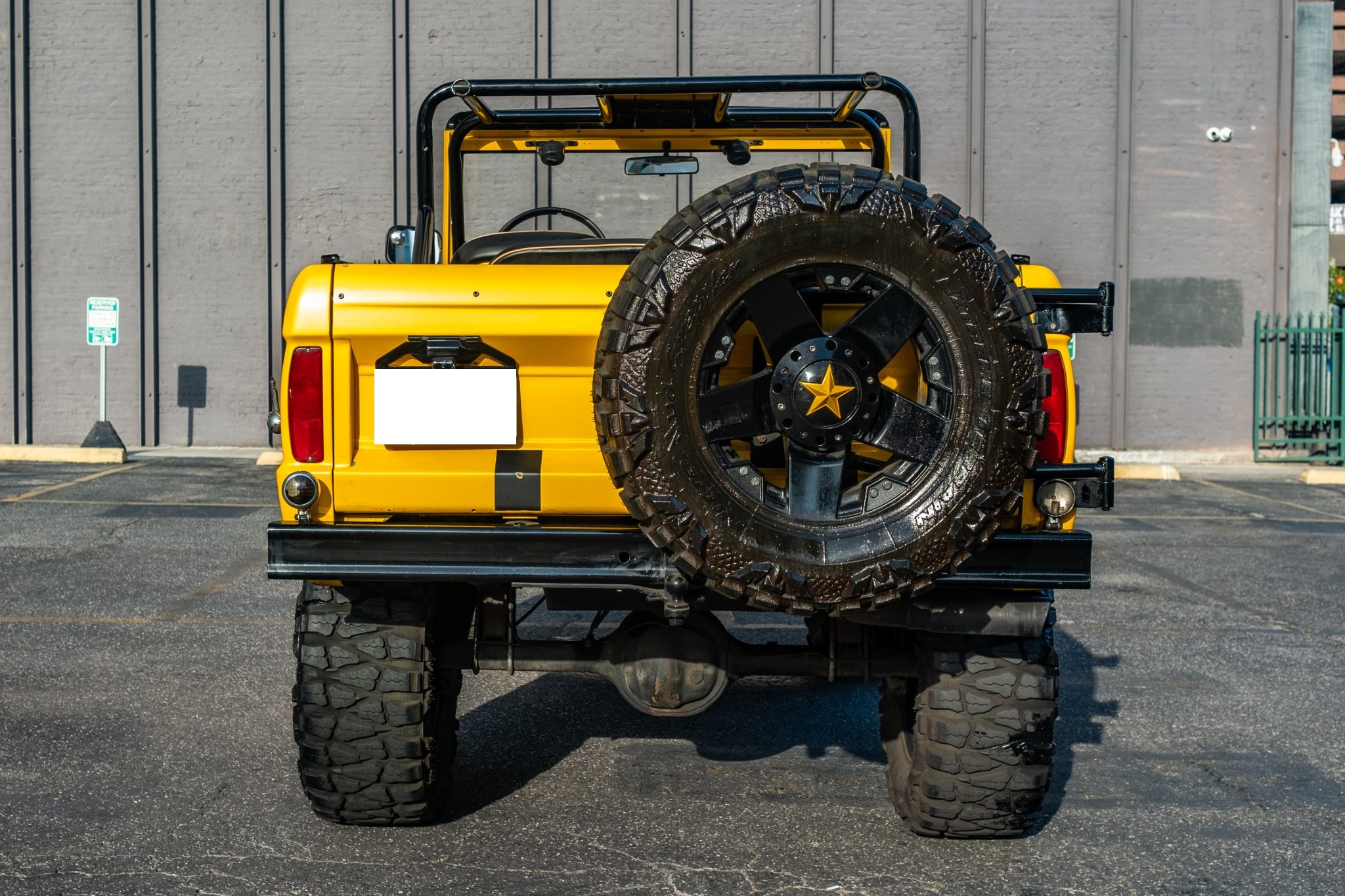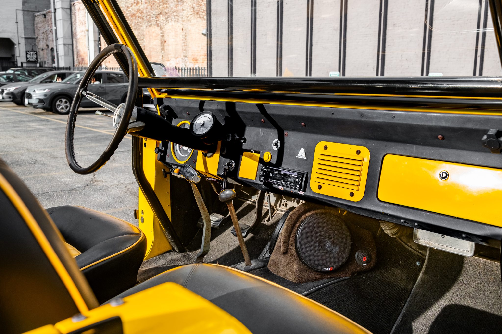 This 1966 Ford Bronco Roadster rides on a lifted suspension and 18″ XD Series wheels mounted with 35×12.5″ Nitto tires. The truck is powered by a 302ci V8 linked to a three-speed manual transmission and a dual-range transfer case, and it has been repainted yellow over black and yellow vinyl upholstery. Additional equipment includes a winch, a receiver hitch, a swing-away tire carrier, and an aftermarket stereo and speakers.