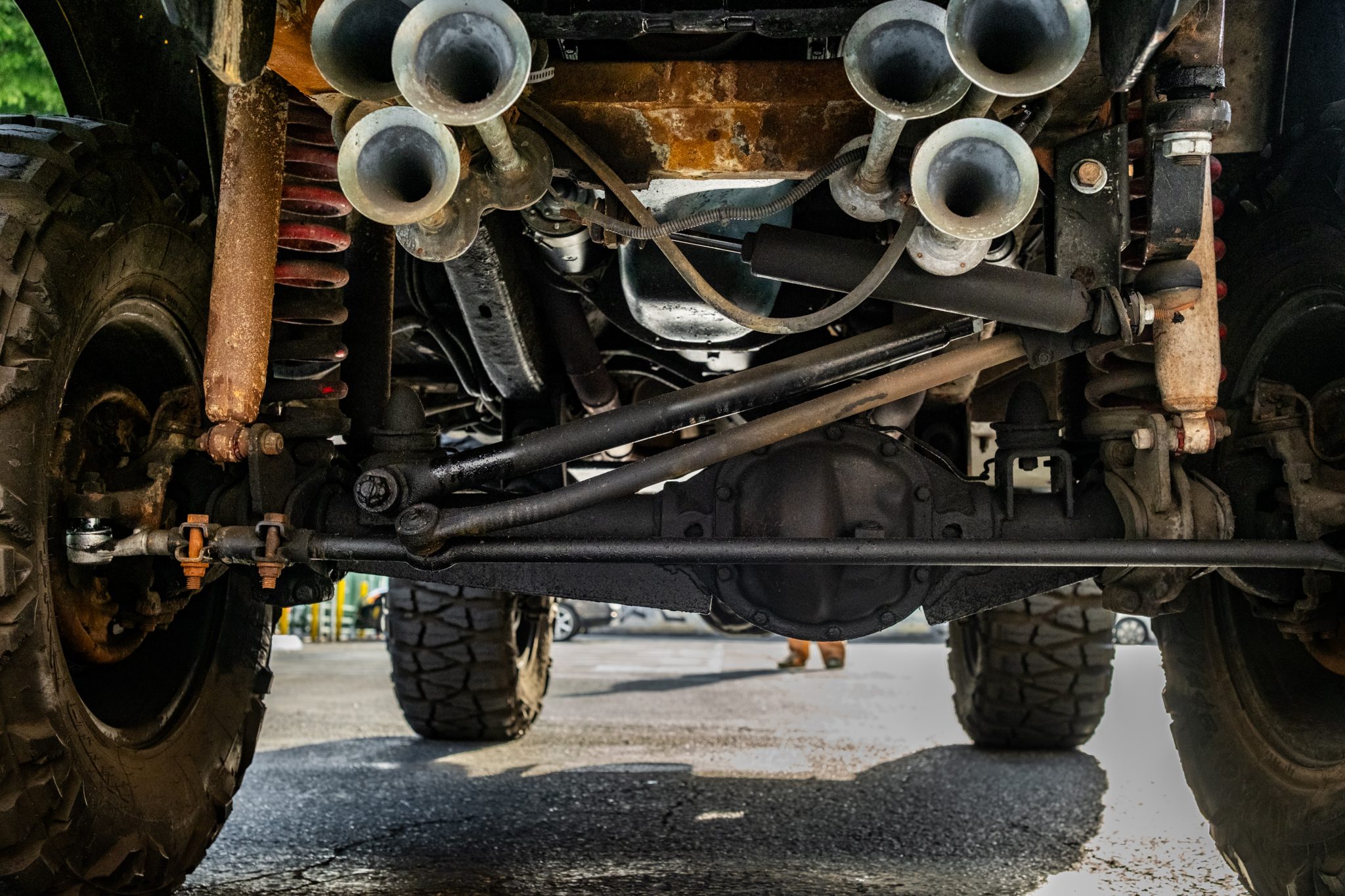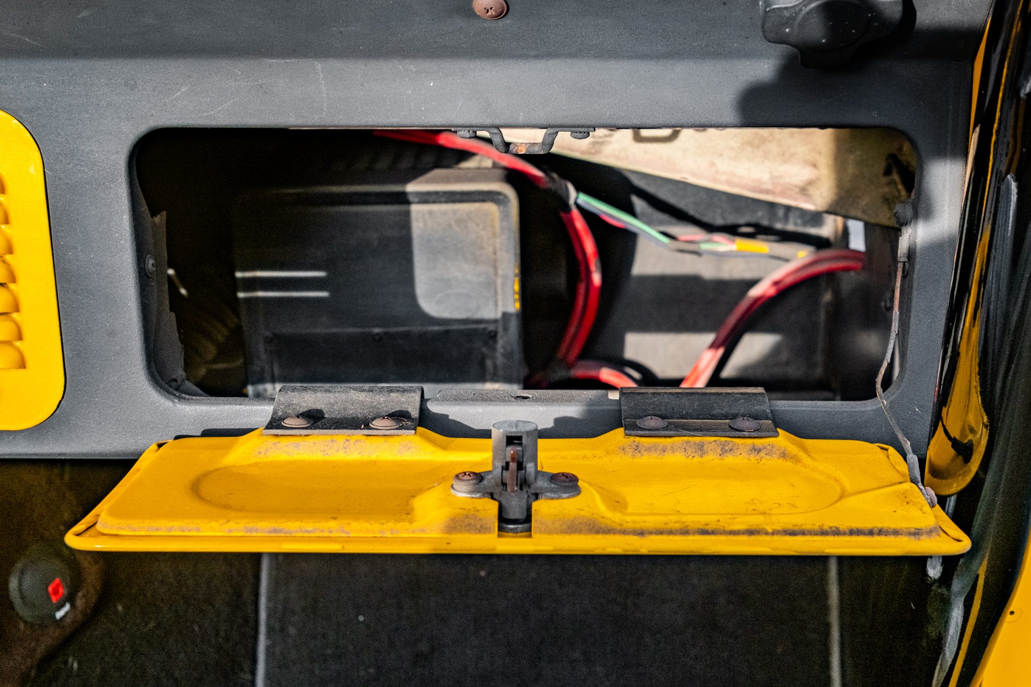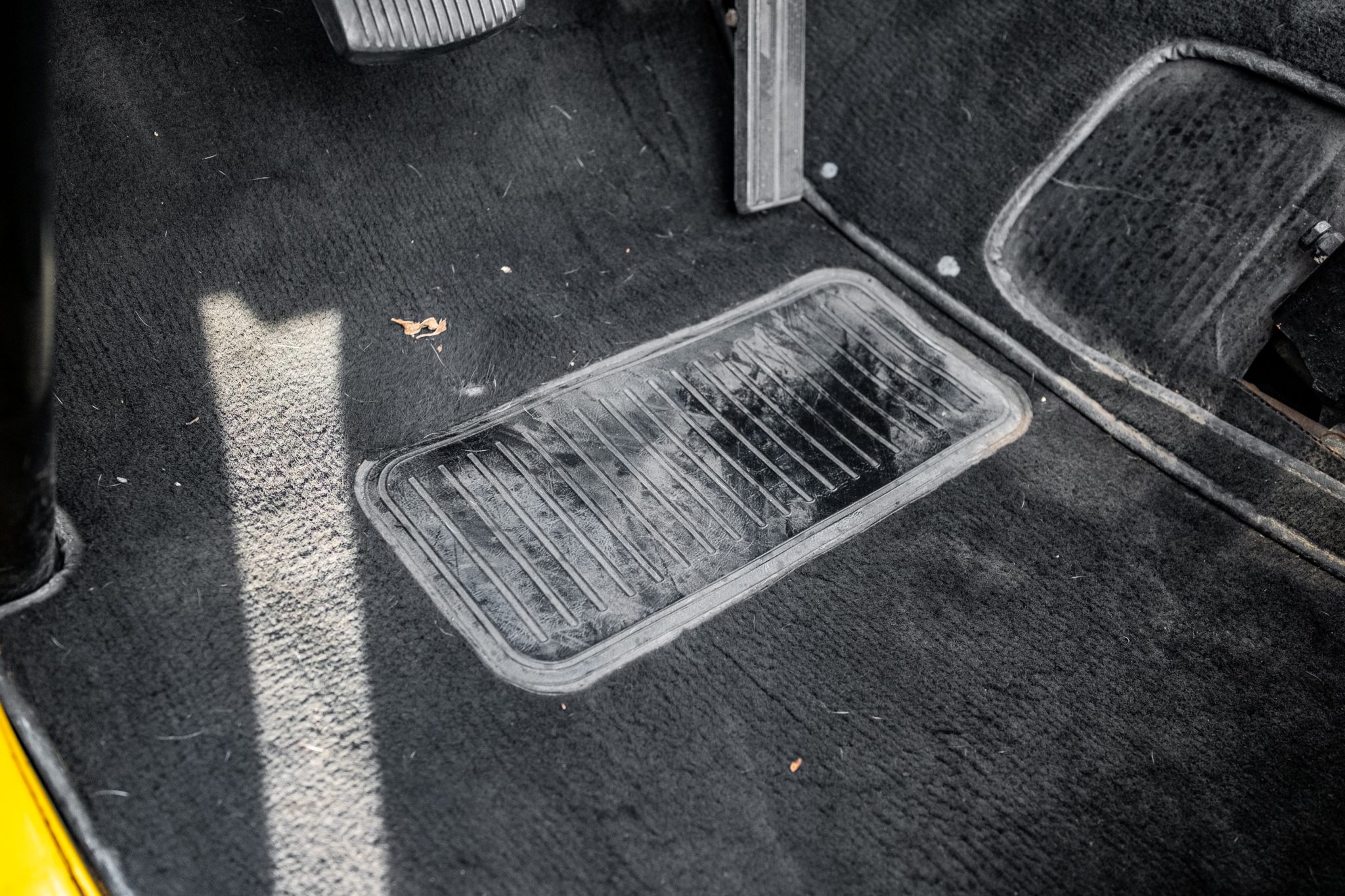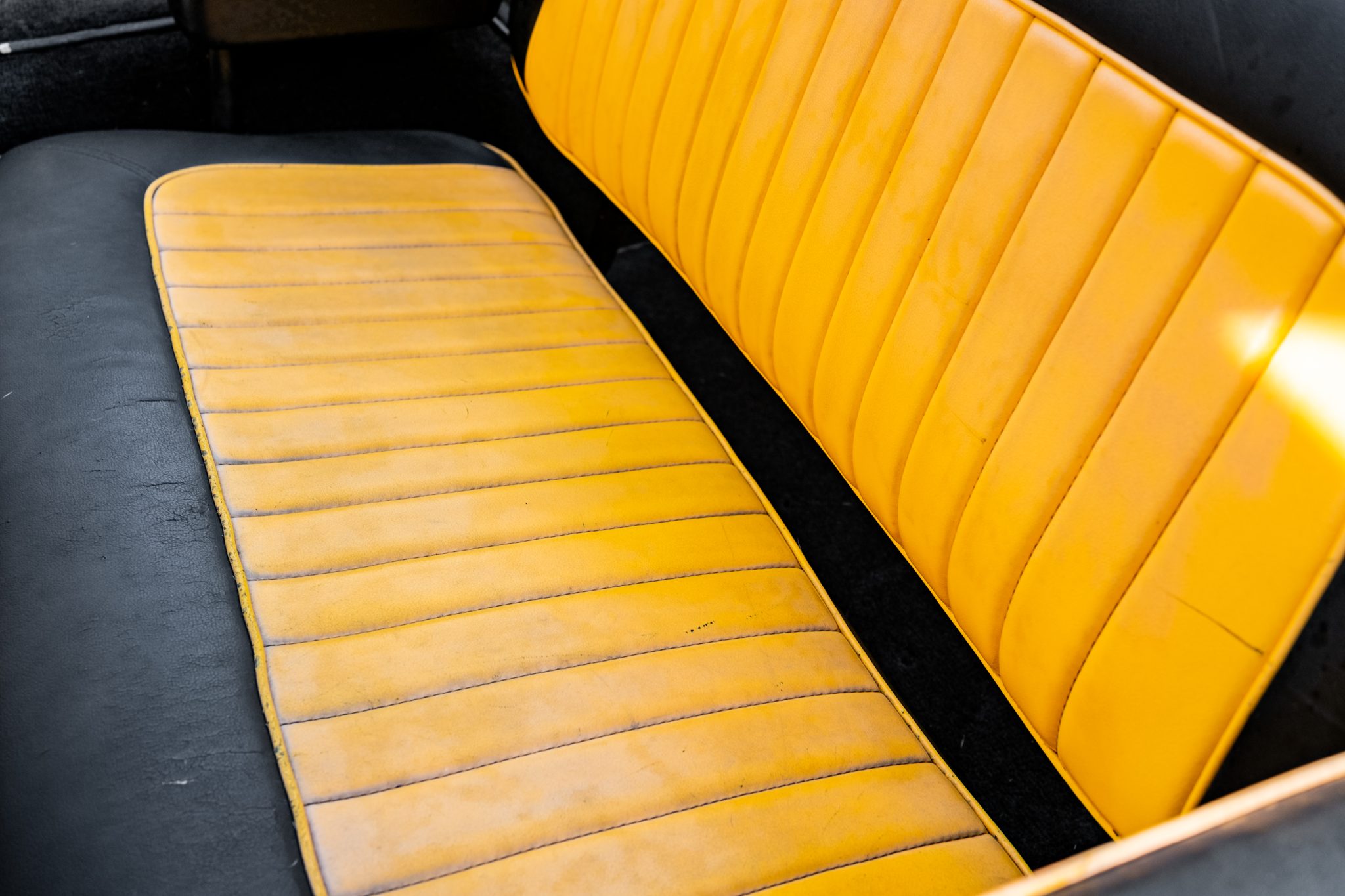 This 1966 Ford Bronco Roadster rides on a lifted suspension and 18″ XD Series wheels mounted with 35×12.5″ Nitto tires. The truck is powered by a 302ci V8 linked to a three-speed manual transmission and a dual-range transfer case, and it has been repainted yellow over black and yellow vinyl upholstery. Additional equipment includes a winch, a receiver hitch, a swing-away tire carrier, and an aftermarket stereo and speakers.