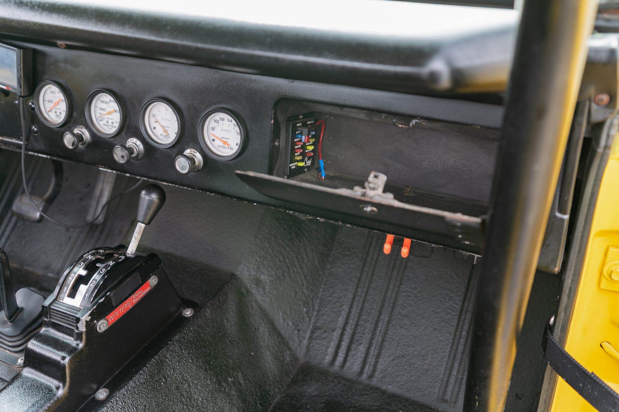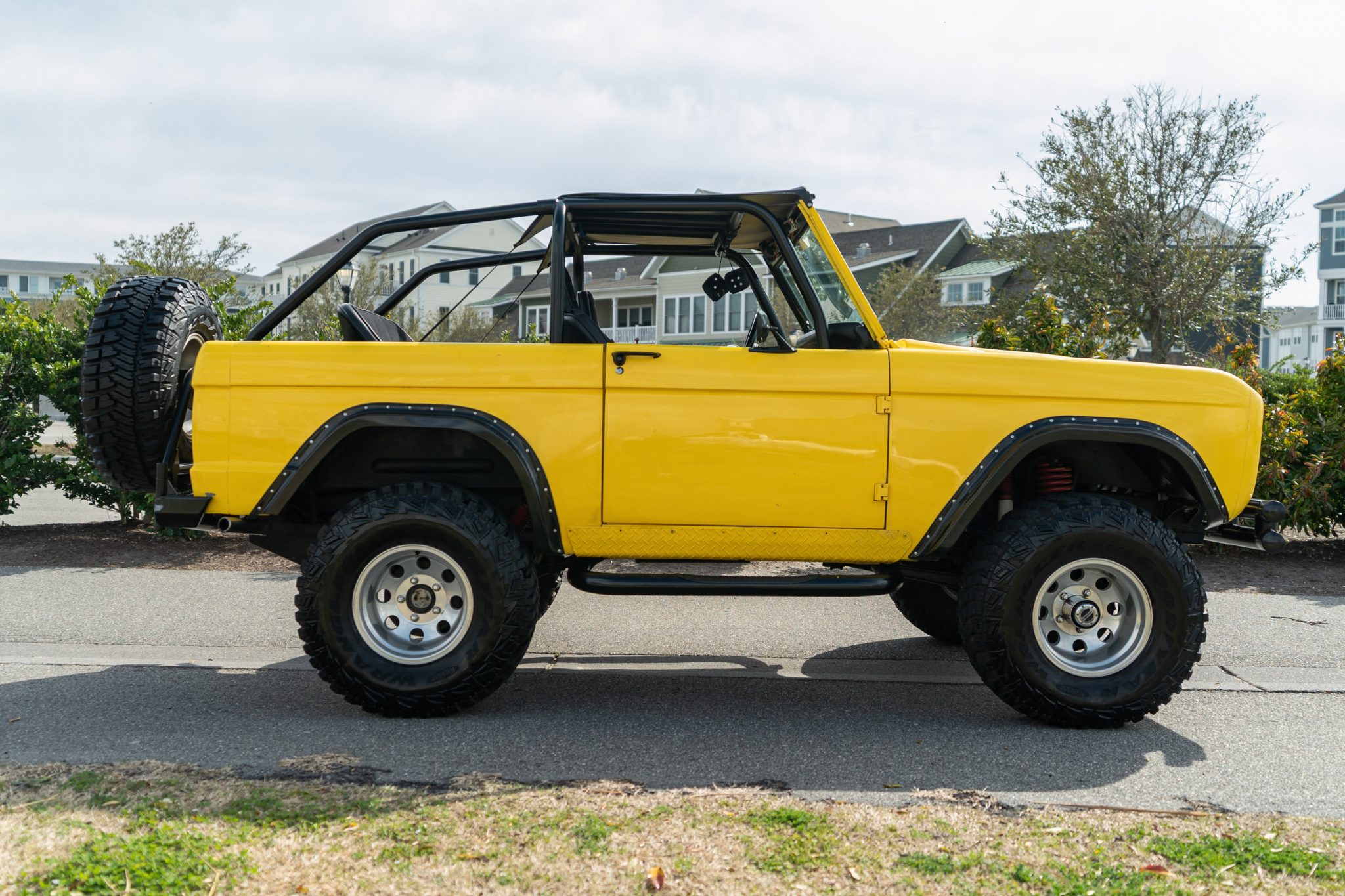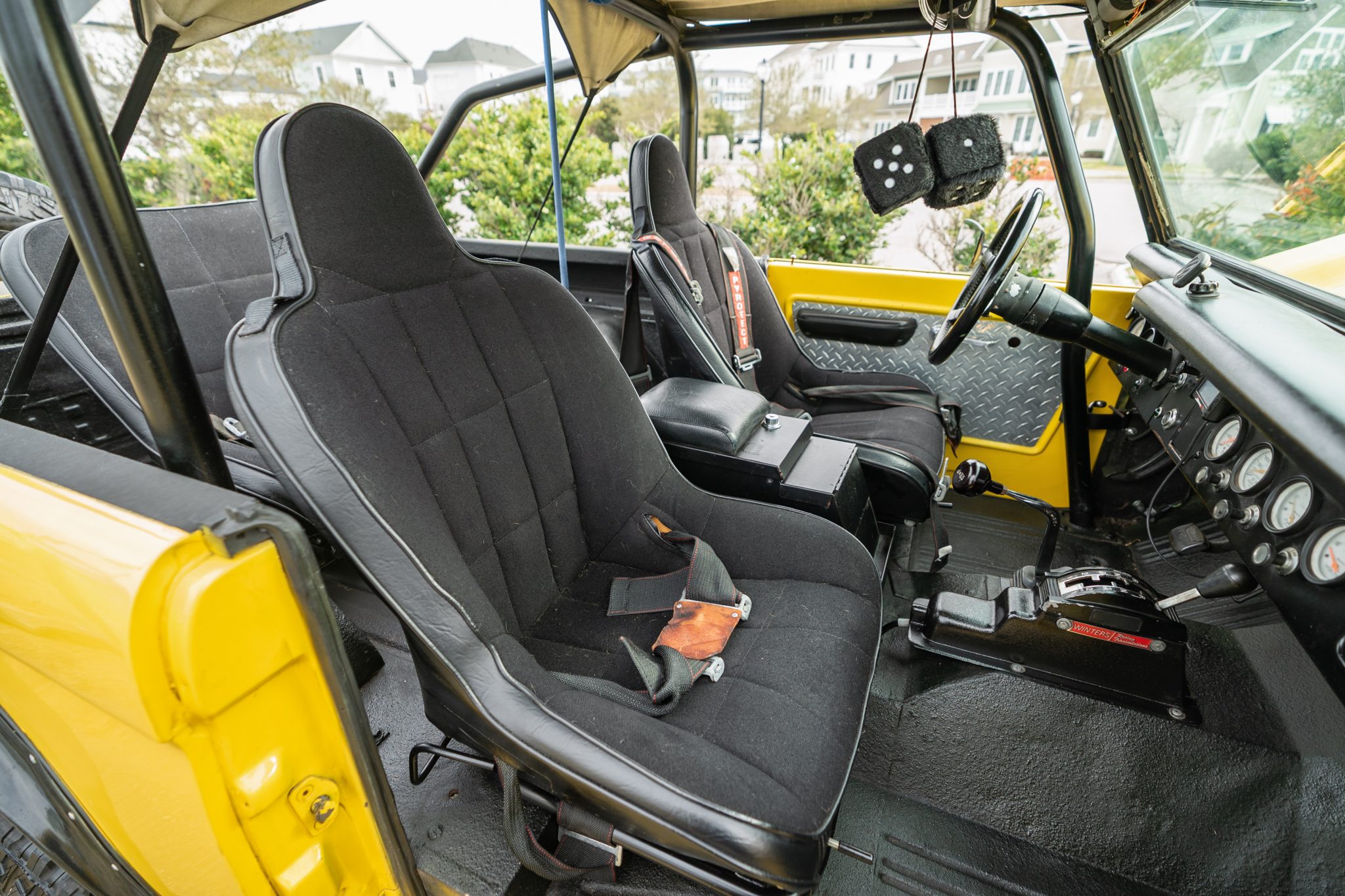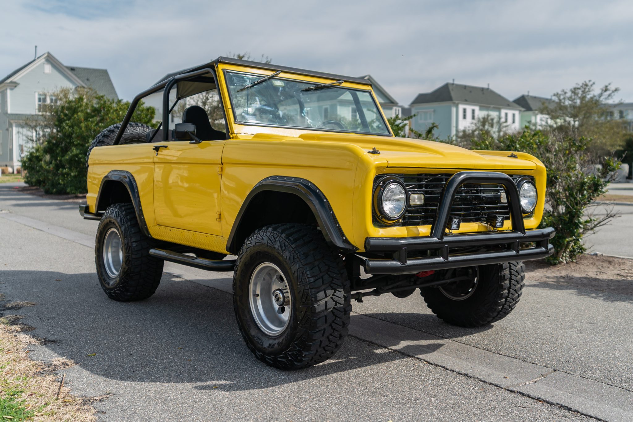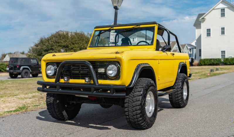 This 1966 Ford Bronco roadster was the subject of a refurbishment completed in 2004 that included a repaint in yellow as well as the installation of a 302ci V8 built by Hawaii Racing of Simi Valley, California. A Holley Sniper electronic fuel injection system has been installed, and power is sent to the rear or all four wheels through a four-speed automatic transmission that was rebuilt in 2021 and a dual-range transfer case. The truck rides on body and suspension lifts as well as 15″ polished wheels with 33″ Goodyear tires, which are mounted over locking hubs and disc brakes at the front.