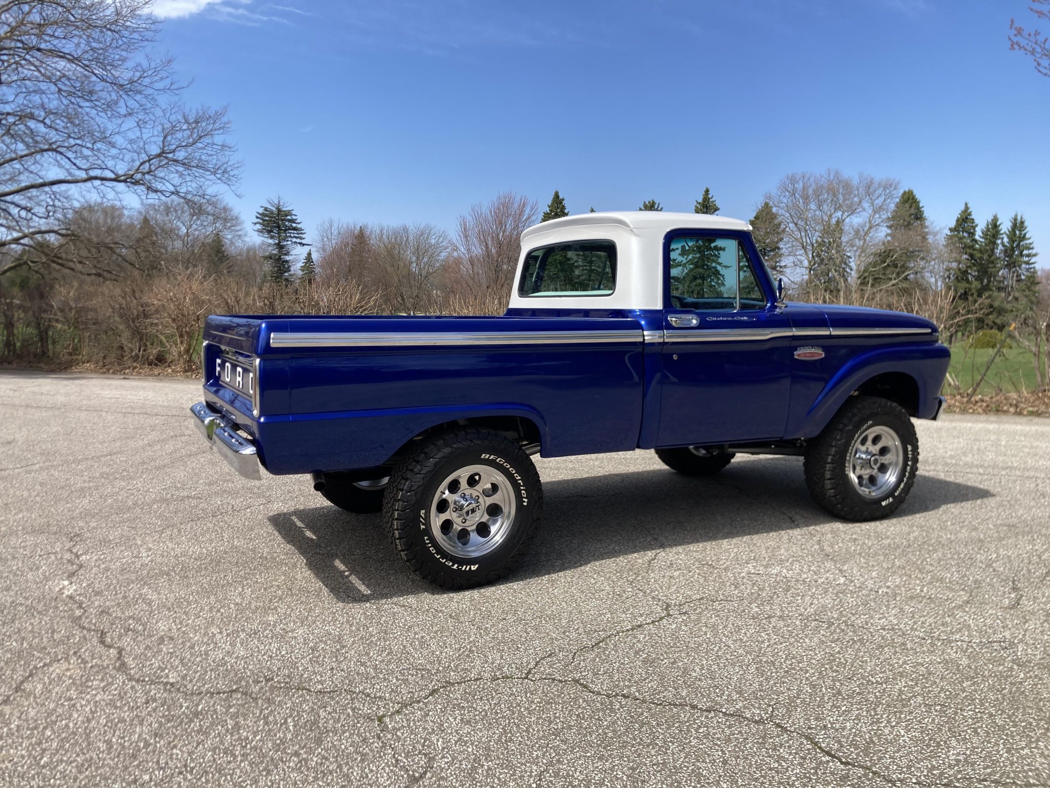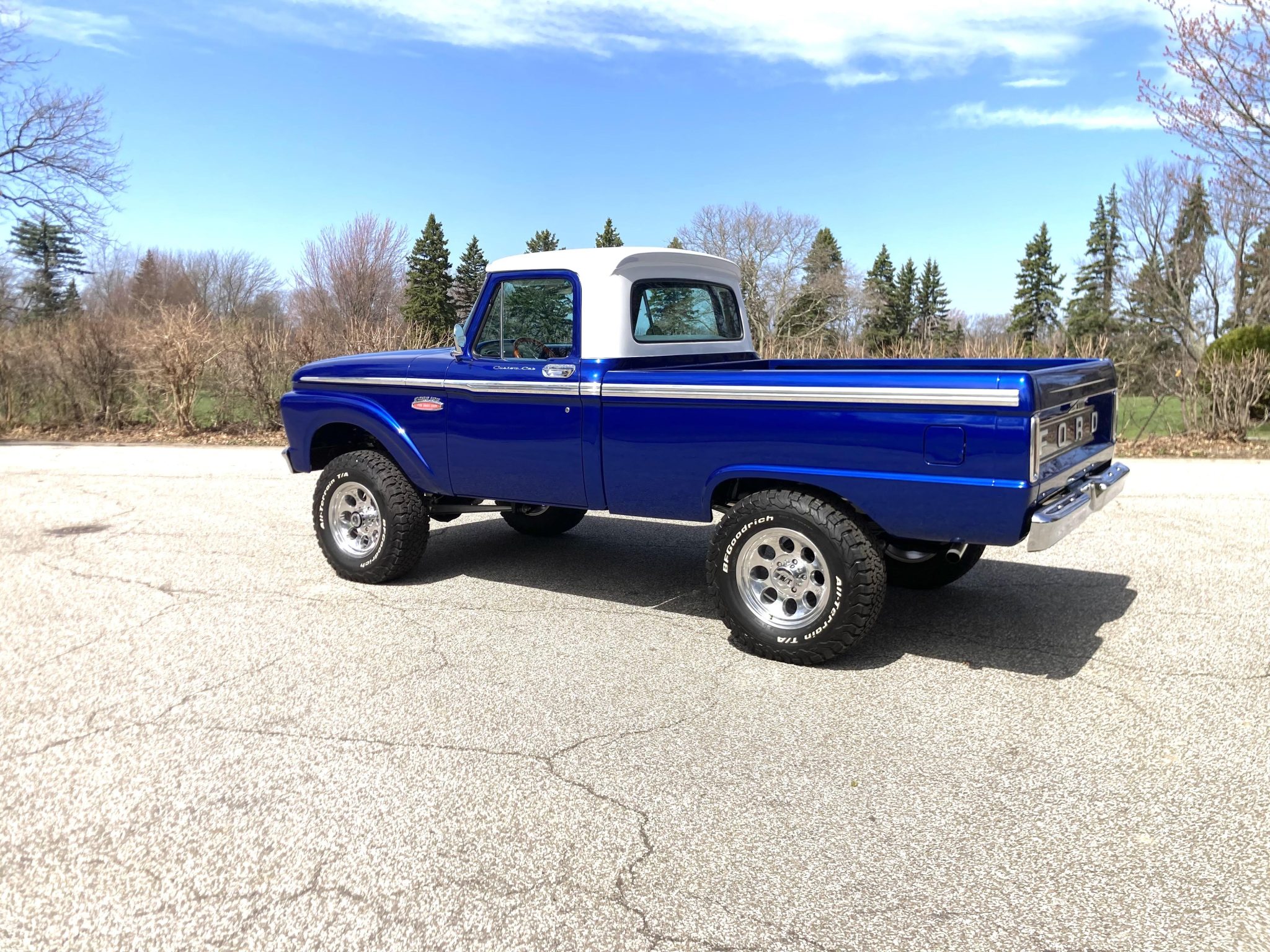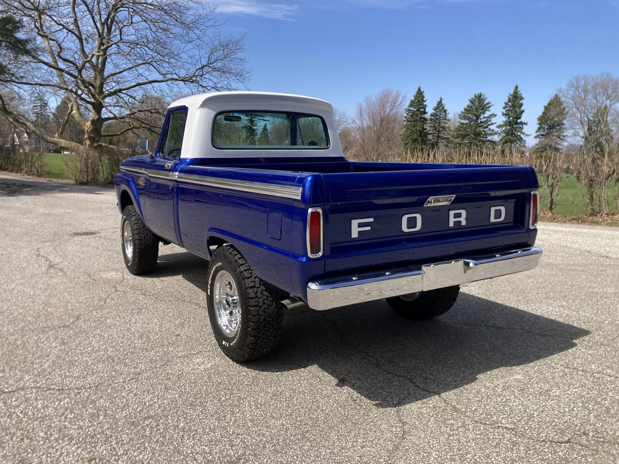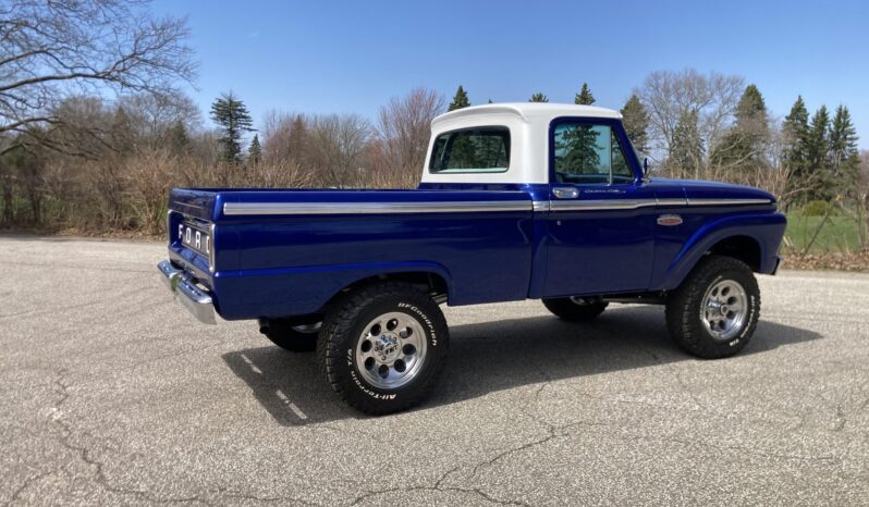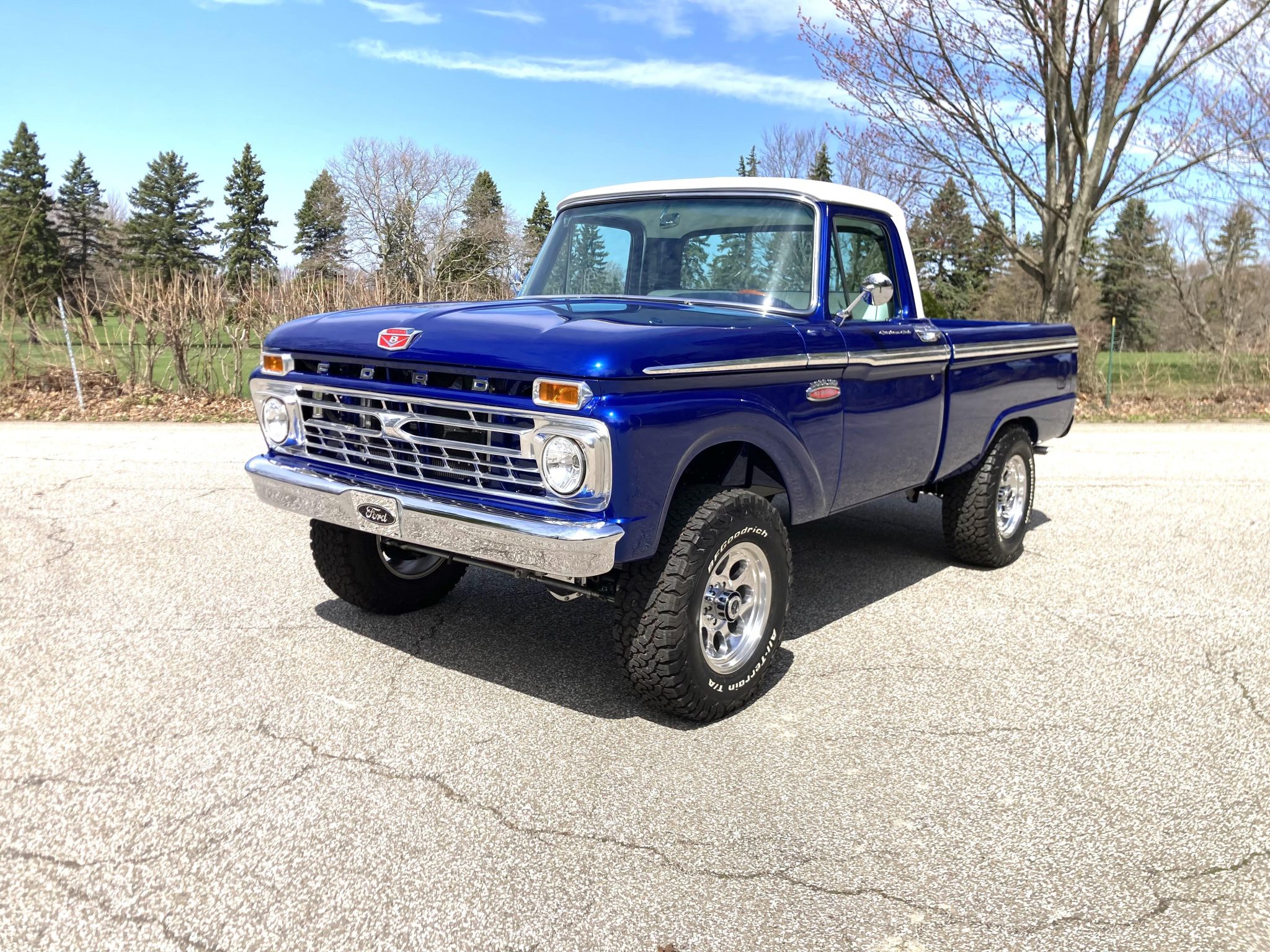 This 1966 Ford F-100 is a Custom Cab pickup that was refurbished and modified Work included converting the drivetrain to four-wheel drive and installing a 302ci V8 as well as refinishing the body in metallic blue over white vinyl upholstery. Additional modifications include a four-speed manual transmission, MSD ignition, a serpentine belt accessory drive kit, an aluminum radiator, a custom dual exhaust system, a lifted suspension, power-assisted front disc brakes, 17″ Mickey Thompson wheels, LED headlights, and Vintage Air climate control.