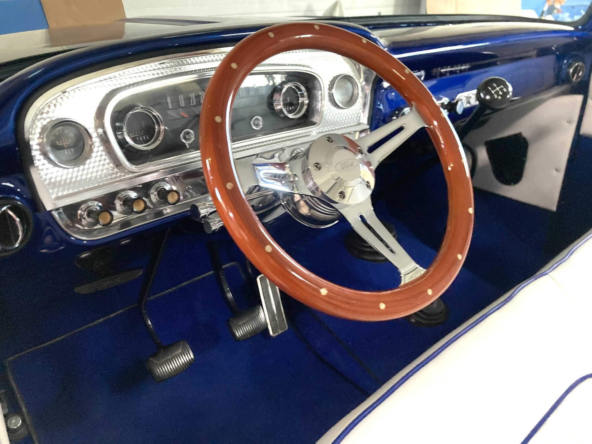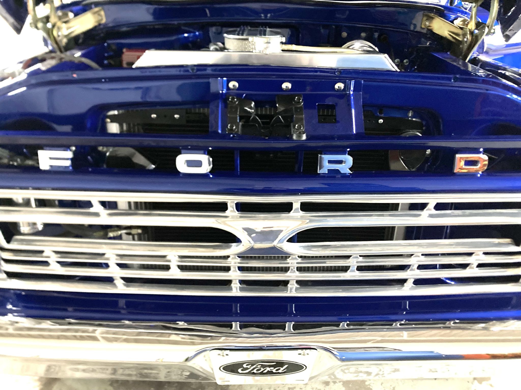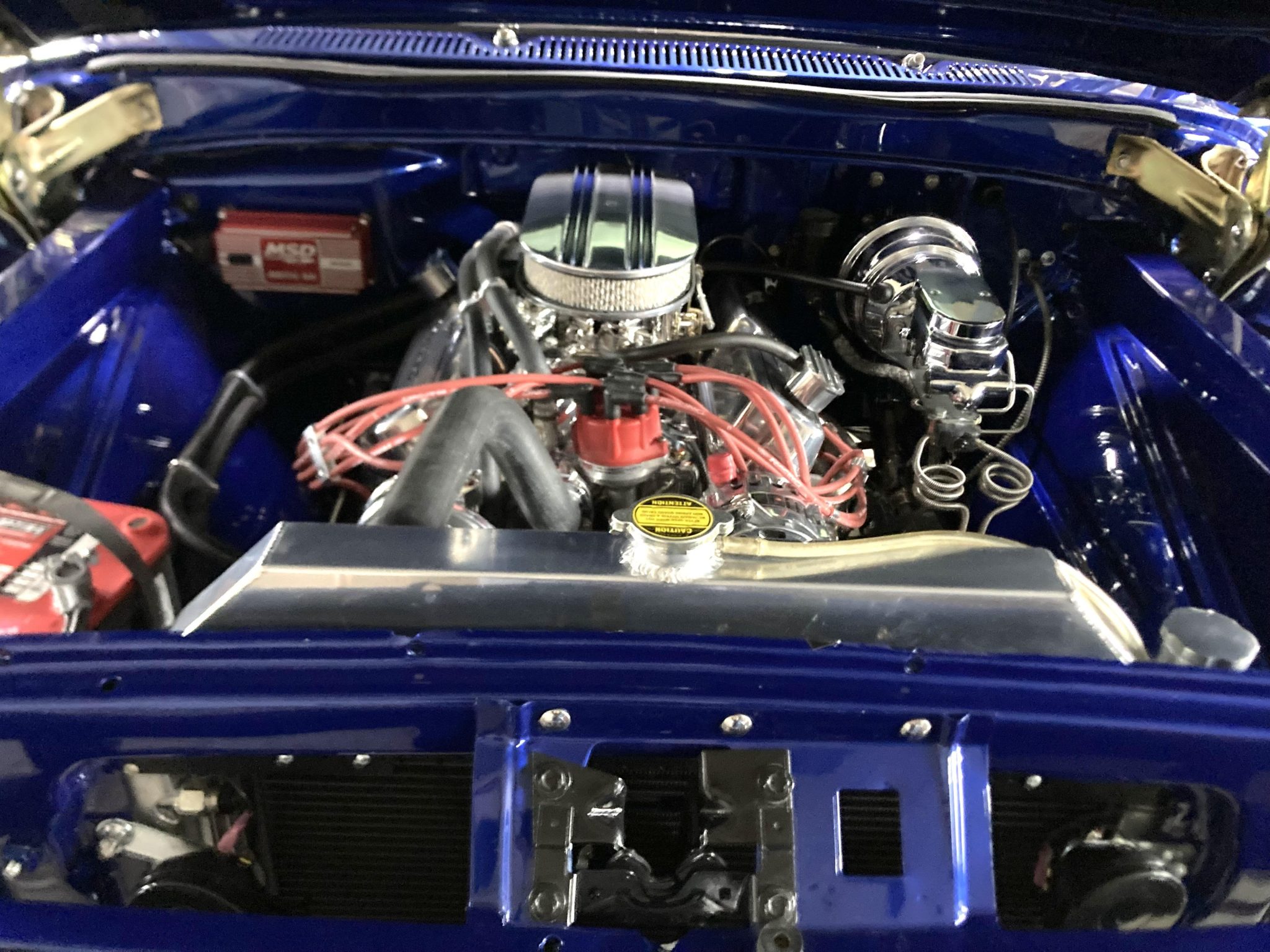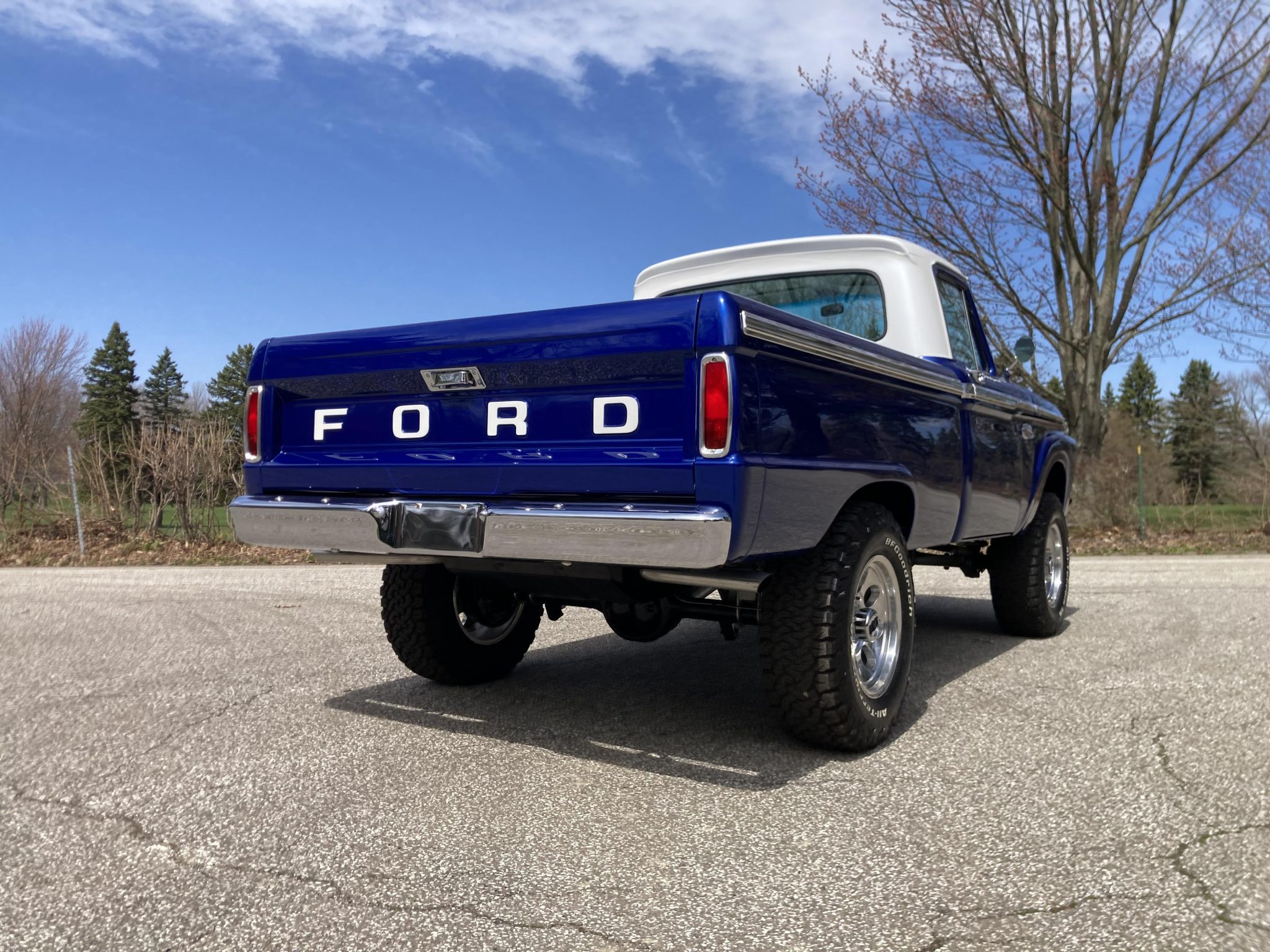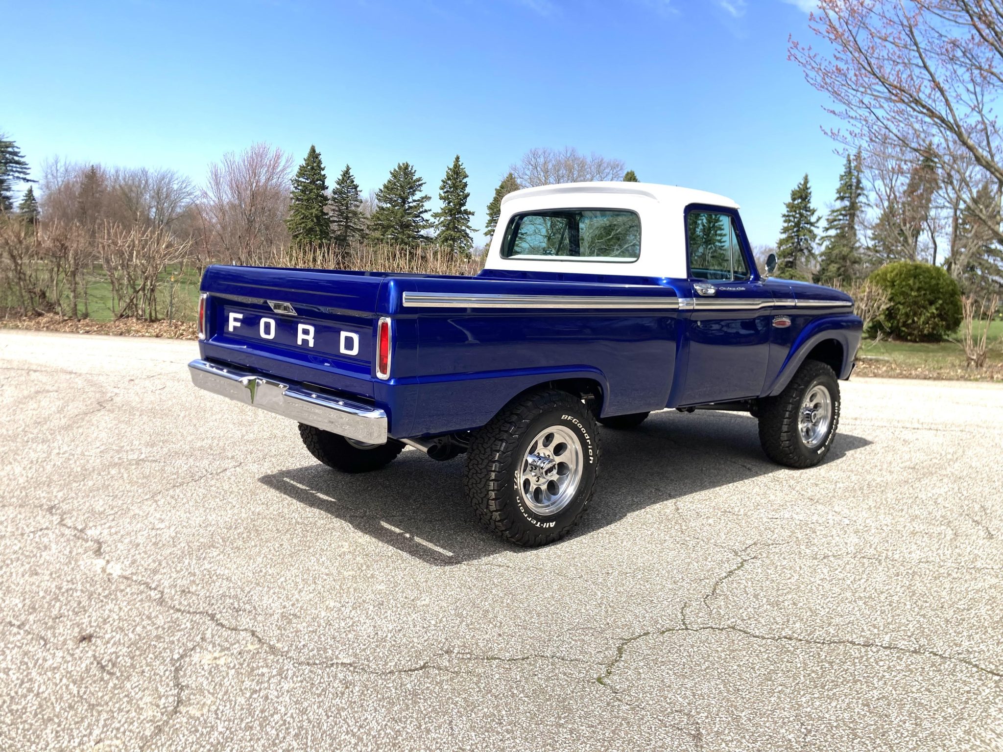 This 1966 Ford F-100 is a Custom Cab pickup that was refurbished and modified Work included converting the drivetrain to four-wheel drive and installing a 302ci V8 as well as refinishing the body in metallic blue over white vinyl upholstery. Additional modifications include a four-speed manual transmission, MSD ignition, a serpentine belt accessory drive kit, an aluminum radiator, a custom dual exhaust system, a lifted suspension, power-assisted front disc brakes, 17″ Mickey Thompson wheels, LED headlights, and Vintage Air climate control.