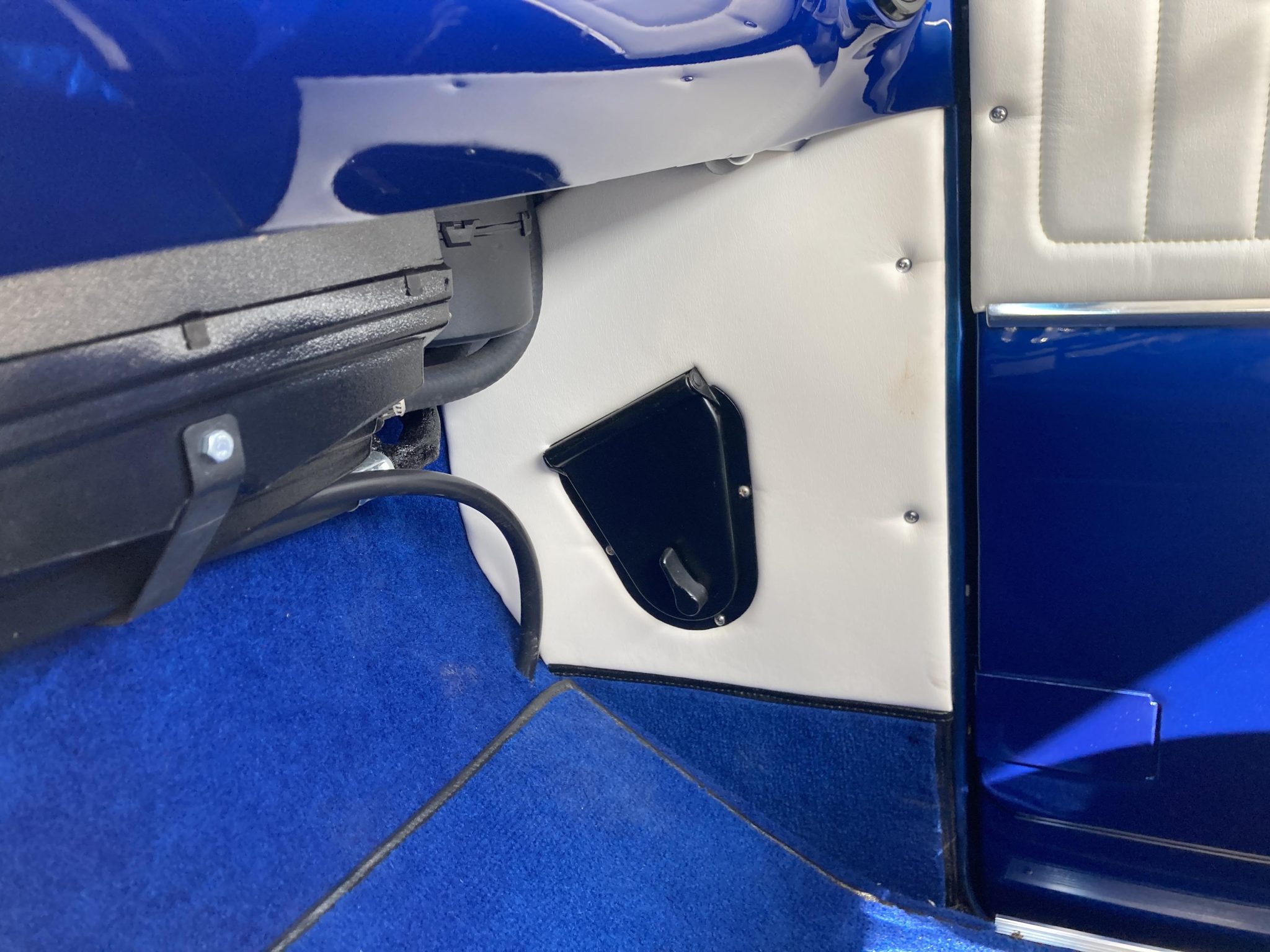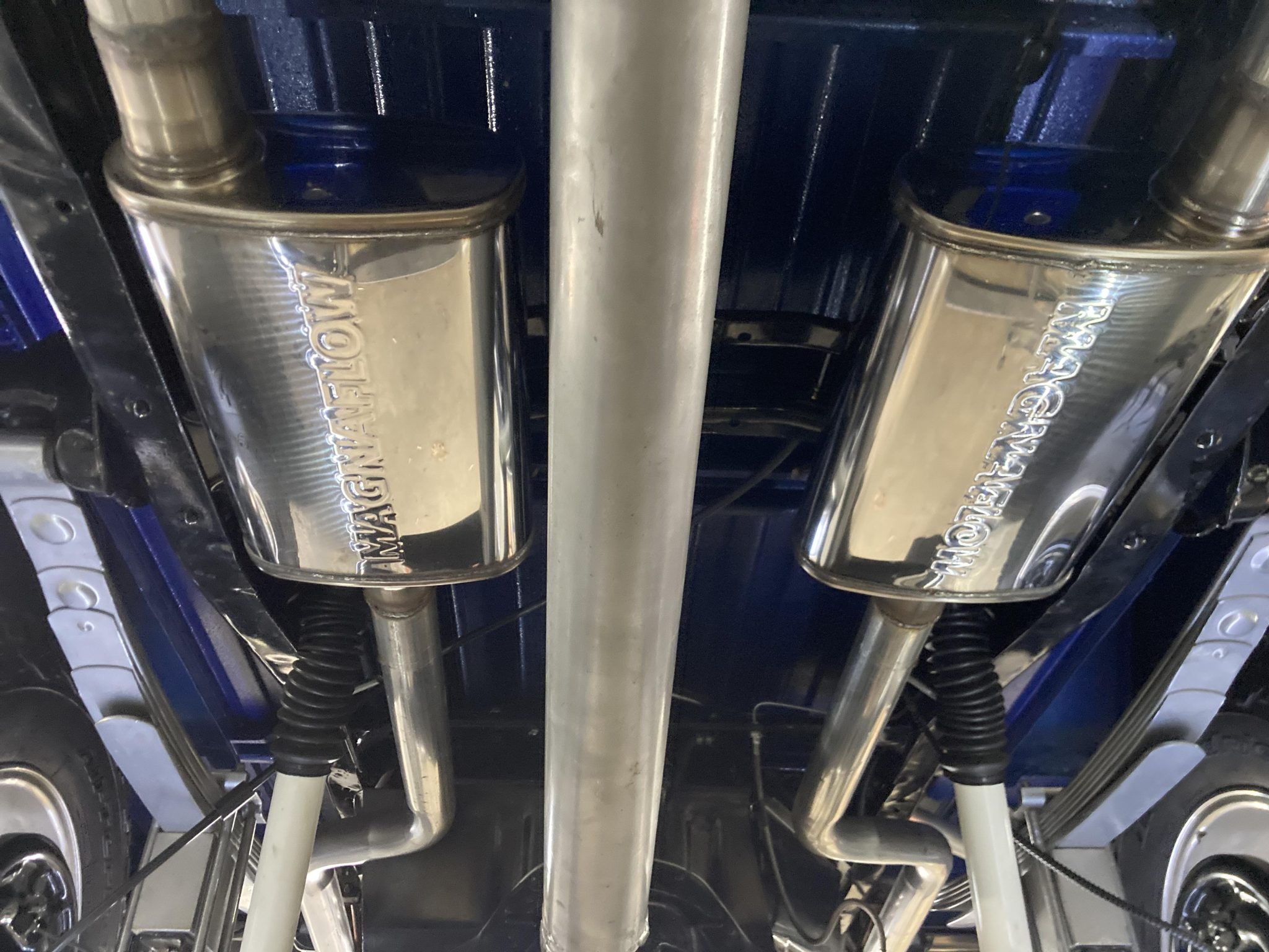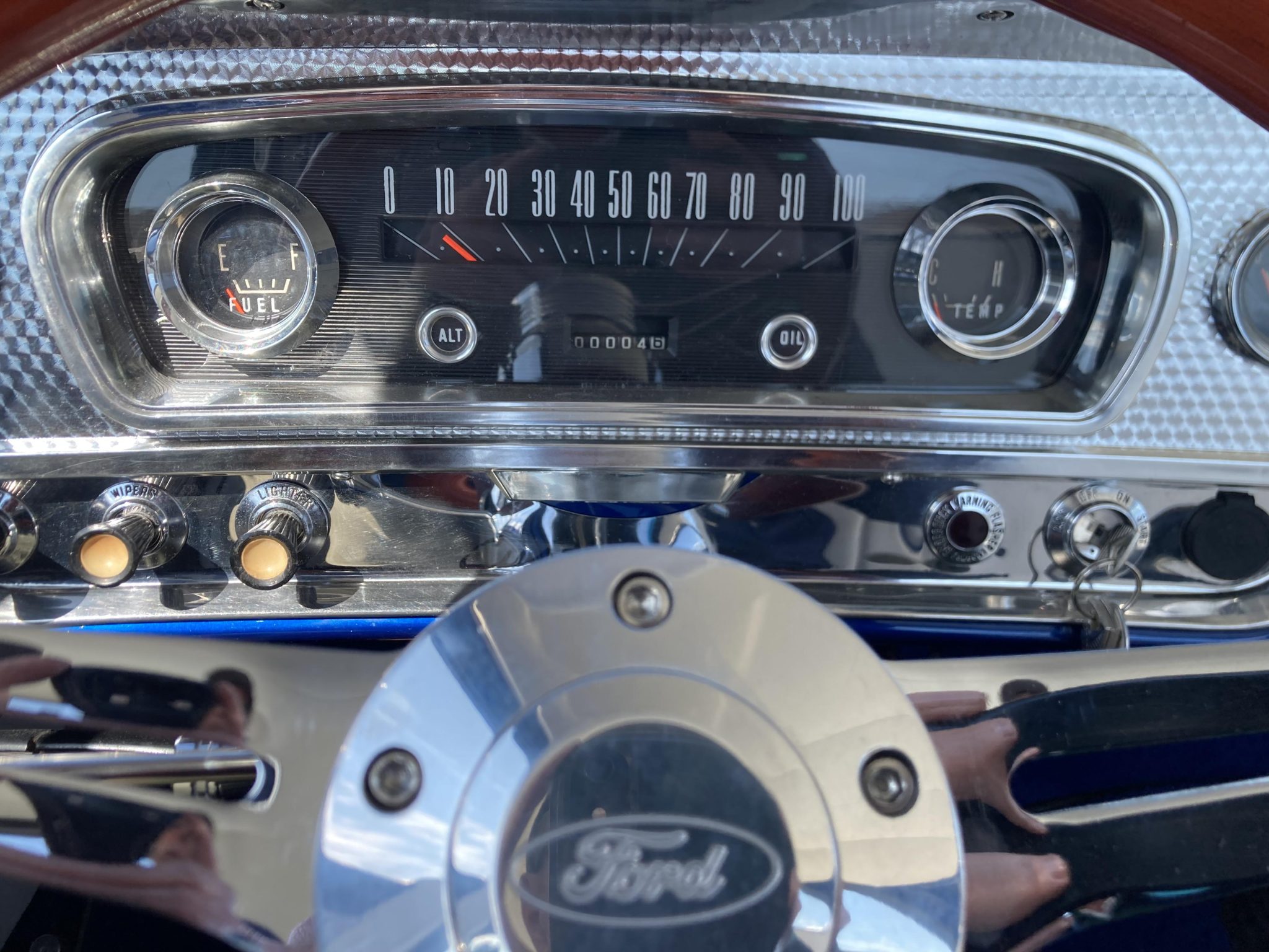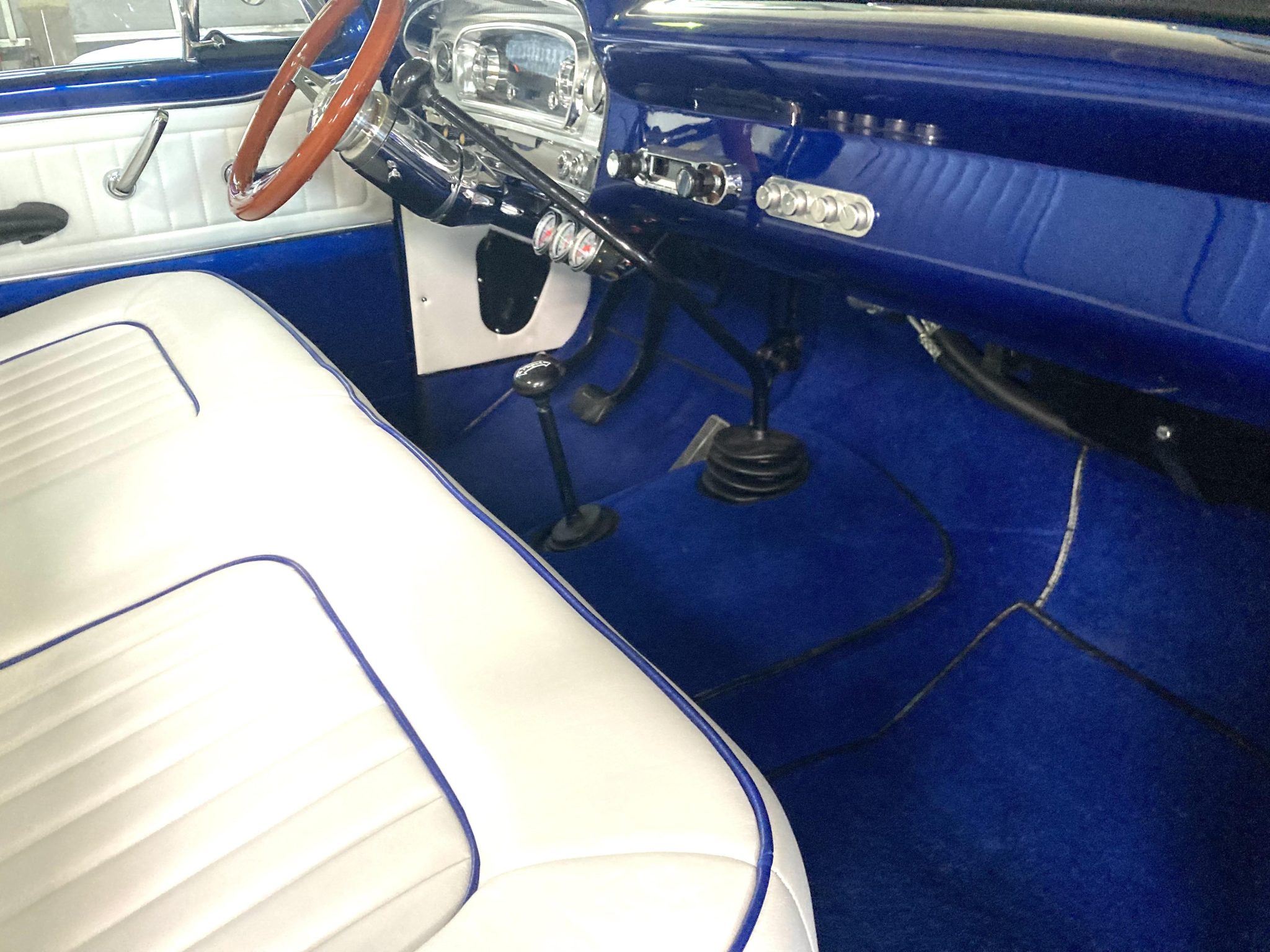 This 1966 Ford F-100 is a Custom Cab pickup that was refurbished and modified Work included converting the drivetrain to four-wheel drive and installing a 302ci V8 as well as refinishing the body in metallic blue over white vinyl upholstery. Additional modifications include a four-speed manual transmission, MSD ignition, a serpentine belt accessory drive kit, an aluminum radiator, a custom dual exhaust system, a lifted suspension, power-assisted front disc brakes, 17″ Mickey Thompson wheels, LED headlights, and Vintage Air climate control.