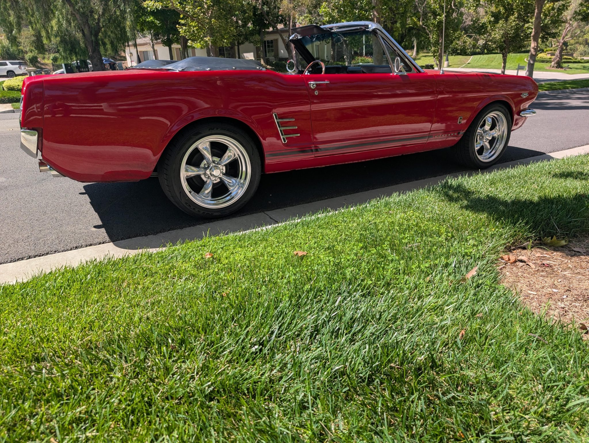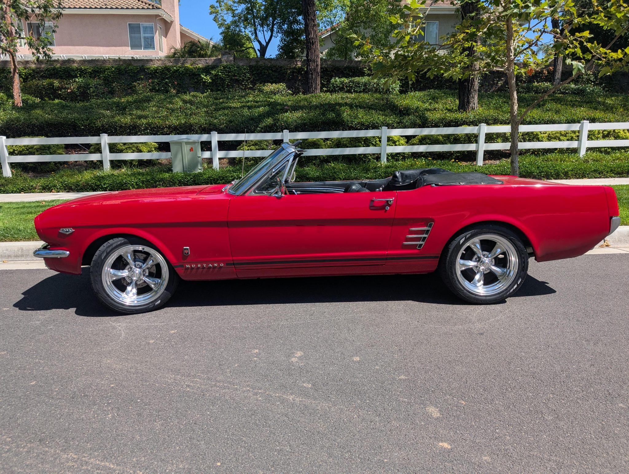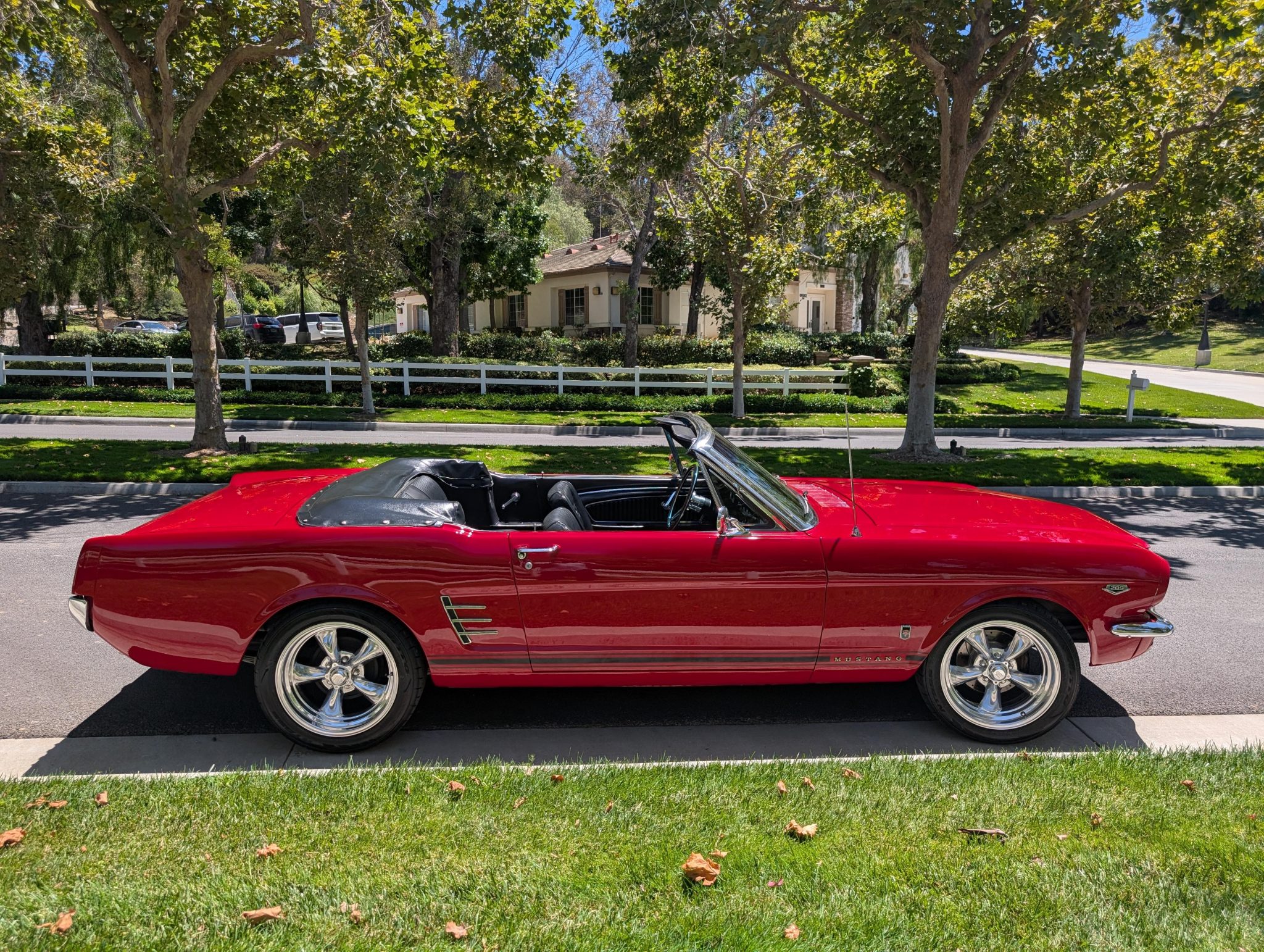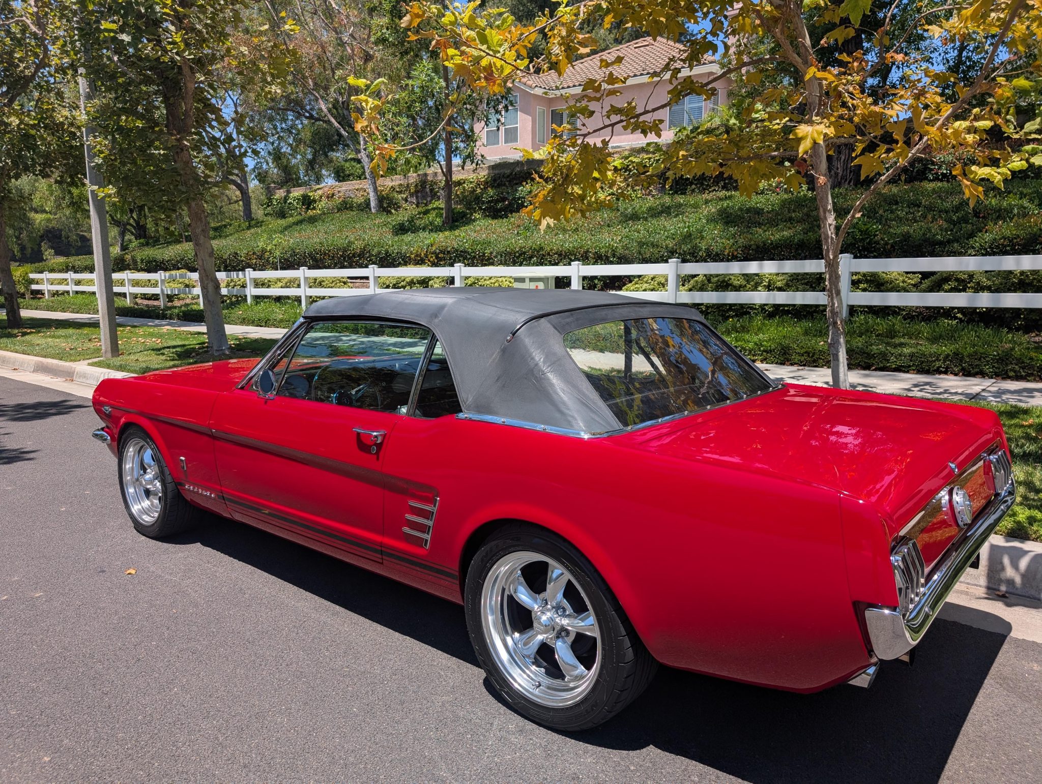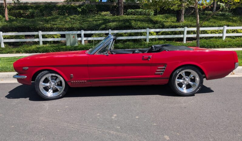 The car has been refinished in red over a refreshed black interior with luxury Pony vinyl, and it is powered by a 289ci V8 that is backed by a three-speed automatic transmission. Components include an Edelbrock intake manifold, a Brawler four-barrel carburetor, a revised camshaft, and a stainless-steel exhaust system with ceramic-coated headers, an X-pipe, and Flowmaster mufflers. The car rides on polished American Racing Torq Thrust II wheels and has front disc brakes with a revised booster and master cylinder as well as Borgeson power steering, KYB shocks, a Scott Drake rear sway bar, and Global West subframe connectors. Additional details include a black soft top and top boot, GT-style side stripes and badging, grille-mounted fog lights, an under-dash air conditioning system, and a retro-style head unit linked to aftermarket speakers and a trunk-mounted subwoofer.