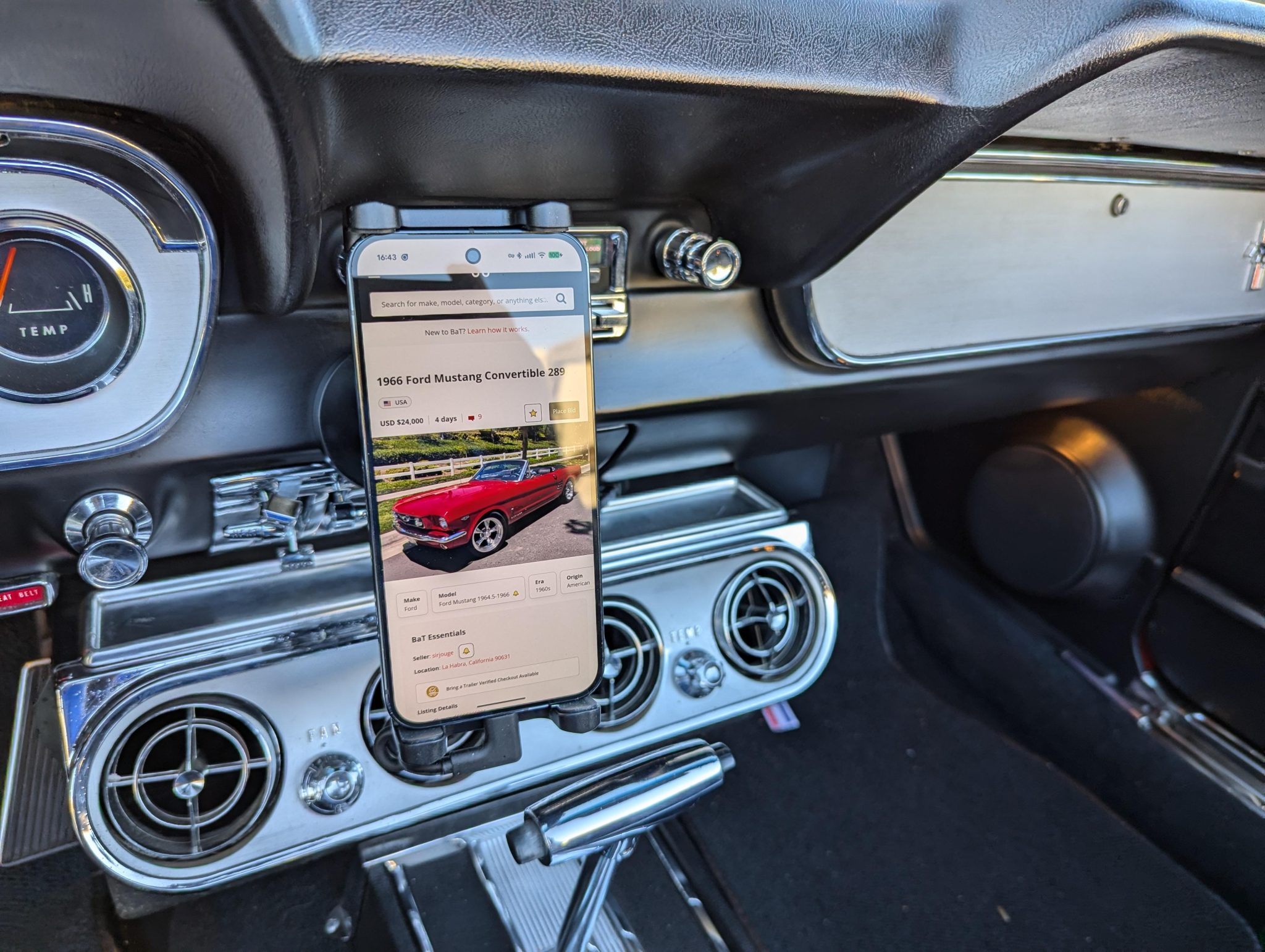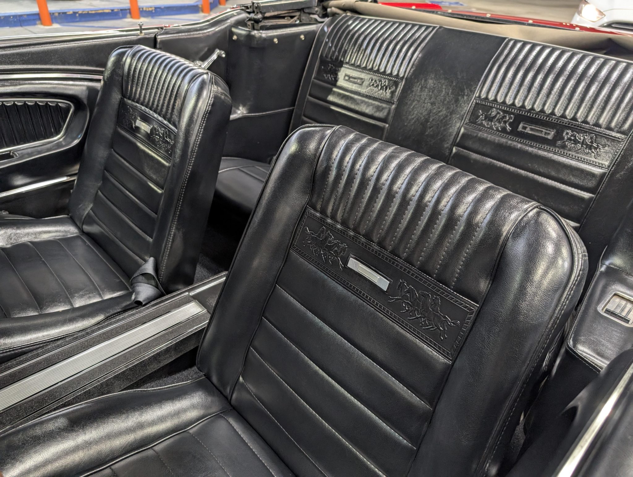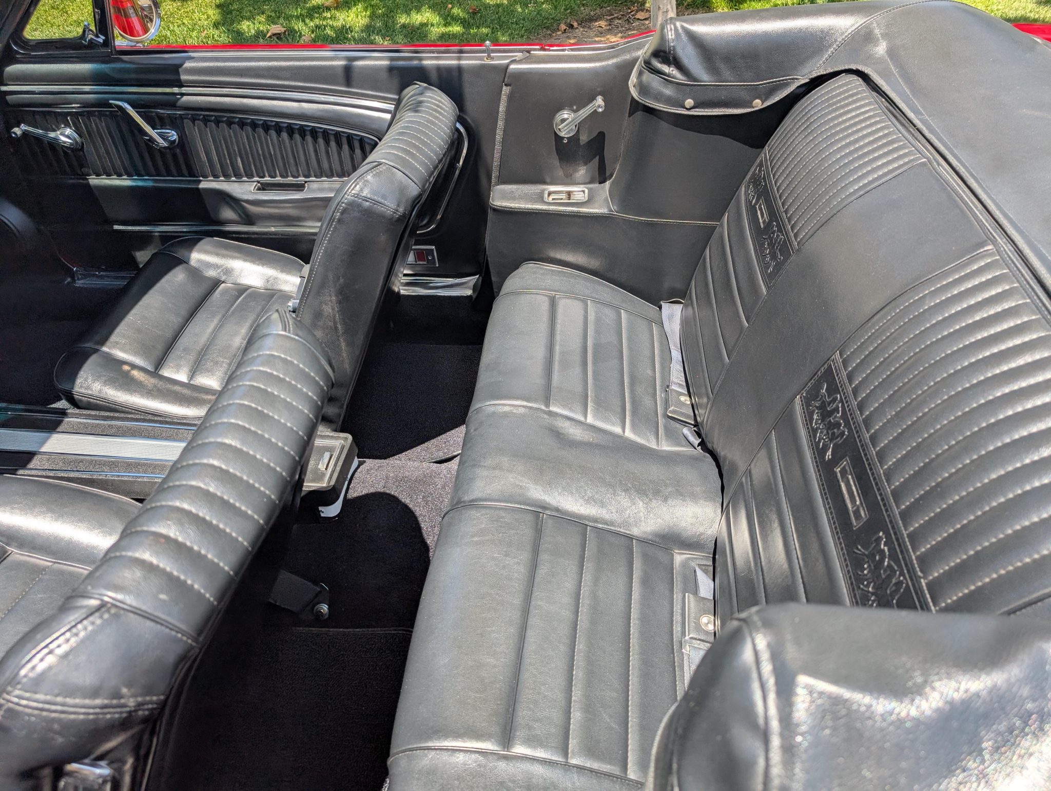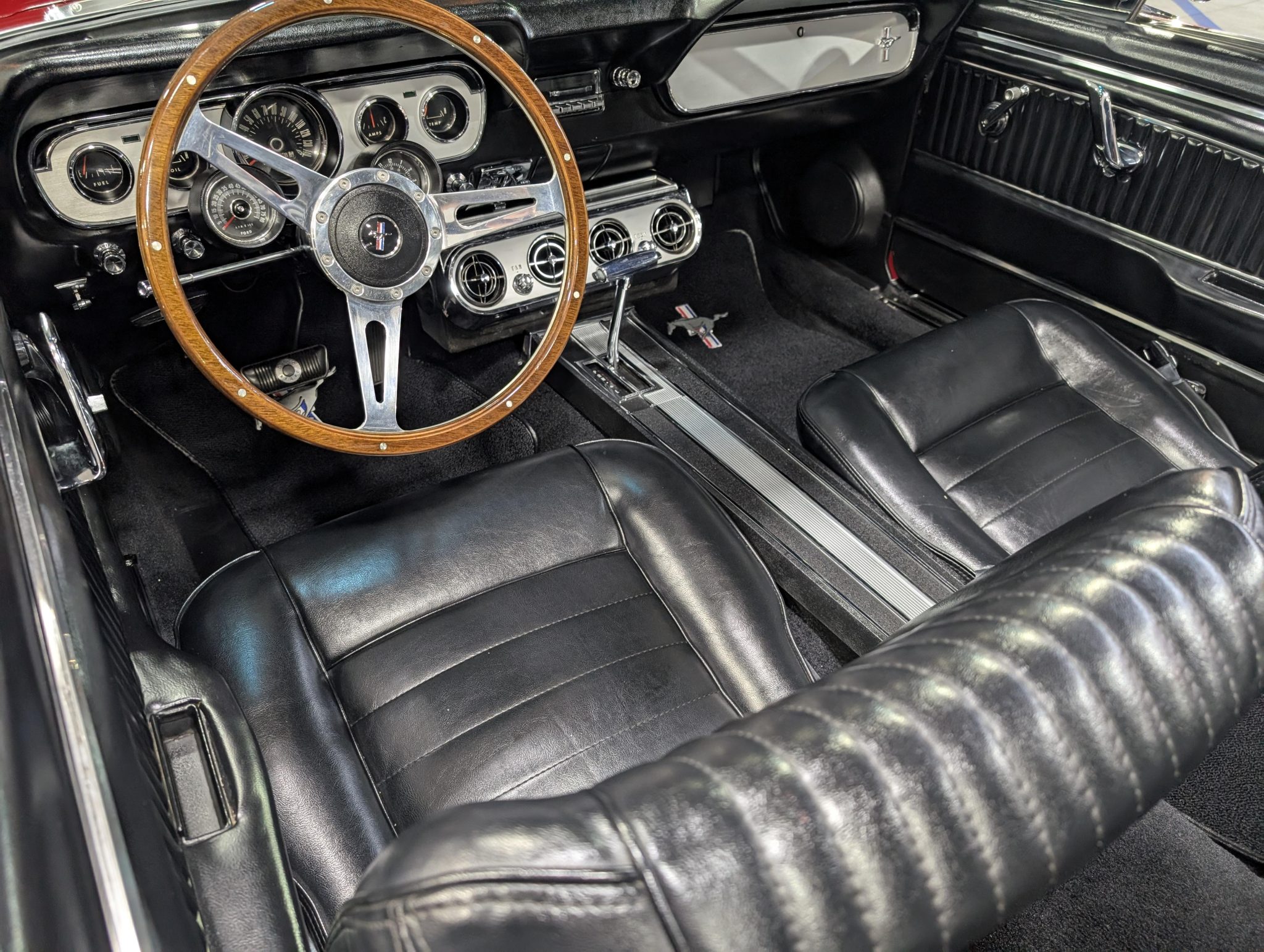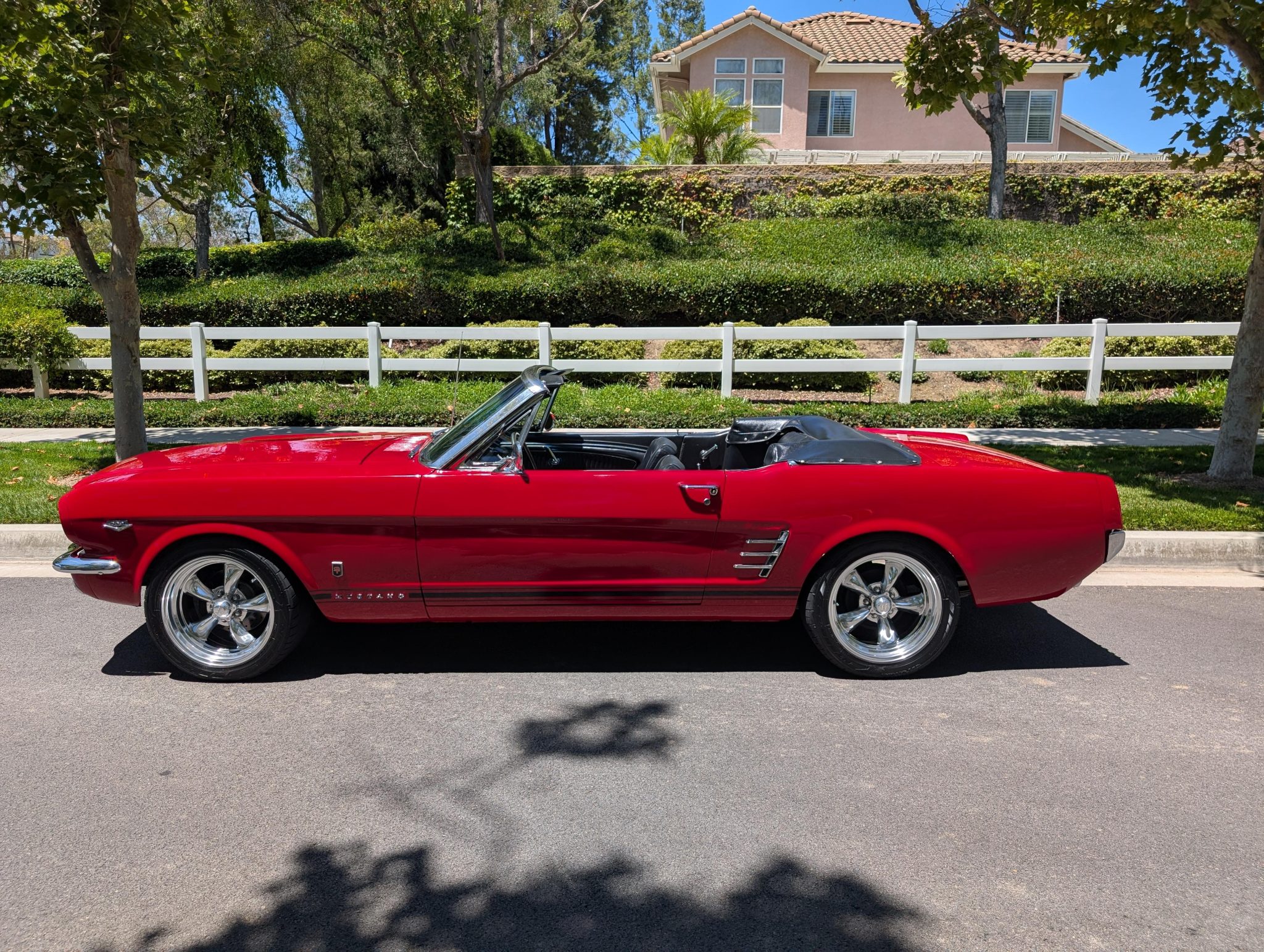 The car has been refinished in red over a refreshed black interior with luxury Pony vinyl, and it is powered by a 289ci V8 that is backed by a three-speed automatic transmission. Components include an Edelbrock intake manifold, a Brawler four-barrel carburetor, a revised camshaft, and a stainless-steel exhaust system with ceramic-coated headers, an X-pipe, and Flowmaster mufflers. The car rides on polished American Racing Torq Thrust II wheels and has front disc brakes with a revised booster and master cylinder as well as Borgeson power steering, KYB shocks, a Scott Drake rear sway bar, and Global West subframe connectors. Additional details include a black soft top and top boot, GT-style side stripes and badging, grille-mounted fog lights, an under-dash air conditioning system, and a retro-style head unit linked to aftermarket speakers and a trunk-mounted subwoofer.