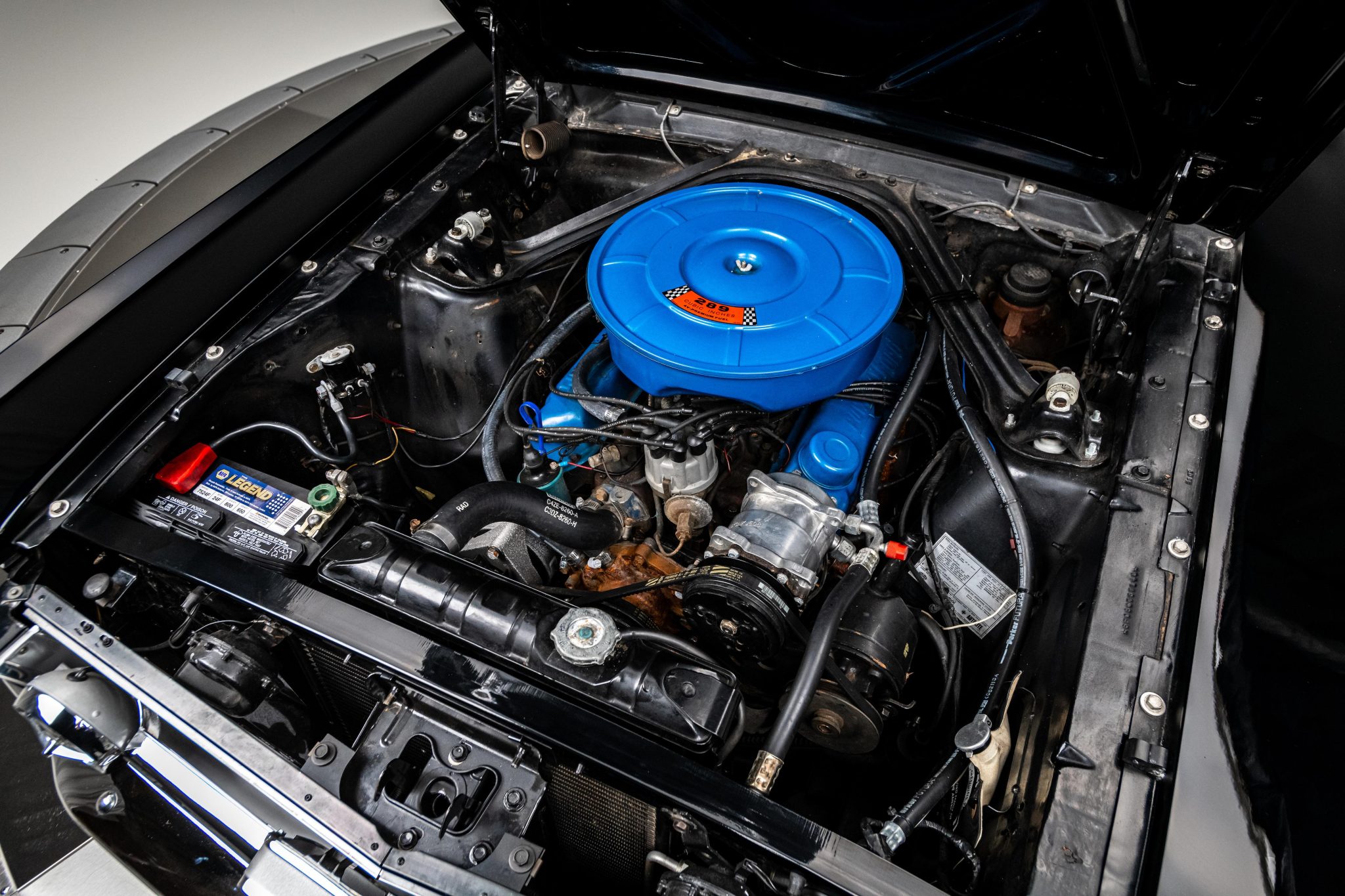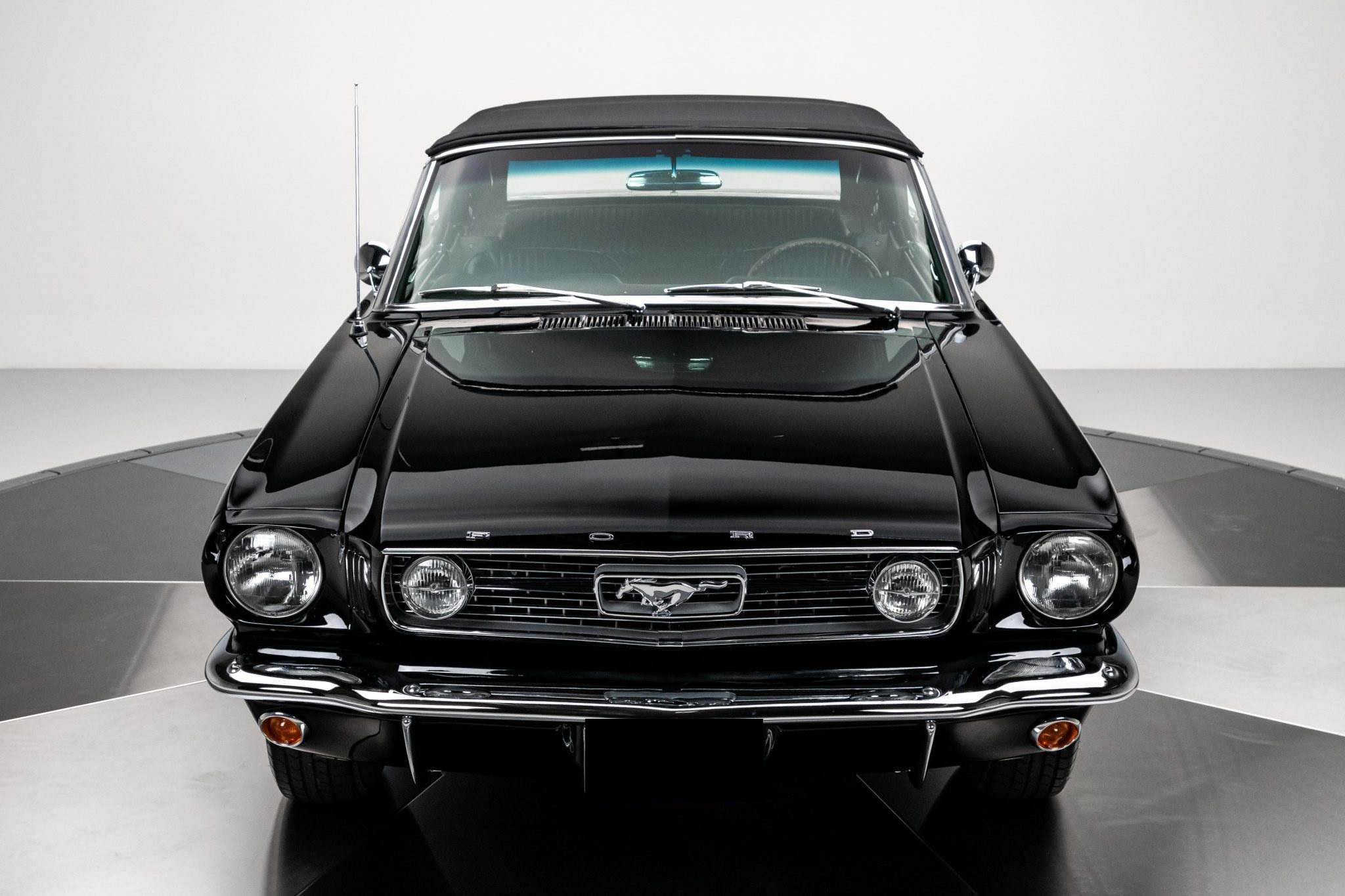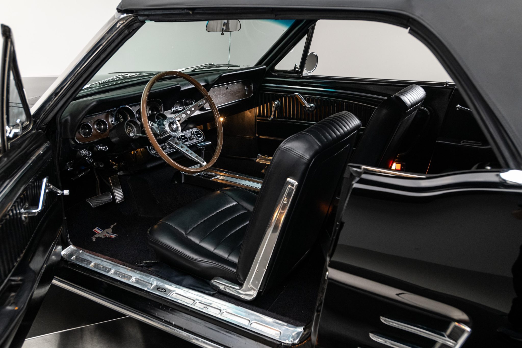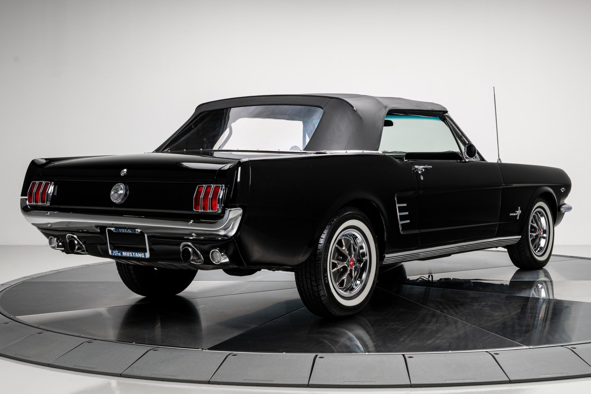 This triple-black 1966 Ford Mustang was restored and modified between 2006 and 2017 GT-style equipment has been added, including styled-steel wheels, grille lights, Rally Pac instruments, and a dual exhaust system exiting through the rear valance, and it also has air conditioning, woodgrain trim, and bucket seats. Power comes from a 289ci V8 linked with a three-speed automatic transmission.