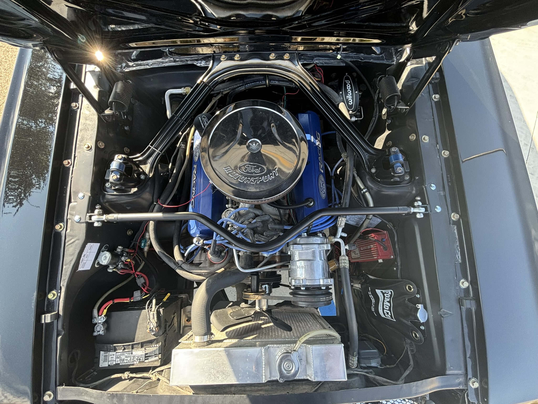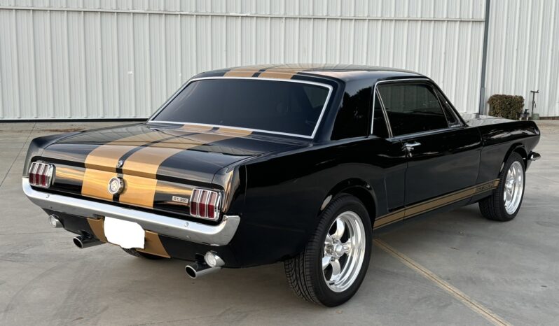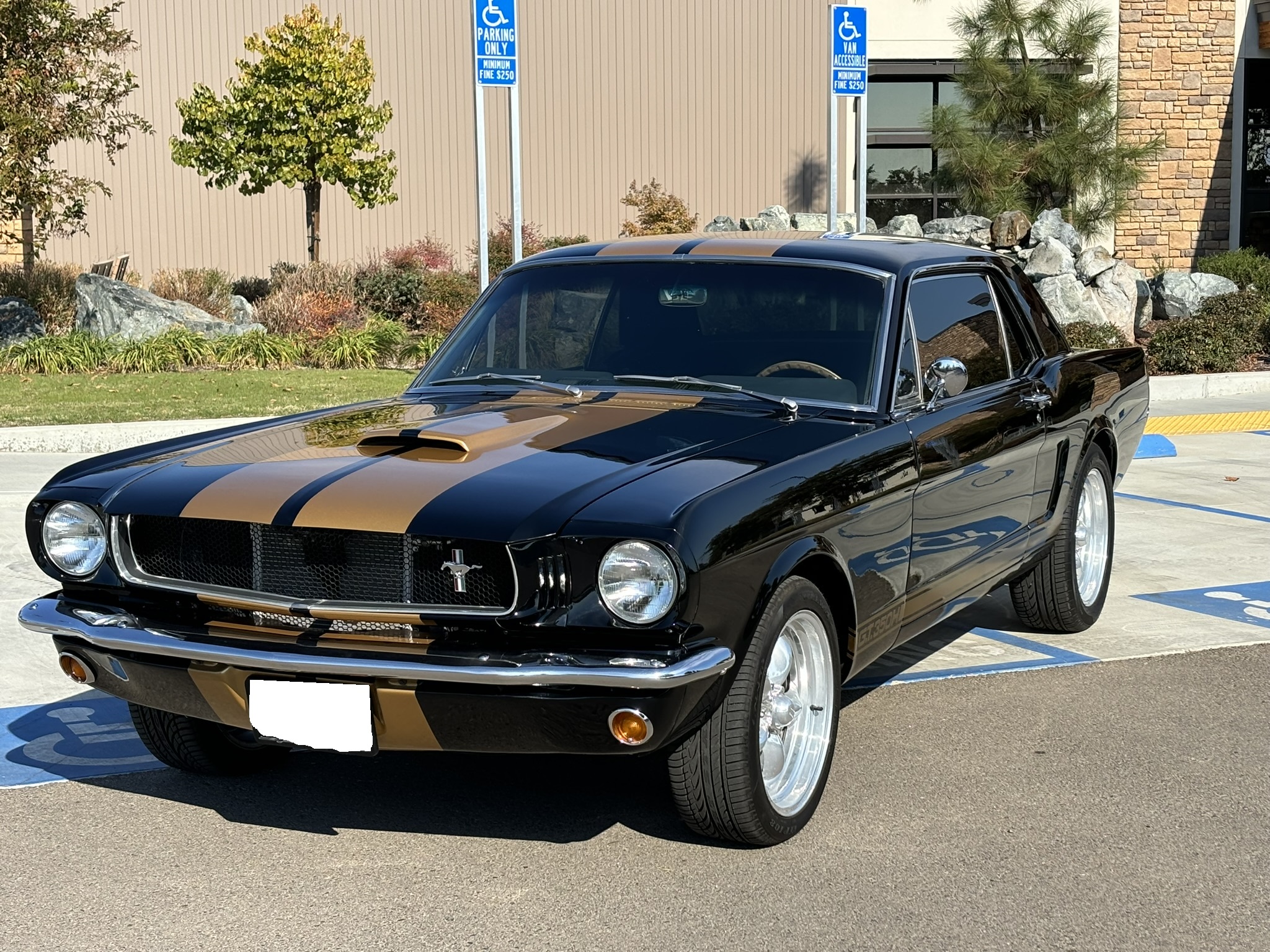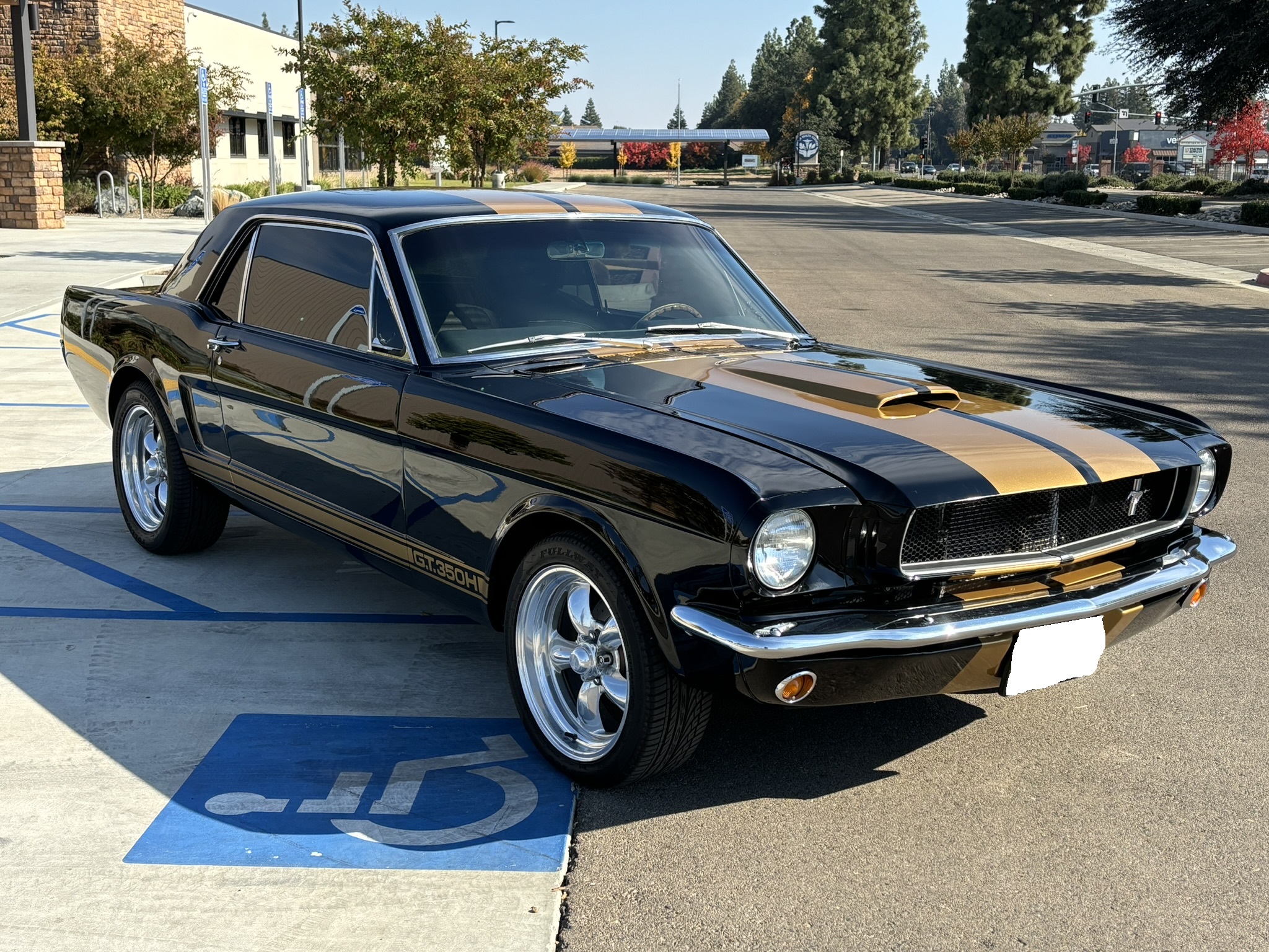 This 1966 Ford Mustang coupe was refurbished circa 2015 and fitted with an overbored 302ci V8 that is paired with a four-speed manual transmission and equipped with flat-top pistons, an Edelbrock carburetor, Edelbrock cylinder heads, and Hooker headers. Additional work involved refinishing the car in black with gold stripes, and the refreshed black interior features air conditioning, a Hurst shifter, and a JVC head unit linked to Pioneer speakers and an MTX subwoofer. The car rides on 17″ American Racing wheels and has front disc brakes, rear air shocks, and welded subframe connectors.