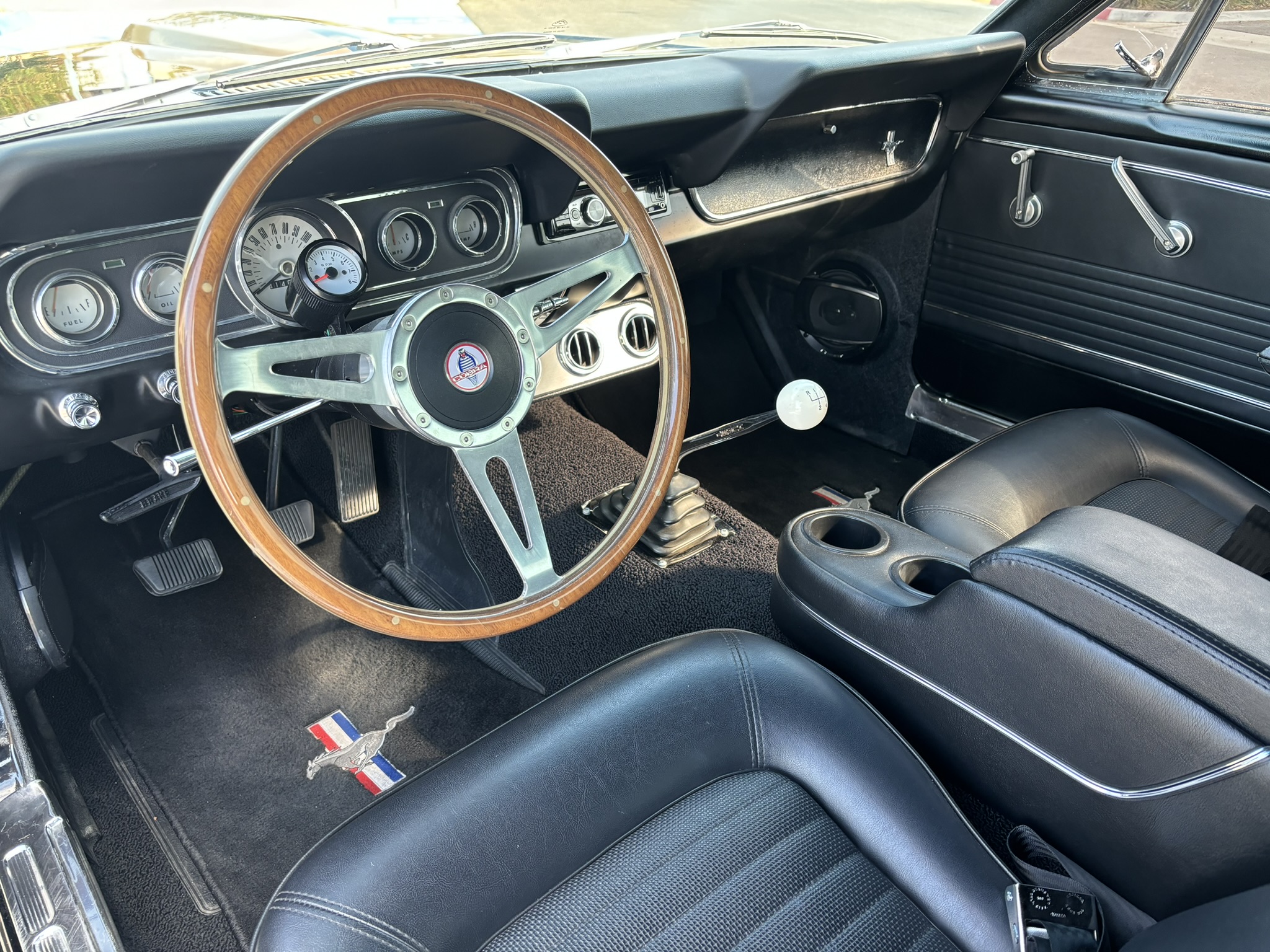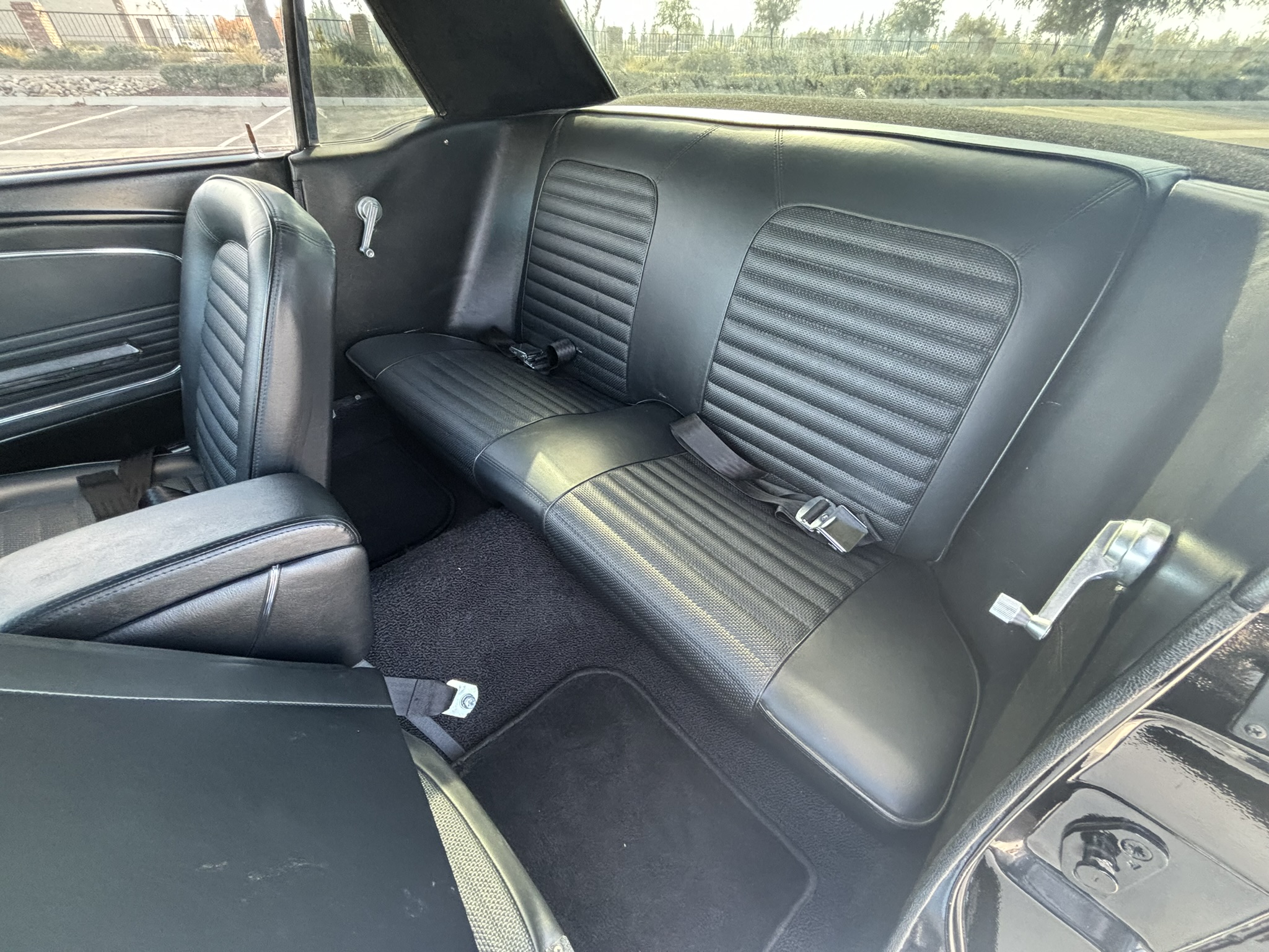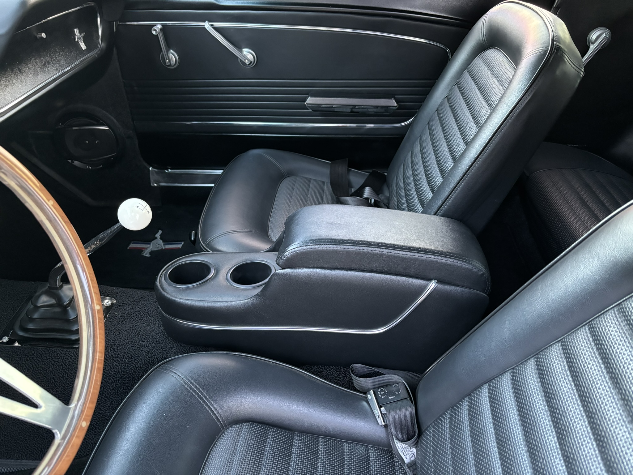 This 1966 Ford Mustang coupe was refurbished circa 2015 and fitted with an overbored 302ci V8 that is paired with a four-speed manual transmission and equipped with flat-top pistons, an Edelbrock carburetor, Edelbrock cylinder heads, and Hooker headers. Additional work involved refinishing the car in black with gold stripes, and the refreshed black interior features air conditioning, a Hurst shifter, and a JVC head unit linked to Pioneer speakers and an MTX subwoofer. The car rides on 17″ American Racing wheels and has front disc brakes, rear air shocks, and welded subframe connectors.