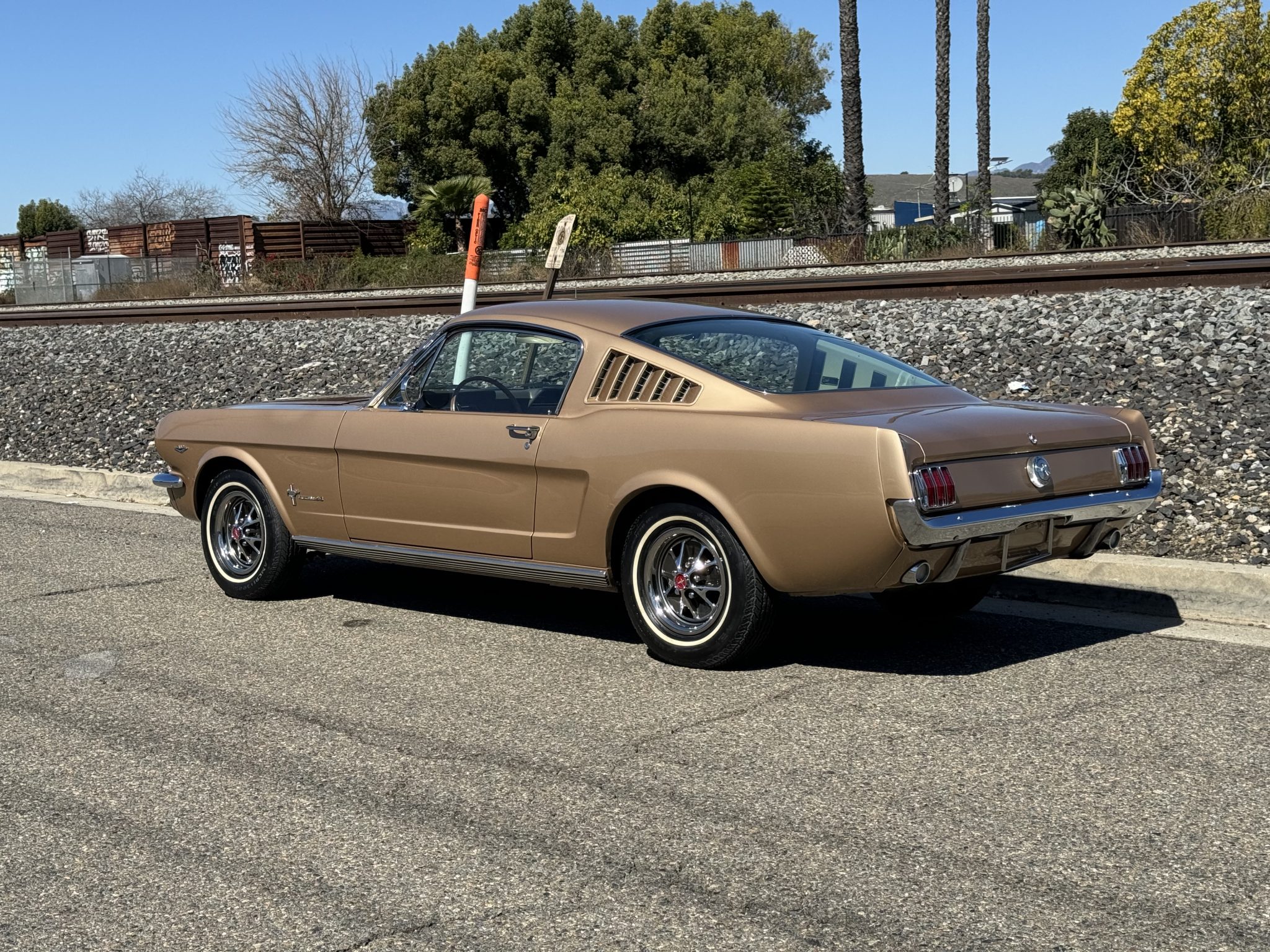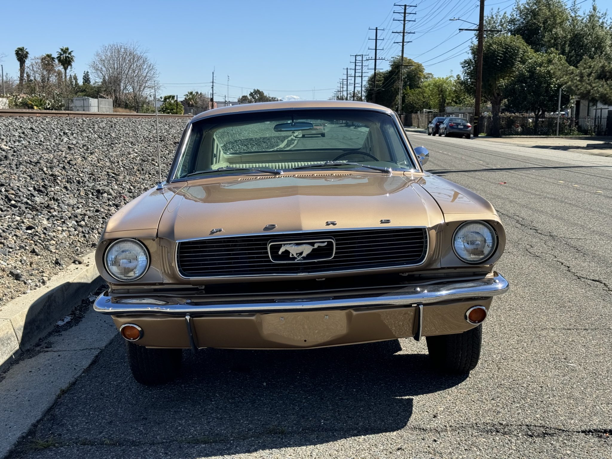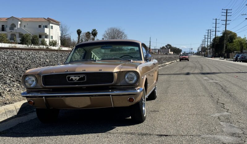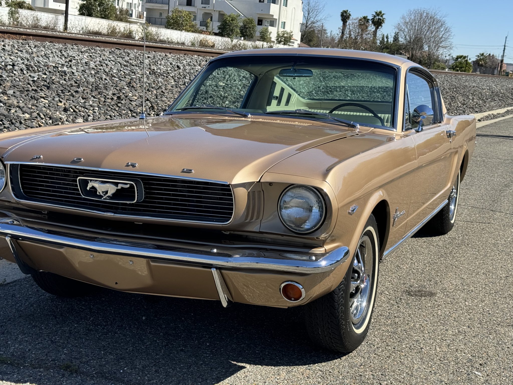 This 1966 Ford Mustang fastback factory finished in Antique Bronze over a Parchment and Palomino luxury interior Power is provided by a C-code 289ci V8 paired with a three-speed automatic transmission, and equipment includes an AM radio, front bucket seats, 14″ styled steel wheels, power steering, and an aftermarket dual exhaust system.