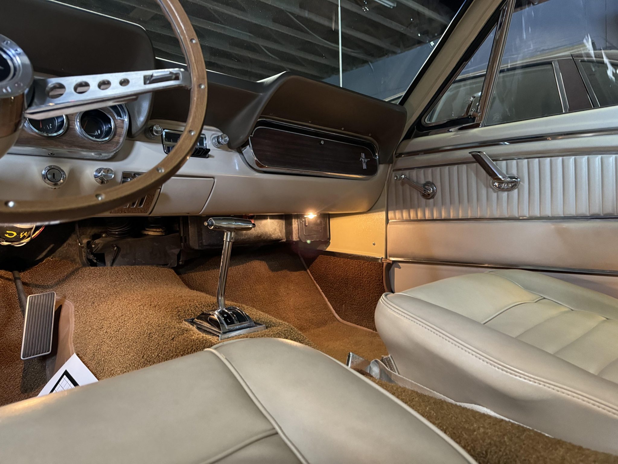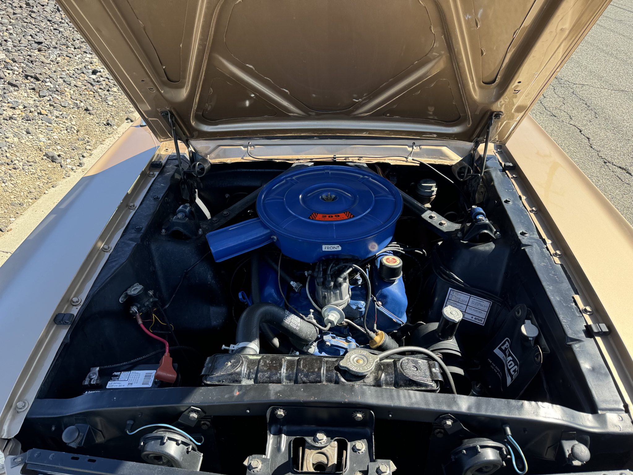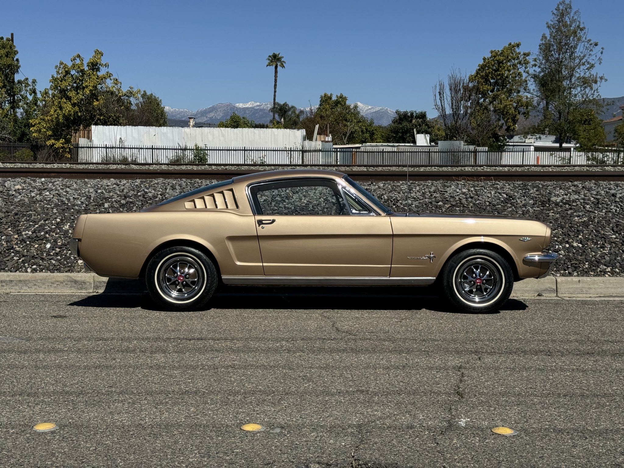 This 1966 Ford Mustang fastback factory finished in Antique Bronze over a Parchment and Palomino luxury interior Power is provided by a C-code 289ci V8 paired with a three-speed automatic transmission, and equipment includes an AM radio, front bucket seats, 14″ styled steel wheels, power steering, and an aftermarket dual exhaust system.