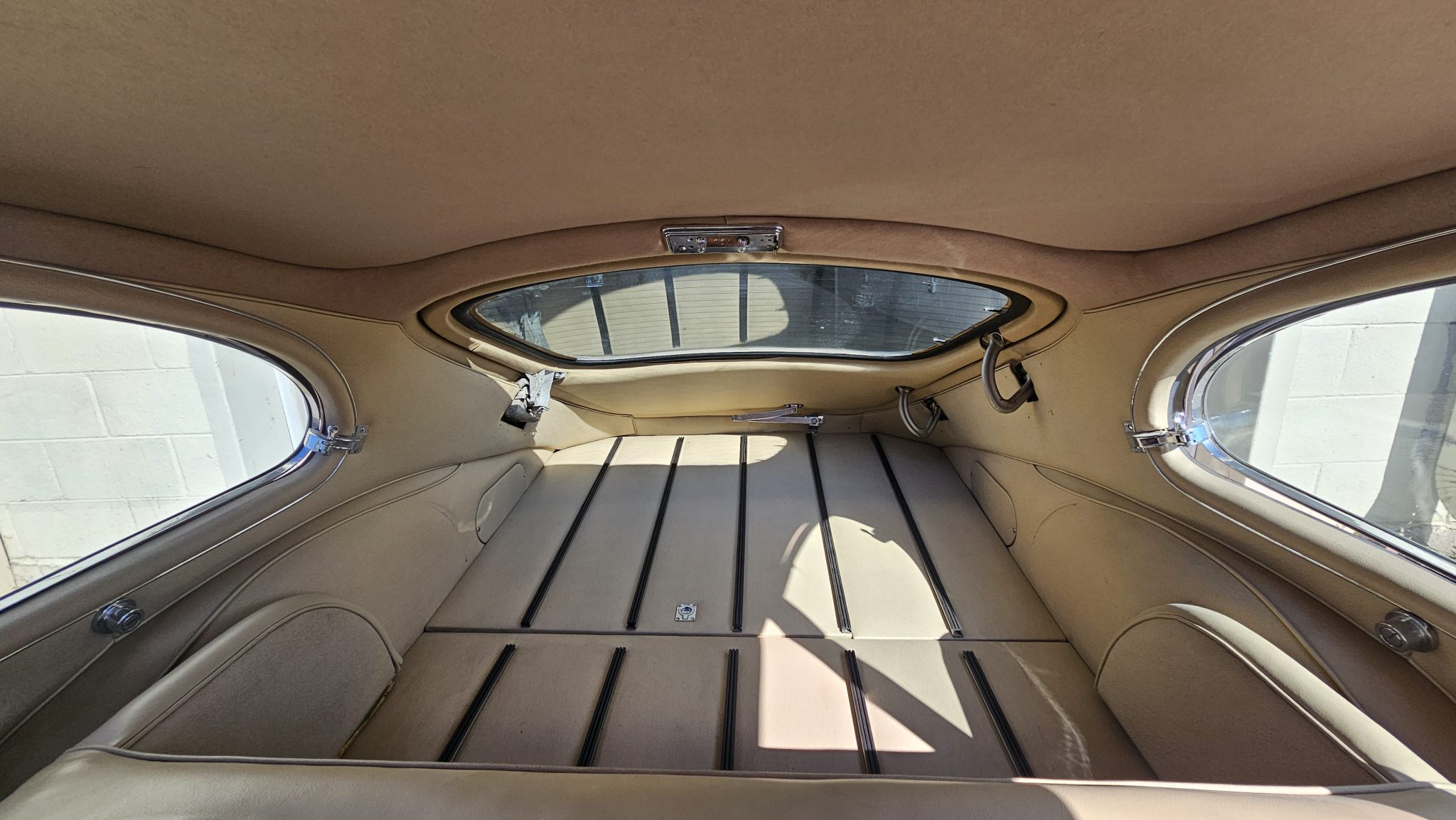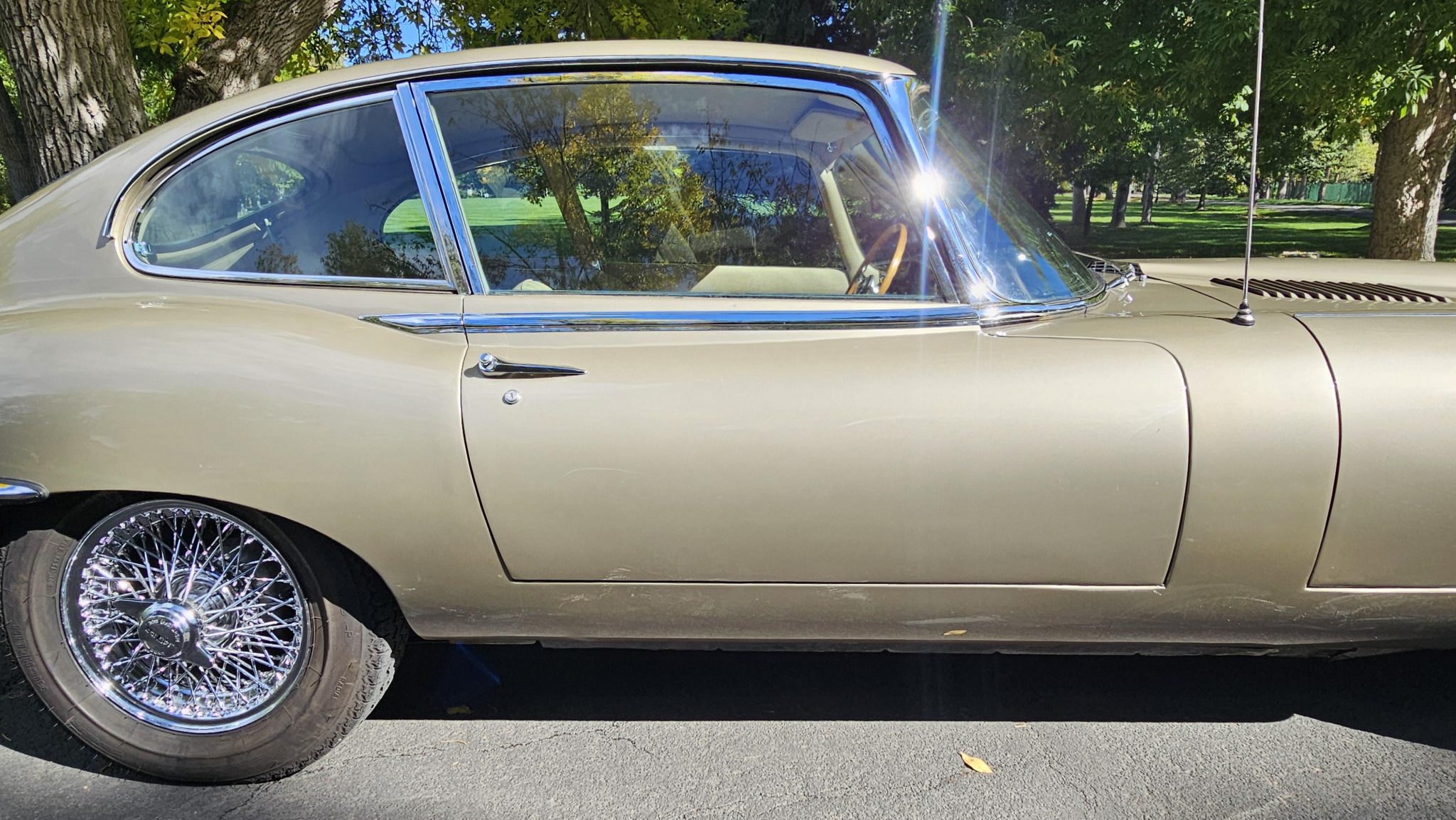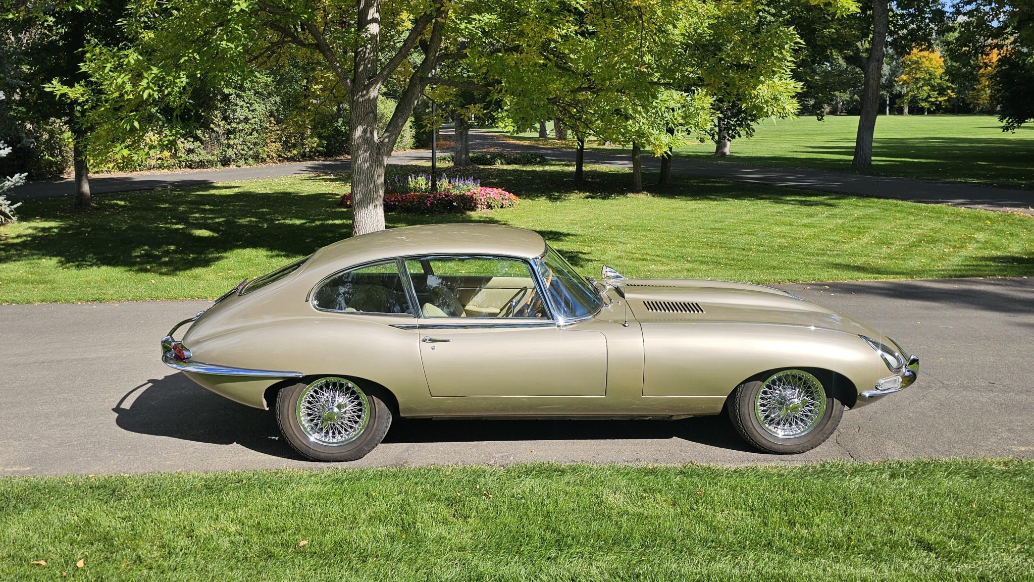 The car is powered by a 4.2-liter inline-six fitted with triple SU carburetors that is linked to a four-speed manual transmission and a limited-slip differential. It rides on 15″ wire-spoke wheels and is equipped with a louvered clamshell hood, enclosed headlights, and wraparound chrome bumpers with overriders. Inside, 2+2 seating trimmed in light tan leather is accompanied by a wood-rimmed steering wheel and a Becker radio.