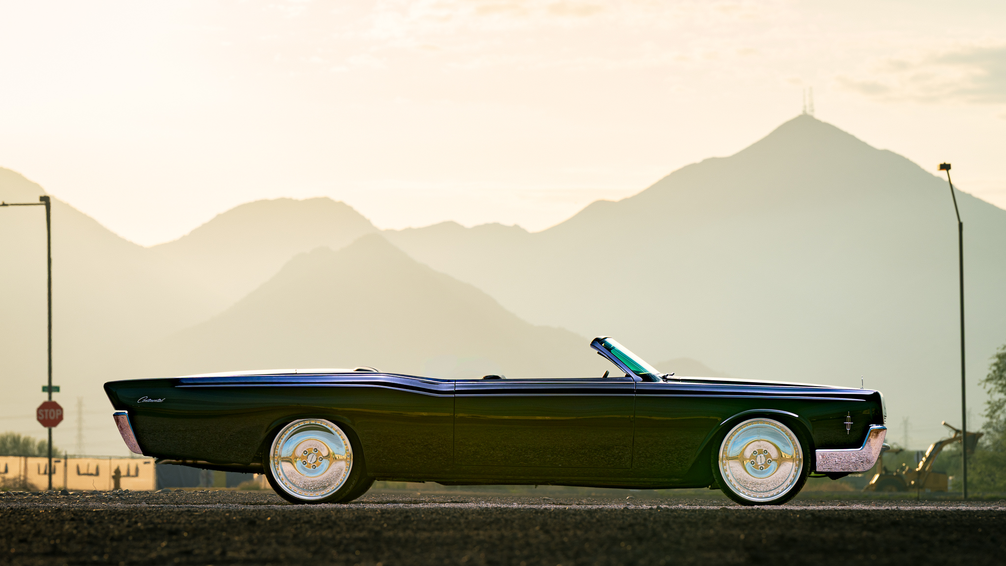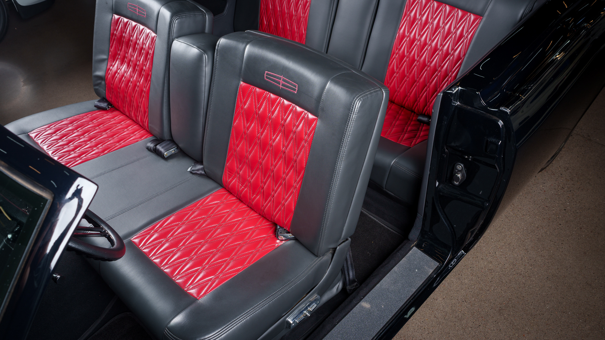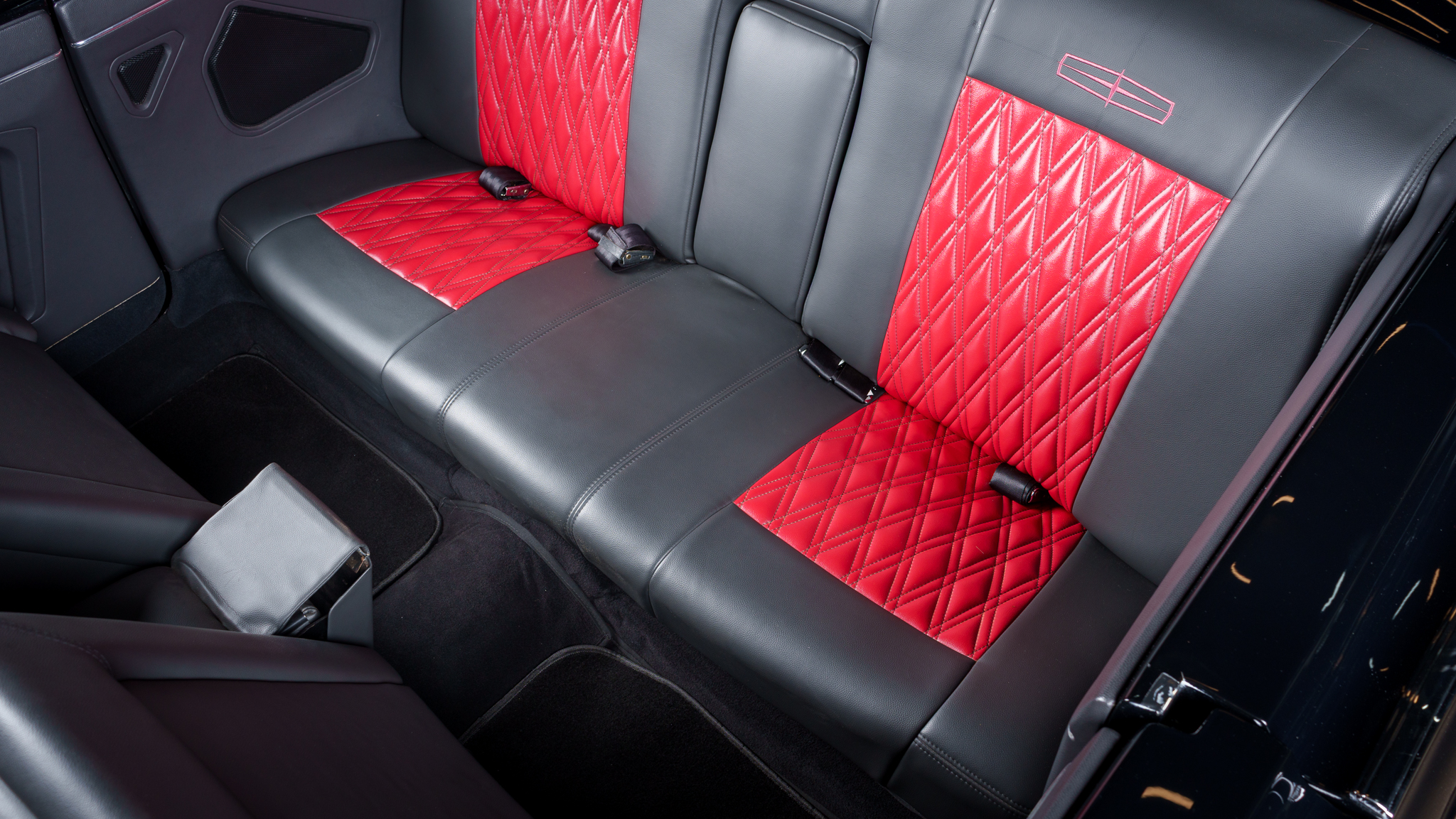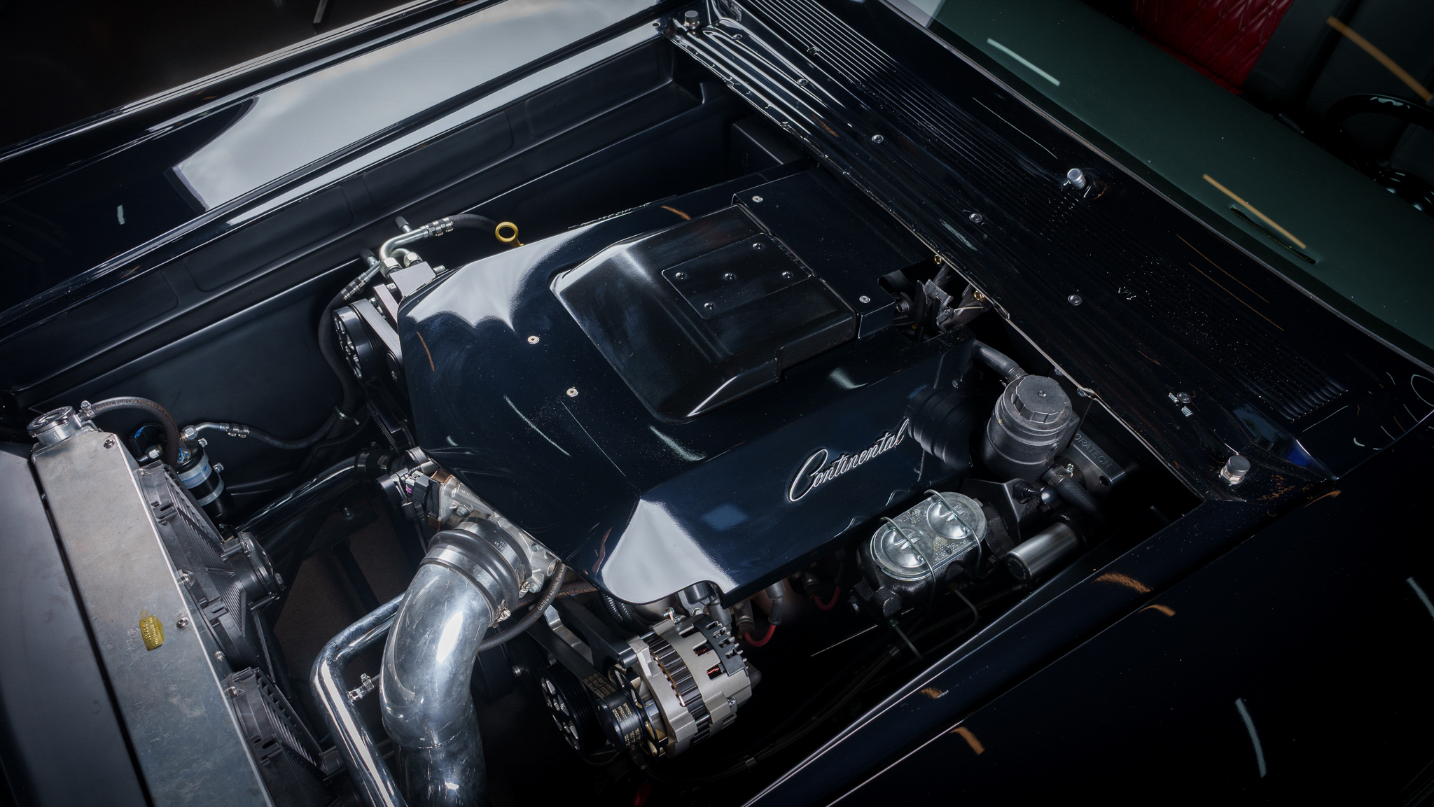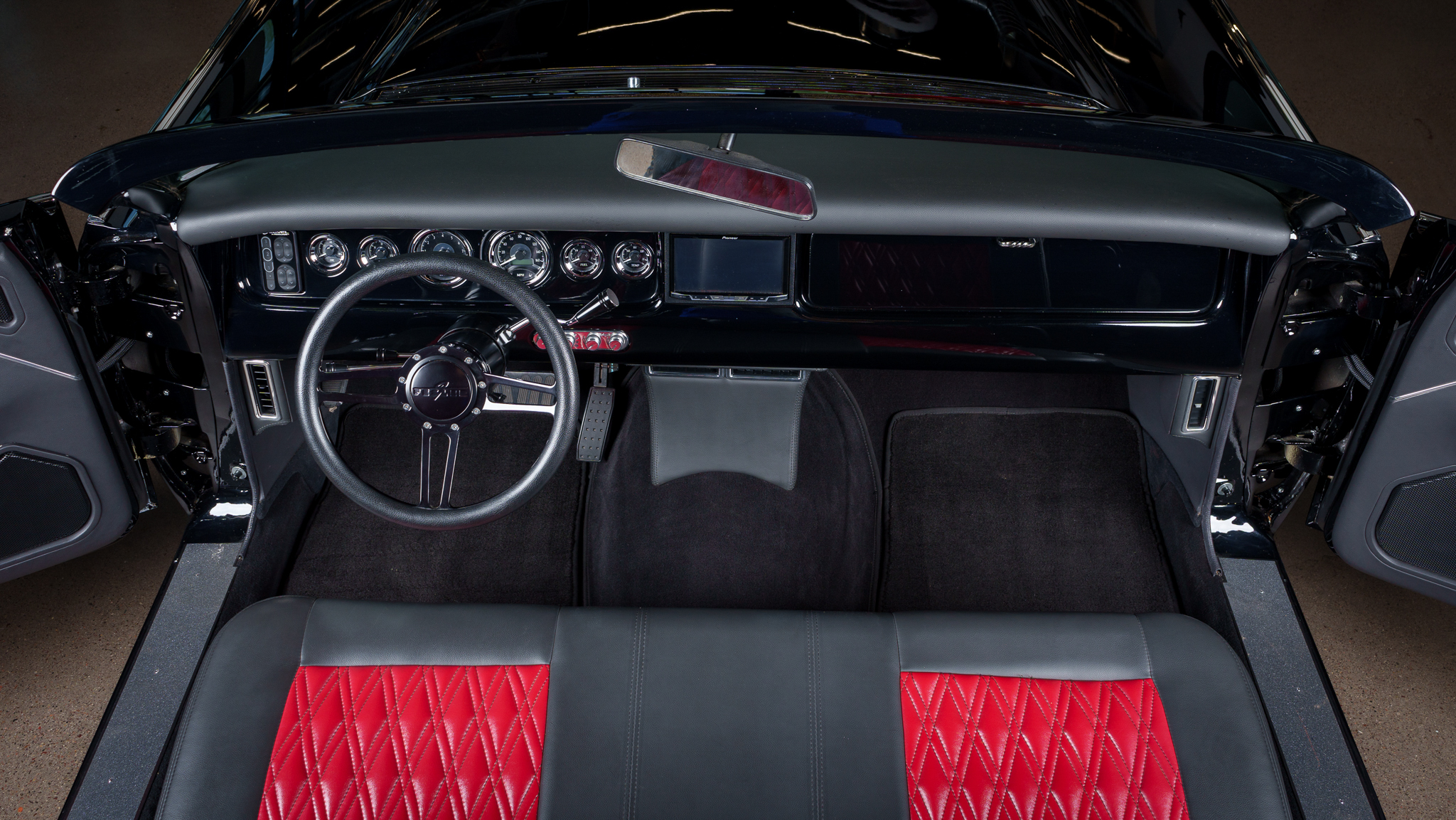 Power comes from a supercharged 6.2-liter LSA V8 linked to a four-speed automatic transmission and a Ford 9” rear end, and the car rides on an air suspension with a Scott’s Hotrods independent front assembly and a Devious Customs four-link rear setup. The bodywork was modified with a chopped windshield, extended rear tailfins, fabricated trim, and shaved doors with electric poppers, while the interior was outfitted with gray and red leather upholstery, Vintage Air climate control, an Ididit tilt column, Dakota Digital gauges, and a JL Audio sound system with a Pioneer digital media receiver.
