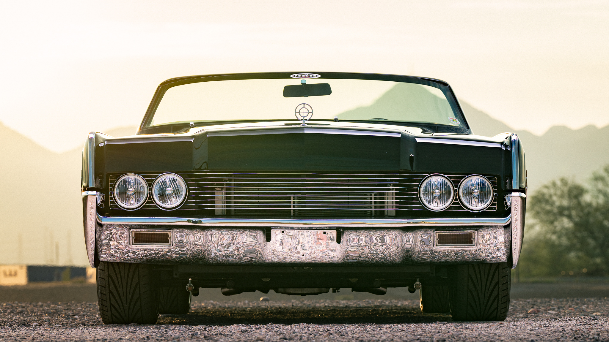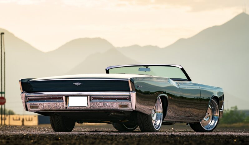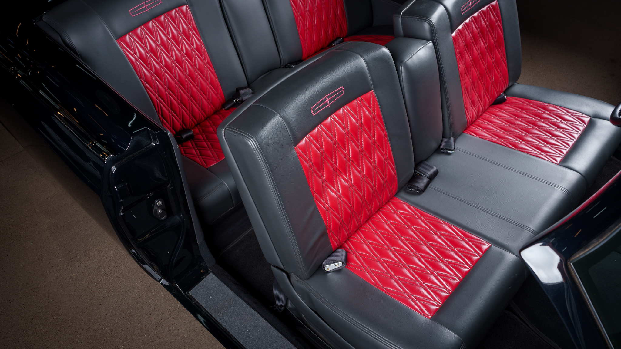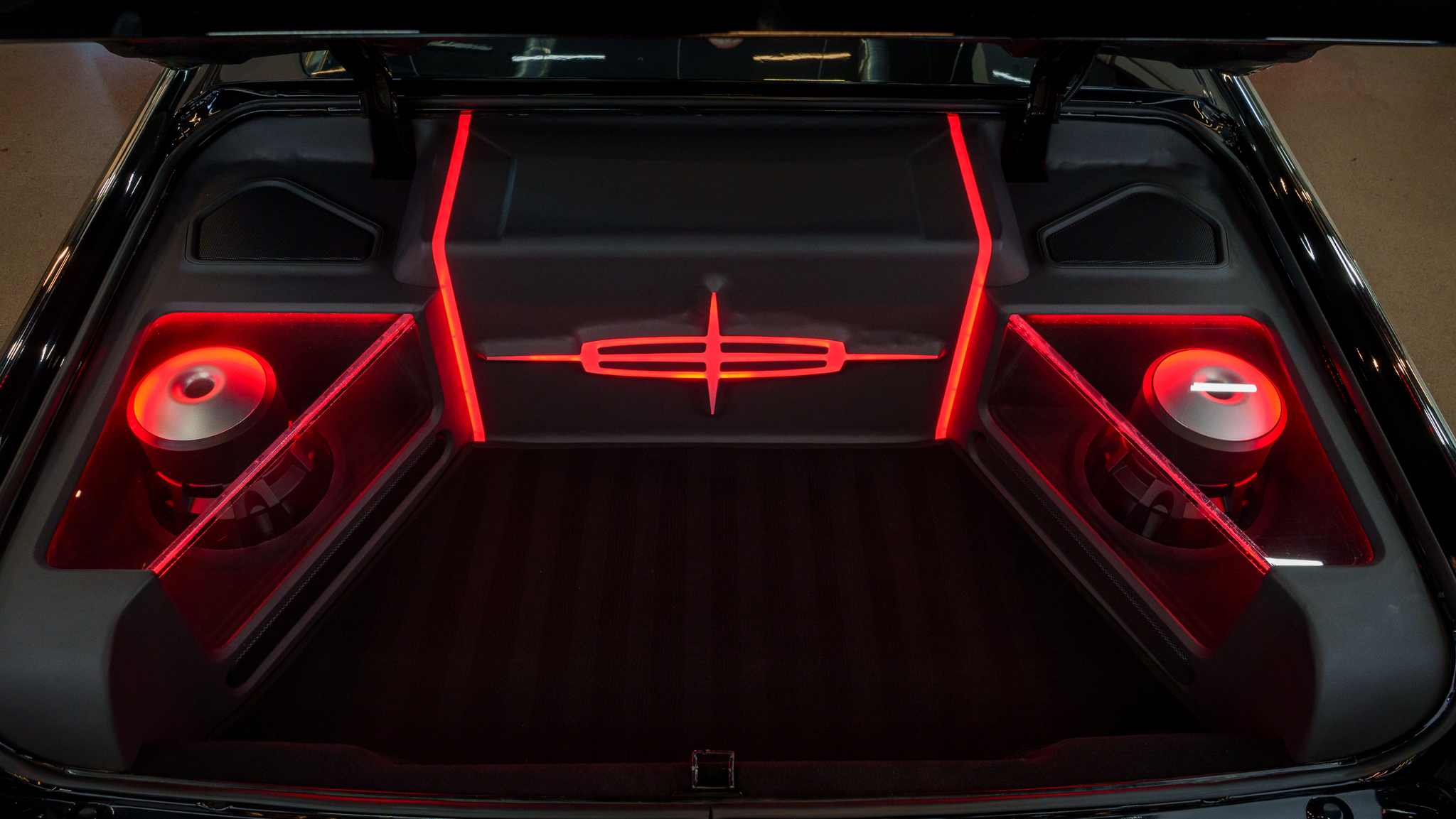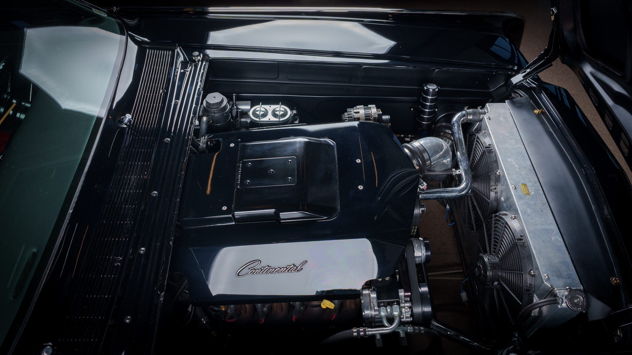 Power comes from a supercharged 6.2-liter LSA V8 linked to a four-speed automatic transmission and a Ford 9” rear end, and the car rides on an air suspension with a Scott’s Hotrods independent front assembly and a Devious Customs four-link rear setup. The bodywork was modified with a chopped windshield, extended rear tailfins, fabricated trim, and shaved doors with electric poppers, while the interior was outfitted with gray and red leather upholstery, Vintage Air climate control, an Ididit tilt column, Dakota Digital gauges, and a JL Audio sound system with a Pioneer digital media receiver.