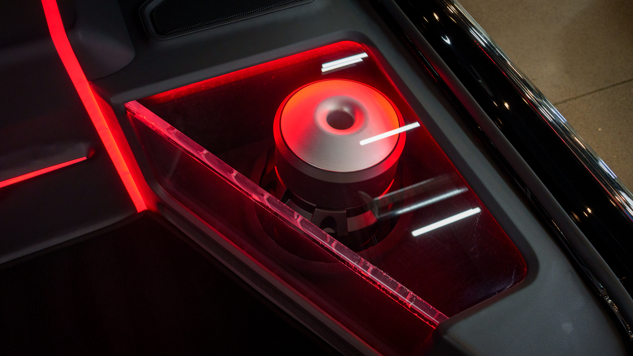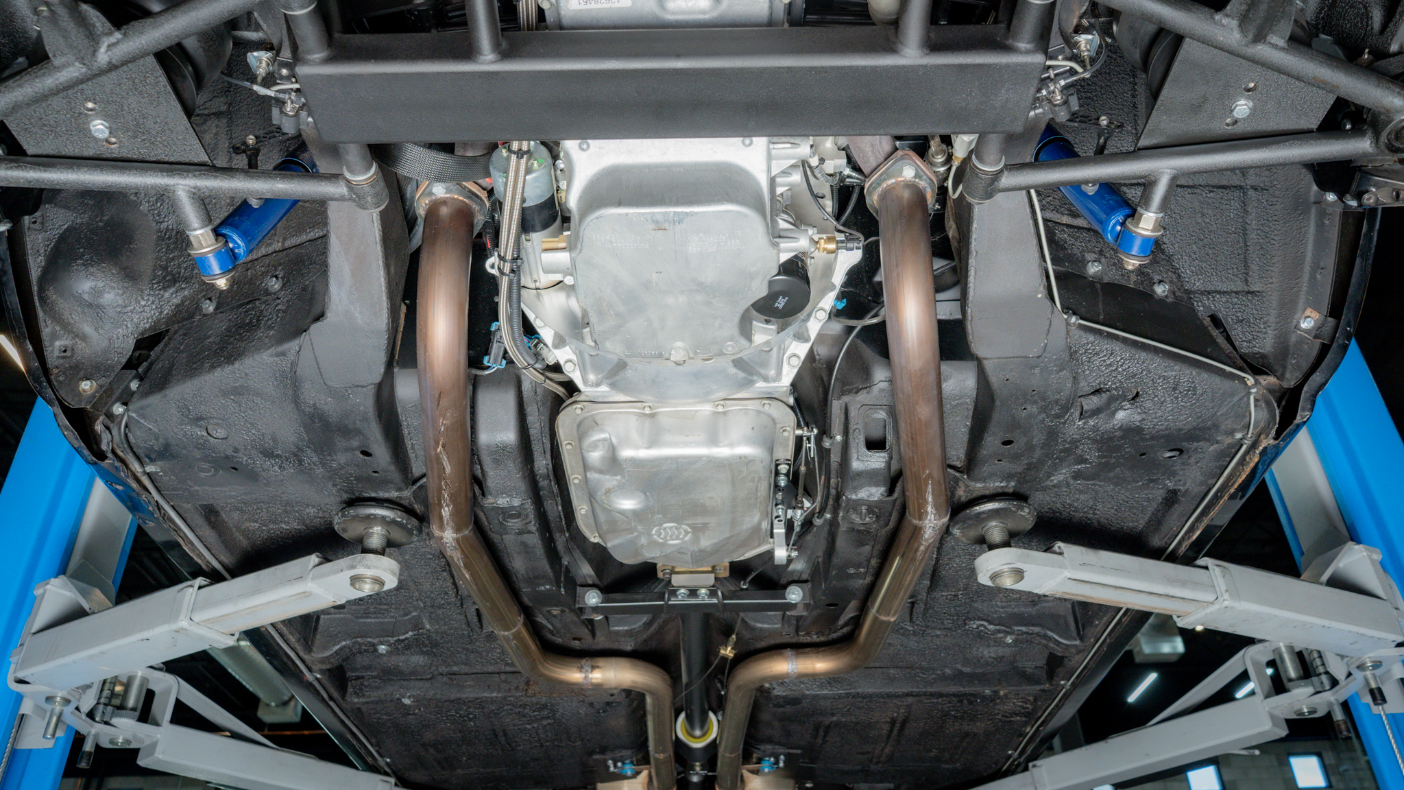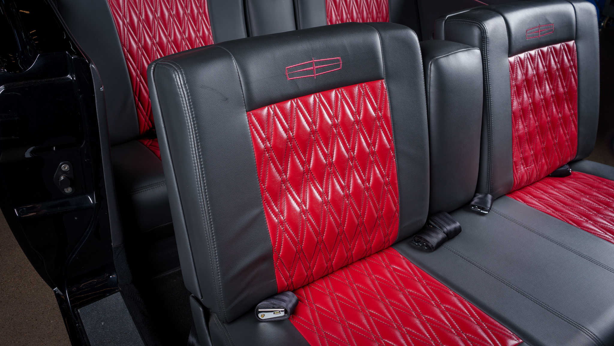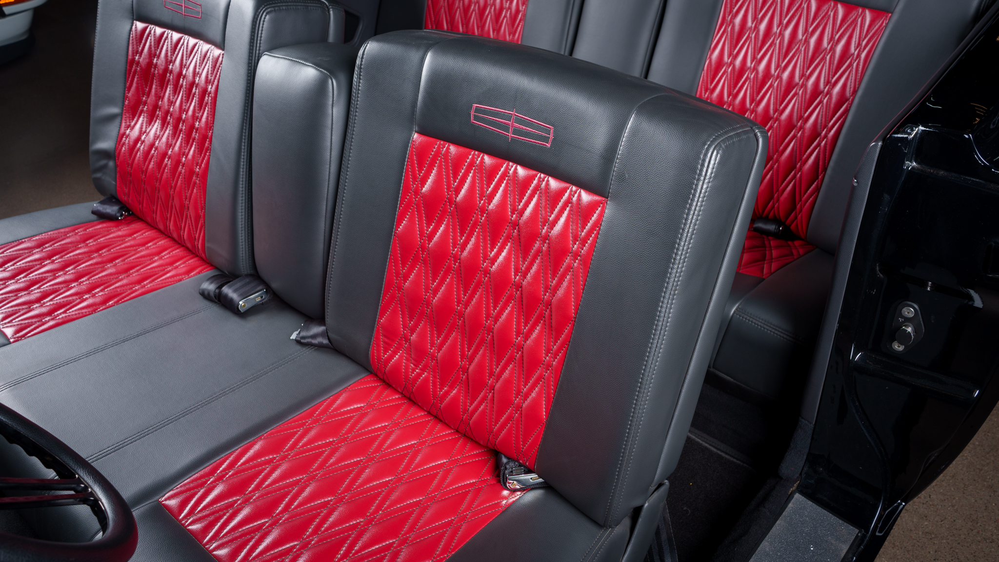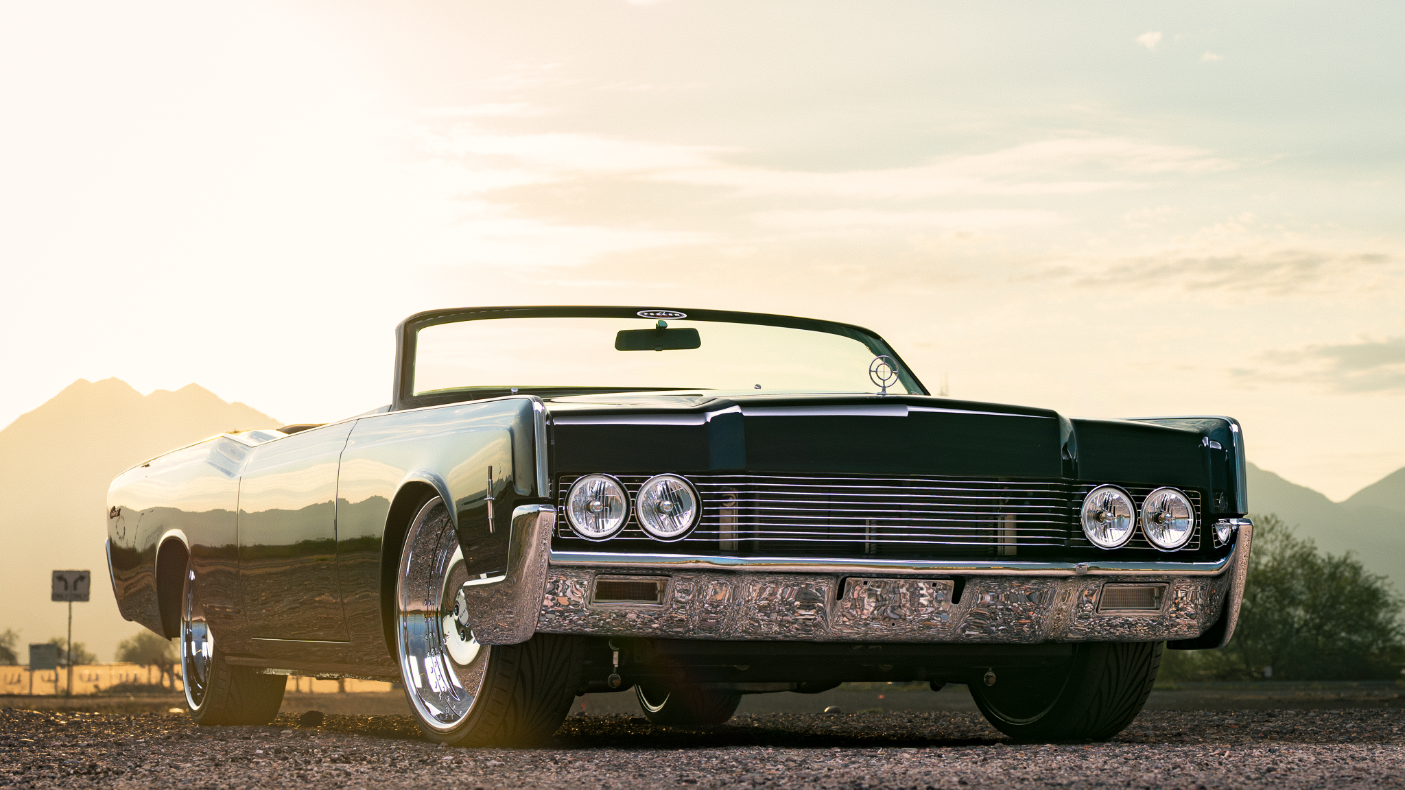 Power comes from a supercharged 6.2-liter LSA V8 linked to a four-speed automatic transmission and a Ford 9” rear end, and the car rides on an air suspension with a Scott’s Hotrods independent front assembly and a Devious Customs four-link rear setup. The bodywork was modified with a chopped windshield, extended rear tailfins, fabricated trim, and shaved doors with electric poppers, while the interior was outfitted with gray and red leather upholstery, Vintage Air climate control, an Ididit tilt column, Dakota Digital gauges, and a JL Audio sound system with a Pioneer digital media receiver.