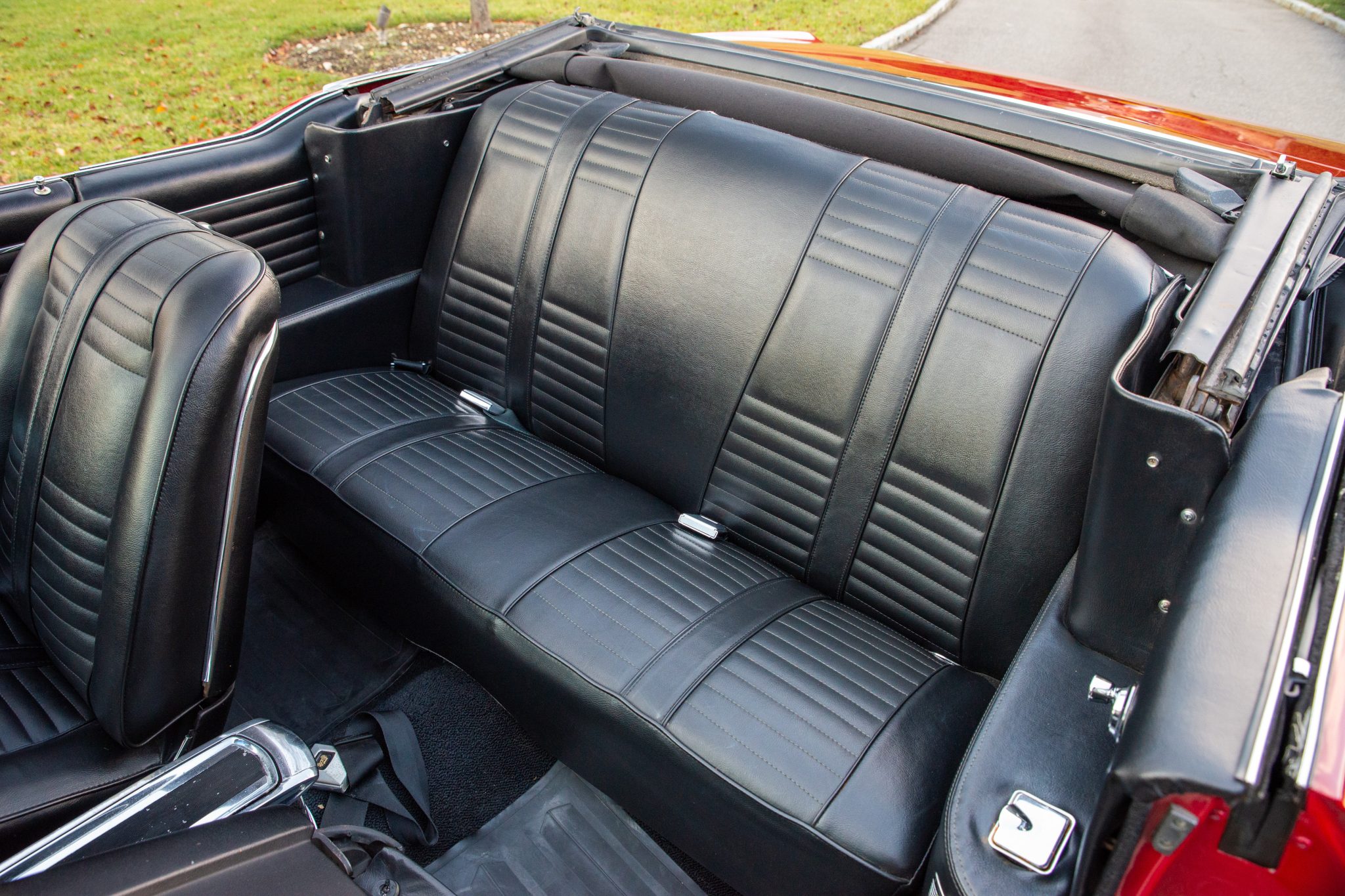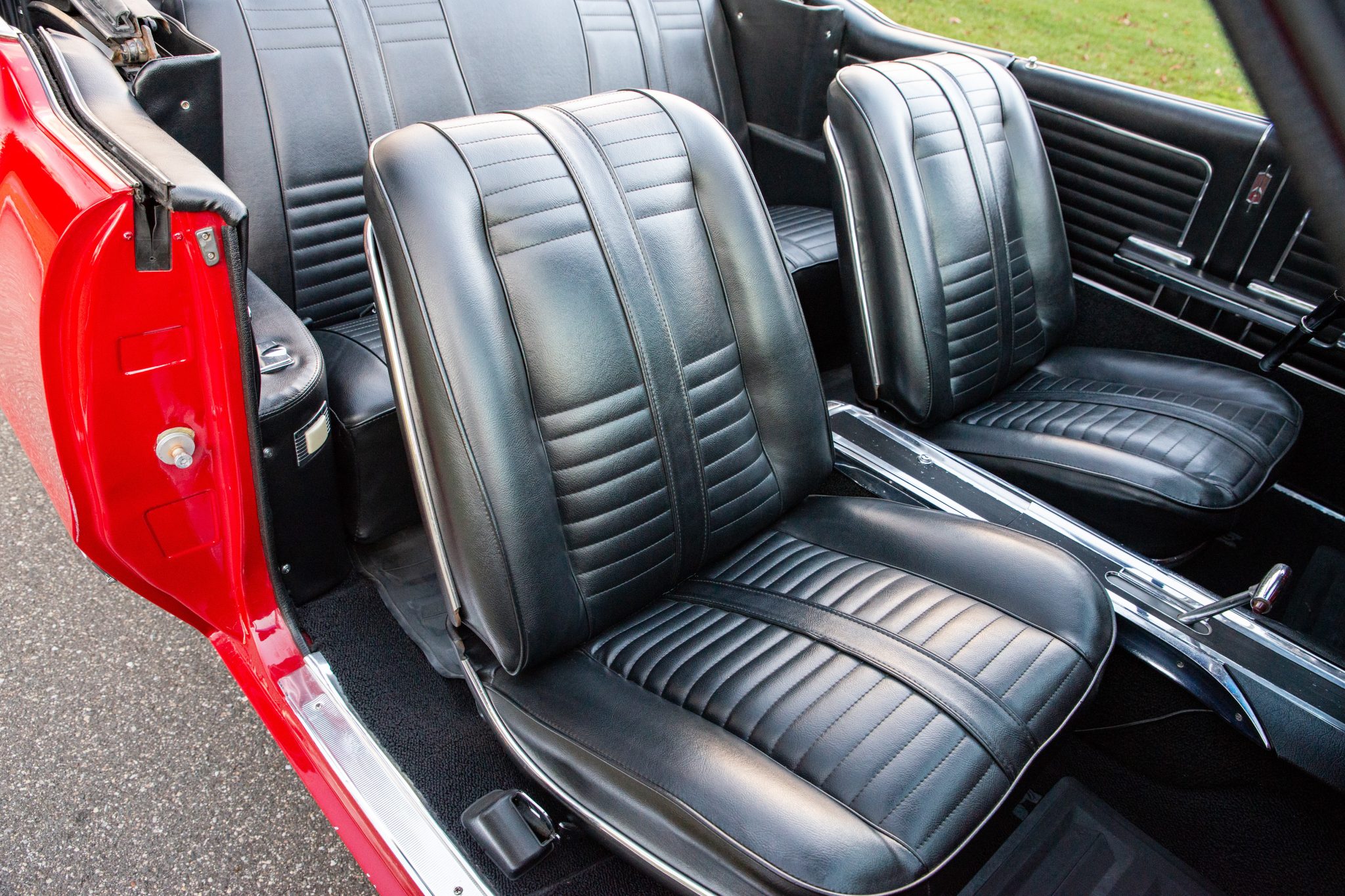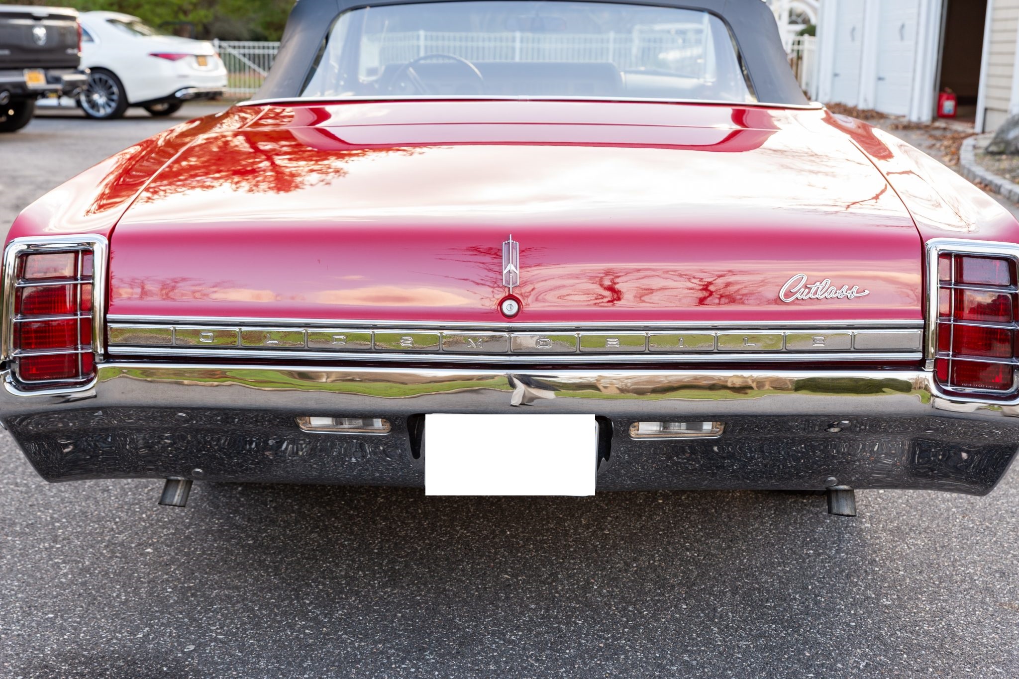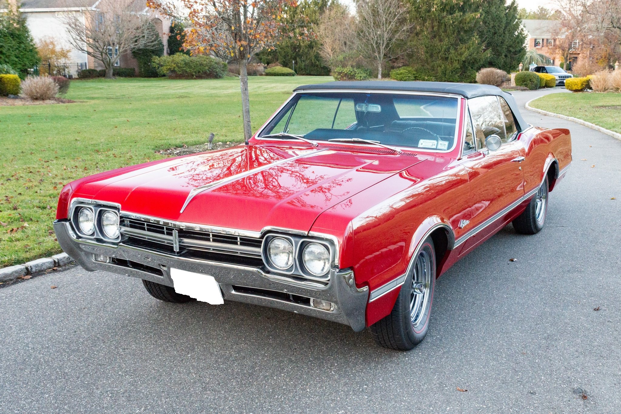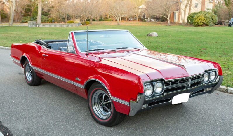 This 1966 Oldsmobile Cutlass convertible is finished in red over black upholstery and is powered by a 330ci V8 paired with a two-speed Jetaway automatic transmission. Equipment includes a power-operated black convertible top, 15″ Rallye-style wheels, power-assisted front disc brakes, power steering, front bucket seats, and a retro-style head unit.