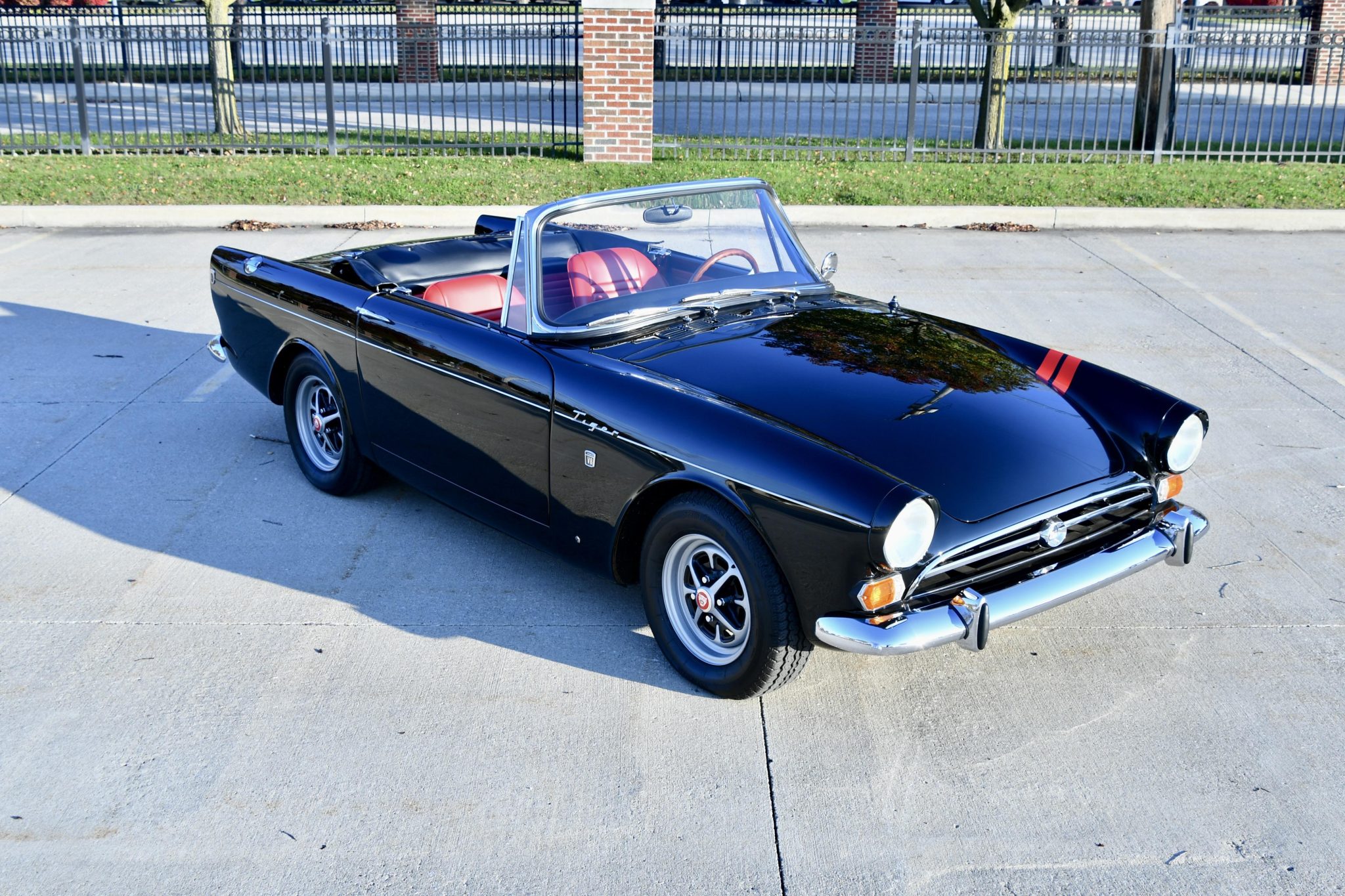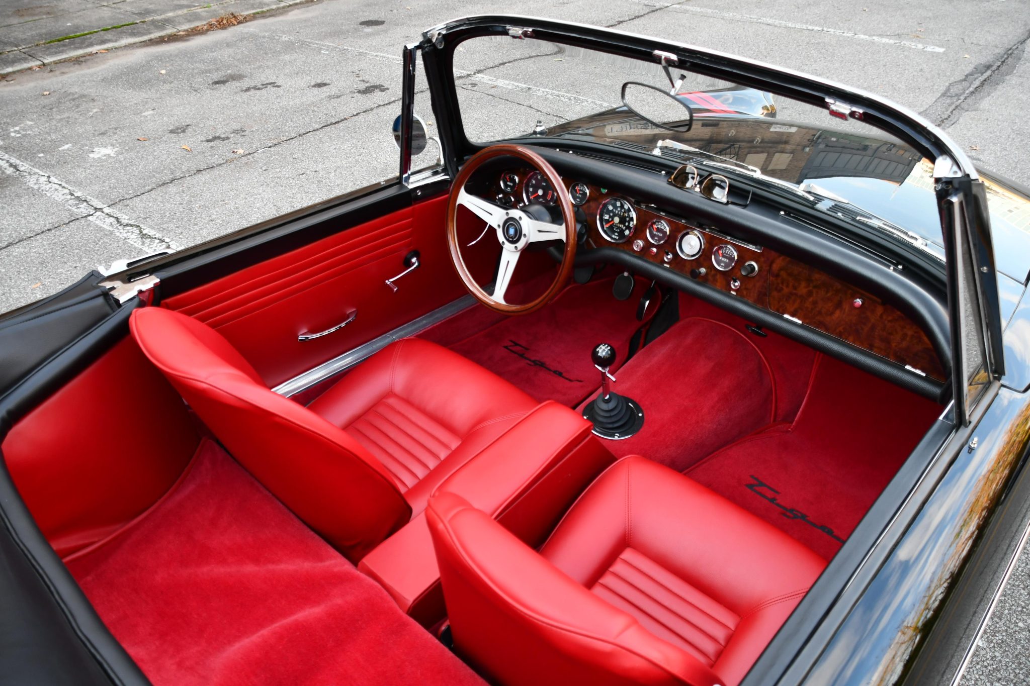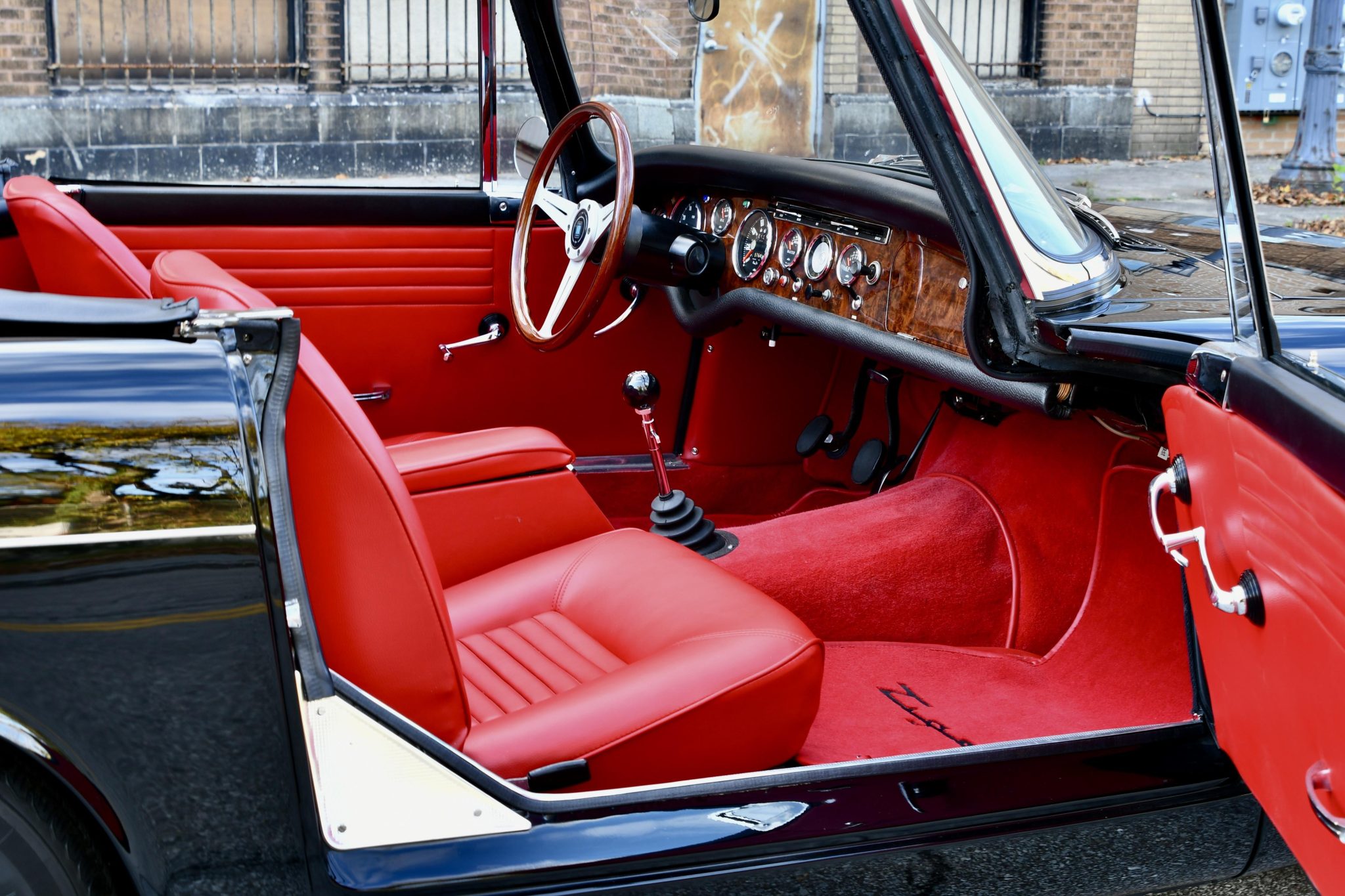 Its most recent refurbishment spanned several years and was completed in 2021. Work involved installing a Ford Performance 302ci V8 crate engine and a Tremec five-speed manual transmission, refinishing the car in black, and refreshing the red interior. Details include a body-color soft top and removable hardtop, a wood-rimmed Nardi steering wheel, a woodgrain dash panel, 13″ Rostyle wheels, a dual exhaust system fed by long-tube headers, front disc brakes, and chrome bumpers