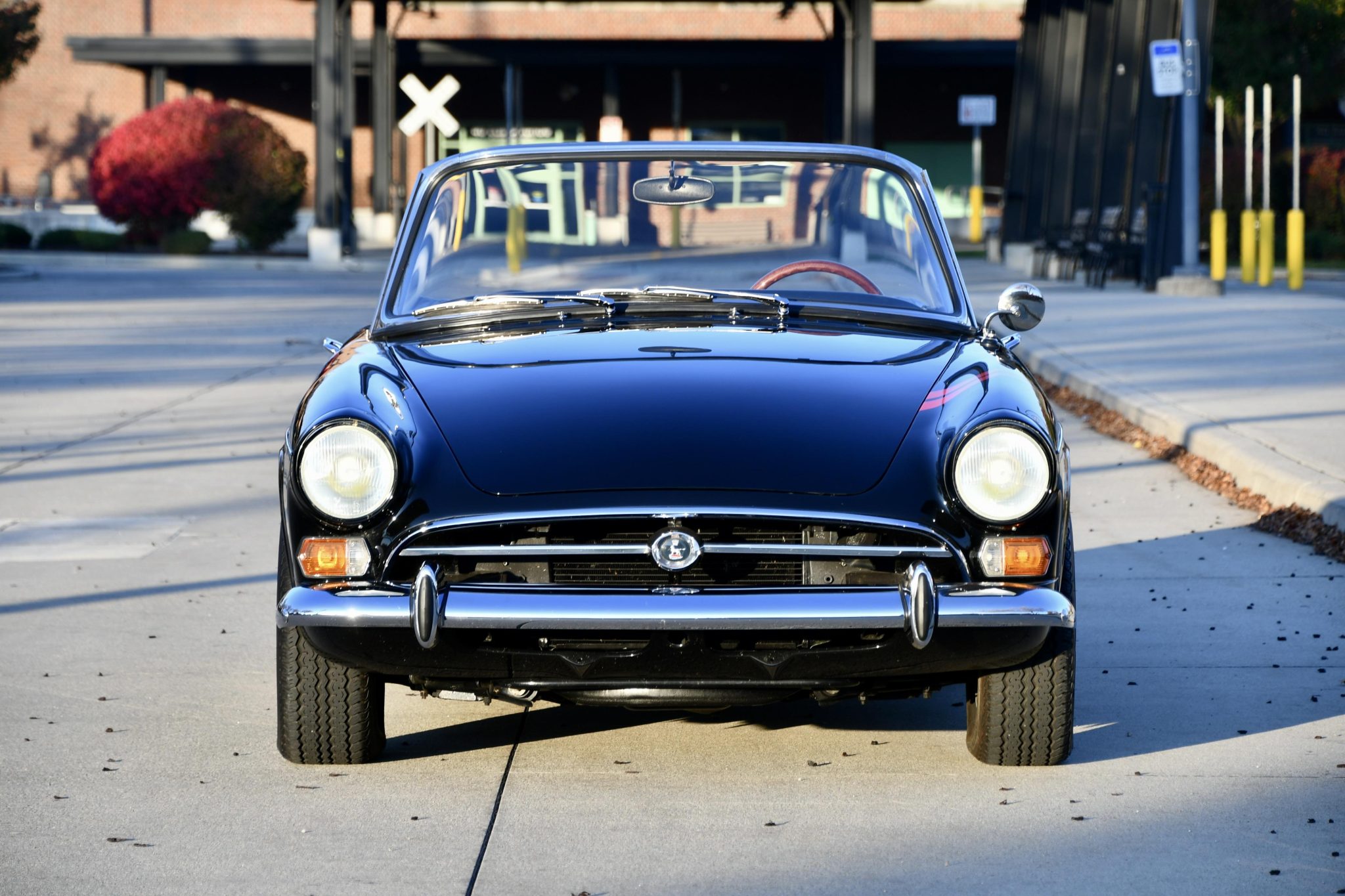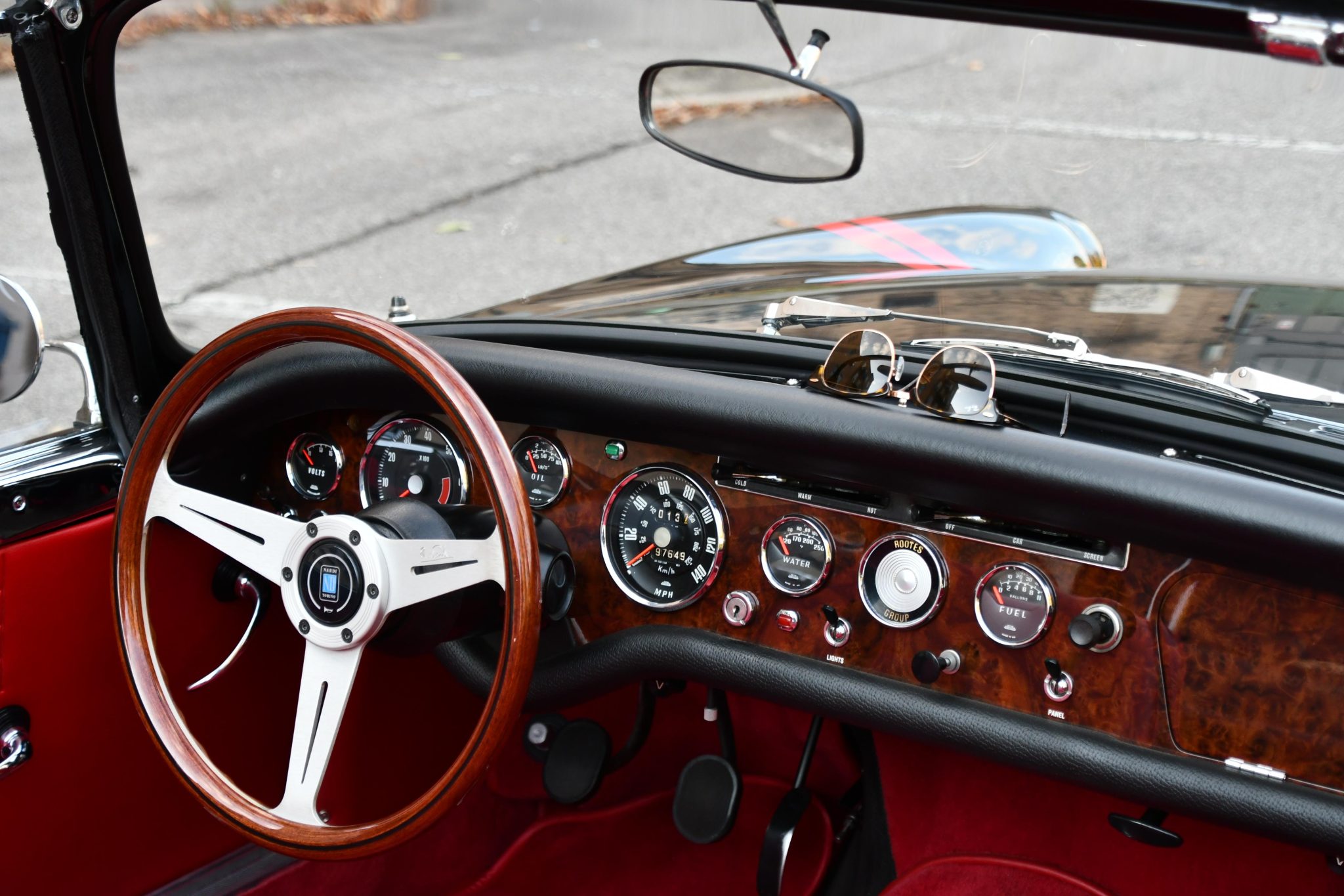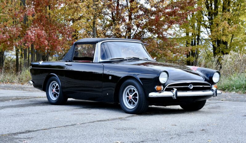 Its most recent refurbishment spanned several years and was completed in 2021. Work involved installing a Ford Performance 302ci V8 crate engine and a Tremec five-speed manual transmission, refinishing the car in black, and refreshing the red interior. Details include a body-color soft top and removable hardtop, a wood-rimmed Nardi steering wheel, a woodgrain dash panel, 13″ Rostyle wheels, a dual exhaust system fed by long-tube headers, front disc brakes, and chrome bumpers