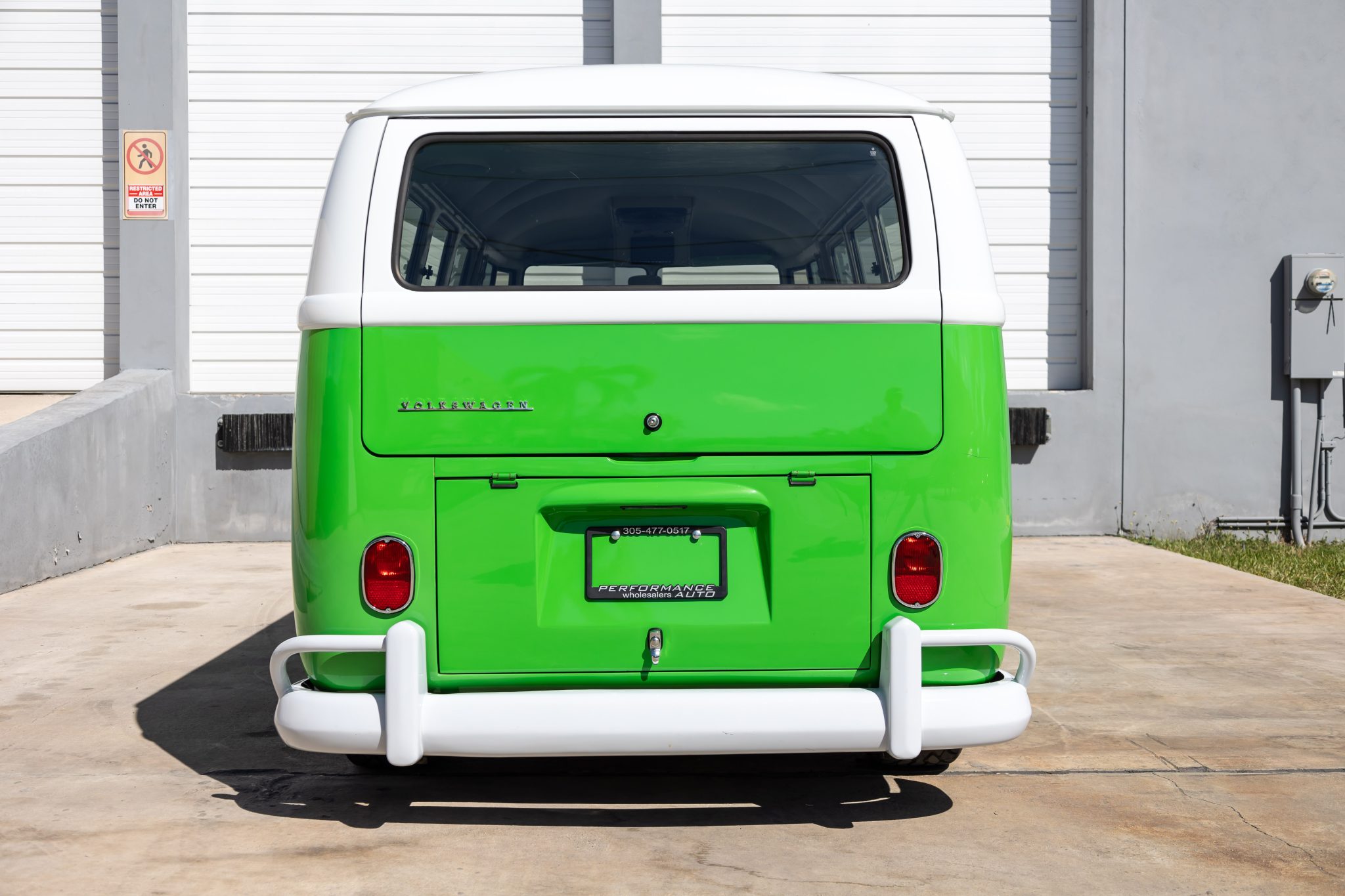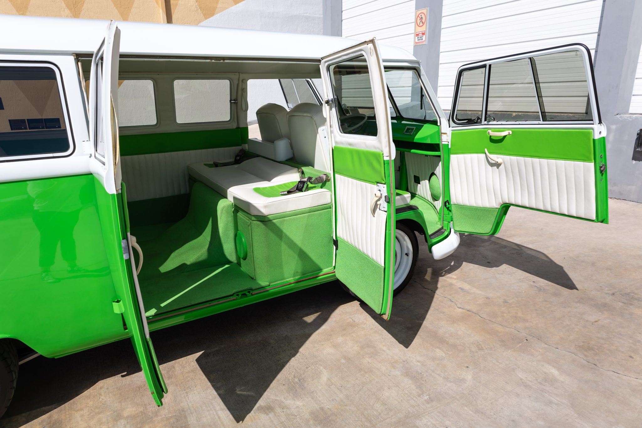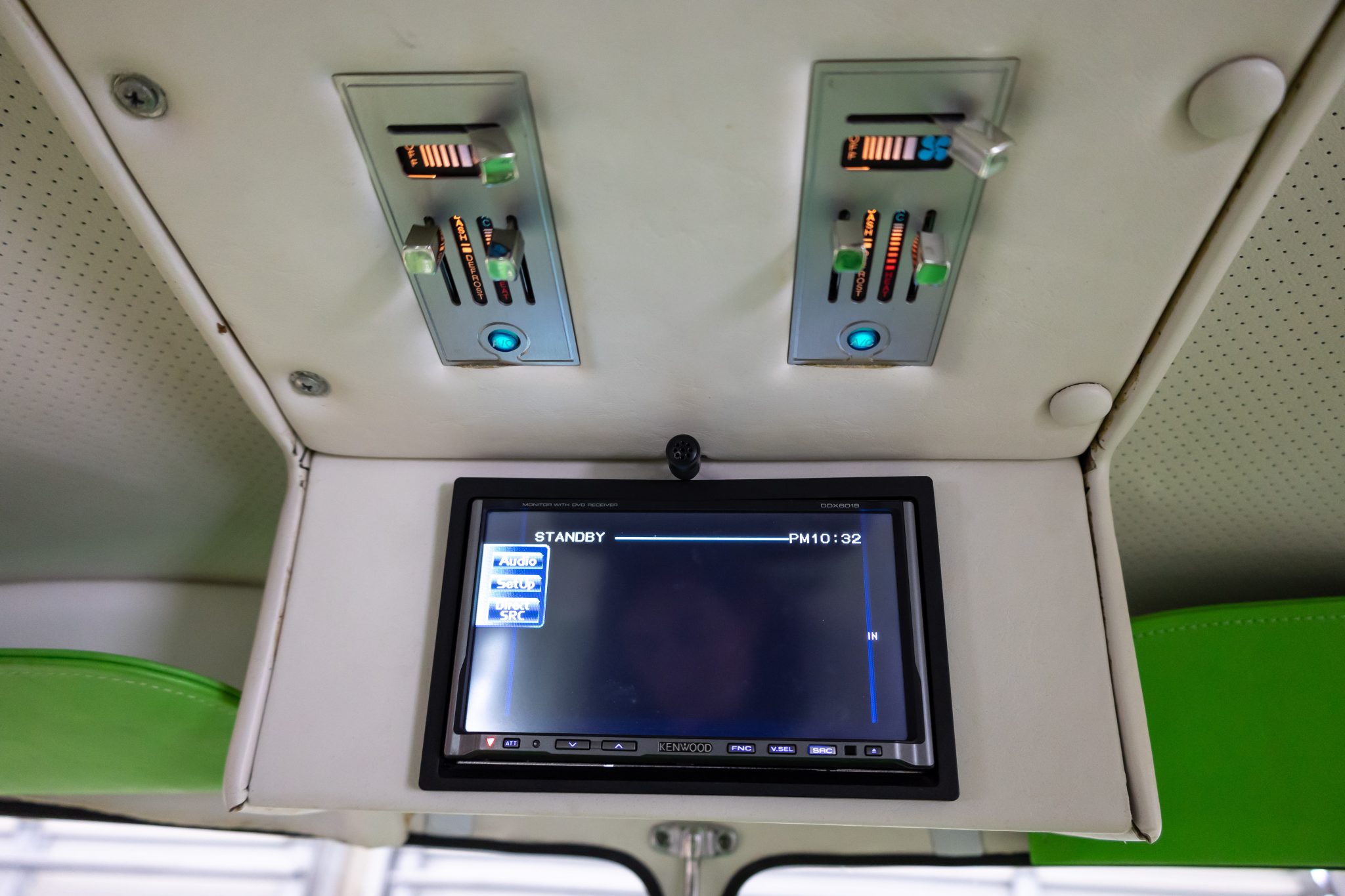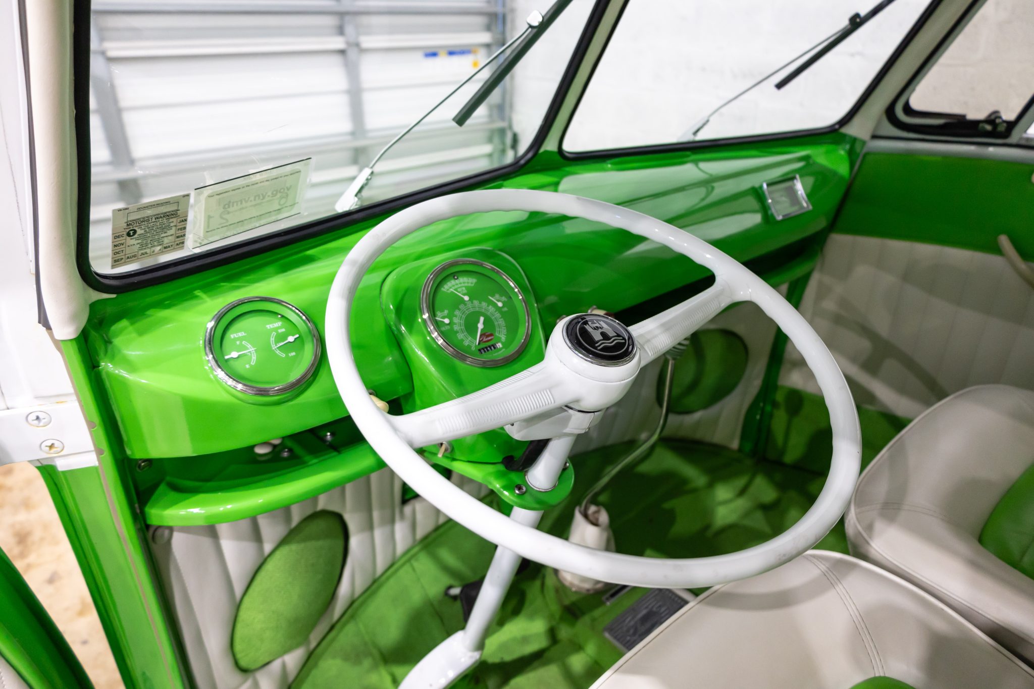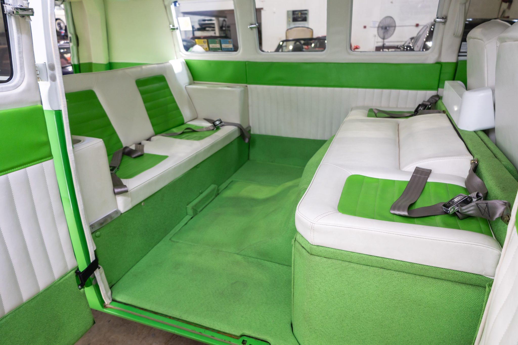 This 1966 Volkswagen Type 2 is an 11-window example that underwent refurbishment and modification Work including mounting a reported 6.2-liter LS V8 and a 4L60E four-speed automatic transmission to a custom frame fitted with an A-arm front suspension, a horizontally mounted Watt’s-link-style rear setup, rack-and-pinion steering, adjustable coilovers, disc brakes, and 17″ steel wheels. Finished in green and white over matching leather upholstery, the bus features “fried egg” front turn indicators, a left side-view mirror, six pop-out side windows, Classic Instruments gauges, lap belts, air conditioning, and Kenwood touchscreen head unit.