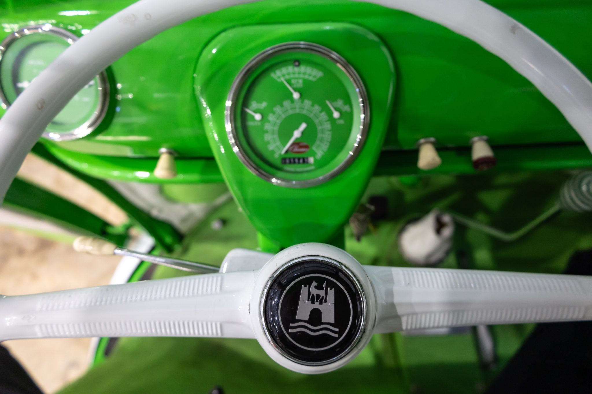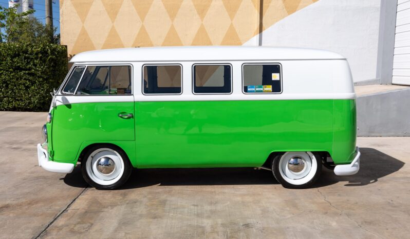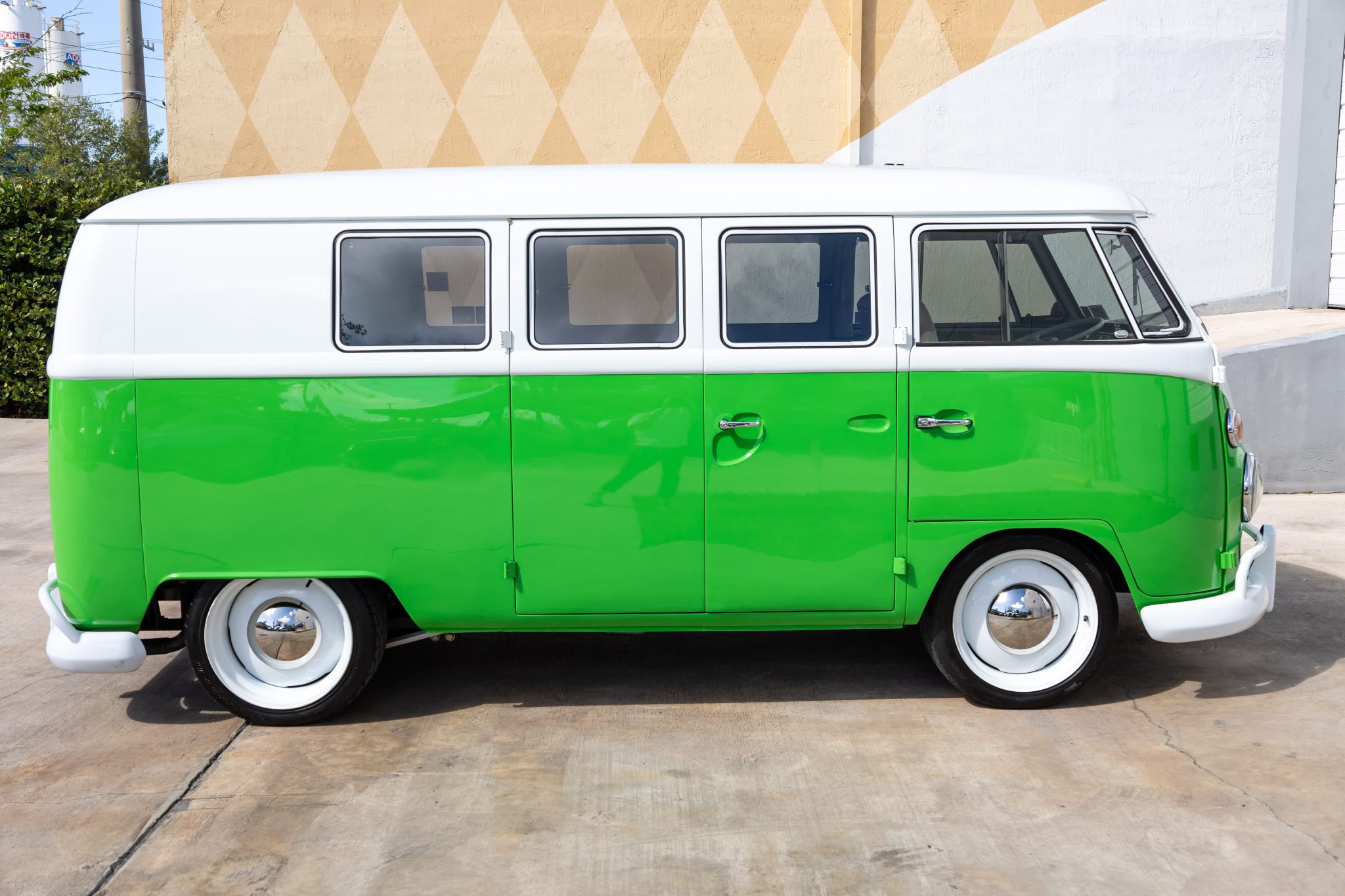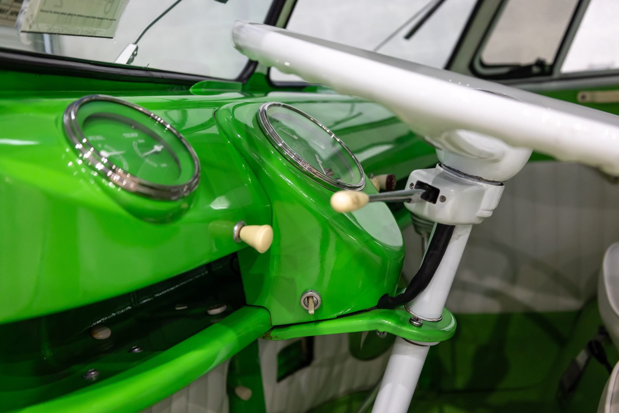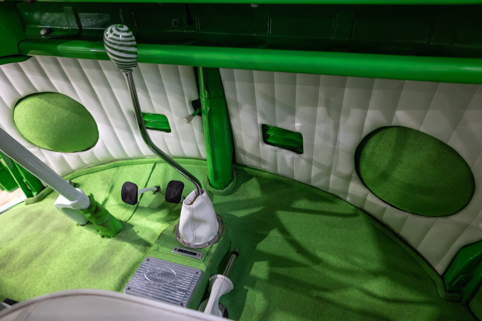 This 1966 Volkswagen Type 2 is an 11-window example that underwent refurbishment and modification Work including mounting a reported 6.2-liter LS V8 and a 4L60E four-speed automatic transmission to a custom frame fitted with an A-arm front suspension, a horizontally mounted Watt’s-link-style rear setup, rack-and-pinion steering, adjustable coilovers, disc brakes, and 17″ steel wheels. Finished in green and white over matching leather upholstery, the bus features “fried egg” front turn indicators, a left side-view mirror, six pop-out side windows, Classic Instruments gauges, lap belts, air conditioning, and Kenwood touchscreen head unit.