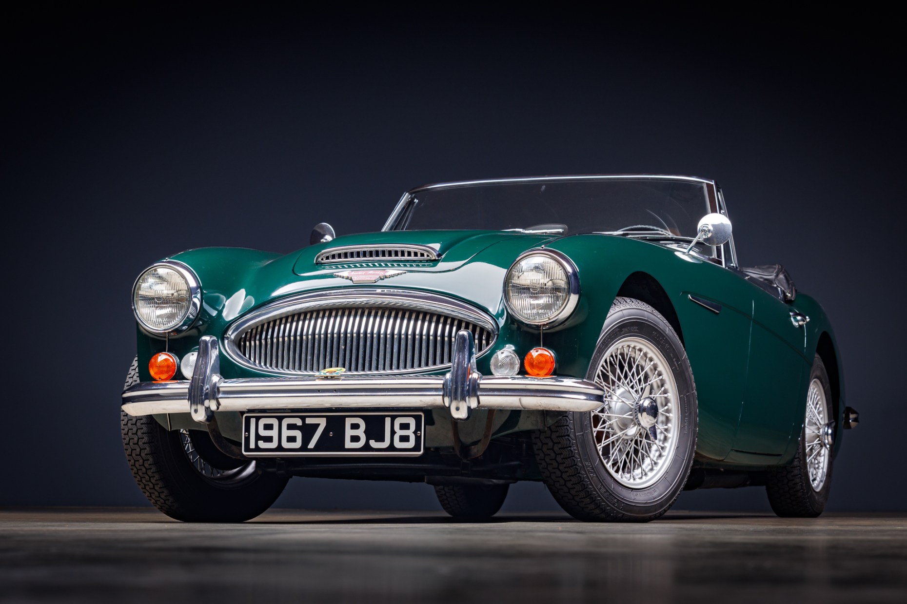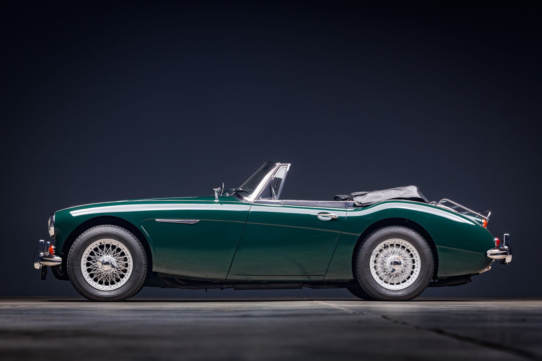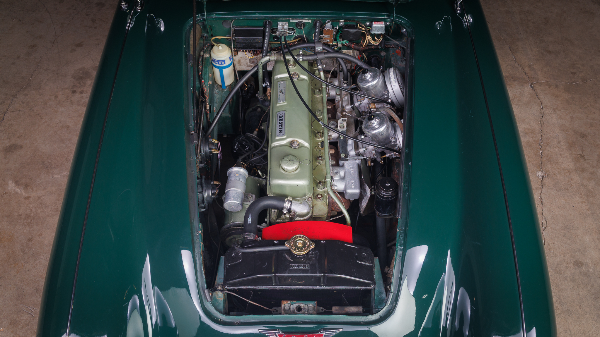 This 1967 Austin-Healey 3000 BJ8 Mk III received an initial refurbishment between 1997-2001, during which time it was repainted in its current British Racing Green finish.  The car is powered by a 2.9-liter inline-six fitted with dual SU HD8 carburetors, while shifting is through a four-speed manual transmission. It wears a black soft top over black vinyl–trimmed front bucket seats and is further equipped with a heater, a luggage rack, front disc brakes, and 15″ knock-off wire wheels.