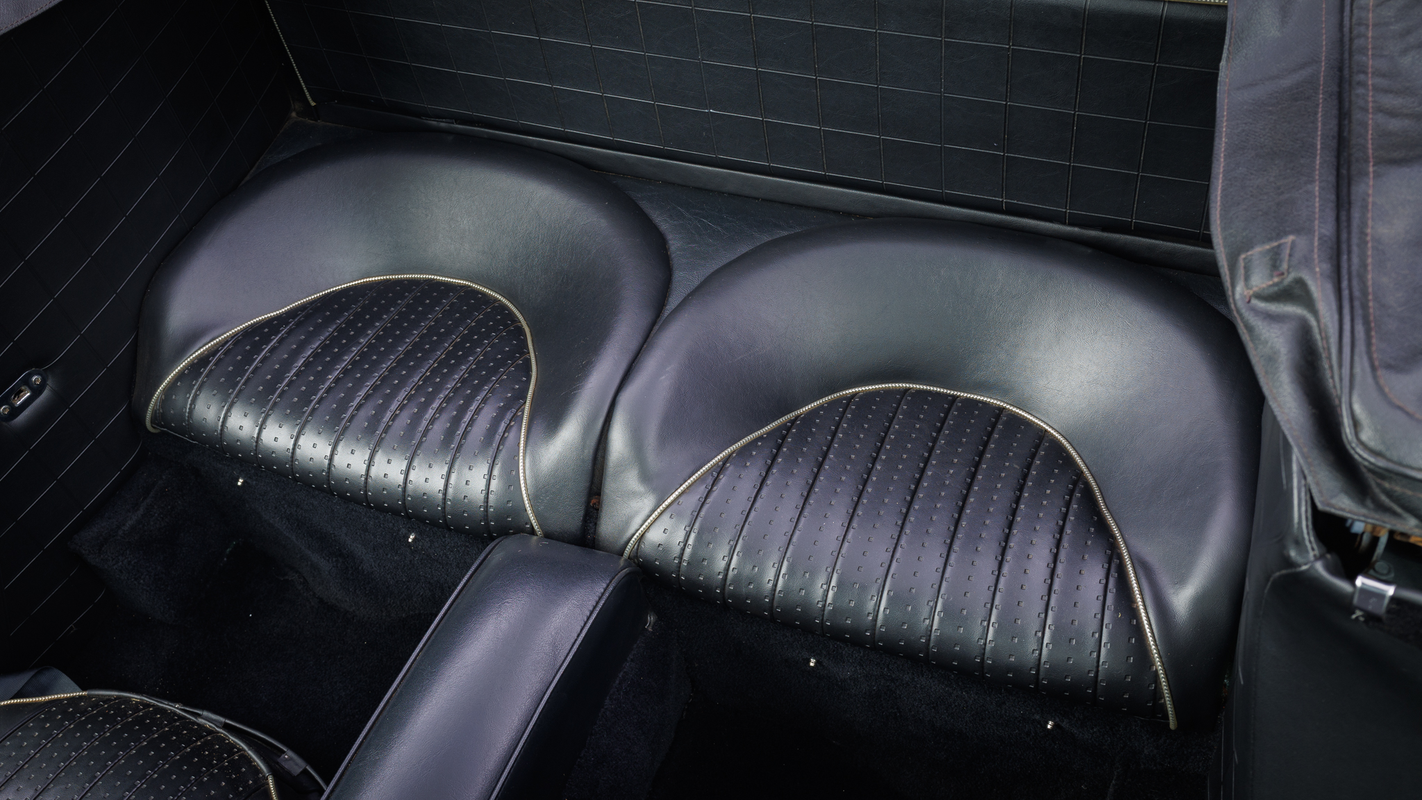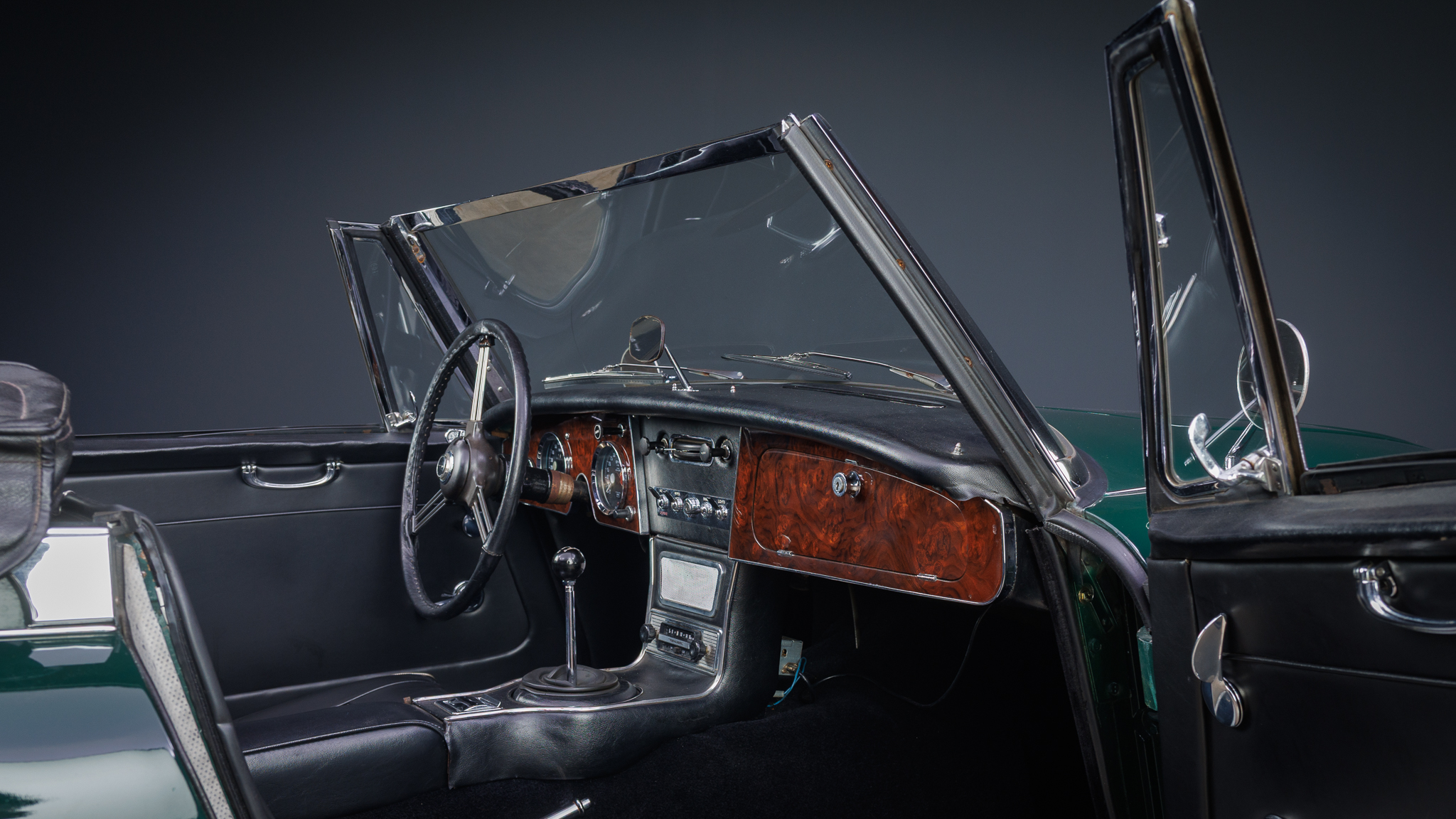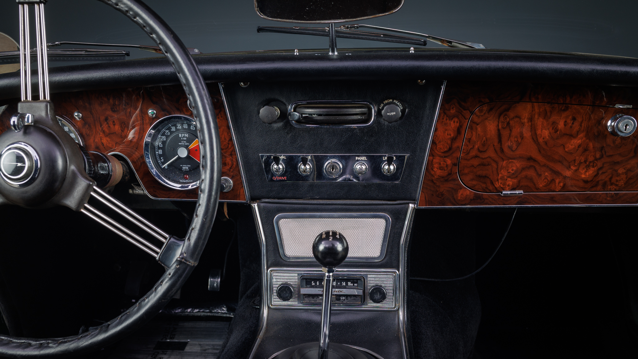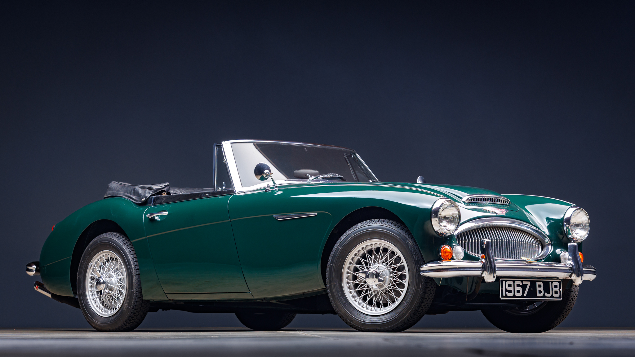This 1967 Austin-Healey 3000 BJ8 Mk III received an initial refurbishment between 1997-2001, during which time it was repainted in its current British Racing Green finish.  The car is powered by a 2.9-liter inline-six fitted with dual SU HD8 carburetors, while shifting is through a four-speed manual transmission. It wears a black soft top over black vinyl–trimmed front bucket seats and is further equipped with a heater, a luggage rack, front disc brakes, and 15″ knock-off wire wheels.