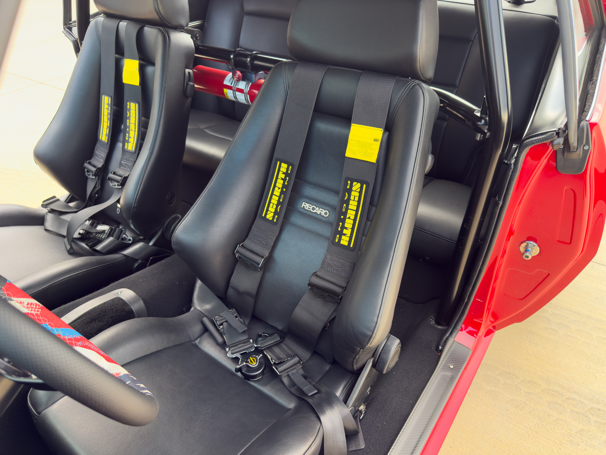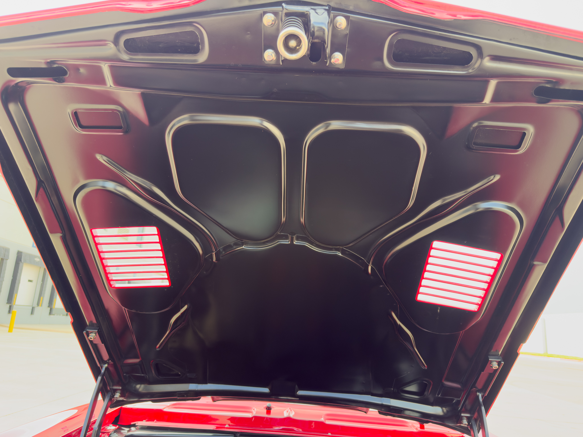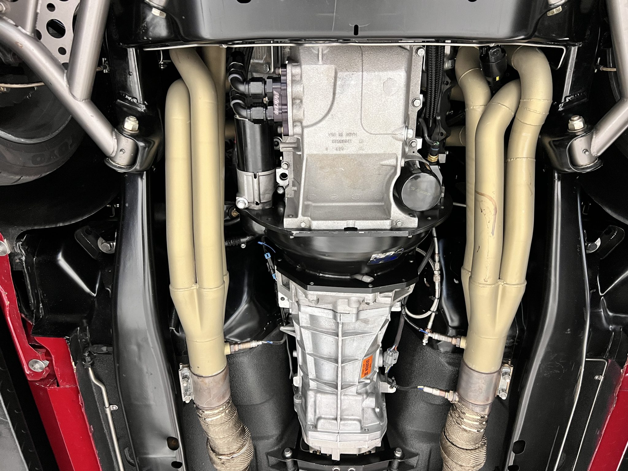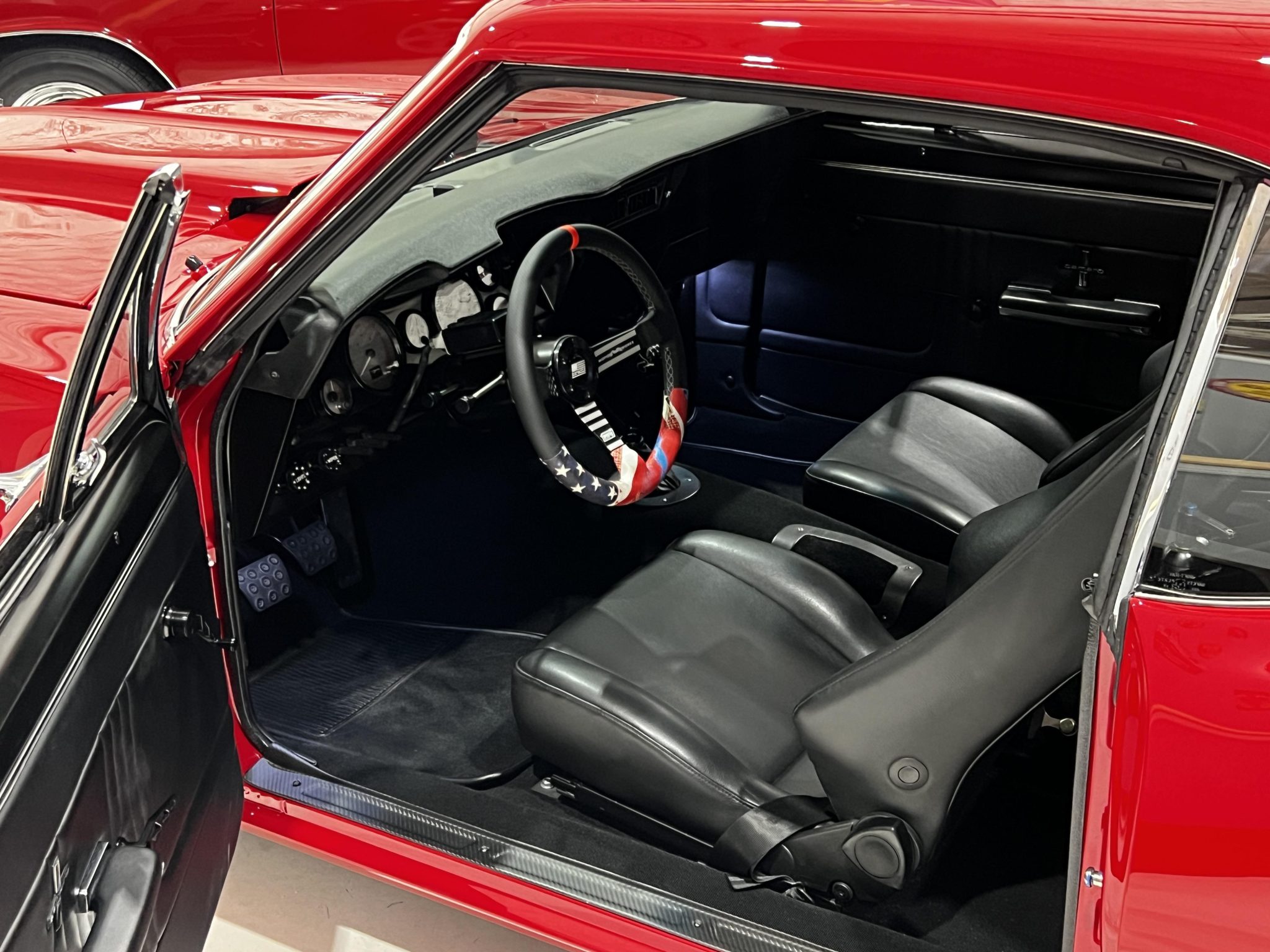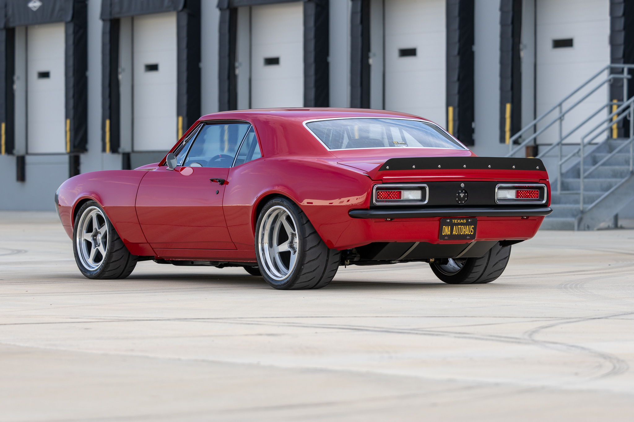 This 1967 Chevrolet Camaro coupe was built with a dry-sump 441ci LS7 V8 that is linked to a T56 six-speed manual transmission. The car rides on a Detroit Speed suspension kit with a hydroformed front subframe, sway bars, and a Quadralink rear setup, and staggered-diameter Forgeline wheels are mounted over Baer disc brakes. The body is finished in red with black and carbon-fiber accents and features front and rear spoilers and a cowl-induction hood, while the cabin is outfitted with a roll bar, Vintage Air climate control, Speedhut gauges, and black leather Recaro front seats with Schroth harnesses.
