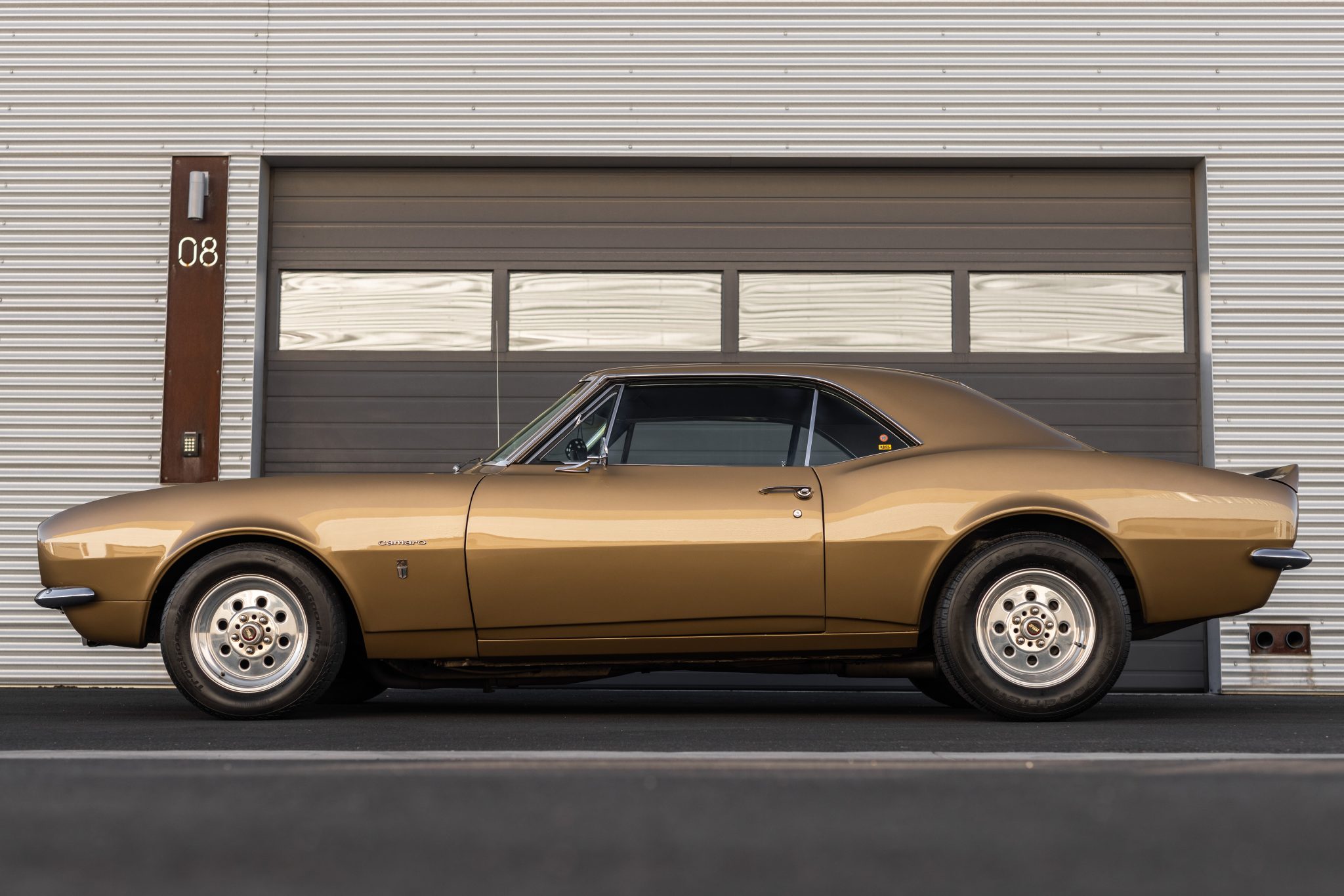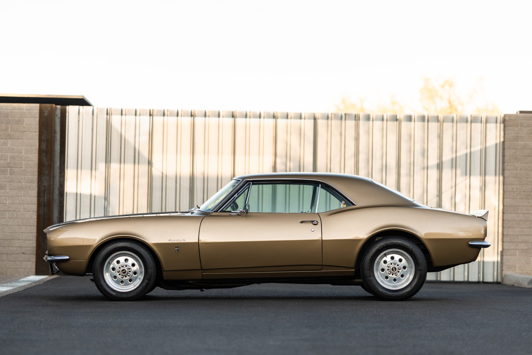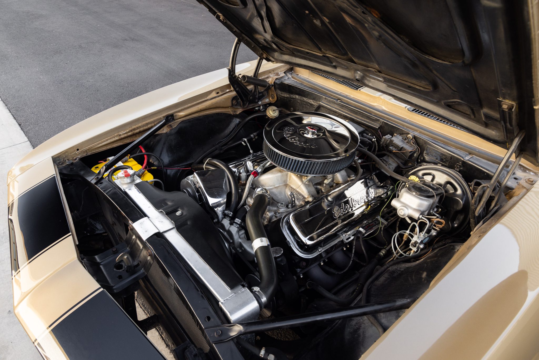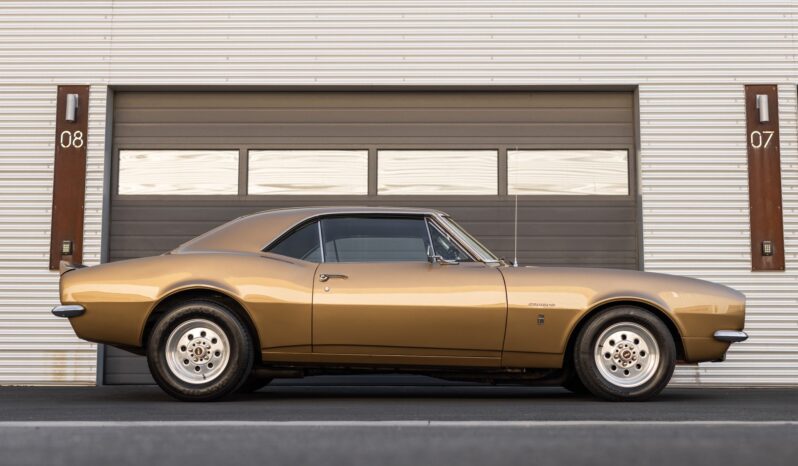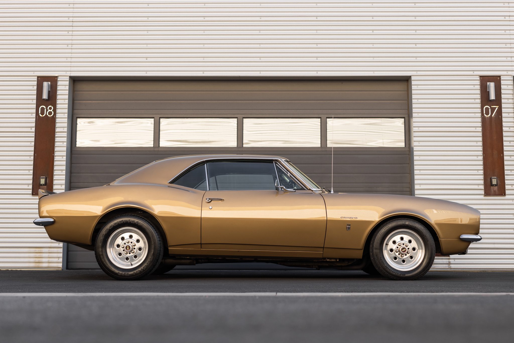 This 1967 Chevrolet Camaro coupe is powered by a 408ci V8 and assembled with Keith Black pistons, a high-duration camshaft, a Holley carburetor, an Edelbrock intake manifold, and Hooker Competition headers. Power is routed through a modified TH400 three-speed automatic transmission, and the car rides on 15″ Weld Draglite wheels that are mounted over power front disc and rear drum brakes. The exterior is finished in gold with black rally stripes, and the cabin is outfitted with gold vinyl front bucket seats, a center console, a Lecarra steering wheel, AutoMeter instrumentation, and a retro-look stereo linked to Alpine speakers.
