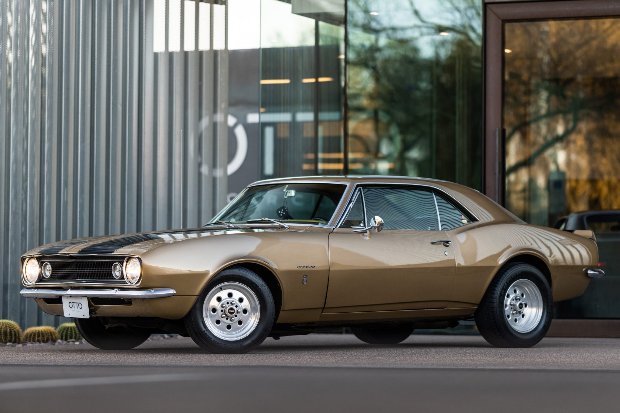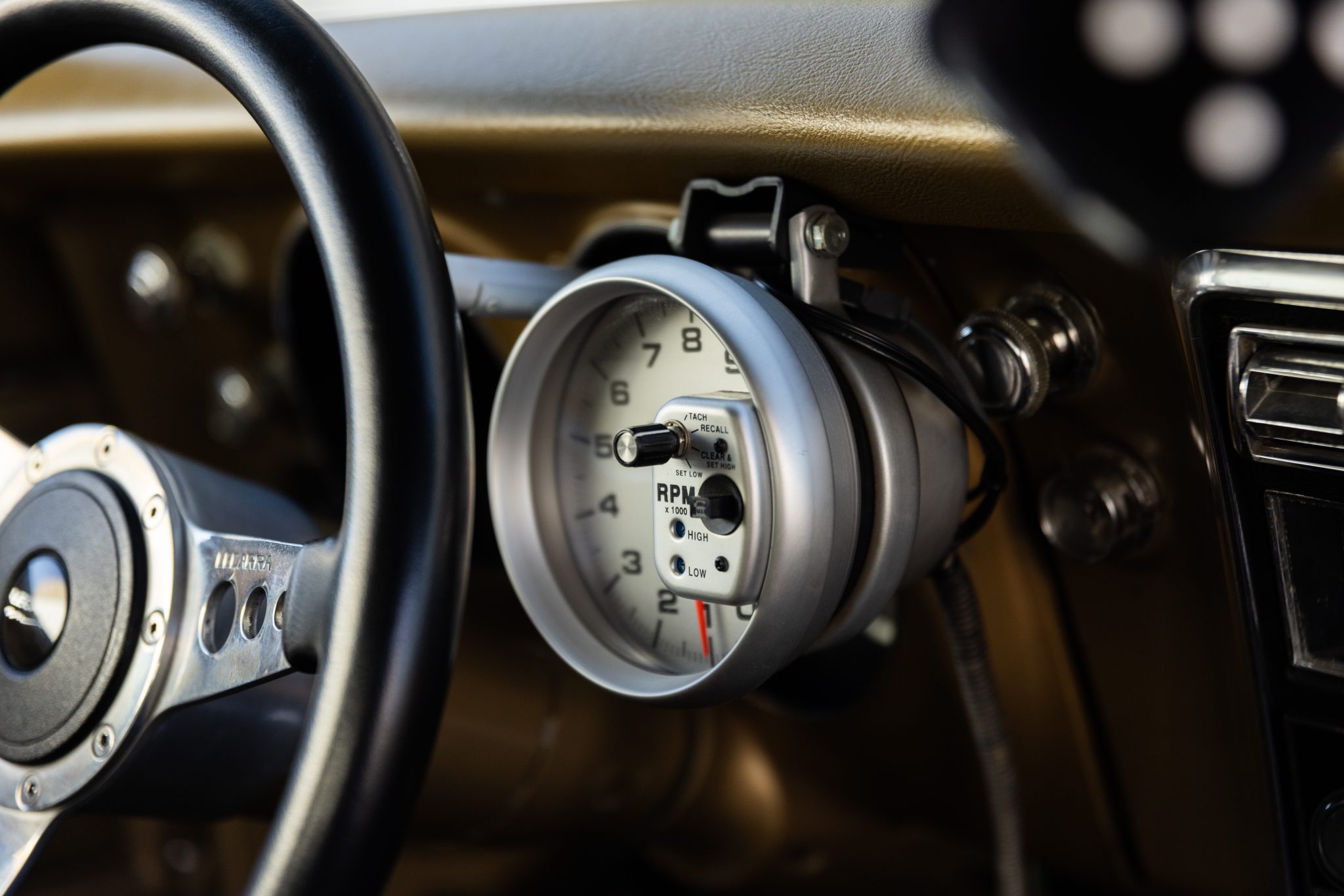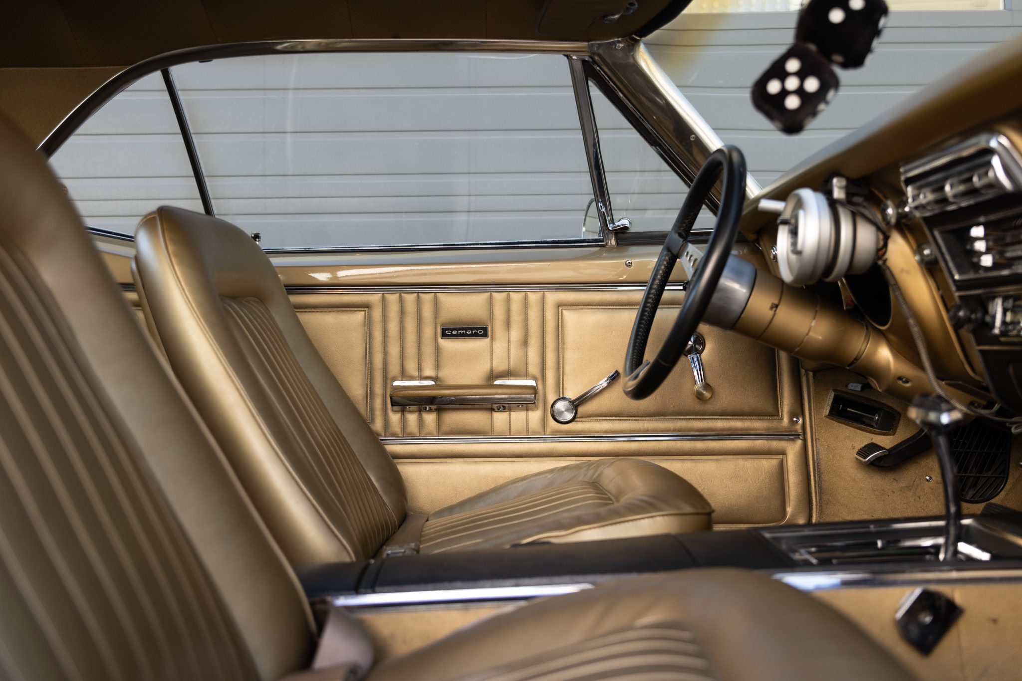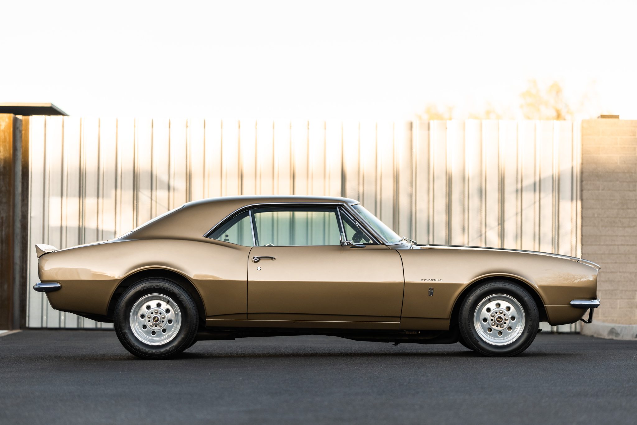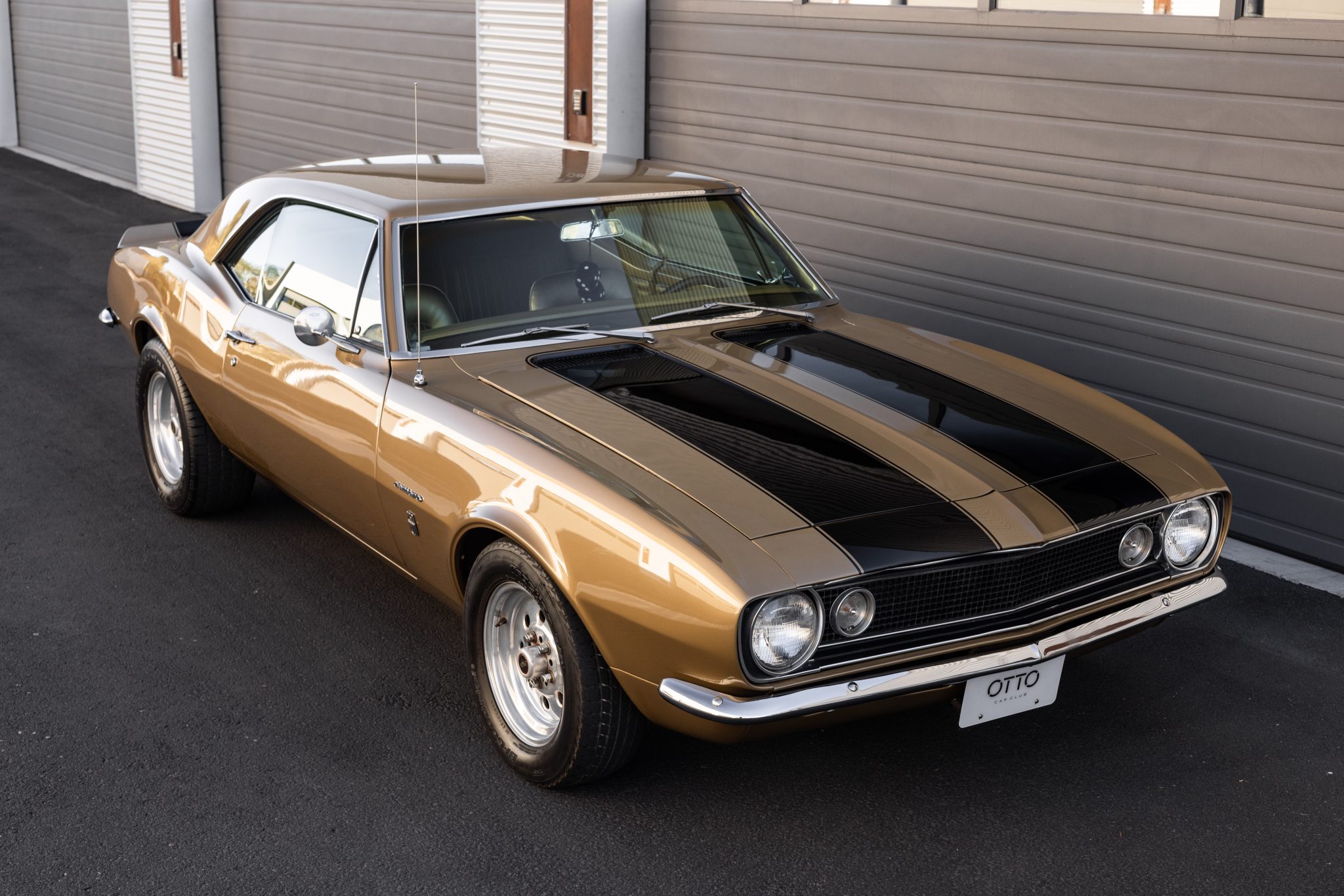 This 1967 Chevrolet Camaro coupe is powered by a 408ci V8 and assembled with Keith Black pistons, a high-duration camshaft, a Holley carburetor, an Edelbrock intake manifold, and Hooker Competition headers. Power is routed through a modified TH400 three-speed automatic transmission, and the car rides on 15″ Weld Draglite wheels that are mounted over power front disc and rear drum brakes. The exterior is finished in gold with black rally stripes, and the cabin is outfitted with gold vinyl front bucket seats, a center console, a Lecarra steering wheel, AutoMeter instrumentation, and a retro-look stereo linked to Alpine speakers.