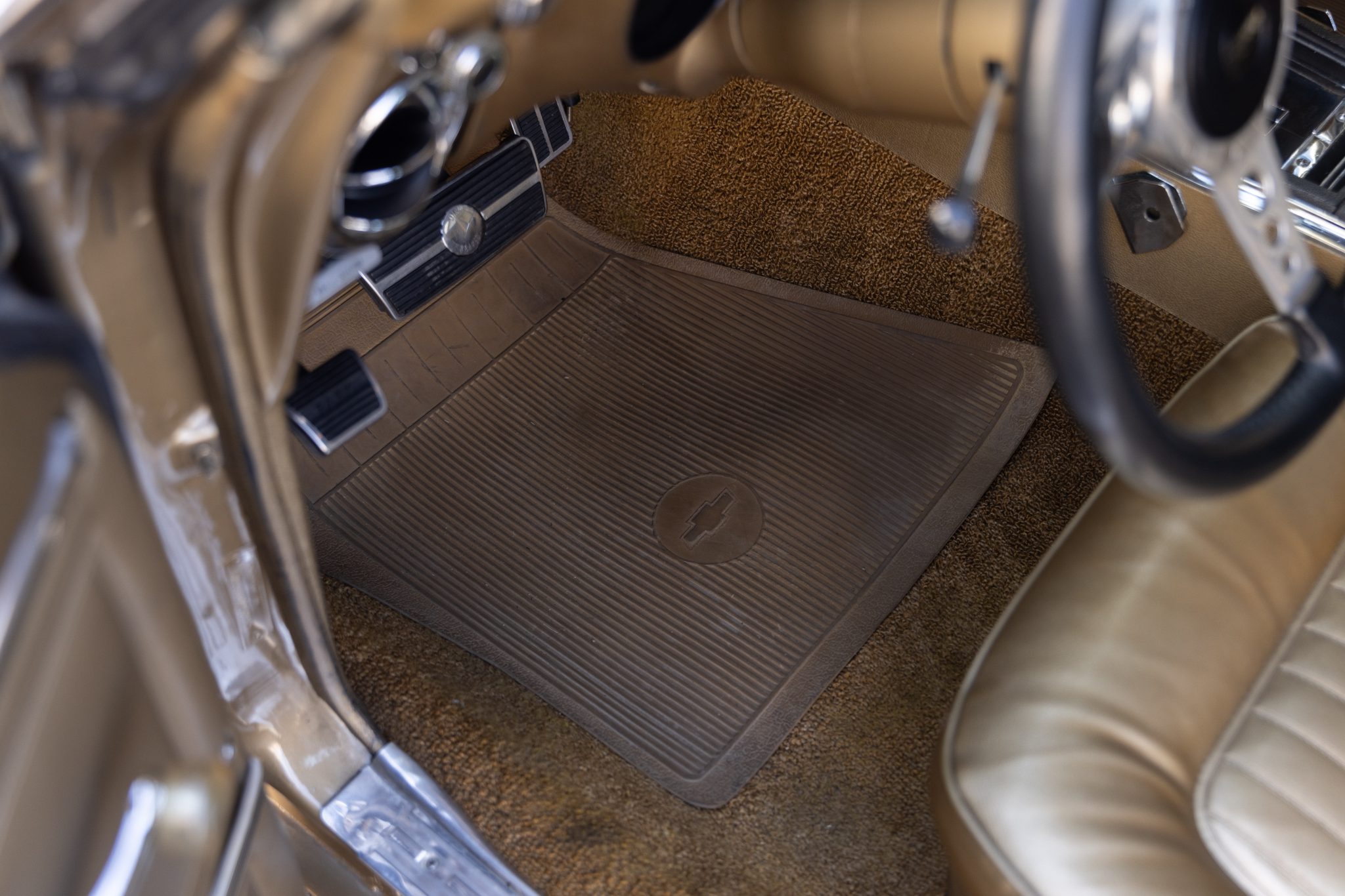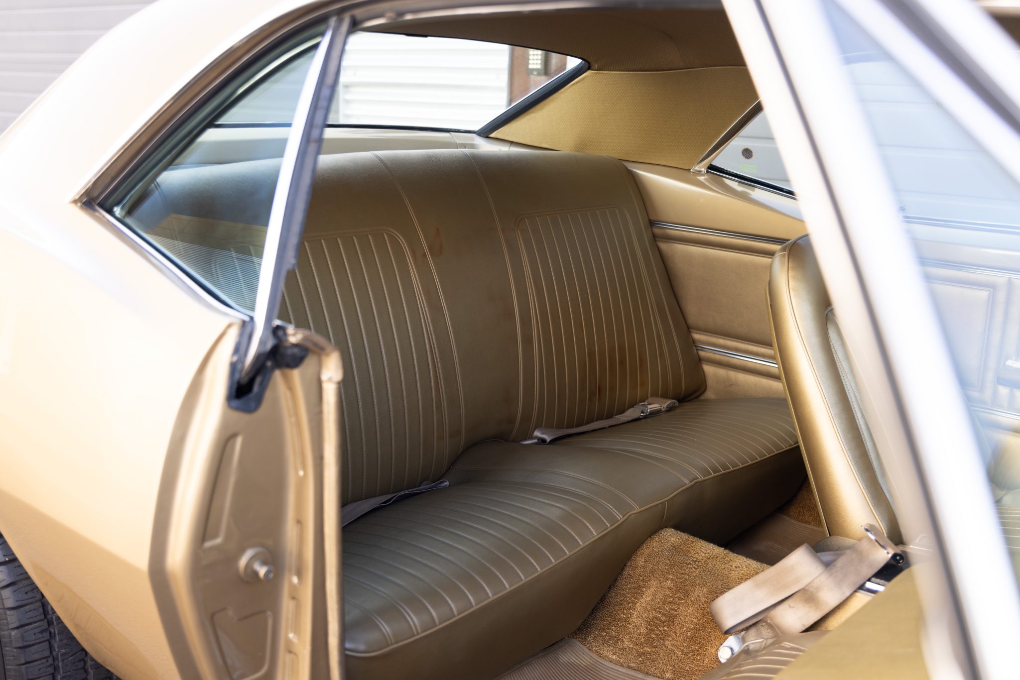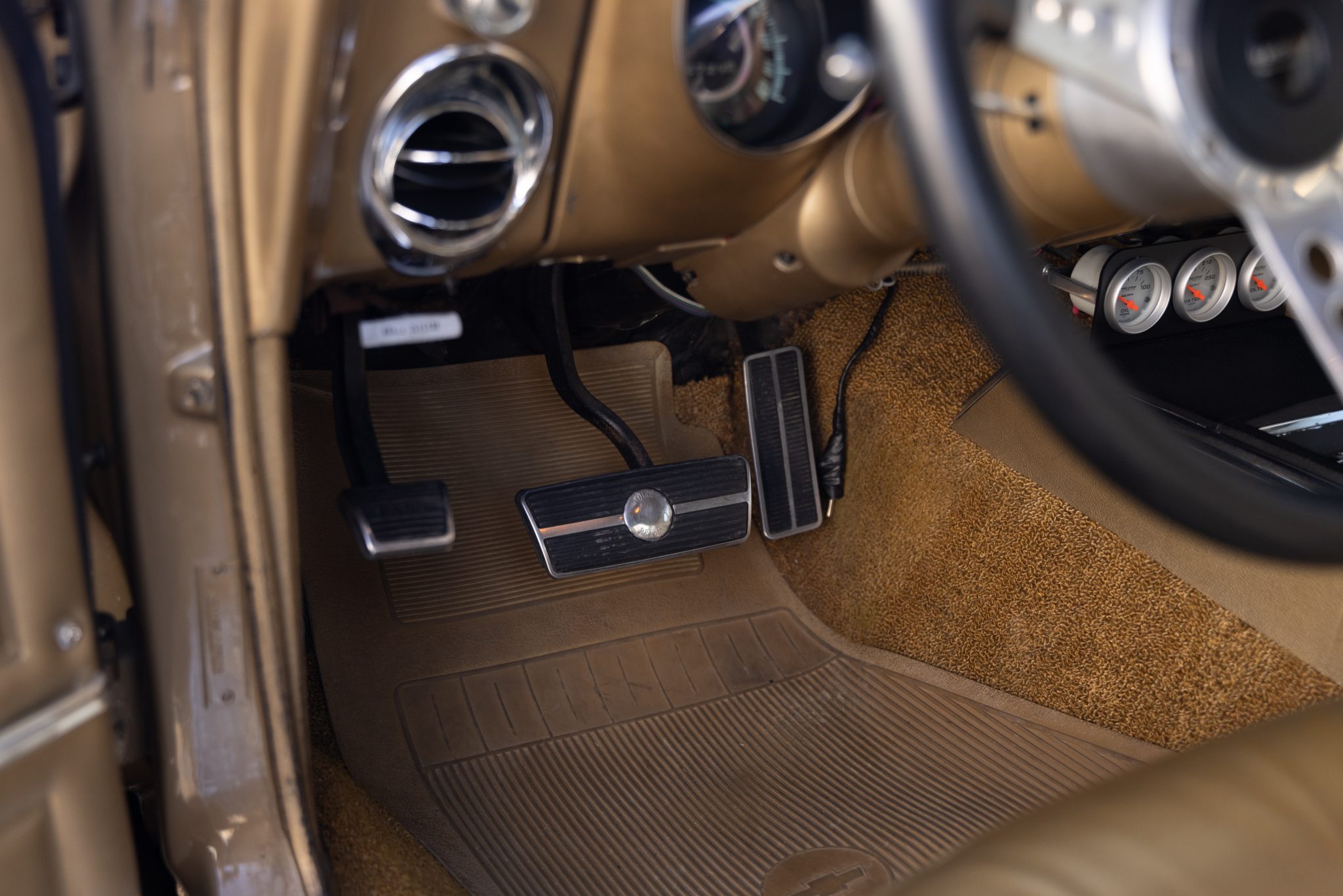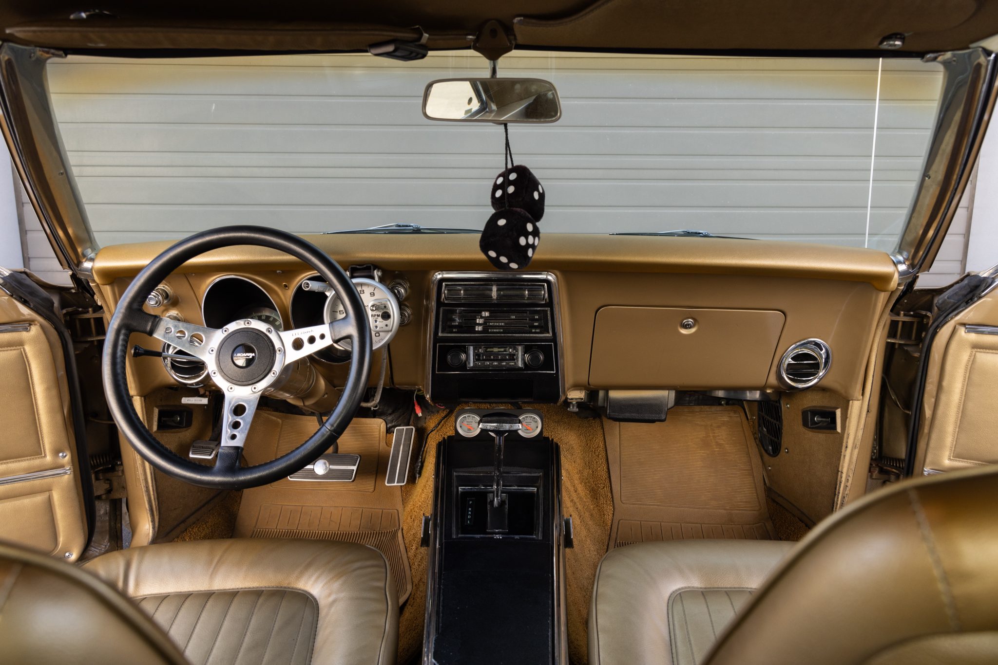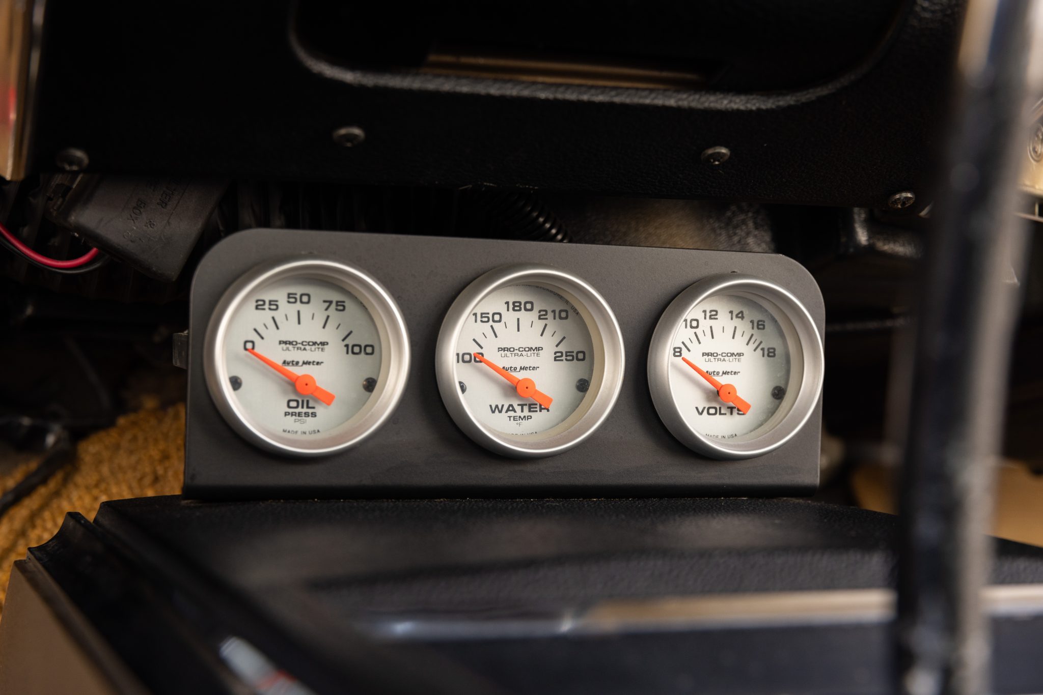 This 1967 Chevrolet Camaro coupe is powered by a 408ci V8 and assembled with Keith Black pistons, a high-duration camshaft, a Holley carburetor, an Edelbrock intake manifold, and Hooker Competition headers. Power is routed through a modified TH400 three-speed automatic transmission, and the car rides on 15″ Weld Draglite wheels that are mounted over power front disc and rear drum brakes. The exterior is finished in gold with black rally stripes, and the cabin is outfitted with gold vinyl front bucket seats, a center console, a Lecarra steering wheel, AutoMeter instrumentation, and a retro-look stereo linked to Alpine speakers.