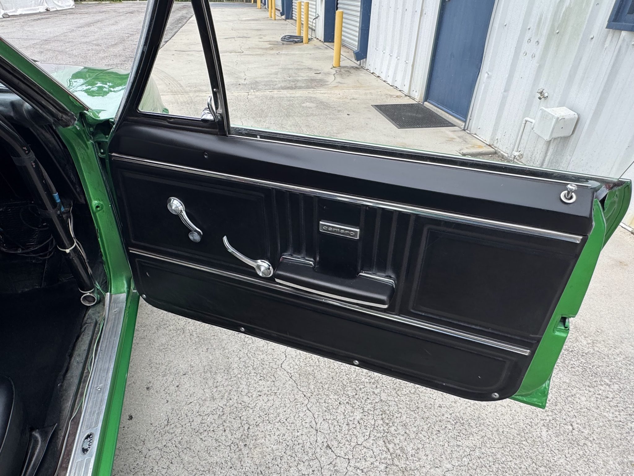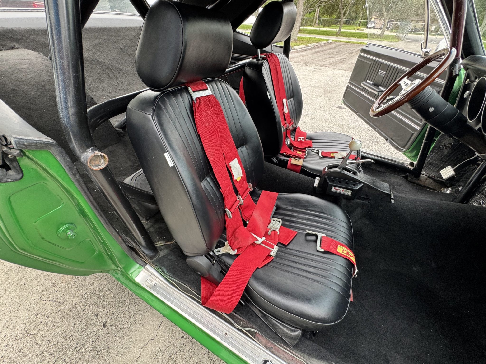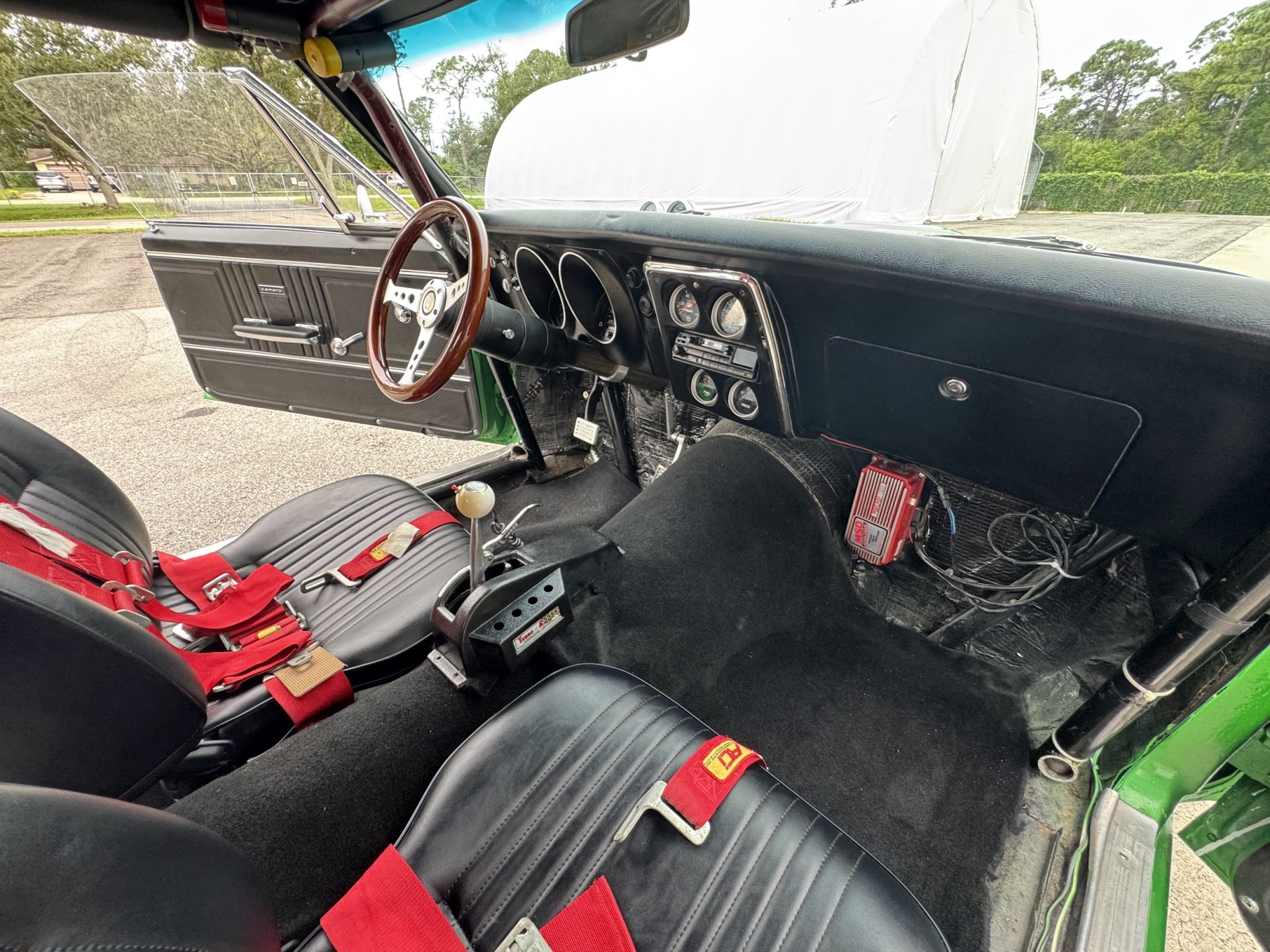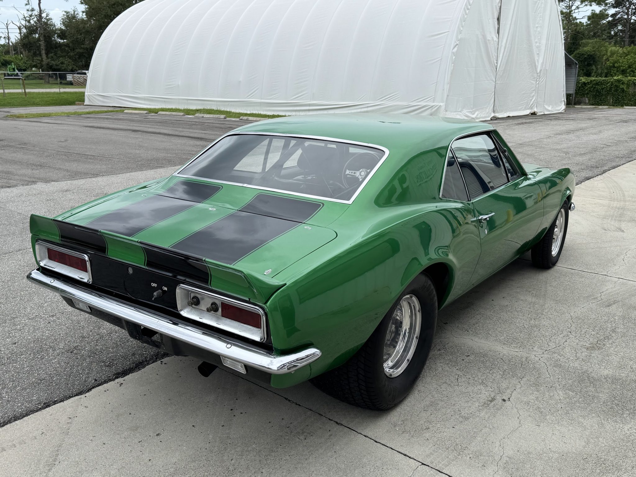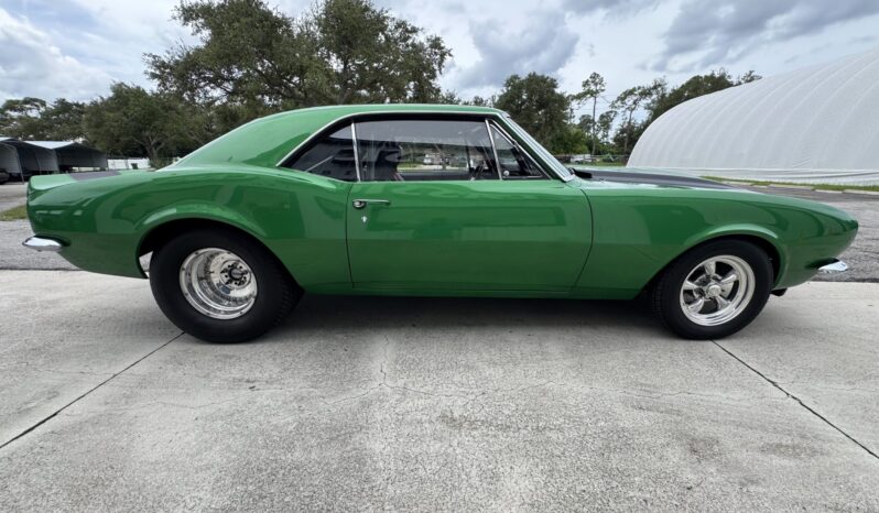This 1967 Chevrolet Camaro coupe was modified during a pro-street-style build under prior ownership that involved the installation of a 383ci stroker V8 linked to a TH350 three-speed automatic transmission and a Dana 60 rear end with a 5.33:1 differential and Strange Engineering axle shafts. The back-halved chassis features adjustable ladder bars and coilovers at the rear along with power-assisted front disc brakes with drilled and slotted rotors, and the rear wheel wells have been tubbed to accommodate 15×15″ Centerline rear wheels. A roll cage surrounds Procar bucket seats with RCI harnesses, and a Hurst Quarter Stick shifter is installed along with AutoMeter gauges and a Sony cassette stereo unit.