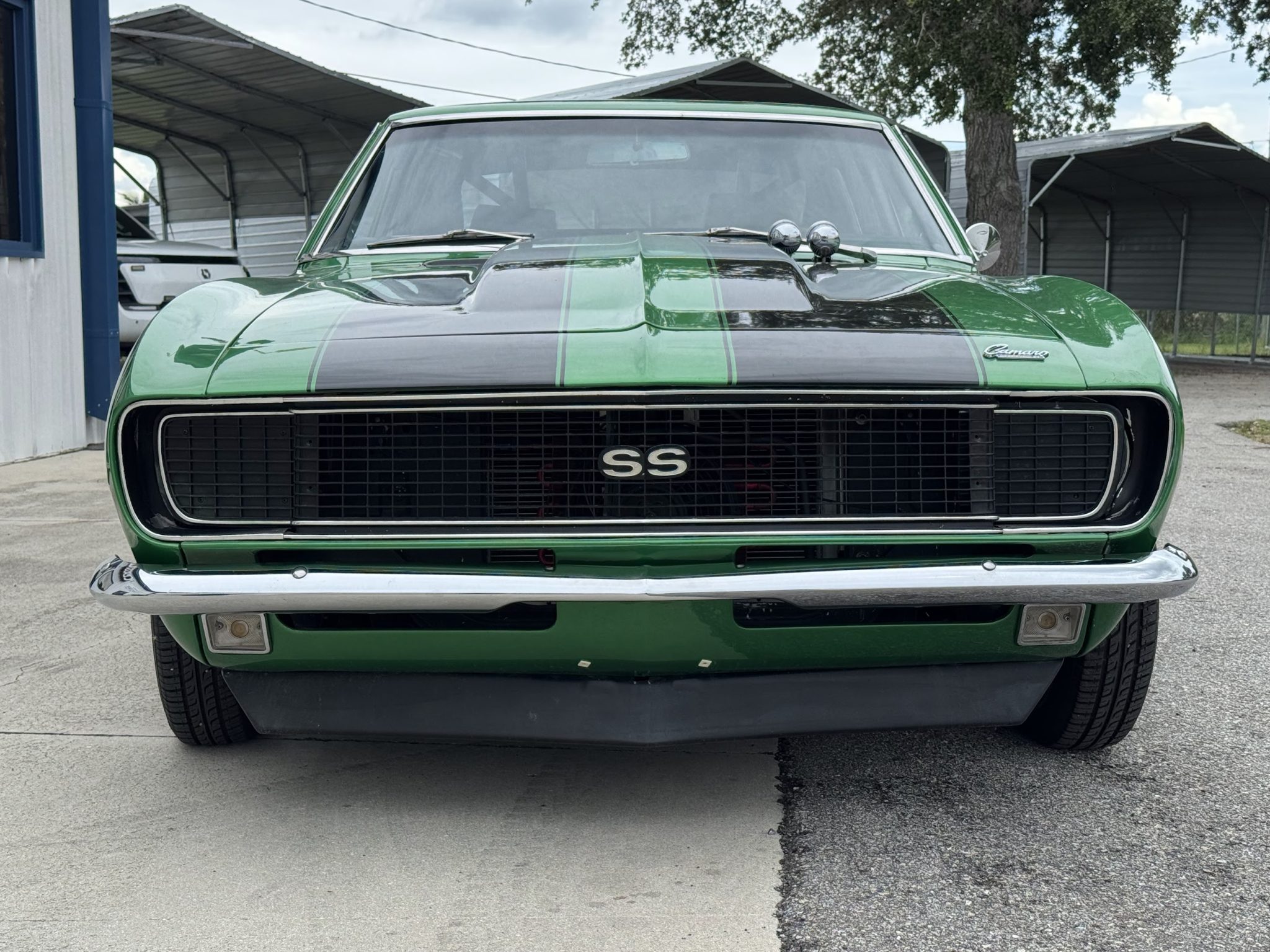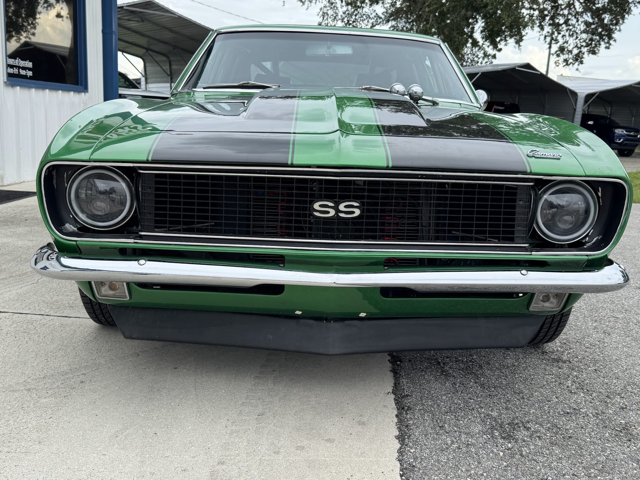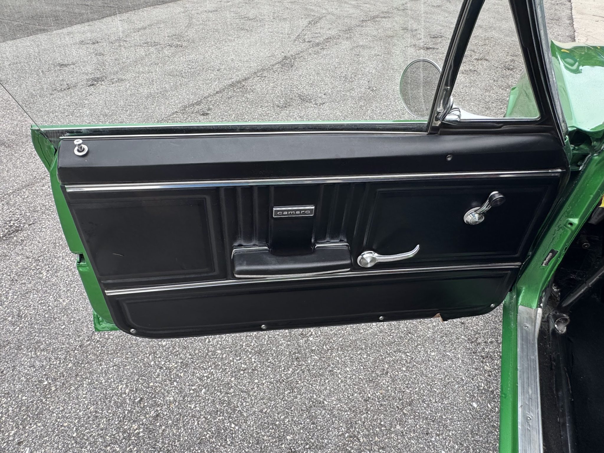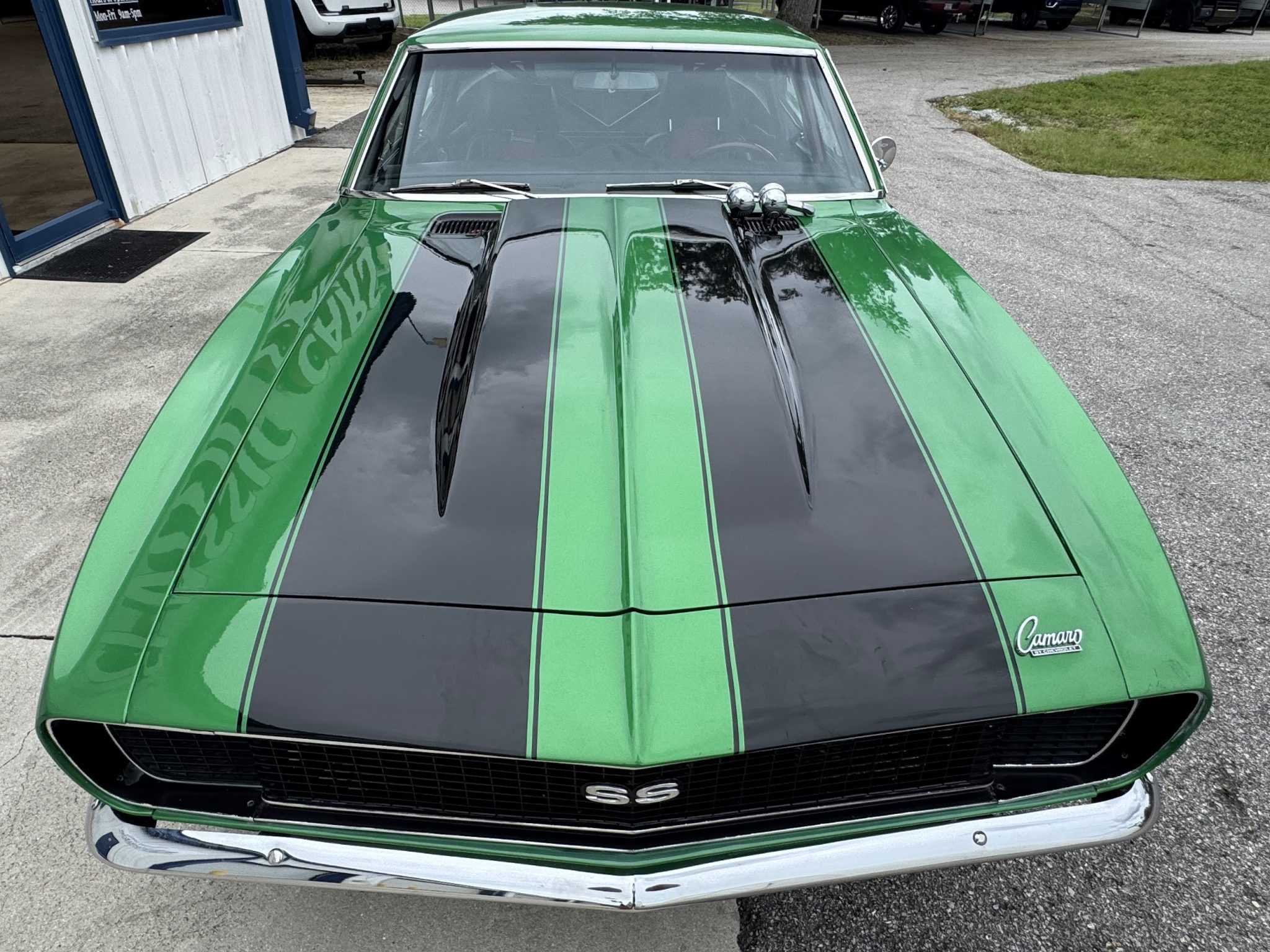 This 1967 Chevrolet Camaro coupe was modified during a pro-street-style build under prior ownership that involved the installation of a 383ci stroker V8 linked to a TH350 three-speed automatic transmission and a Dana 60 rear end with a 5.33:1 differential and Strange Engineering axle shafts. The back-halved chassis features adjustable ladder bars and coilovers at the rear along with power-assisted front disc brakes with drilled and slotted rotors, and the rear wheel wells have been tubbed to accommodate 15×15″ Centerline rear wheels. A roll cage surrounds Procar bucket seats with RCI harnesses, and a Hurst Quarter Stick shifter is installed along with AutoMeter gauges and a Sony cassette stereo unit.