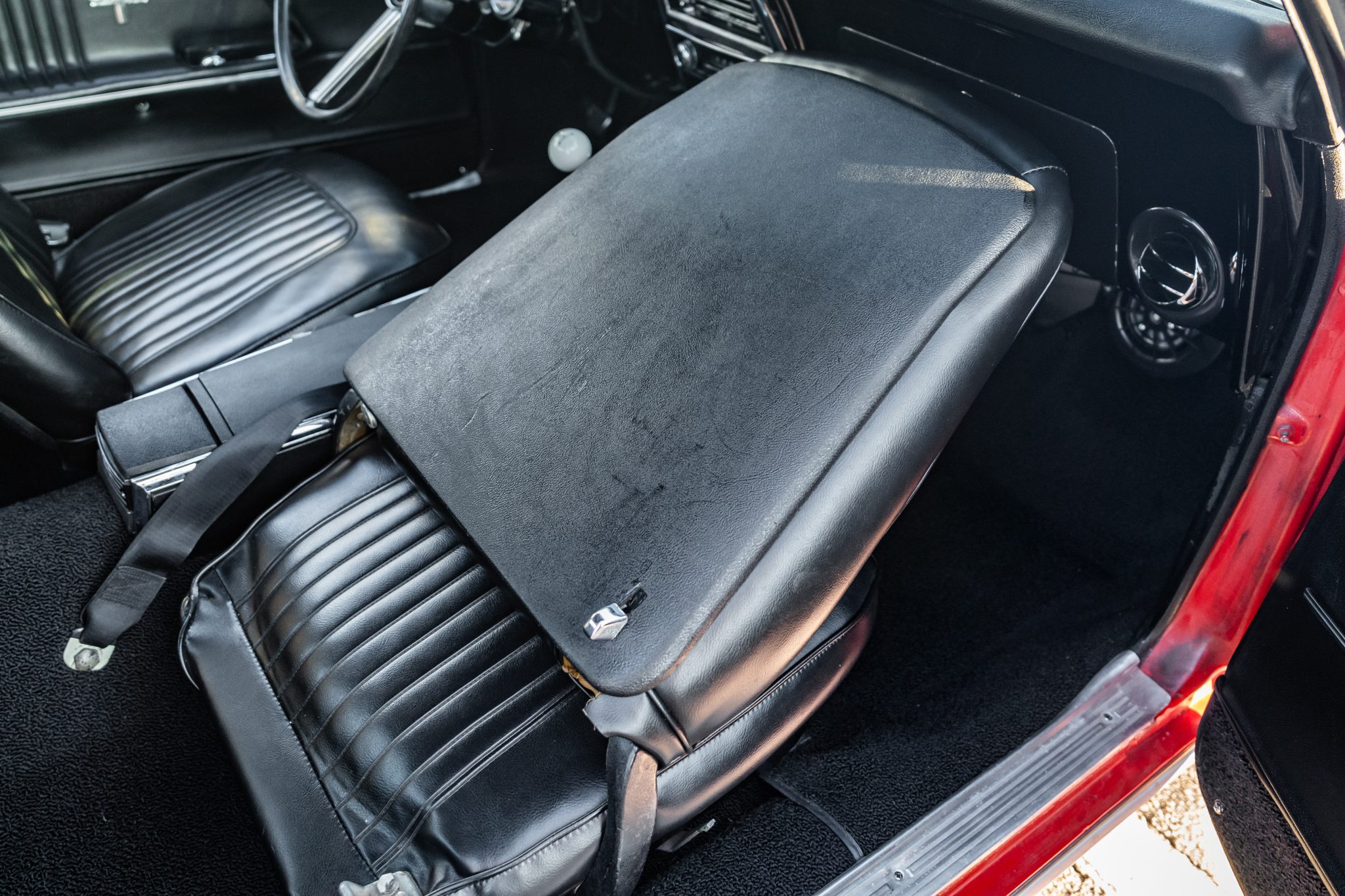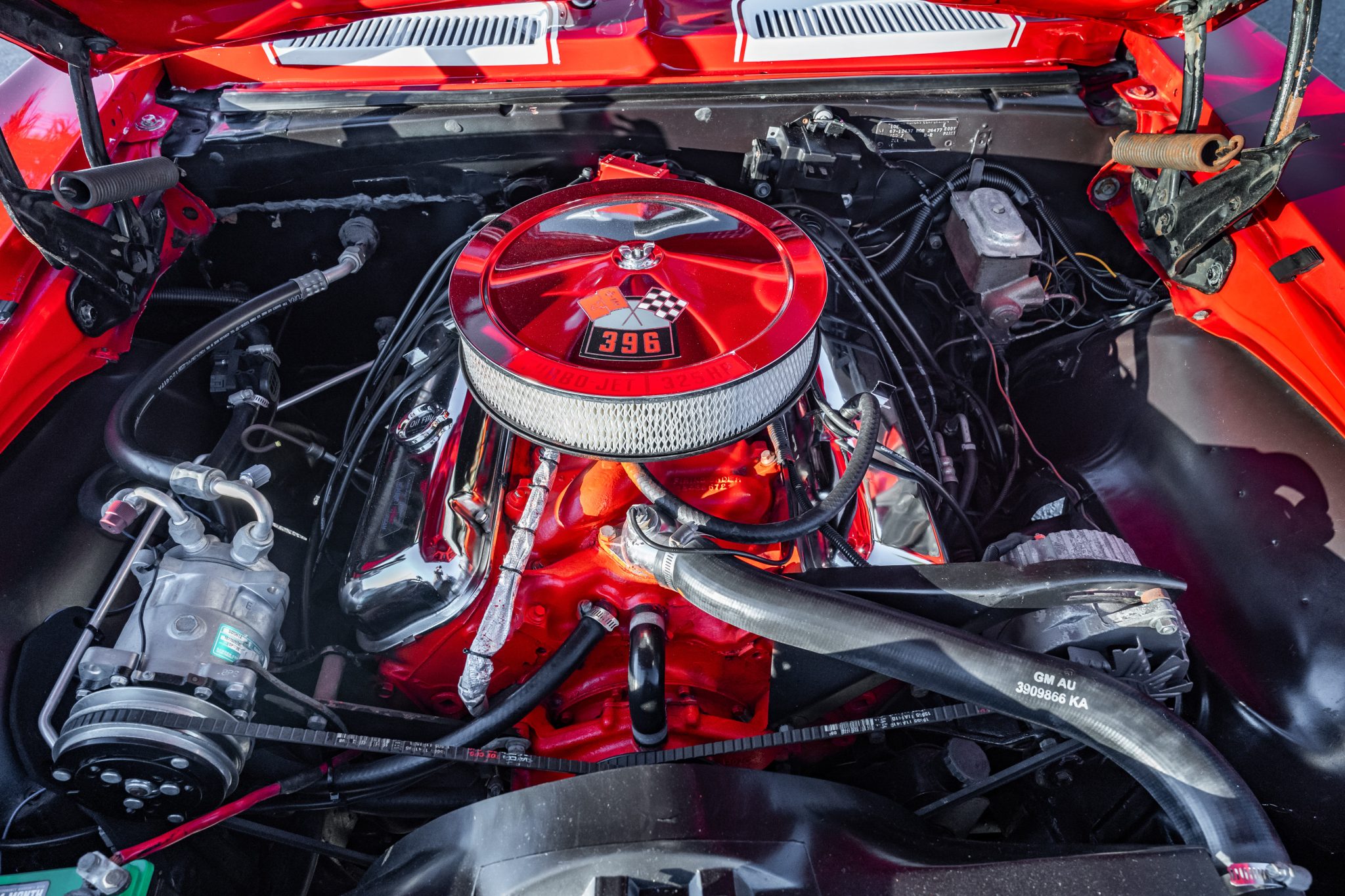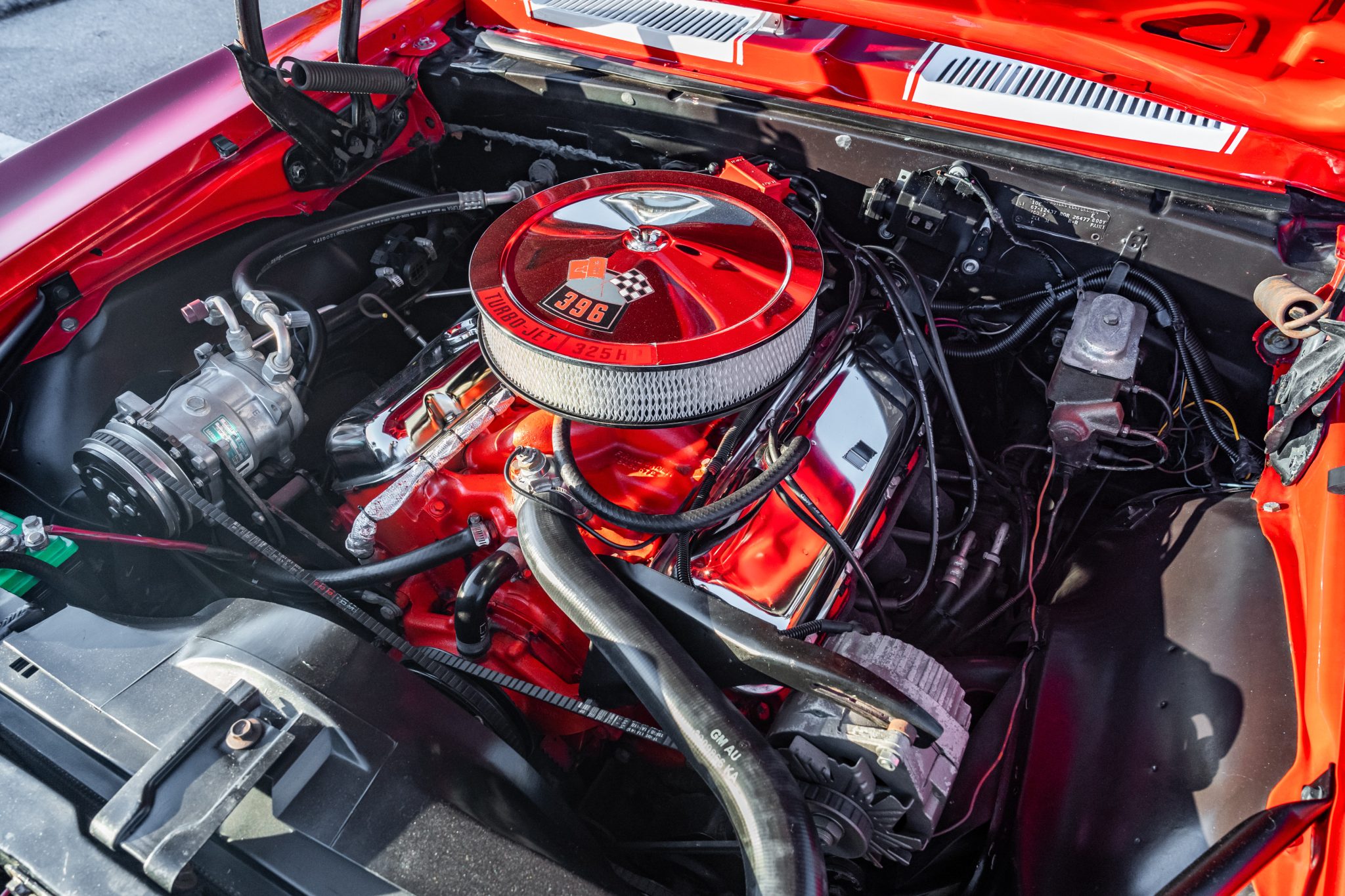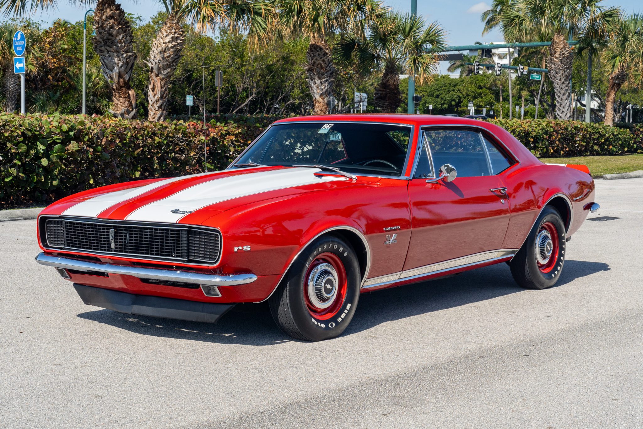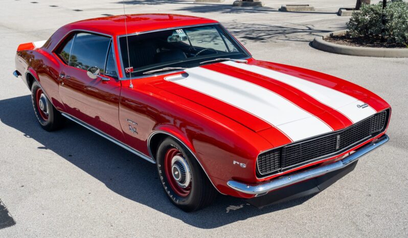 This 1967 Chevrolet Camaro RS sport coupe was the subject of a refurbishment completed that included a repaint in red with white stripes as well as the installation of a replacement 396ci V8 paired with a Muncie four-speed manual transmission. Equipment includes a 10-bolt rear axle with a 3.08:1 Positraction differential, Vintage Air climate control, an Audiovox radio, a center console, a cowl hood, front and rear spoilers, and 15″ steel wheels with hubcaps as well as full-length headers connected to a dual exhaust system with Flowmaster mufflers.