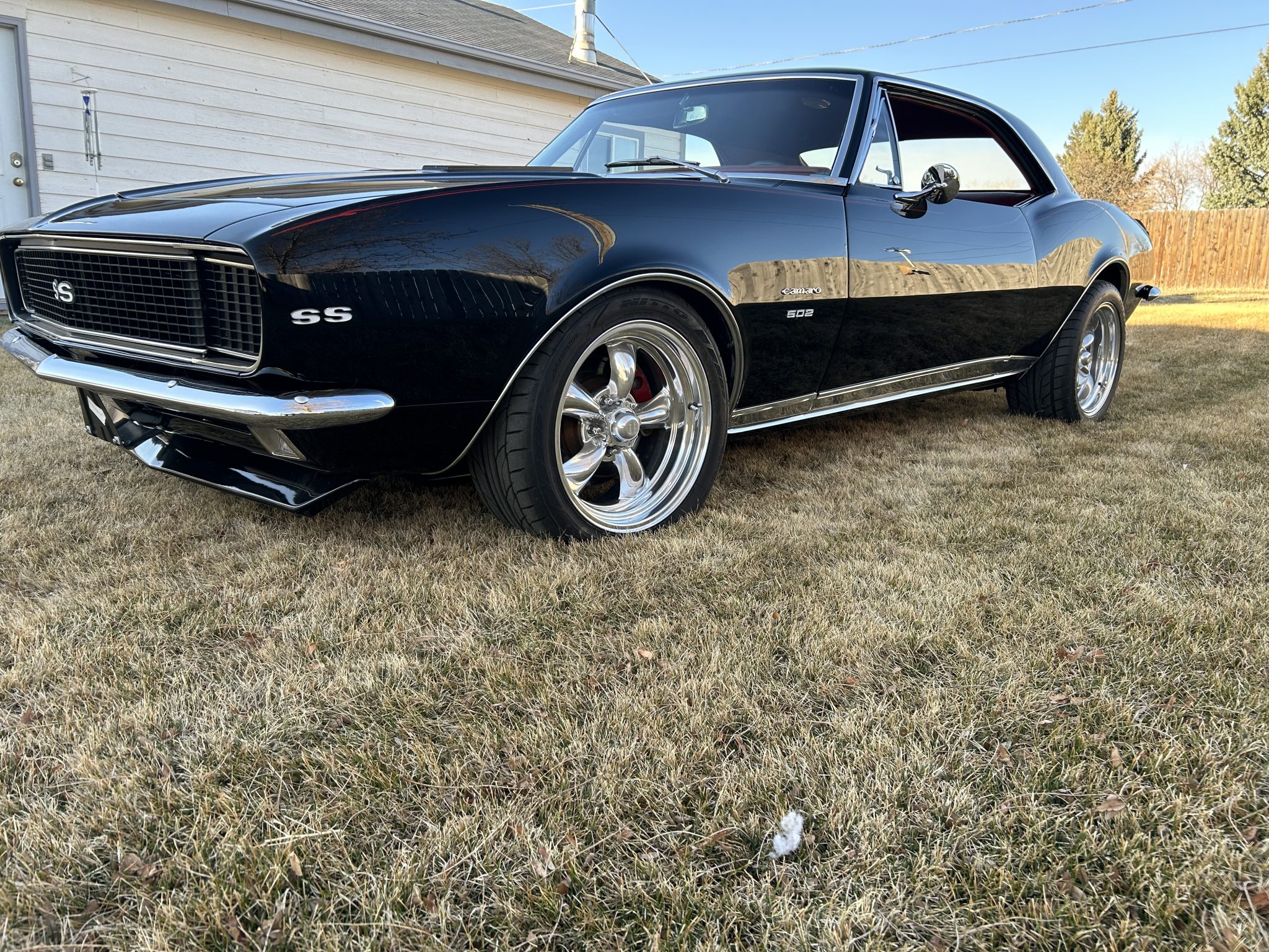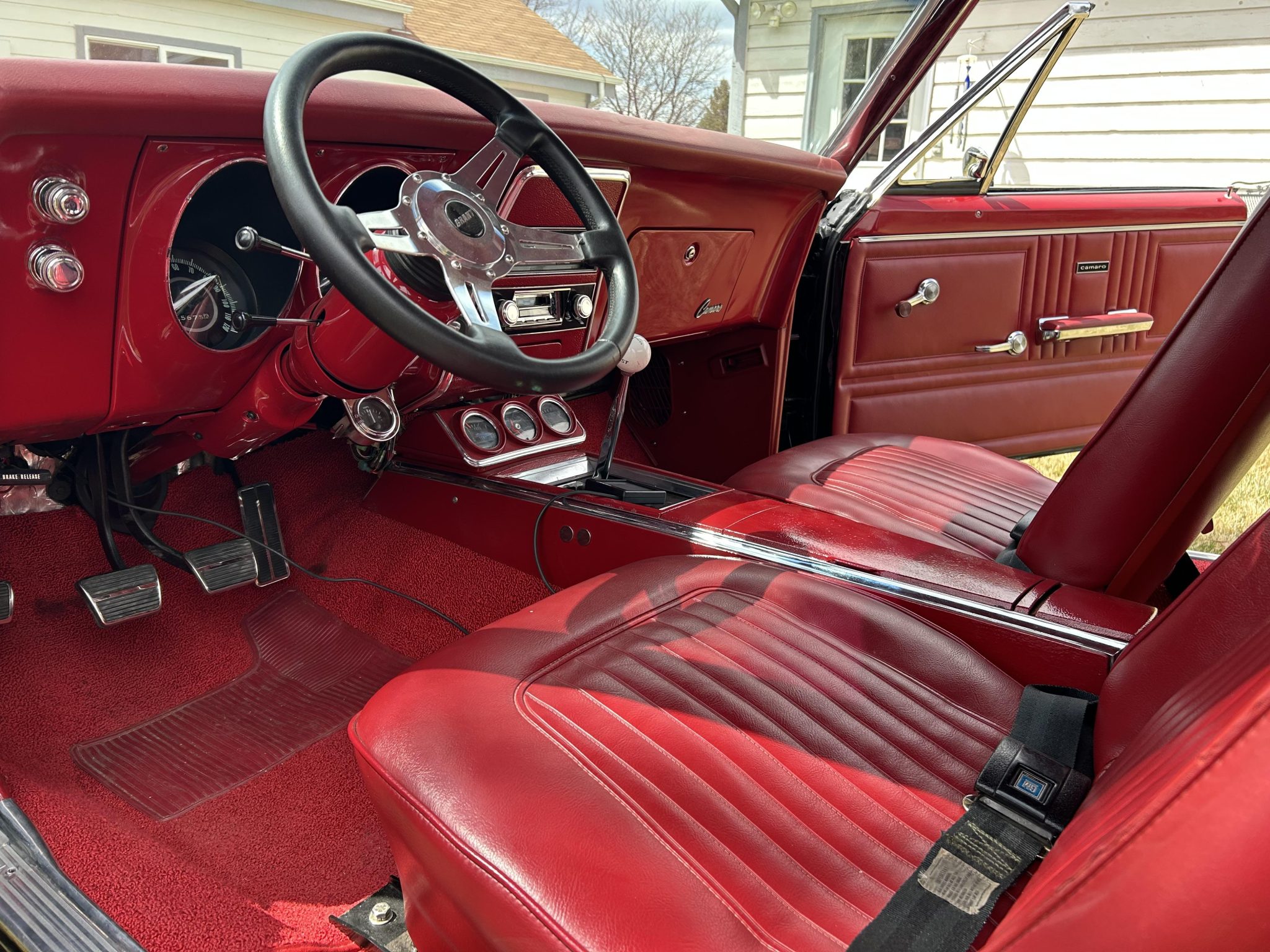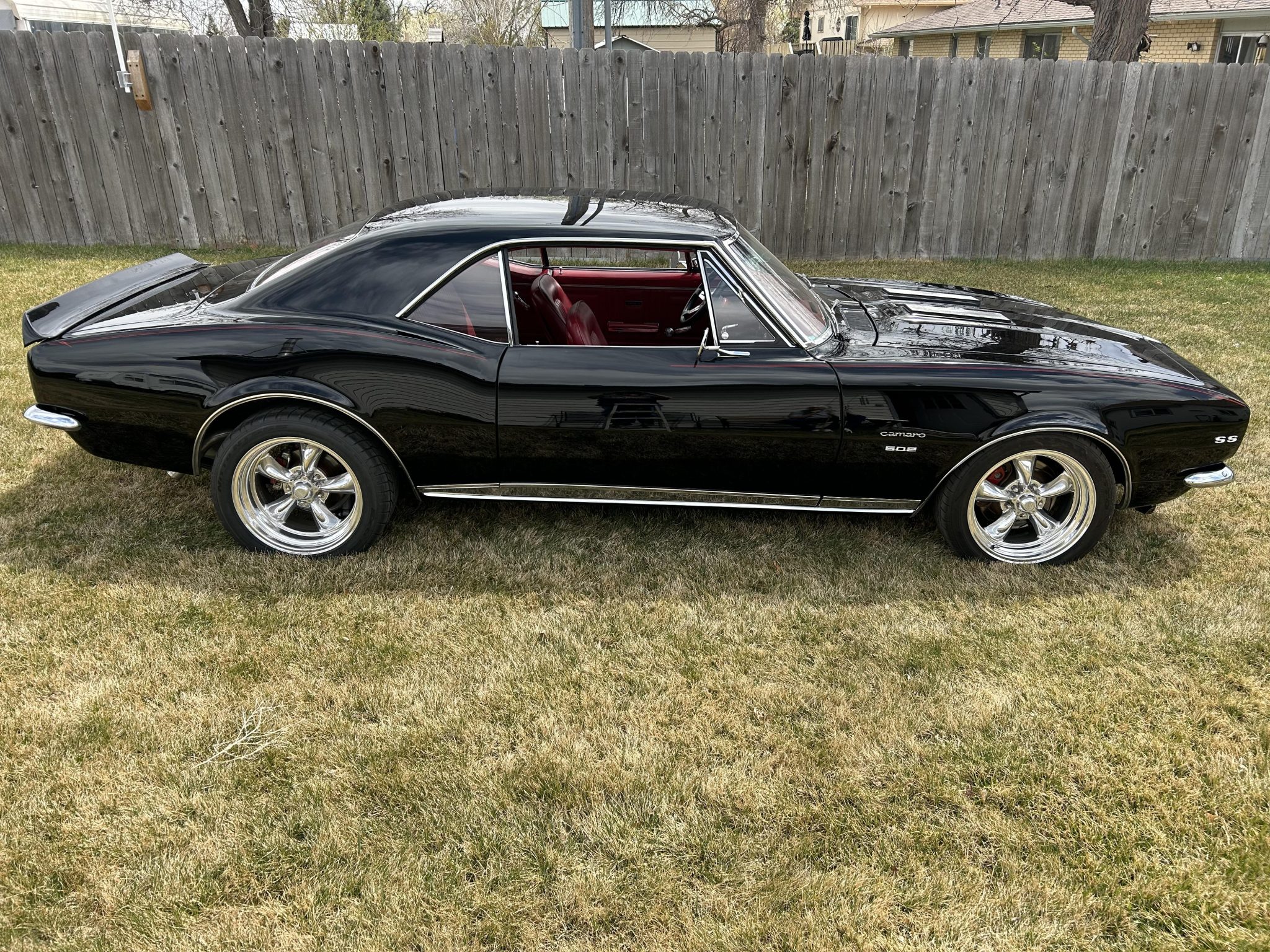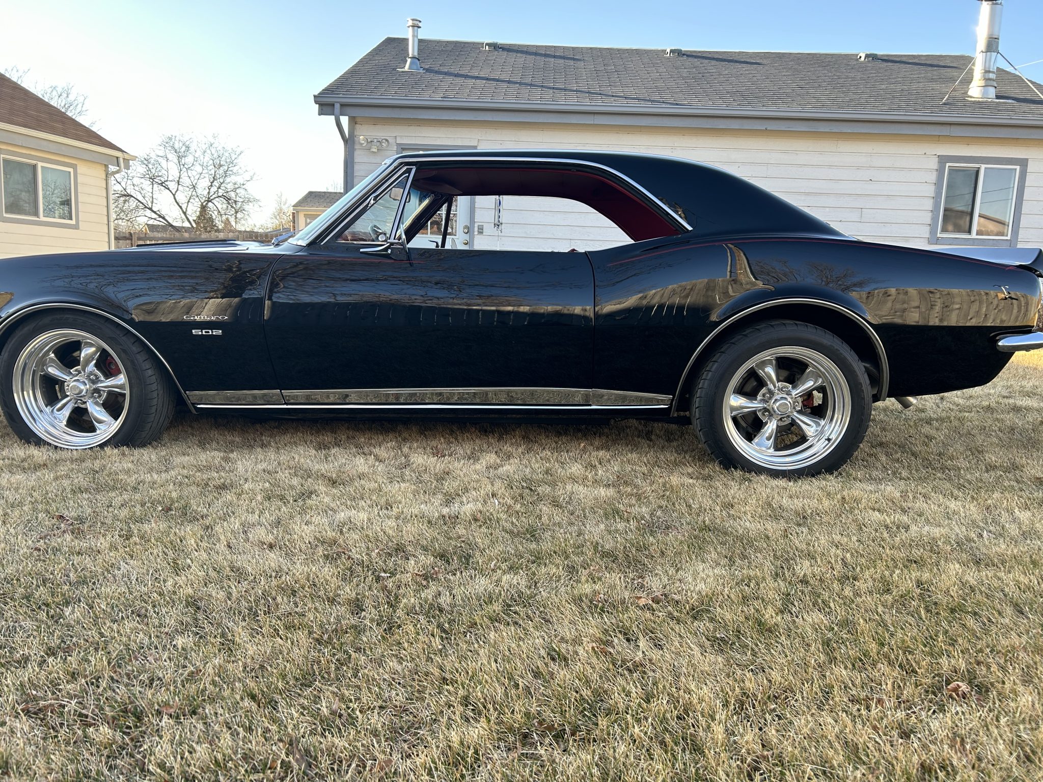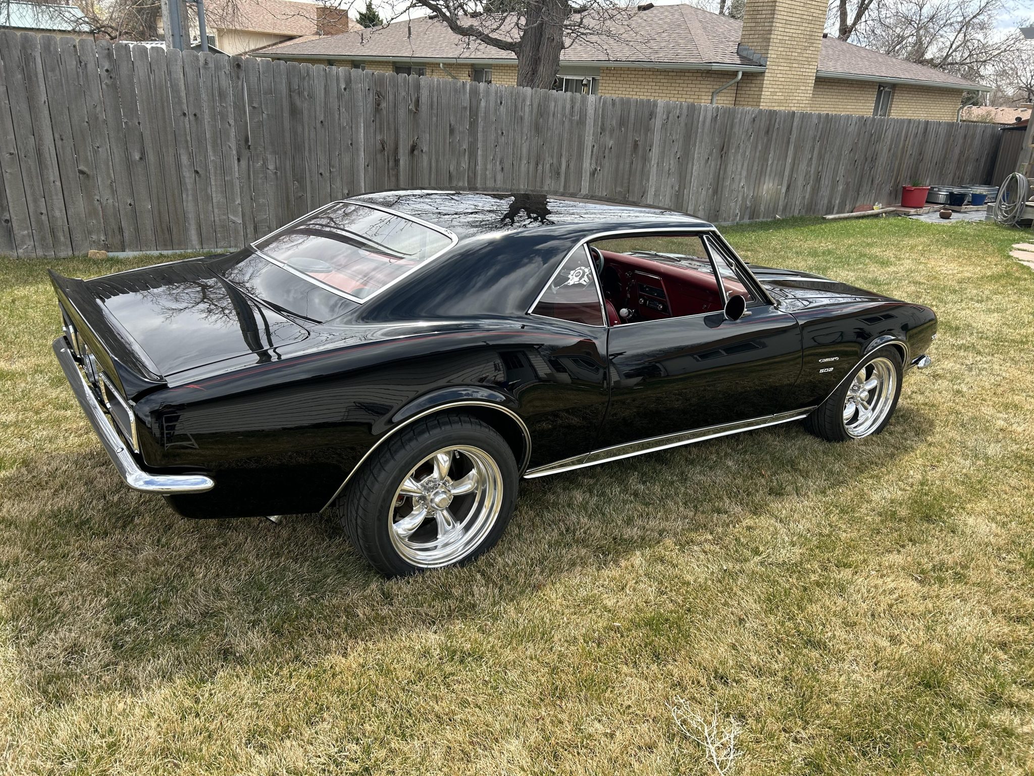 This 1967 Chevrolet Camaro RS coupe was refurbishment work from 2009 to 2011 involved installing a ZZ502 V8 crate engine and refinishing the car in black over red vinyl upholstery. Holley Sniper EFI was added and the brakes and suspension were overhauled in 2018, and additional equipment includes a four-speed manual transmission, a Positraction differential, concealed headlights, an SS-style hood with raised simulated air intakes, front and rear spoilers, and 17″ American Racing Torq Thrust wheels.