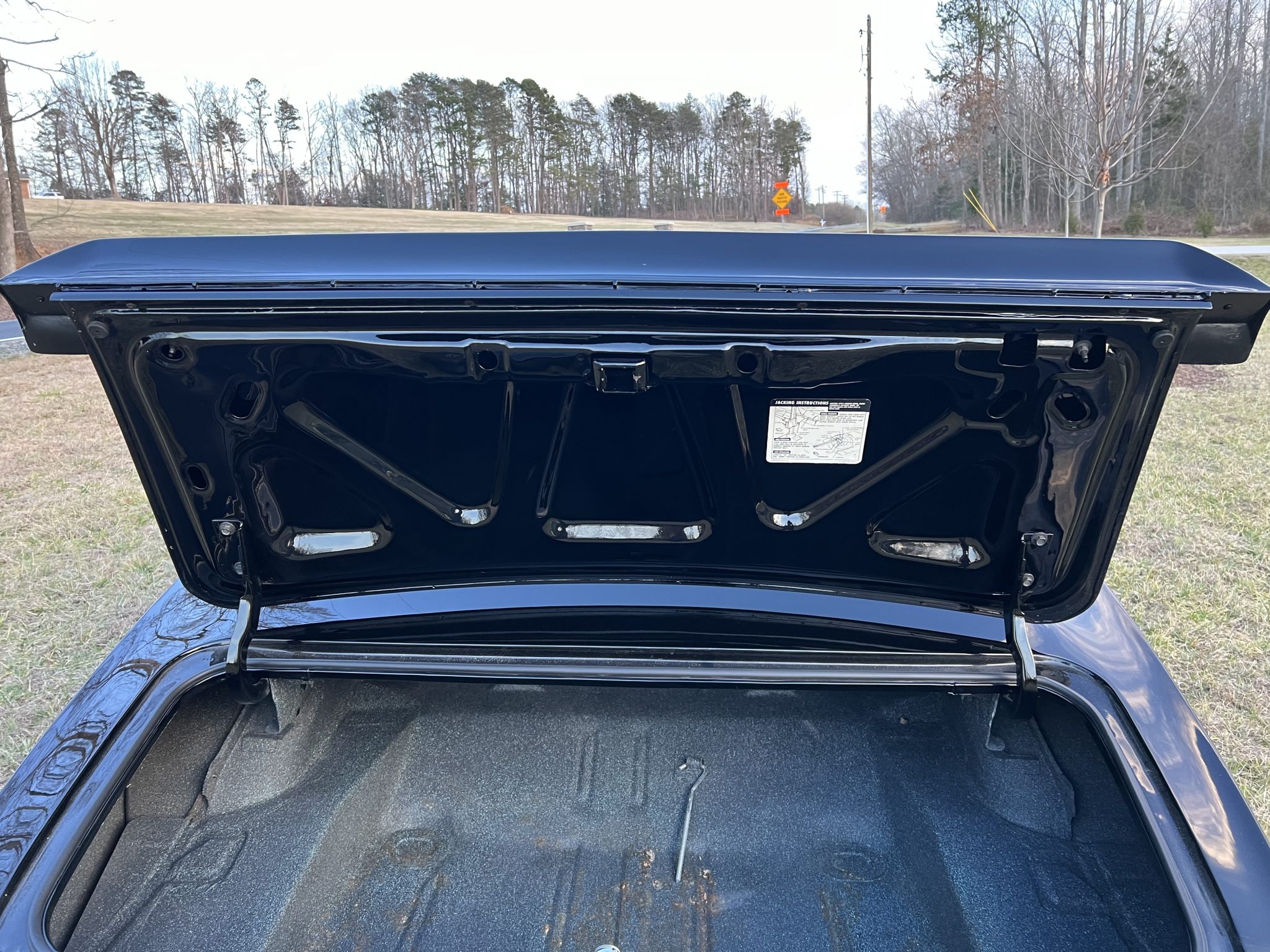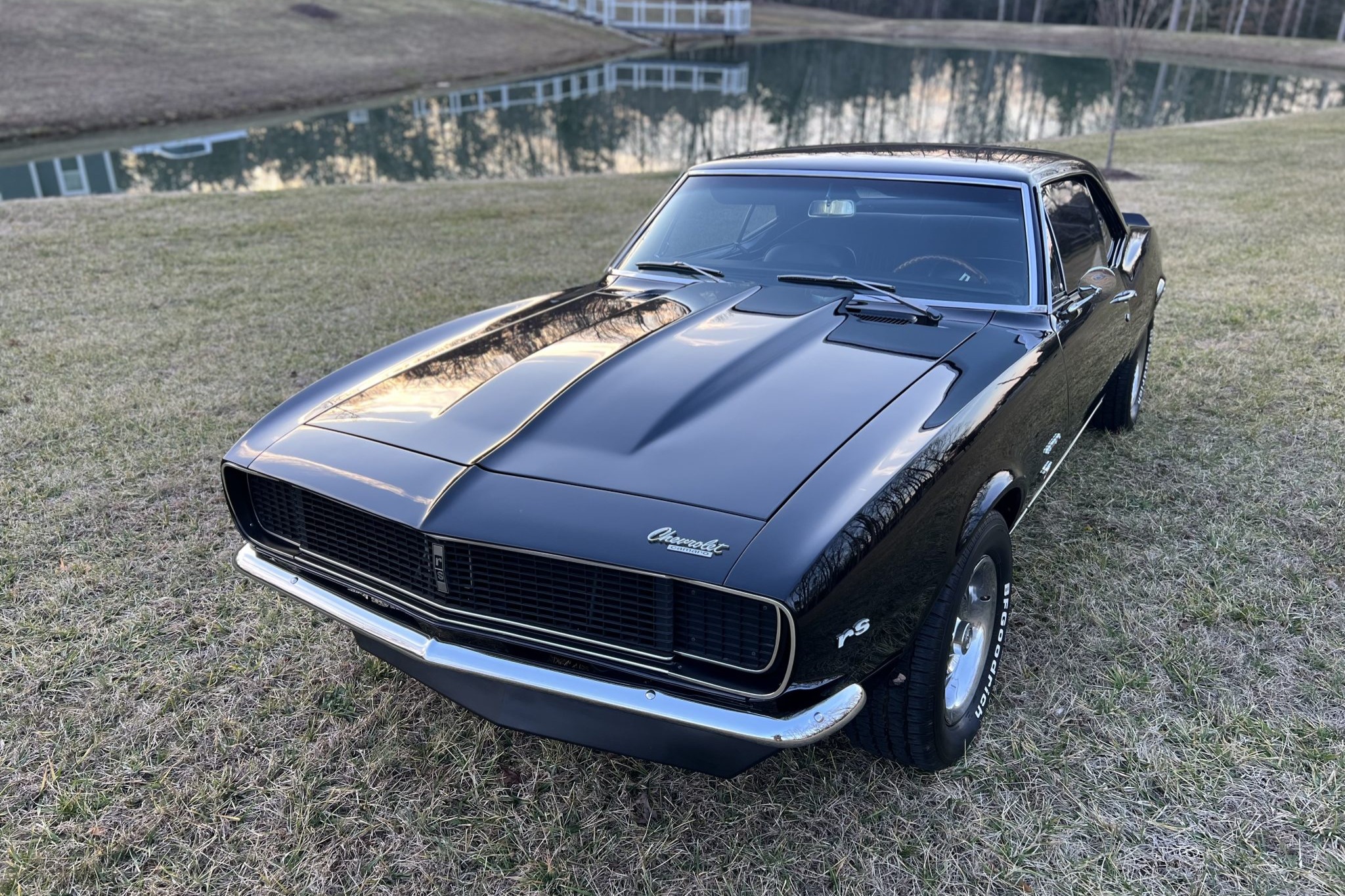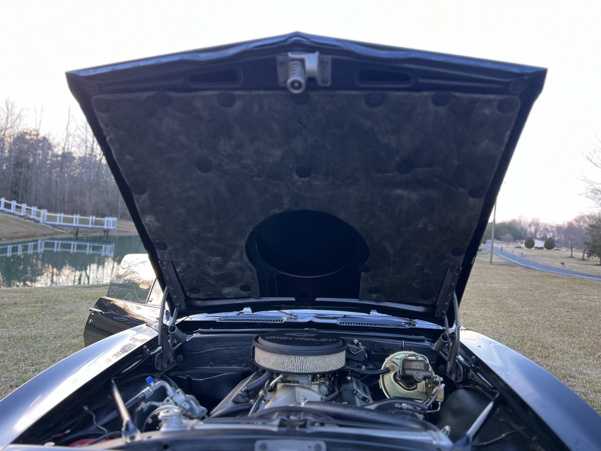 The car has been refinished in black over black upholstery, and it is powered by a replacement 396ci V8 paired with a Richmond four-speed manual transmission. QA1 adjustable front coilovers and rear shocks have been installed along with power-assisted four-wheel disc brakes, a cassette stereo unit, and a Vintage Air climate control system. Additional equipment includes an aluminum intake manifold, a Holley carburetor, an MSD distributor, a COMP Cams camshaft, and a dual exhaust system with MagnaFlow mufflers.