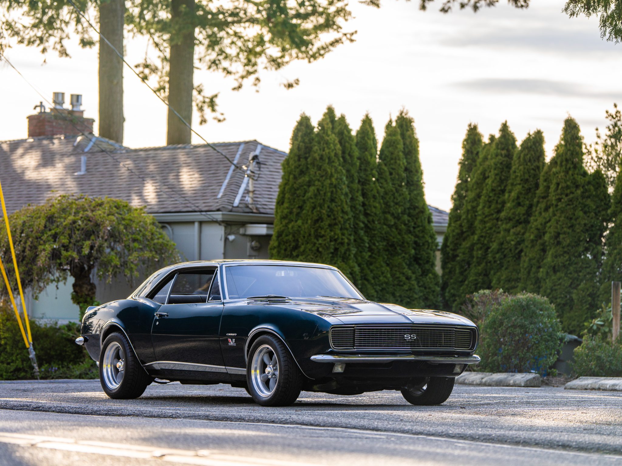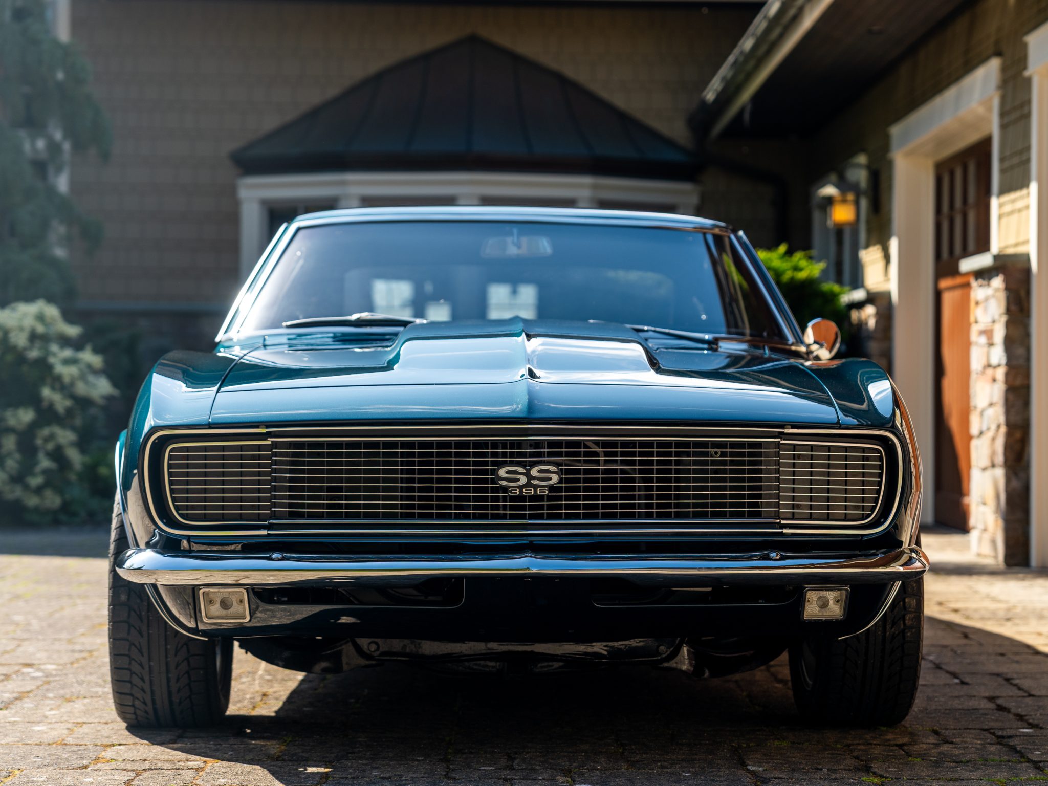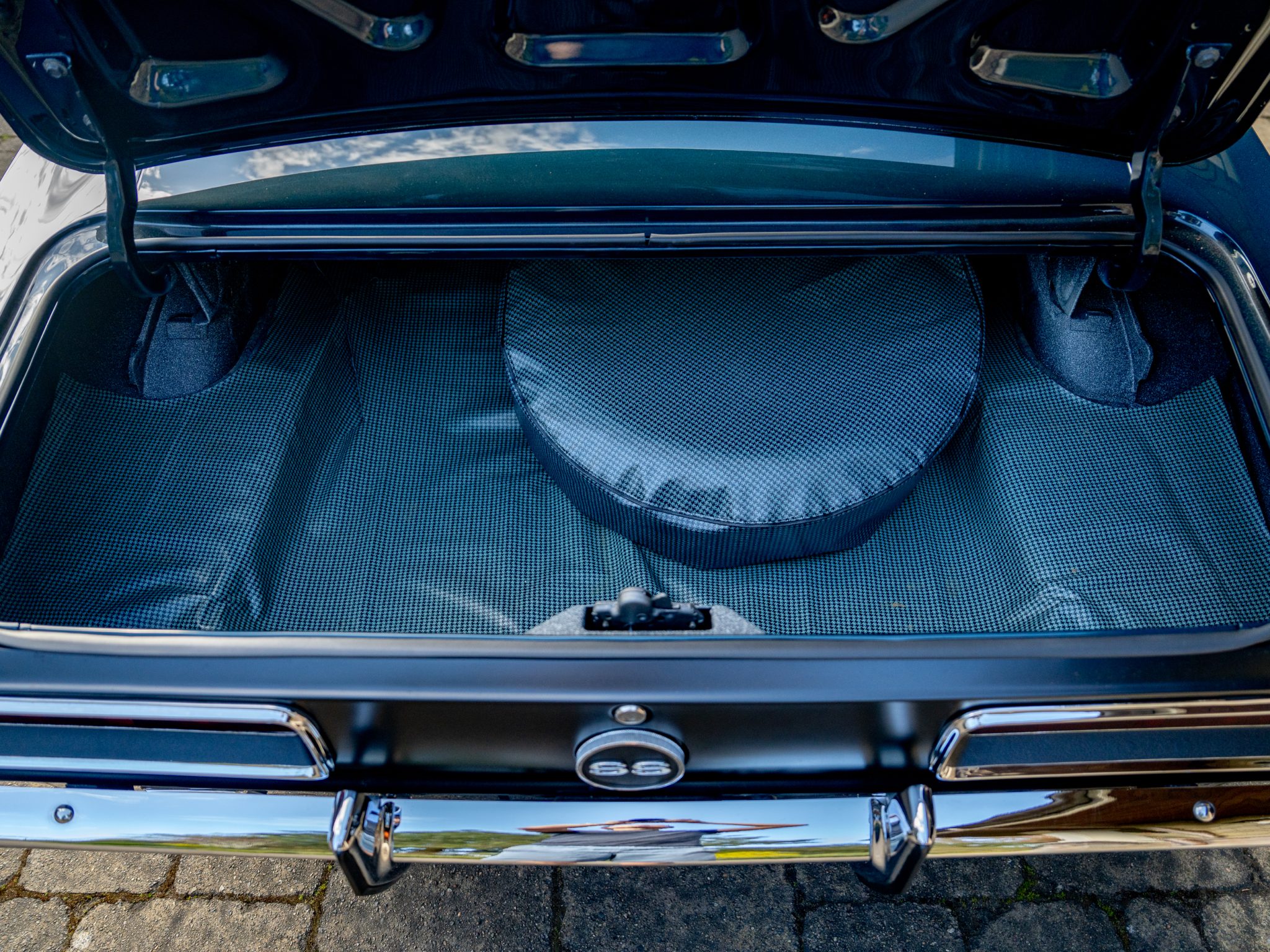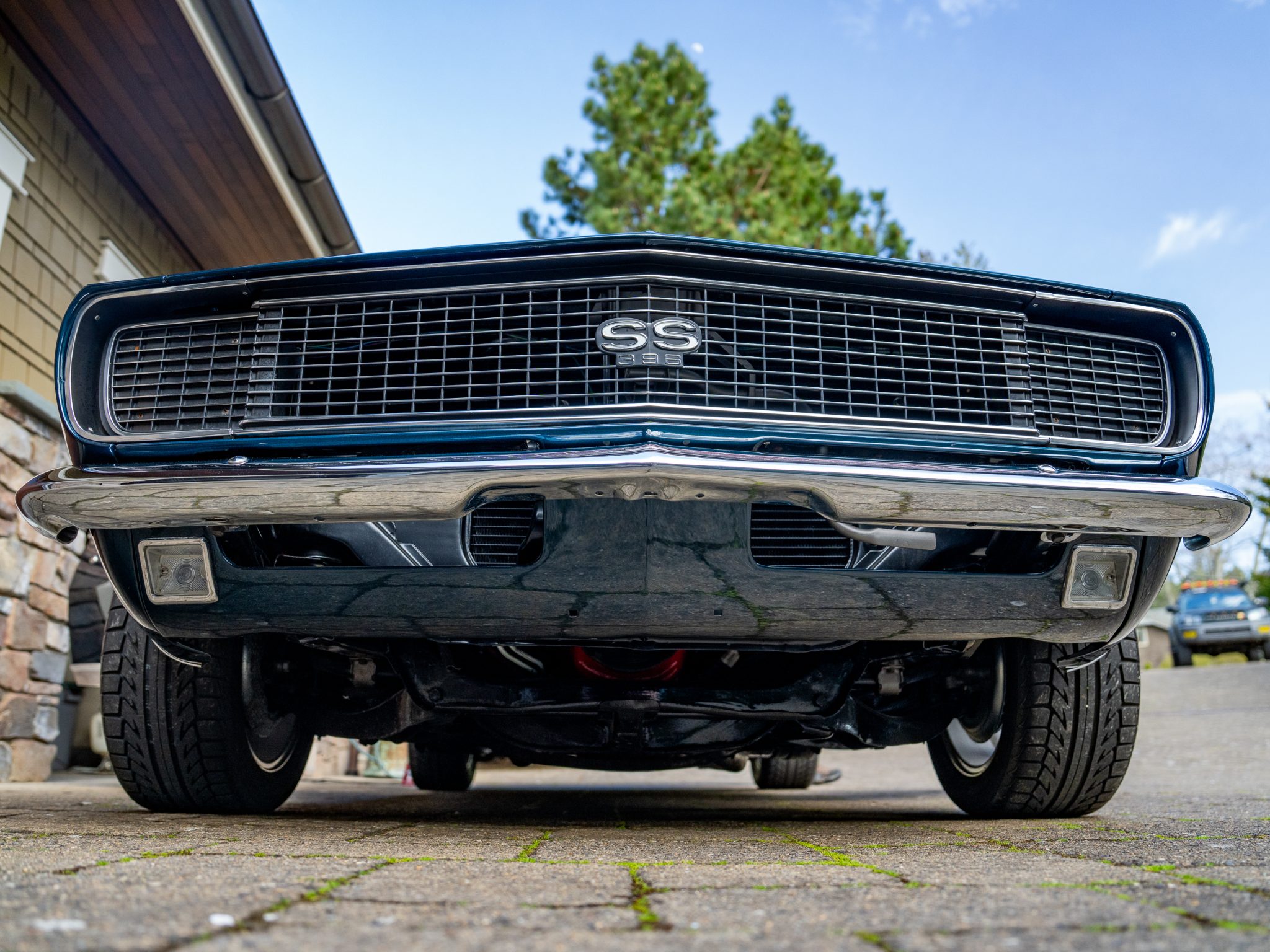 Power is provided by a 396ci V8 linked to a three-speed automatic transmission, a 12-bolt rear axle, and a Positraction differential. The car is further equipped with power-assisted front disc brakes, Hotchkis Sport Suspension coil springs, Fox shocks, 16″ Torq Thrust II wheels, and a 2.5″ dual exhaust system with Flowmaster mufflers as well as electric headlight doors, a cowl-induction hood, a decklid spoiler, and a RetroSound radio
