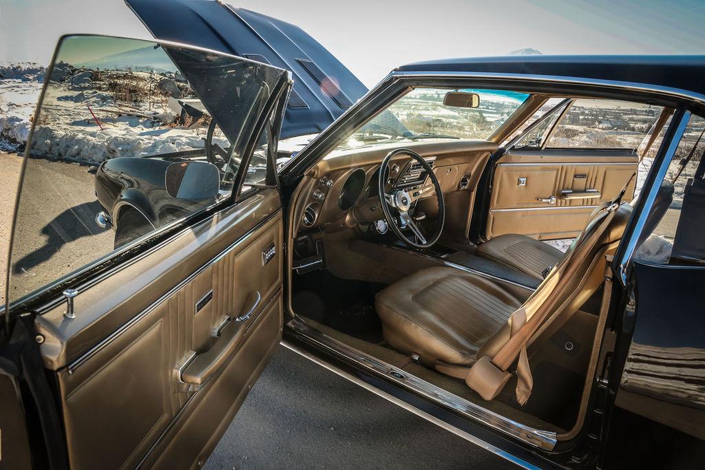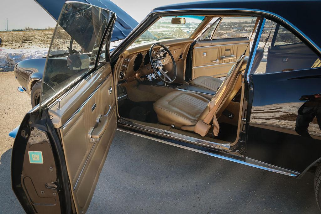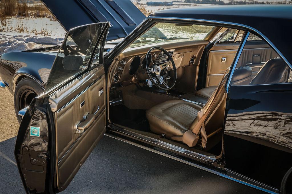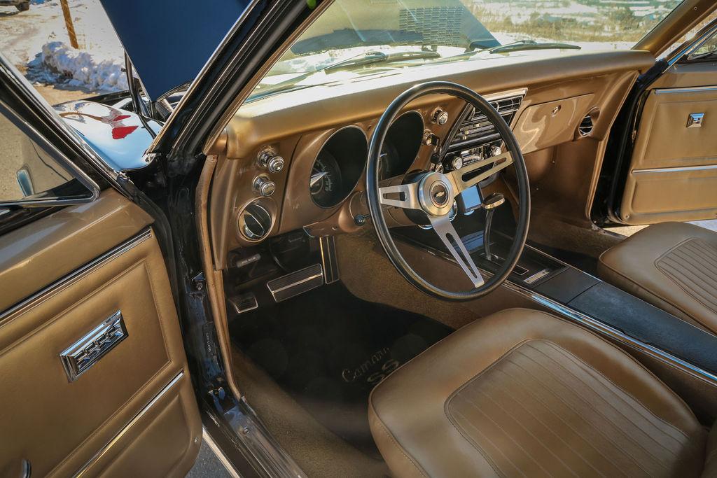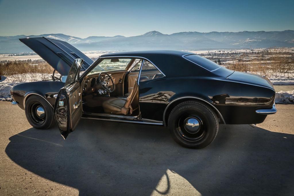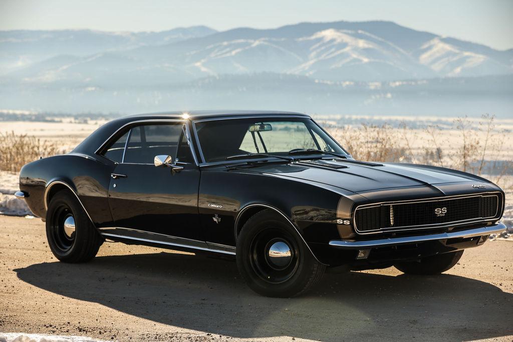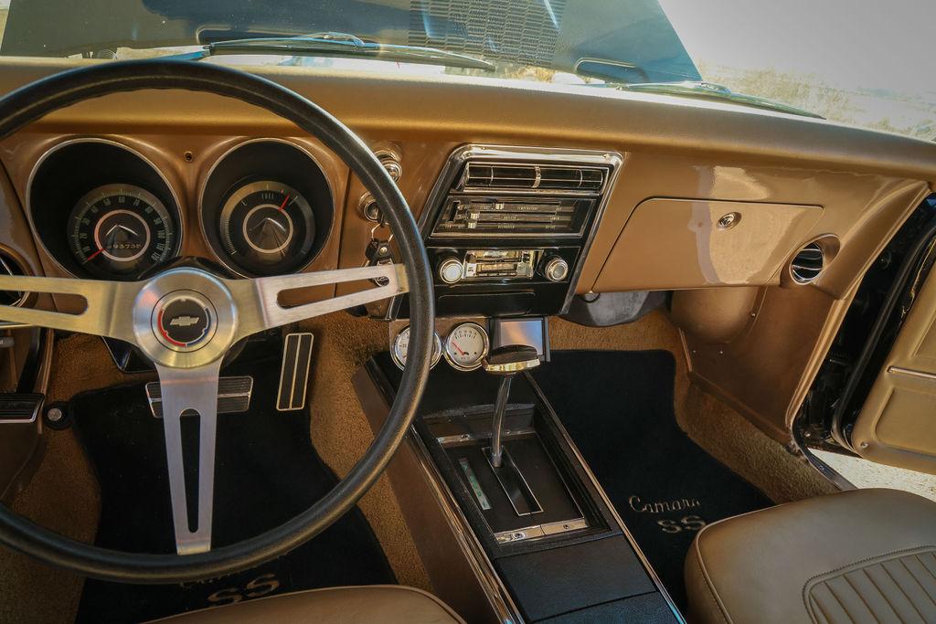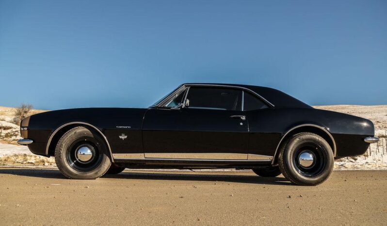 This 1967 Chevrolet Camaro RS/SS coupe is finished in black with a gold nose stripe over gold vinyl upholstery and powered by a 350ci V8 paired with a Powerglide two-speed automatic transmission. Subsequent work involved replacing the tires as well as installing a Hotchkis suspension kit, power-assisted Wilwood front disc brakes, and three-point seatbelts as well as a Holley Sniper fuel injection system, an aluminum radiator, a close-ratio steering box, and 15″ steel wheels. Additional equipment includes concealed headlights, power steering, air conditioning, power windows, and an aftermarket cassette radio.