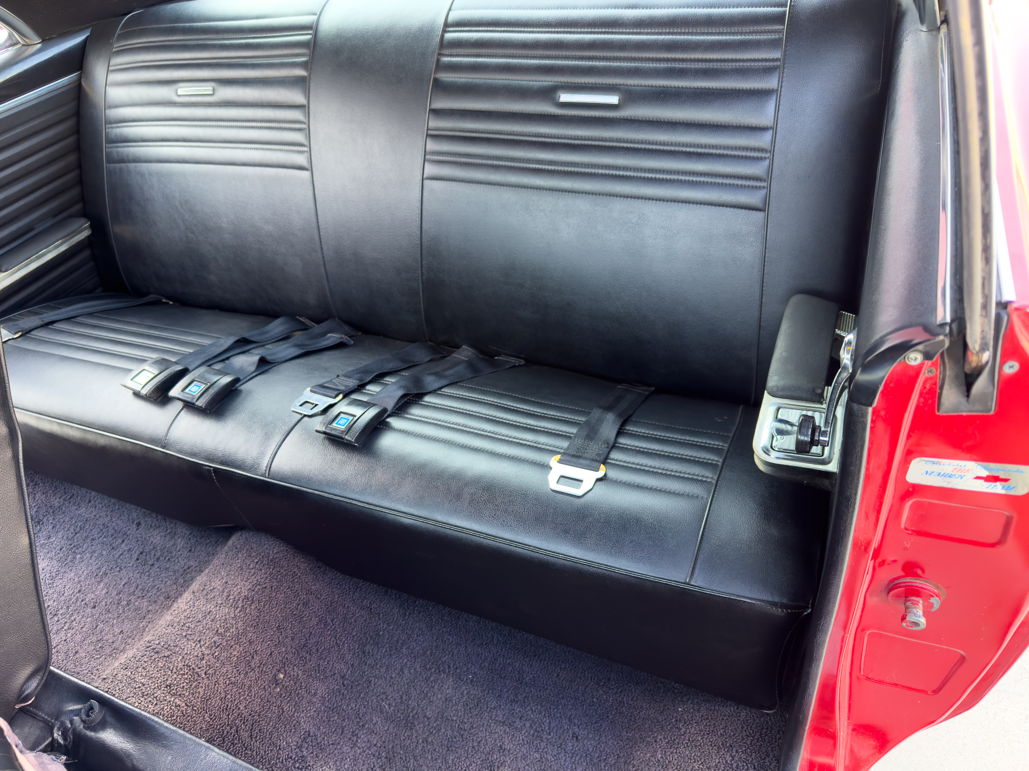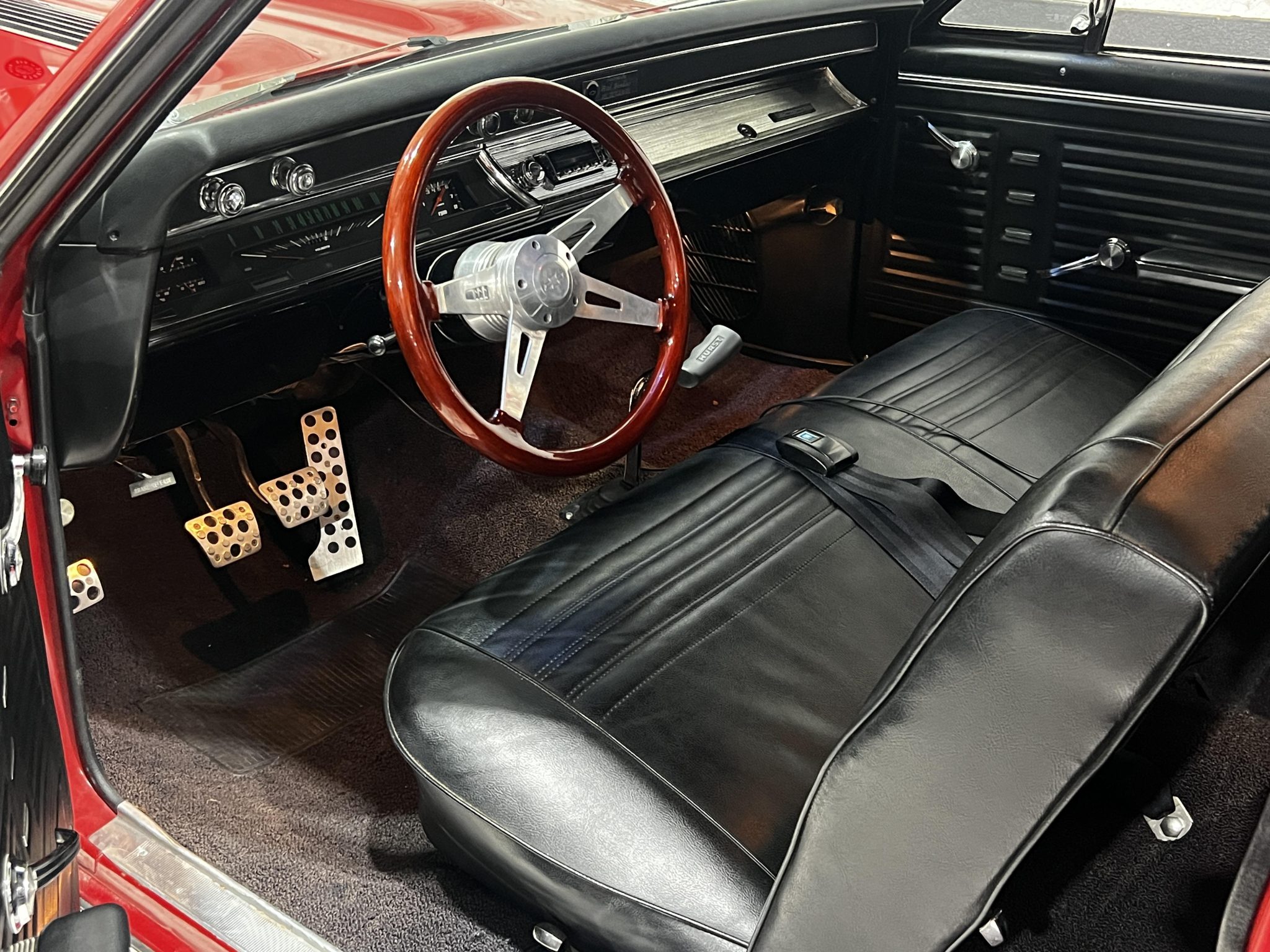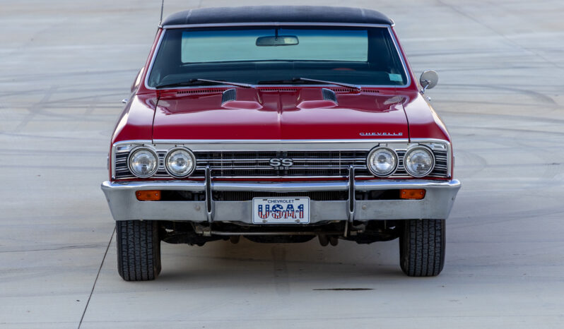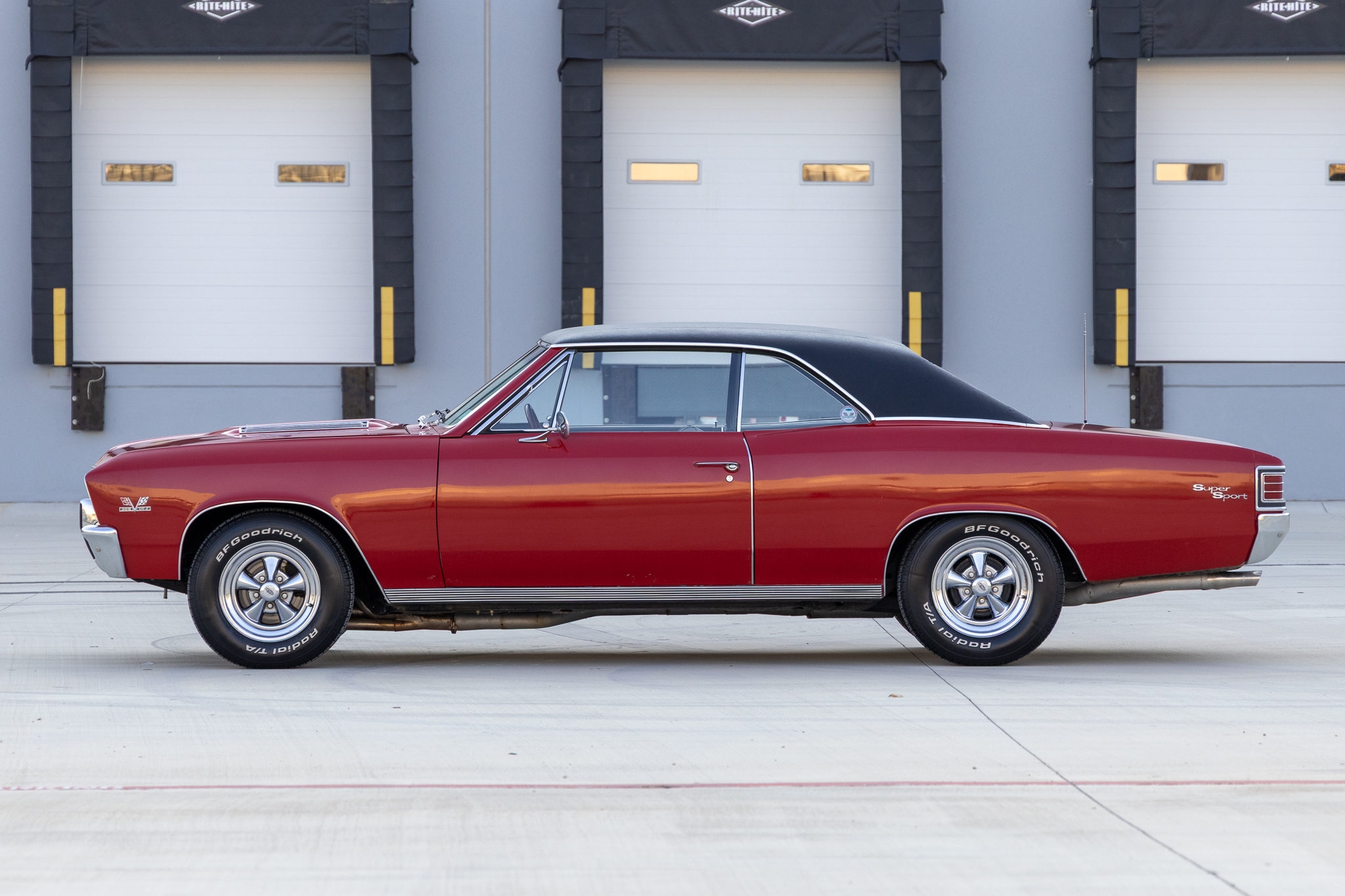 This 1967 Chevrolet Chevelle Malibu sport coupe was refurbished under prior ownership with a refinish in red over black vinyl and the installation of a replacement 396ci V8, a Tremec five-speed manual transmission, and a 3.73:1 rear end with a limited-slip differential. and subsequently equipped with Holley Sniper EFI, a replacement alternator and fuel tank, Classic Instruments gauges, and a retro-style head unit. Other equipment includes an SS-style hood, Cragar 15″ wheels, front disc brakes, SS badging, and a Hurst shifter.