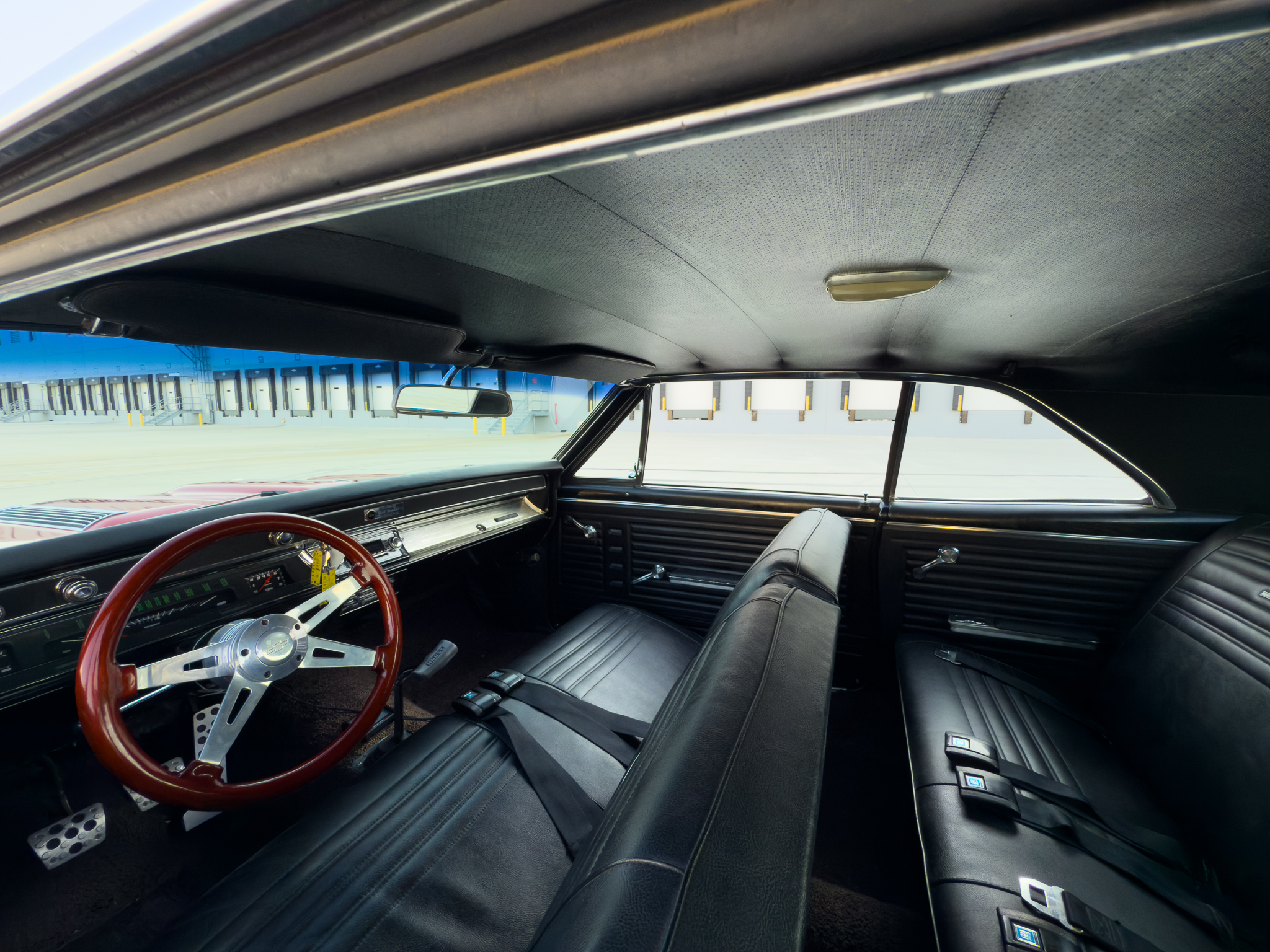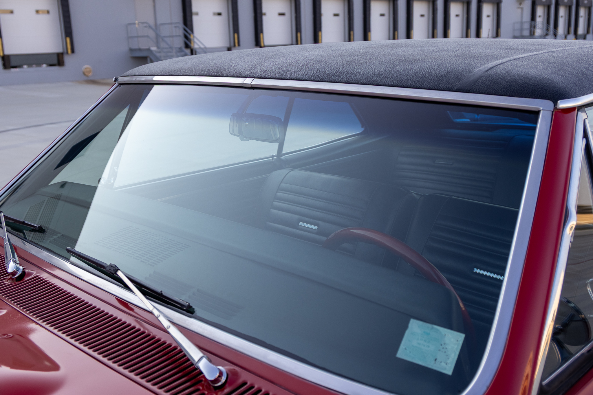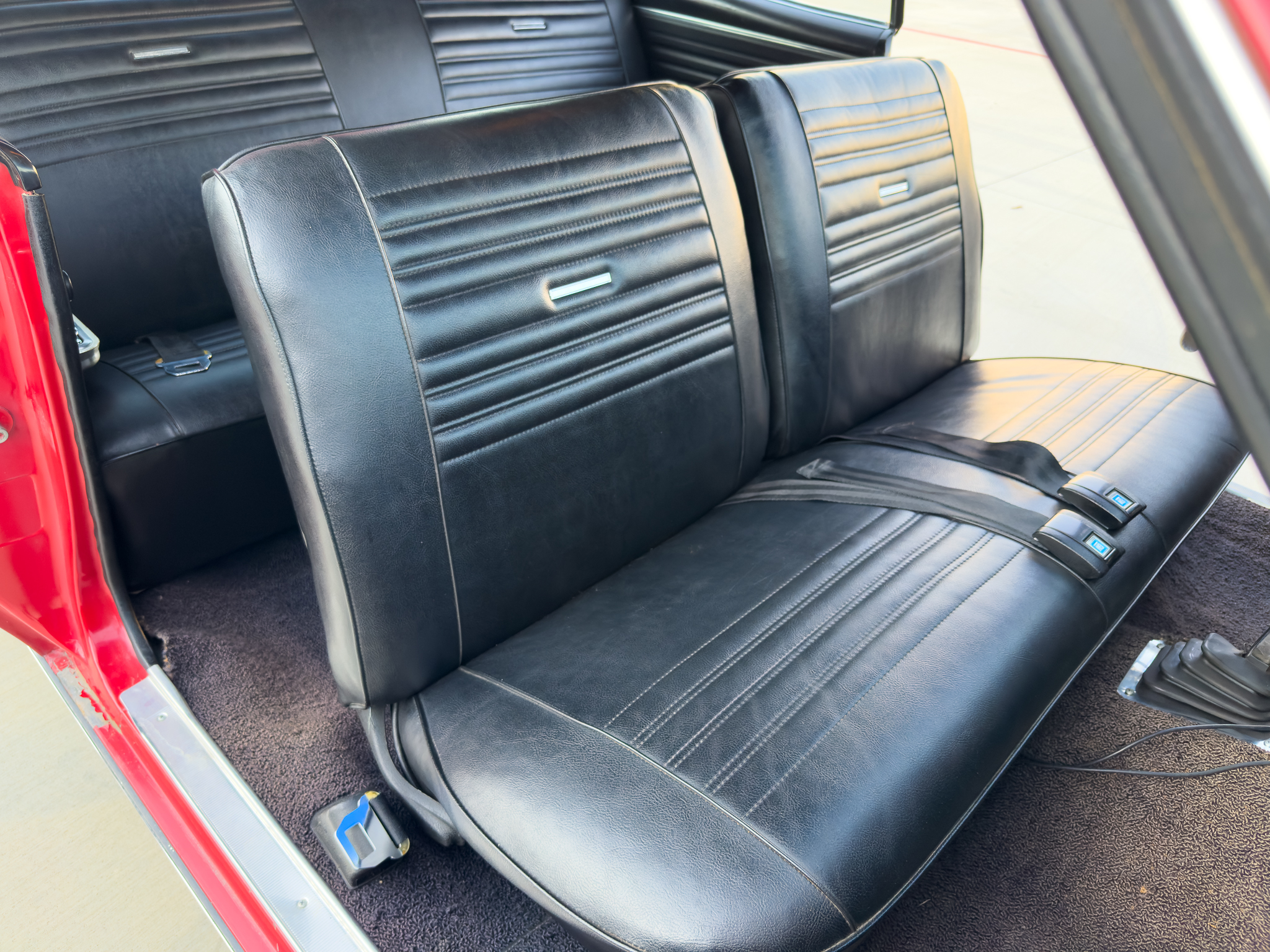 This 1967 Chevrolet Chevelle Malibu sport coupe was refurbished under prior ownership with a refinish in red over black vinyl and the installation of a replacement 396ci V8, a Tremec five-speed manual transmission, and a 3.73:1 rear end with a limited-slip differential. and subsequently equipped with Holley Sniper EFI, a replacement alternator and fuel tank, Classic Instruments gauges, and a retro-style head unit. Other equipment includes an SS-style hood, Cragar 15″ wheels, front disc brakes, SS badging, and a Hurst shifter.
