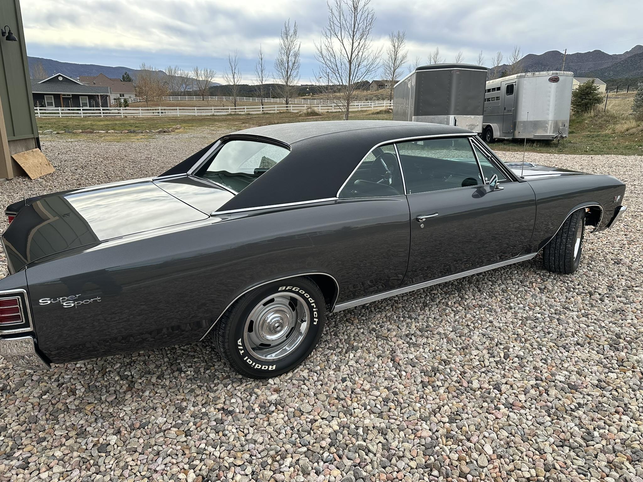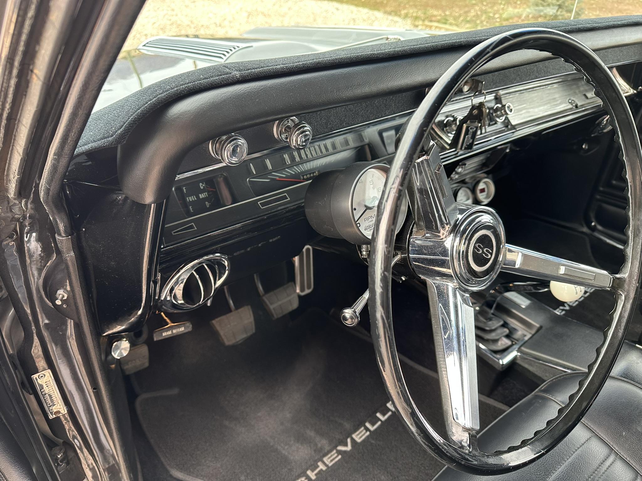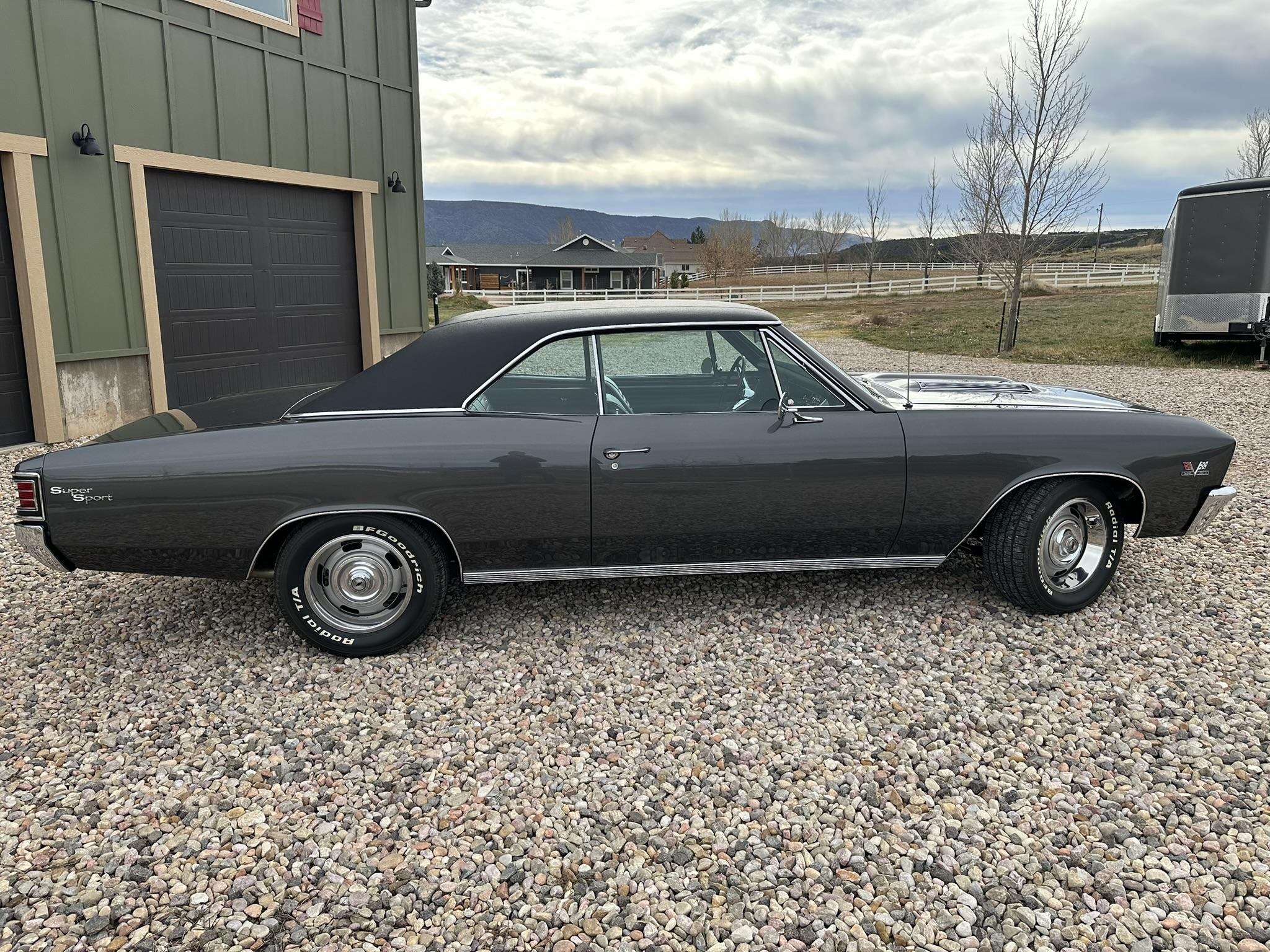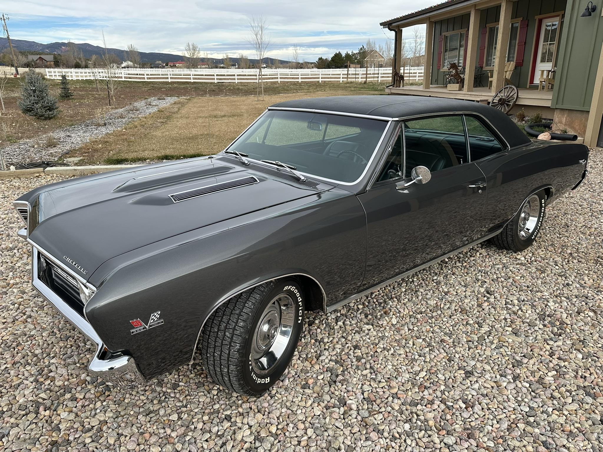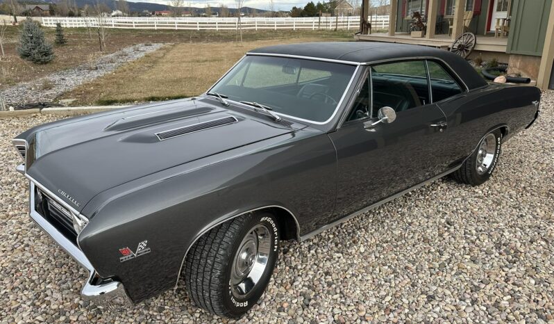 This 1967 Chevrolet Chevelle SS 396 sport coupe was cosmetically refurbished circa 2001, the car was fitted with a rebuilt 454ci V8 that was bored over and assembled with forged internal components, a Holley carburetor, and a Winters aluminum intake manifold, and power is routed through a Tremec five-speed manual transmission and a performance 12-bolt rear end with 3.73:1 gears. The body is finished in metallic gray with a black vinyl roof cover, and the cabin is outfitted with black upholstery, a center console, aftermarket gauges, air conditioning, and a Hurst shifter. Additional equipment includes 15″ Rally wheels, power steering, front disc brakes, QA1 coilovers, and Hotchkis suspension components.