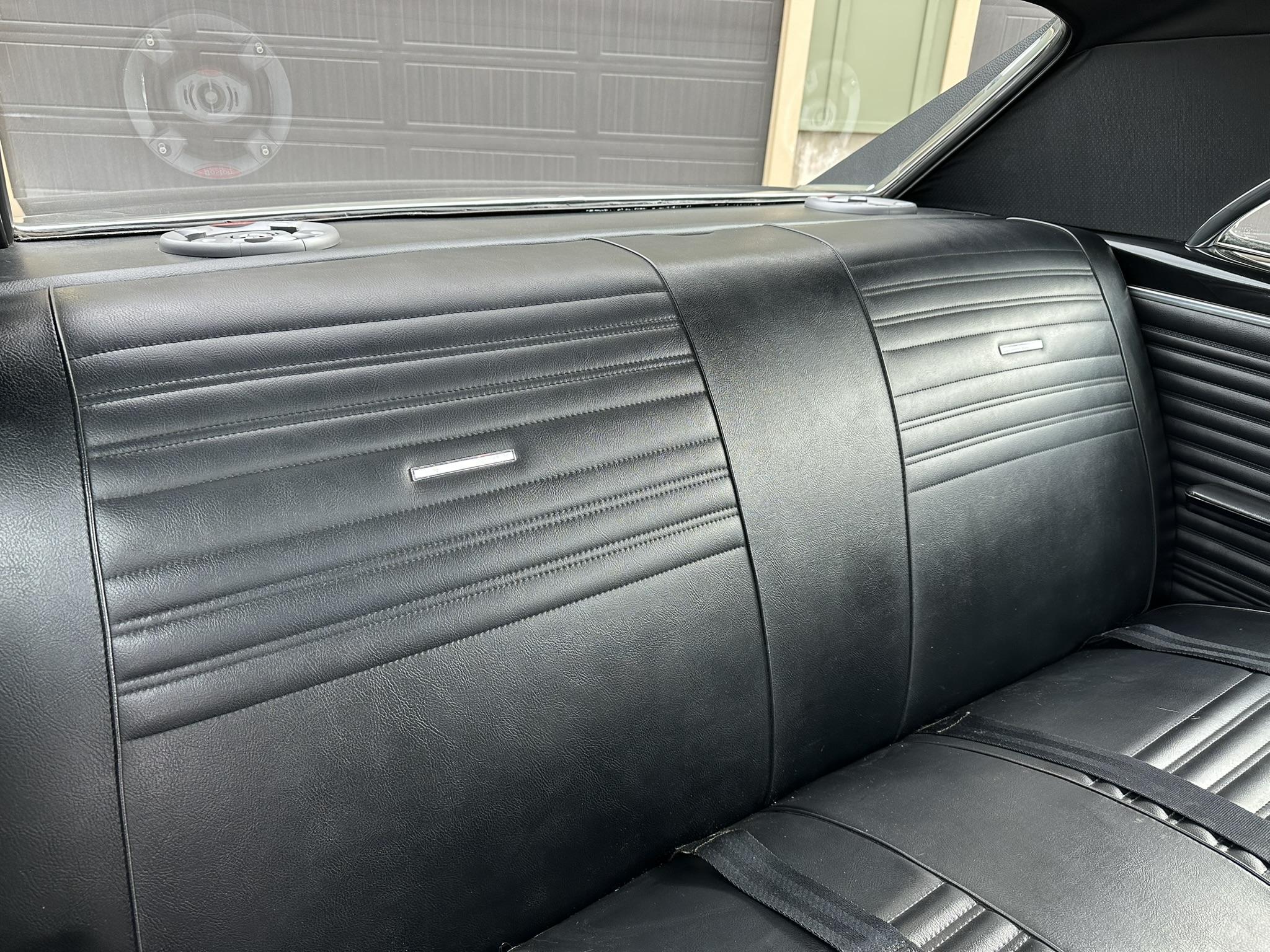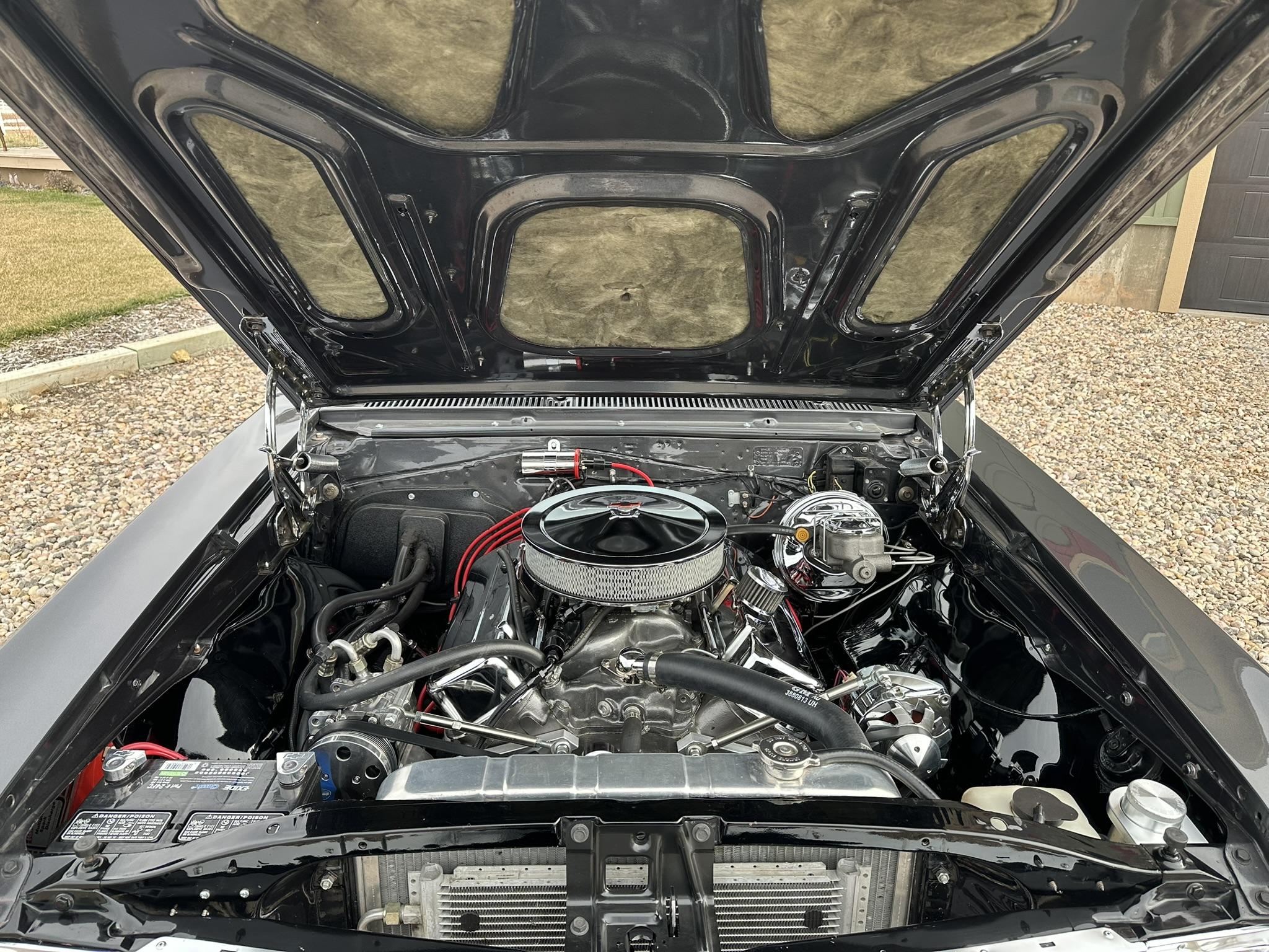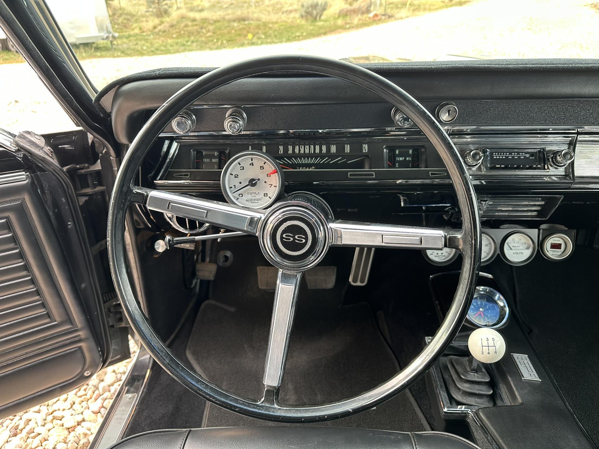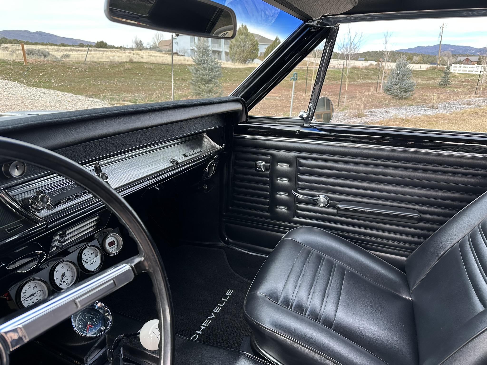 This 1967 Chevrolet Chevelle SS 396 sport coupe was cosmetically refurbished circa 2001, the car was fitted with a rebuilt 454ci V8 that was bored over and assembled with forged internal components, a Holley carburetor, and a Winters aluminum intake manifold, and power is routed through a Tremec five-speed manual transmission and a performance 12-bolt rear end with 3.73:1 gears. The body is finished in metallic gray with a black vinyl roof cover, and the cabin is outfitted with black upholstery, a center console, aftermarket gauges, air conditioning, and a Hurst shifter. Additional equipment includes 15″ Rally wheels, power steering, front disc brakes, QA1 coilovers, and Hotchkis suspension components.