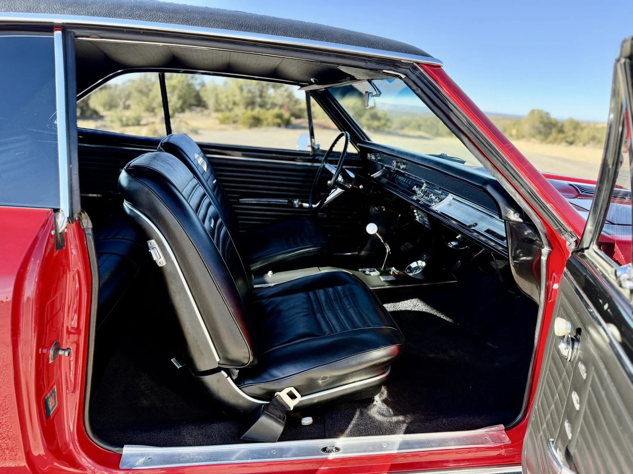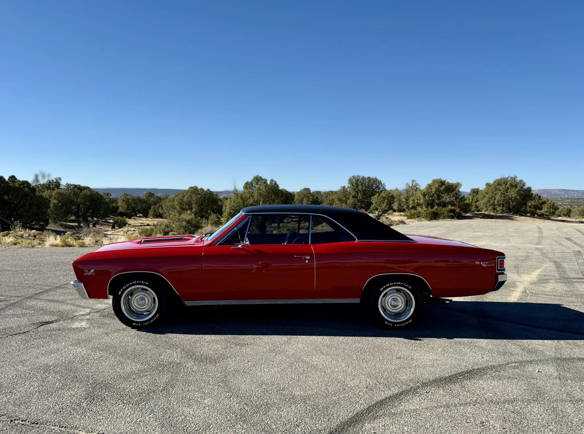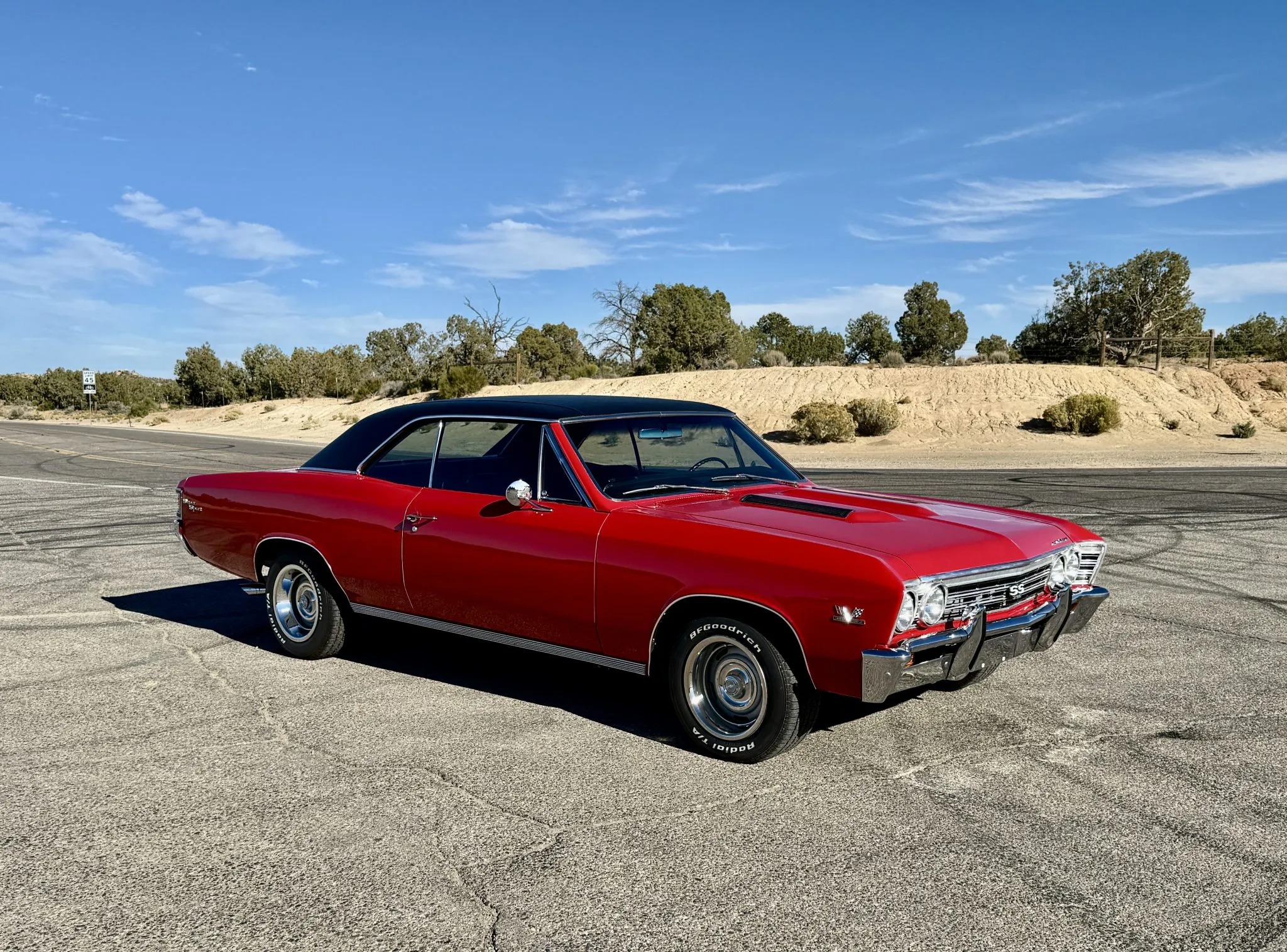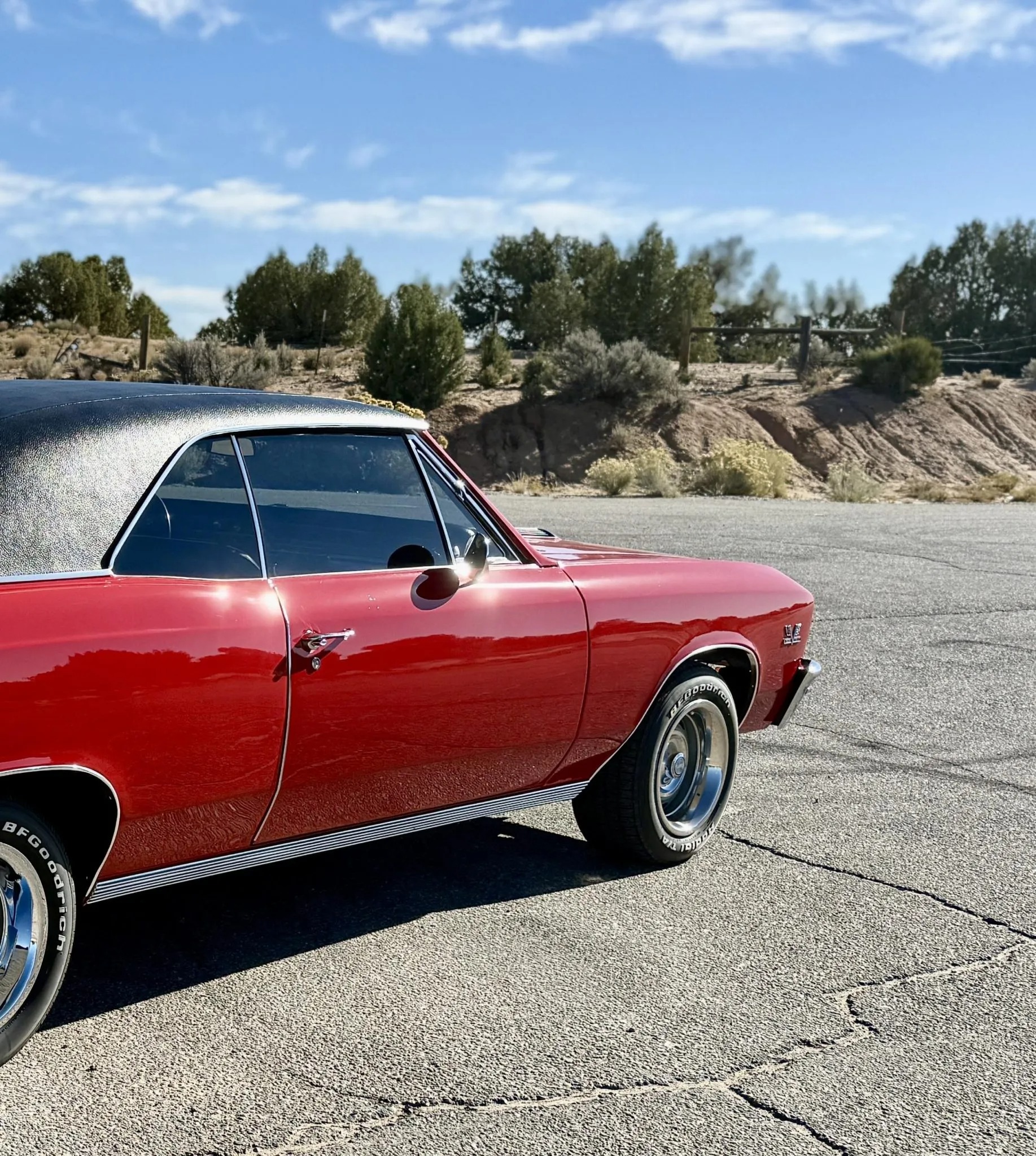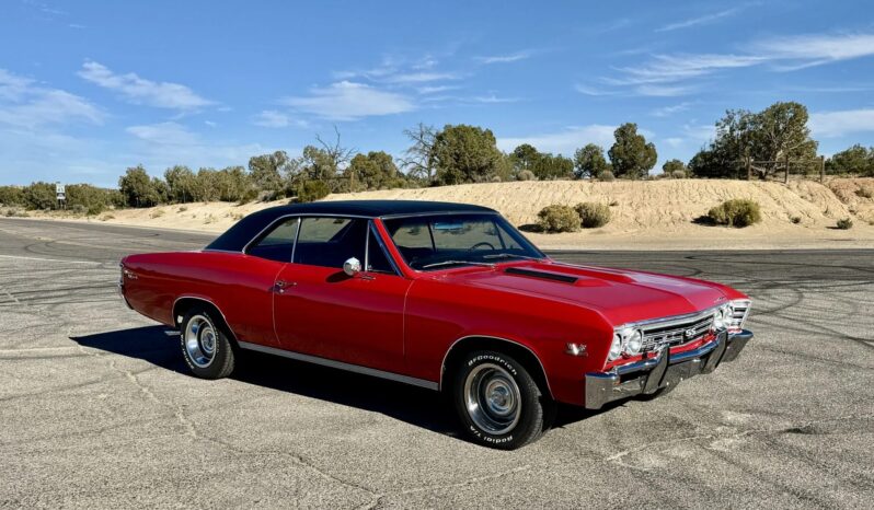 It is powered by a 396ci V8 linked with a four-speed manual transmission and a Positraction limited-slip rear differential, and it is finished in Bolero Red over black vinyl upholstery. Features include a black vinyl roof covering, chrome bumpers with overriders, dual side mirrors, power-assisted brakes, power steering, a front and rear coil-spring suspension, 15″ steel wheels with chrome trim rings, front bucket seats, a Hurst shifter an retro-style digital stereo, a Holley intake manifold, long-tube exhaust headers and Flowmaster mufflers.