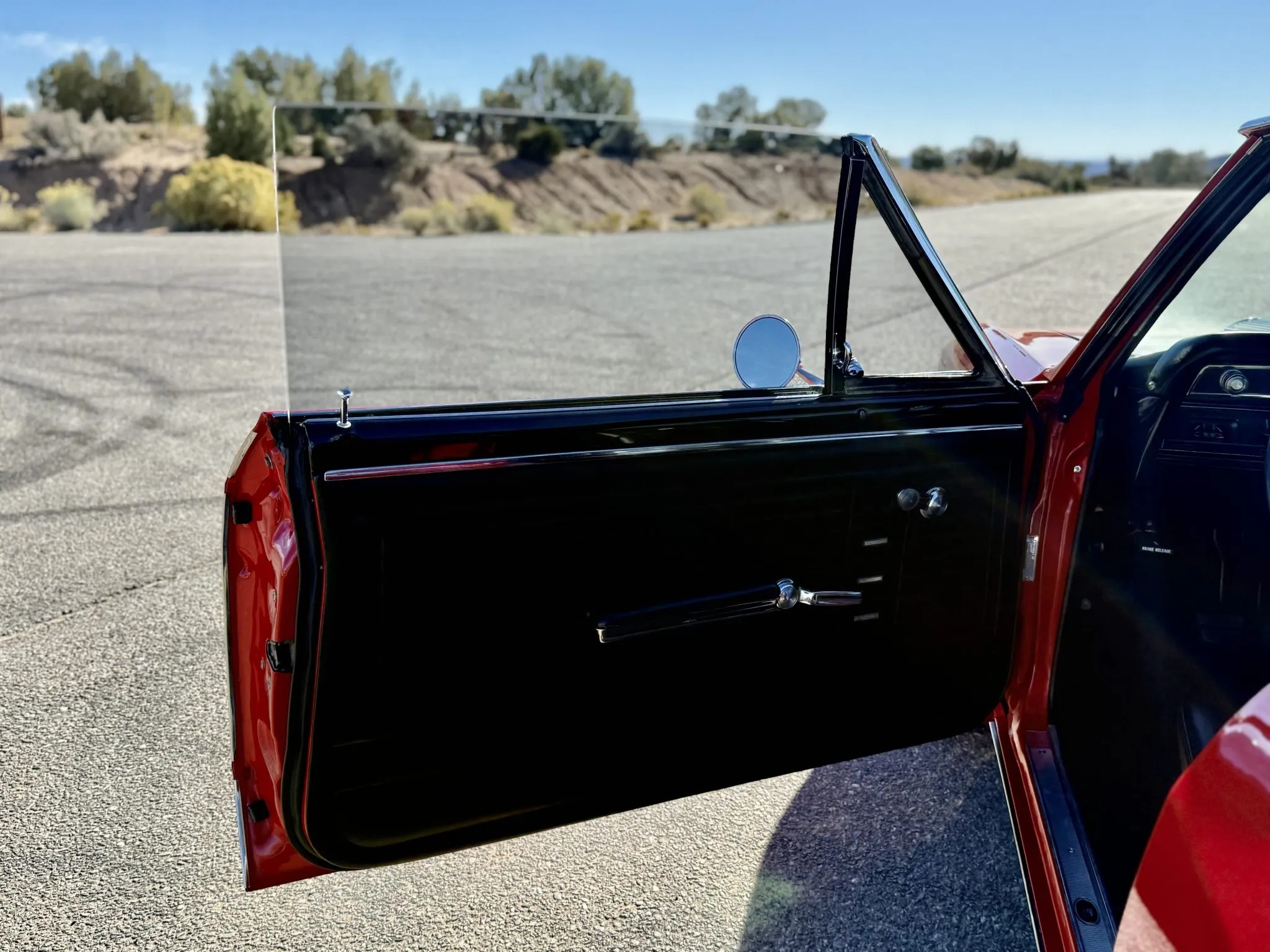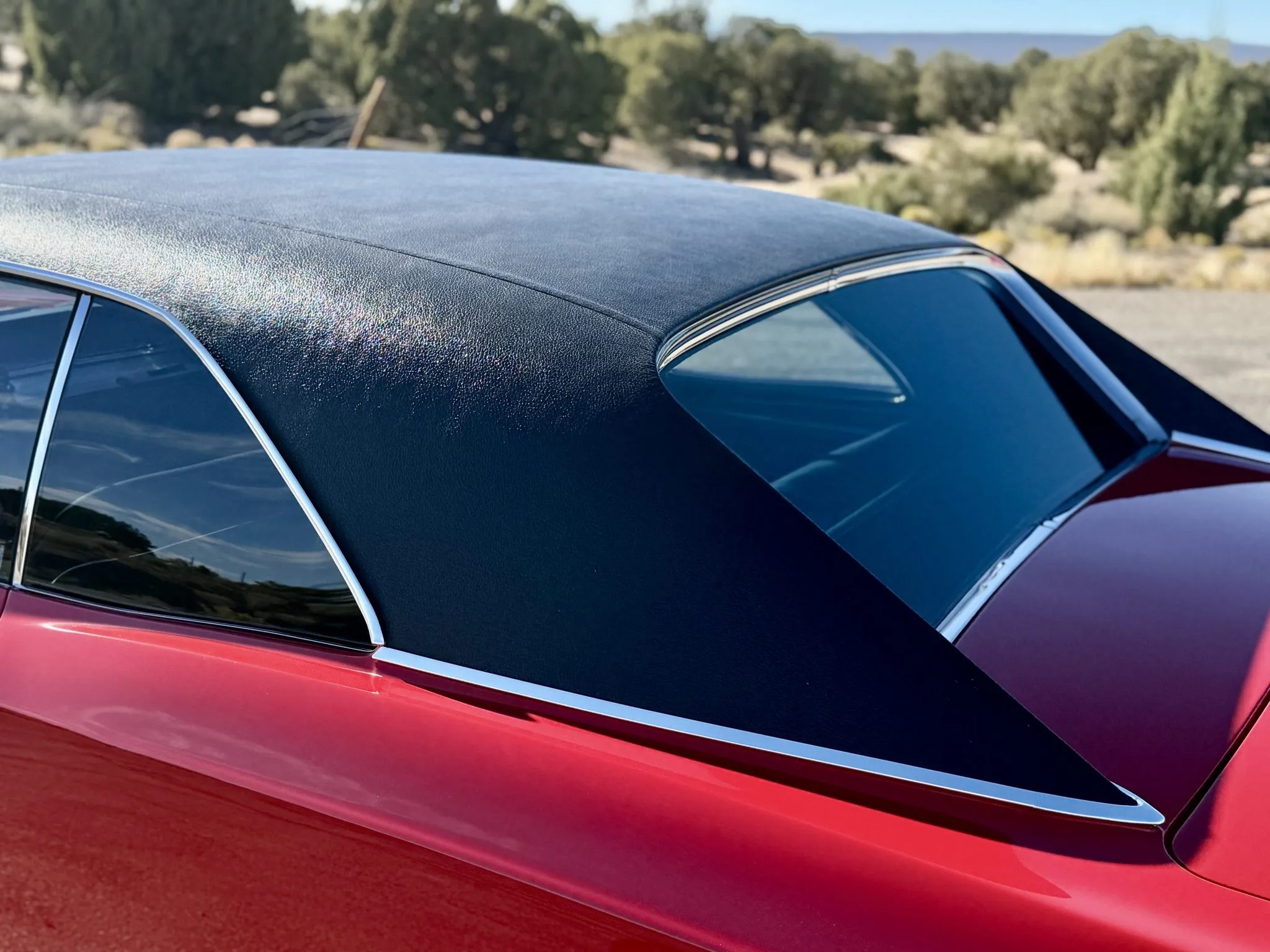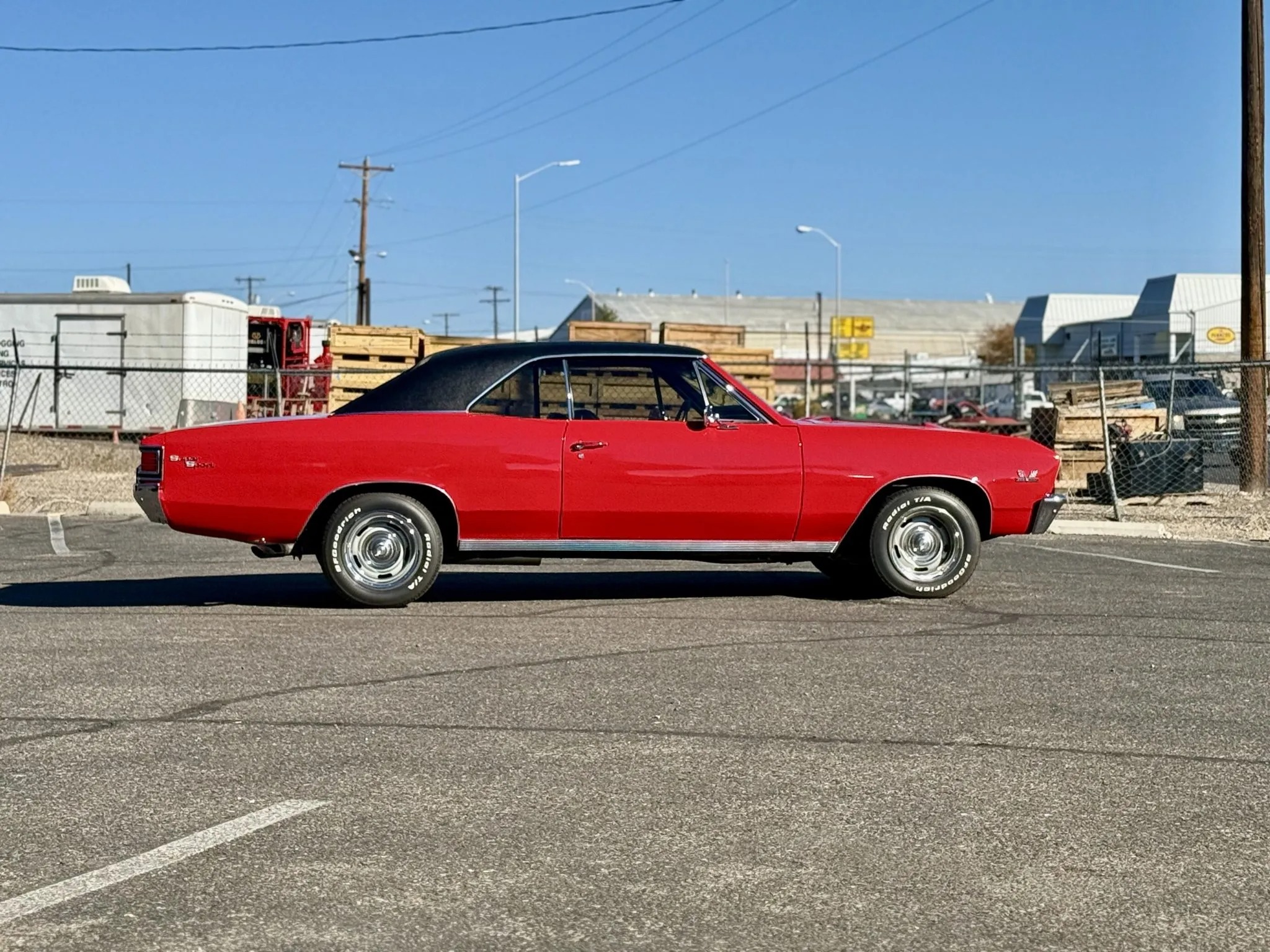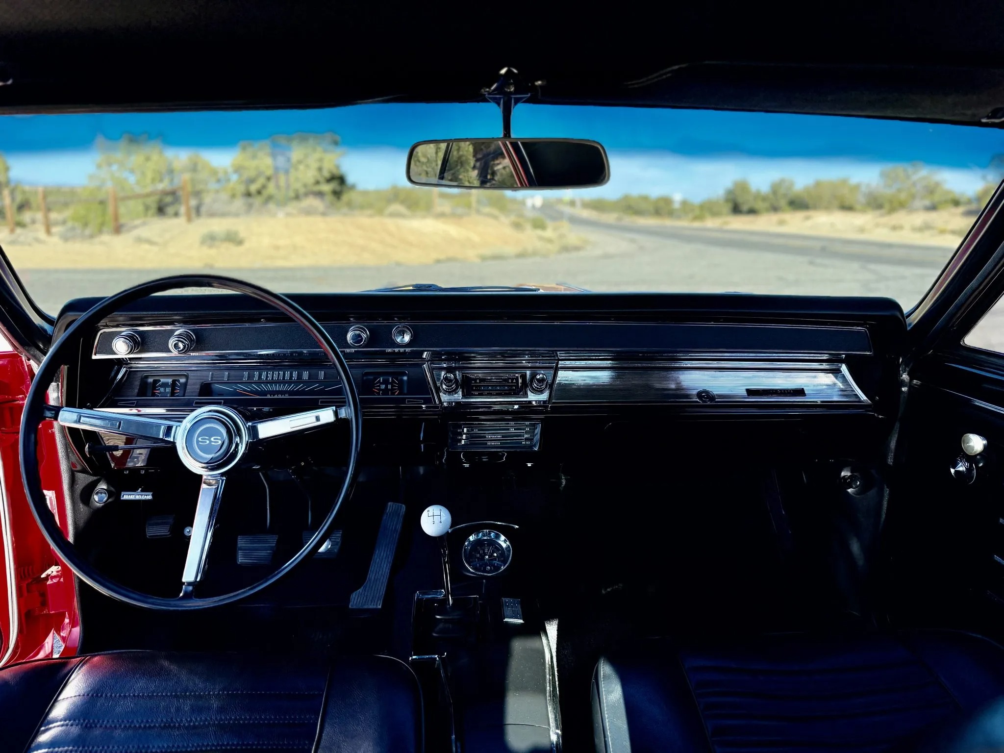 It is powered by a 396ci V8 linked with a four-speed manual transmission and a Positraction limited-slip rear differential, and it is finished in Bolero Red over black vinyl upholstery. Features include a black vinyl roof covering, chrome bumpers with overriders, dual side mirrors, power-assisted brakes, power steering, a front and rear coil-spring suspension, 15″ steel wheels with chrome trim rings, front bucket seats, a Hurst shifter an retro-style digital stereo, a Holley intake manifold, long-tube exhaust headers and Flowmaster mufflers.