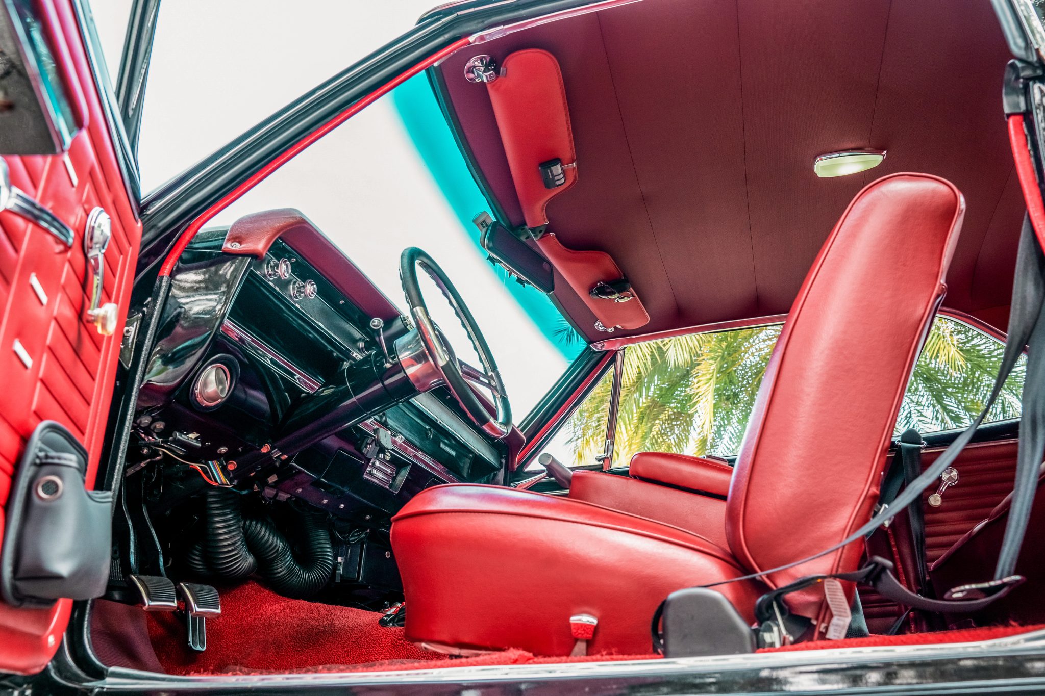 Subsequent work consisted of replacing the transmission rear seal, fuel tank lock ring, oil dipstick seal, lower radiator hose, and the radiator and electric cooling fan. Power is provided by a a 502ci Ram Jet V8 mated to a Tremec five-speed manual transmission and the car is finished in black over red vinyl upholstery. Equipment includes quick-ratio power steering, power four-wheel disc brakes, front coilovers, Hotchkis Sport front and rear sway bars, 17 and 18″ US Mags wheels, air conditioning, a Hurst T-handle shifter, a retro-style digital stereo, a custom audio system, and Dakota Digital instrumentation.