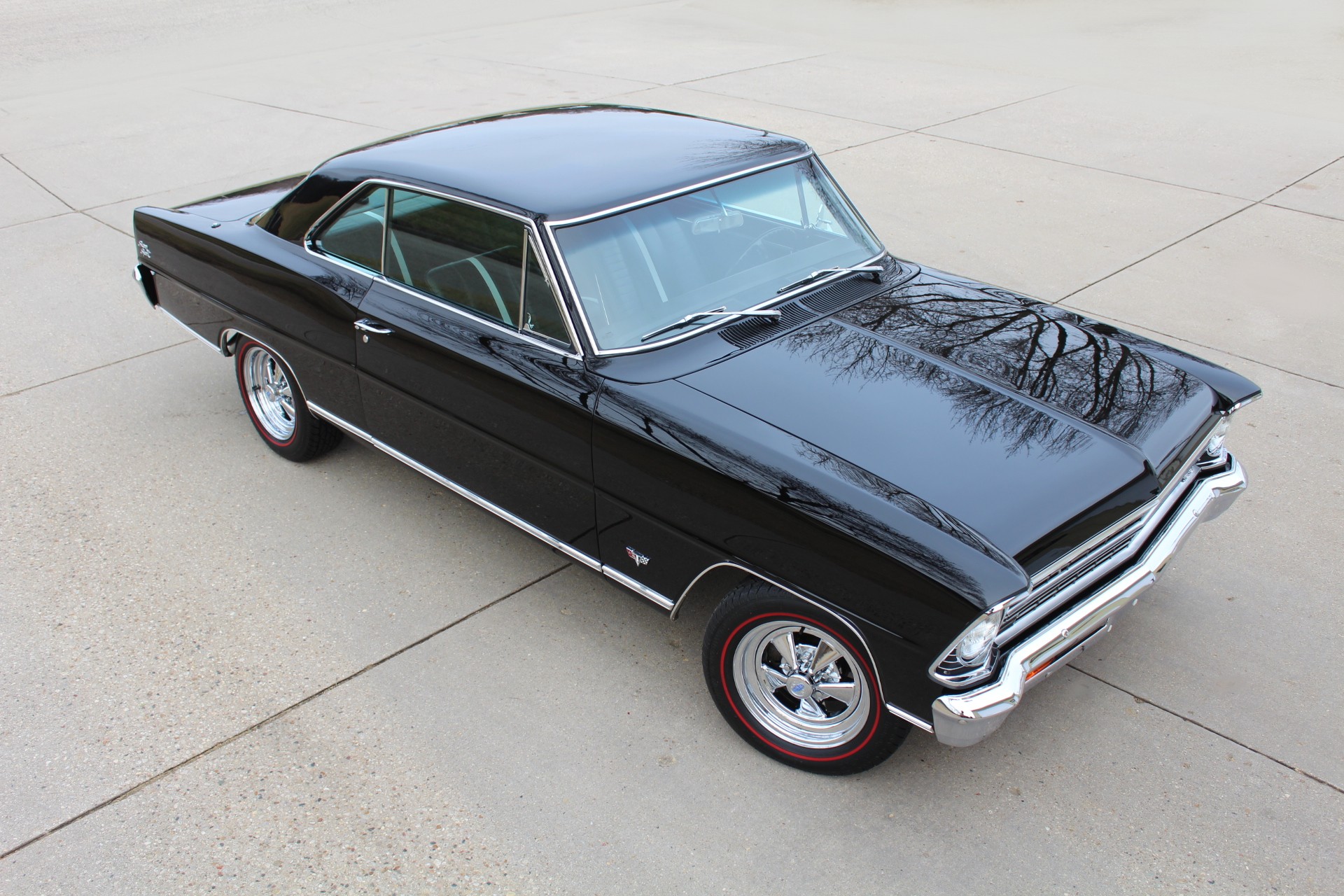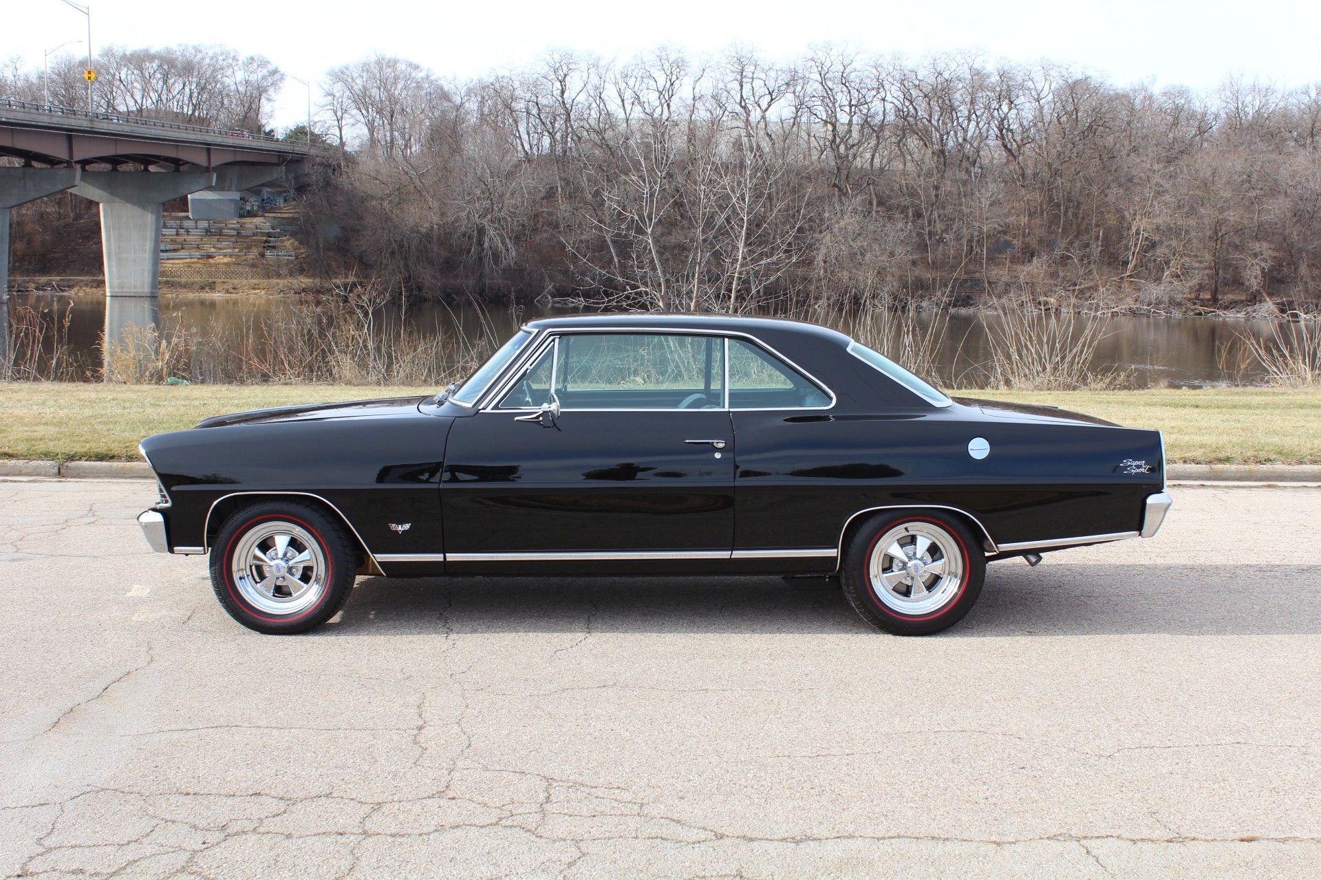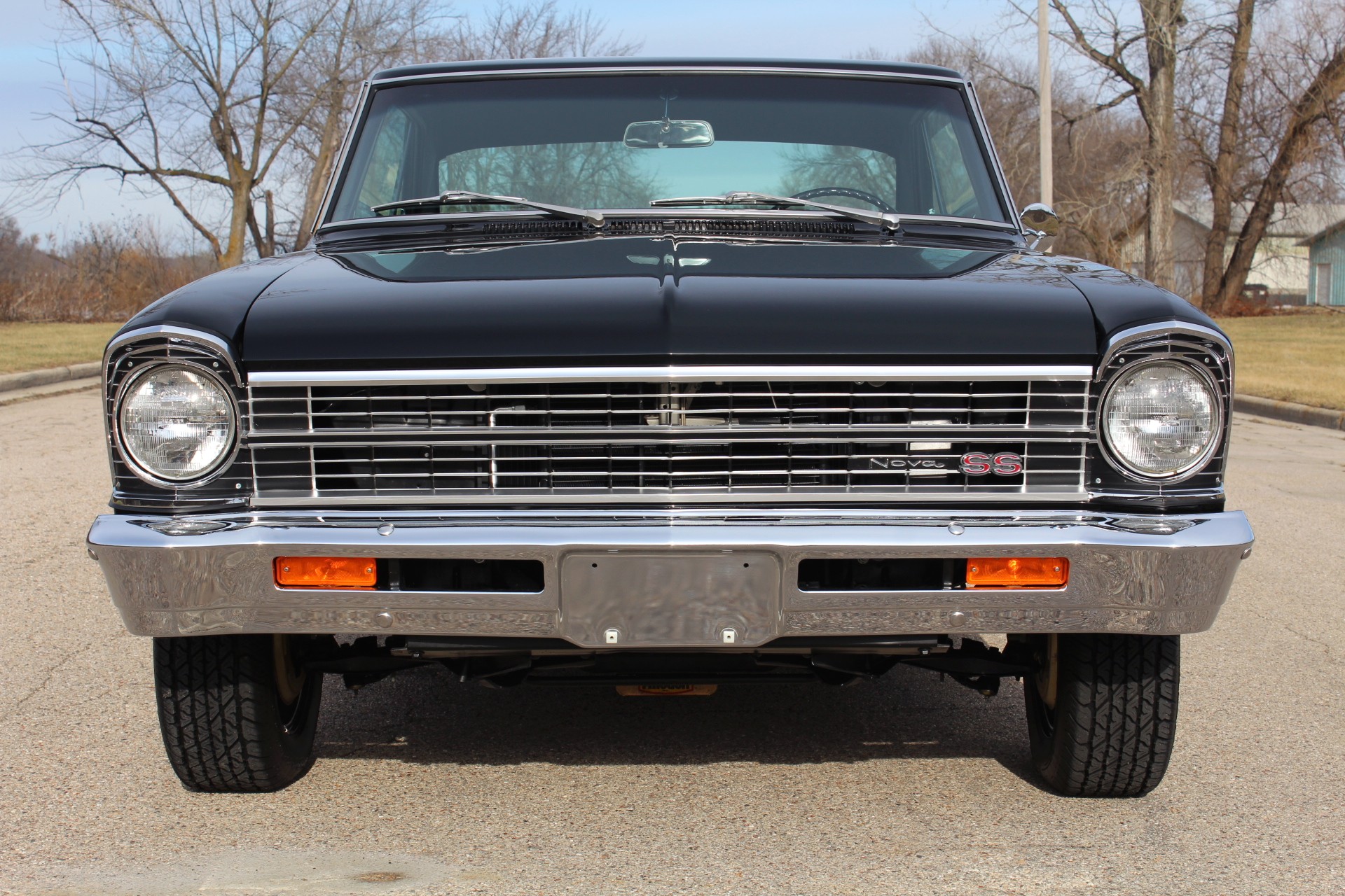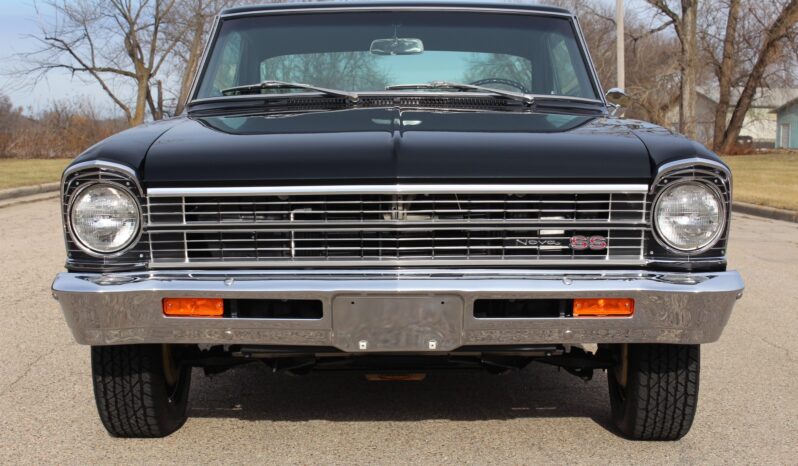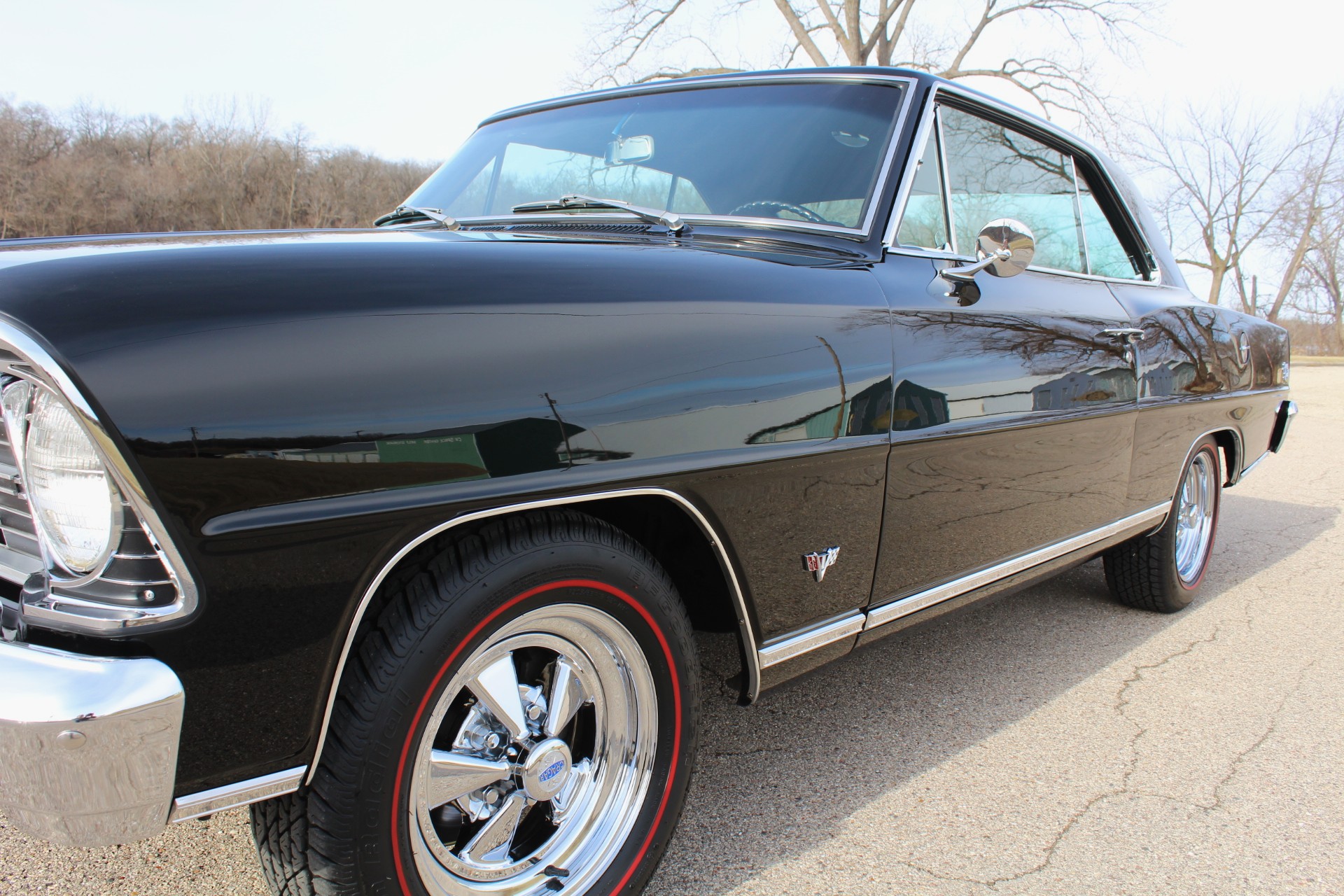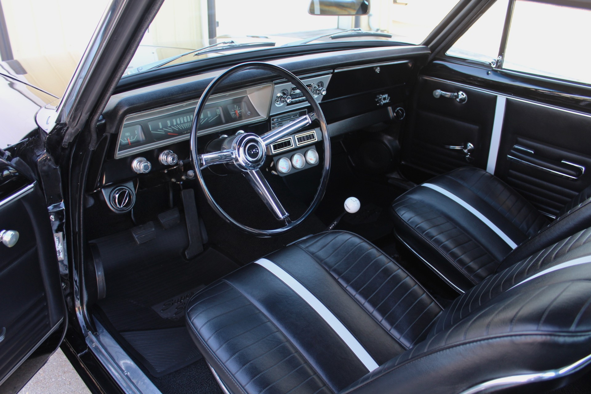This 1967 Chevrolet Chevy II Nova SS two-door sport coupe underwent refurbishment in 2015, and which point a 350ci ZZ4 crate V8 was installed and fitted with an Edelbrock carburetor and intake manifold as well as an MSD distributor and an aluminum radiator. Power is routed through a Muncie M20 wide-ratio four-speed manual transmission, a PosiTraction differential, and 3.36:1 gears, and Doug’s headers are linked to MagnaFlow mufflers. It was repainted in black, and the glass, weather seals, and emblems were replaced, and the exterior trim was refurbished. Equipment includes traction bars, subframe connectors, 15″ Cragar wheels, and four-wheel disc brakes, and the cabin is outfitted with replacement black vinyl upholstery, Vintage Air climate control, a Hurst shifter, and a retro-look Bluetooth stereo.