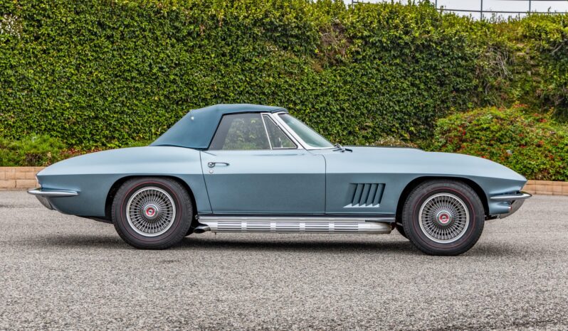 Power is provided by a 427ci V8 that is backed by a four-speed manual transmission. Finished from the factory in Elkhart blue over teal upholstery, the car is equipped with a medium blue soft top, 15″ turbine-style wheels, four-wheel power-assisted disc brakes, and side-exit exhaust pipes in addition to power steering, power windows, and a push-button AM/FM radio.