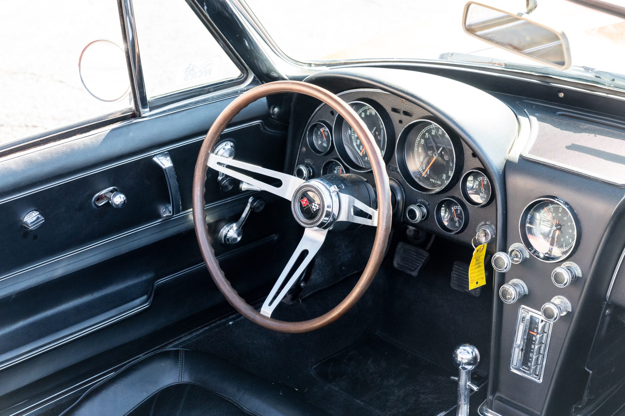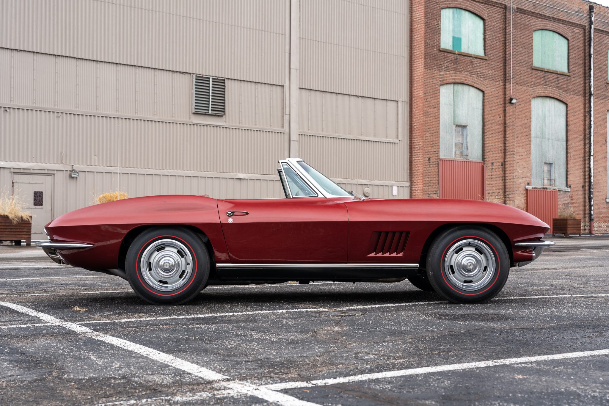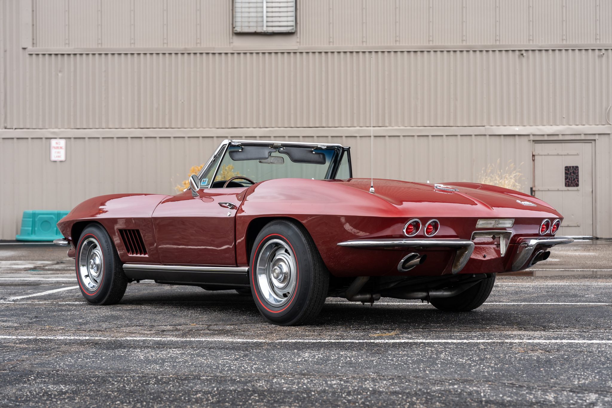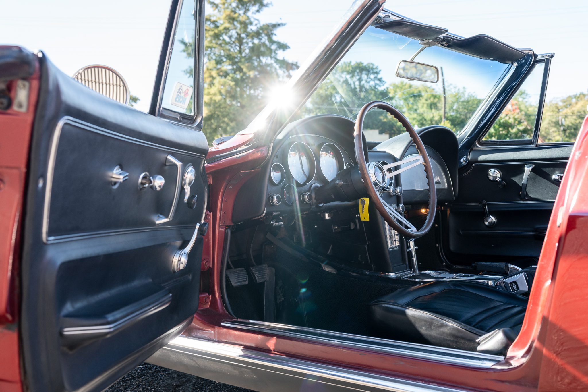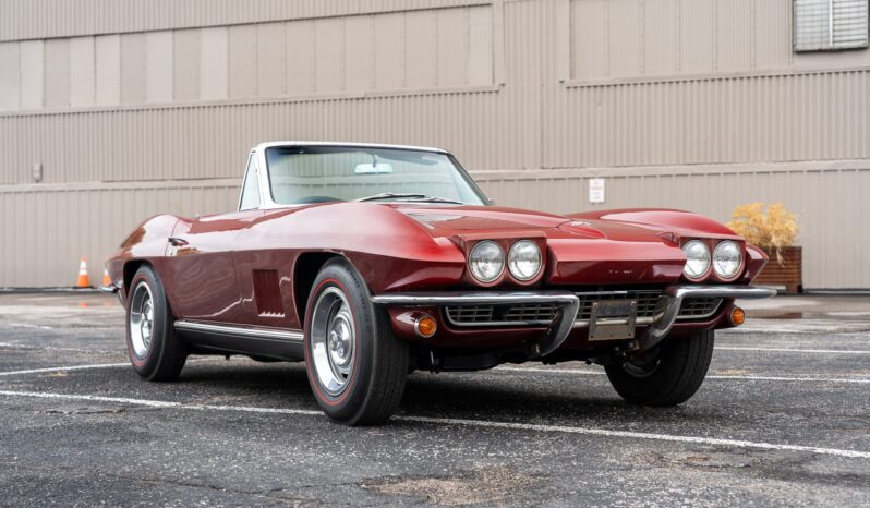 The 327ci L79 V8 was rebuilt The body wears decades-old maroon paint, and the interior is trimmed in black with leather seat upholstery. Equipment includes a four-speed manual transmission, a Positraction differential, four-wheel disc brakes, 15″ Rally wheels with redline tires, a dual exhaust system, a telescoping steering wheel, and an AM/FM radio. This Corvette convertible is now offered with a copy of its original title document, its tank sticker