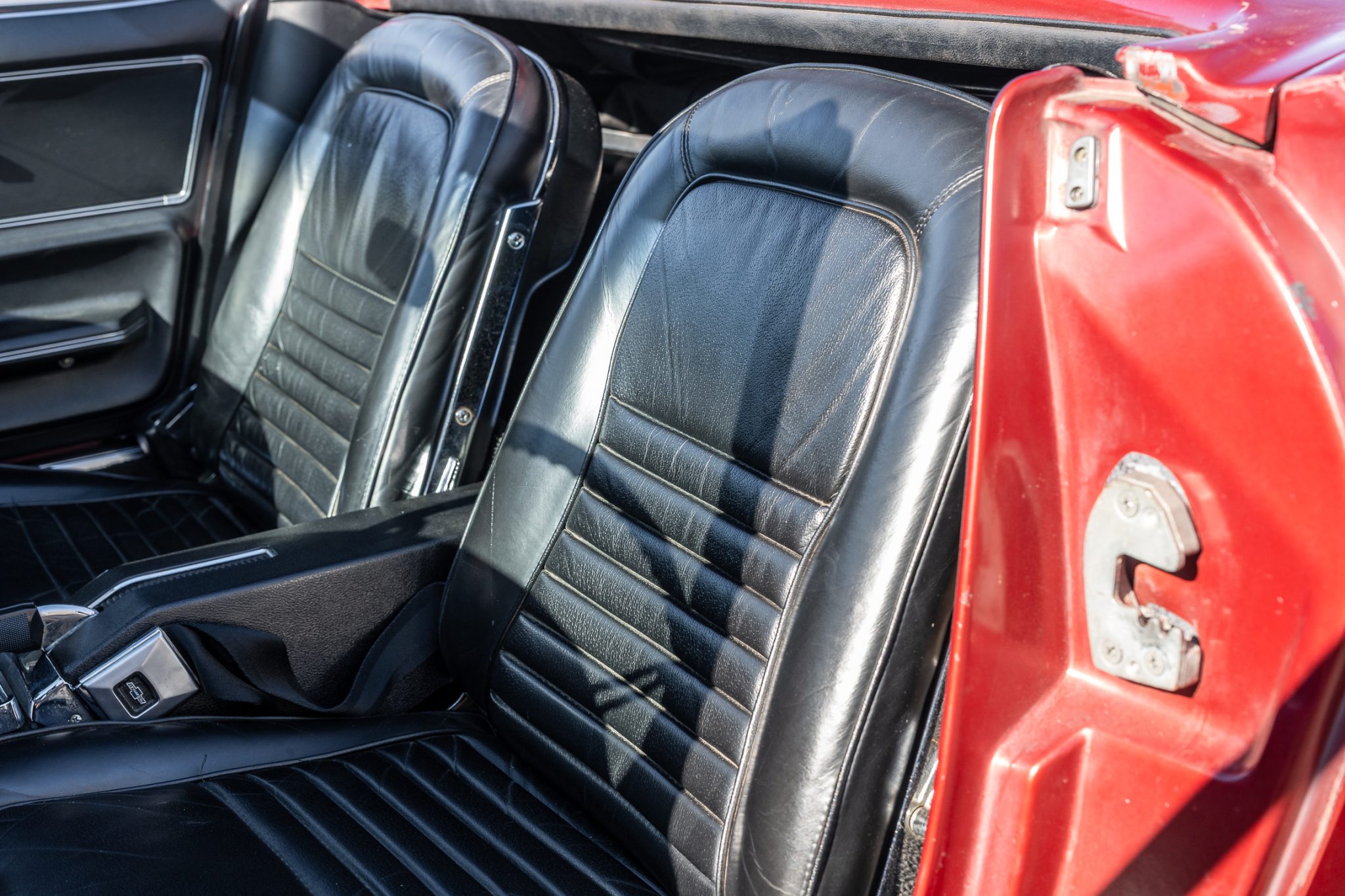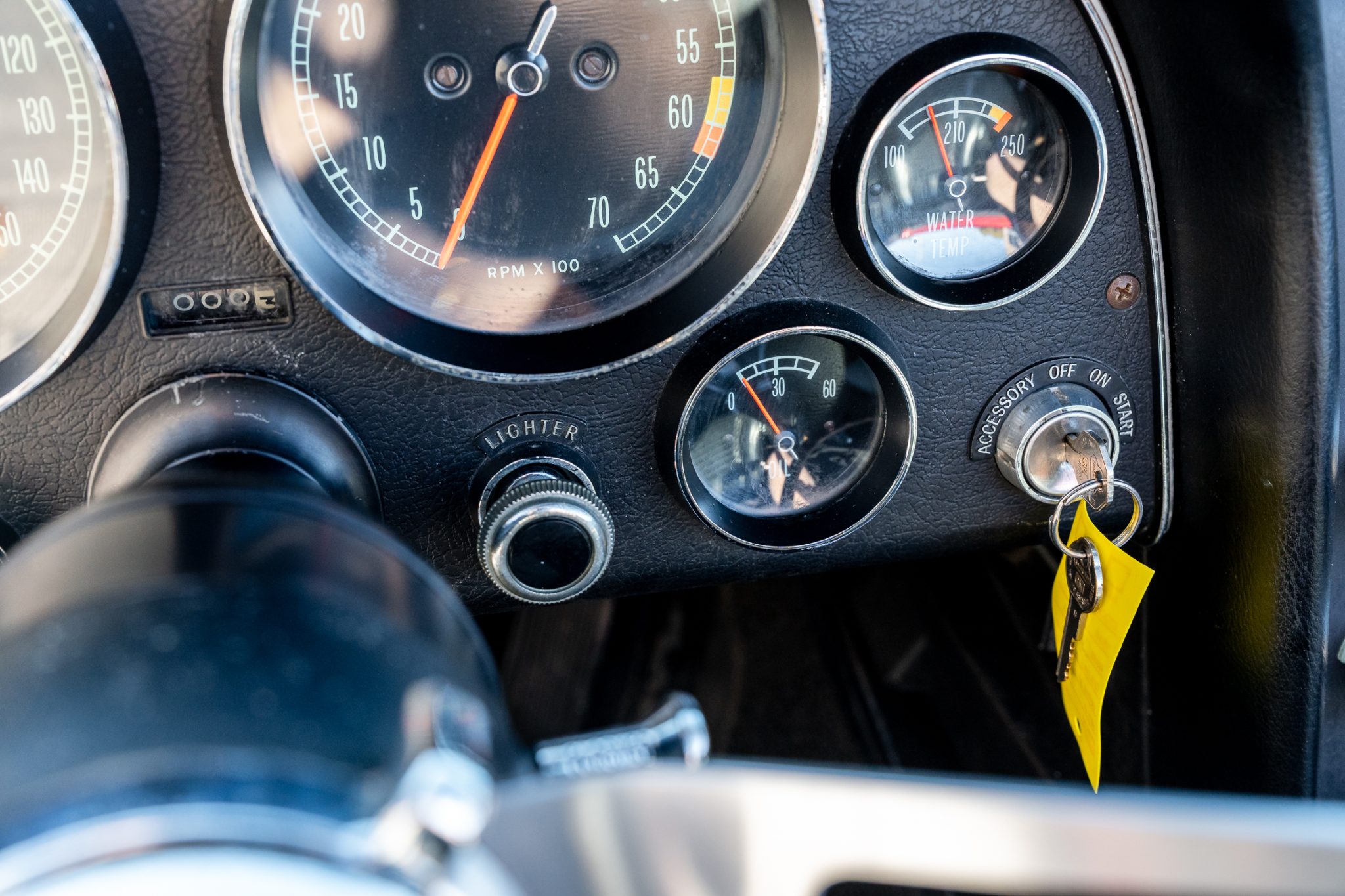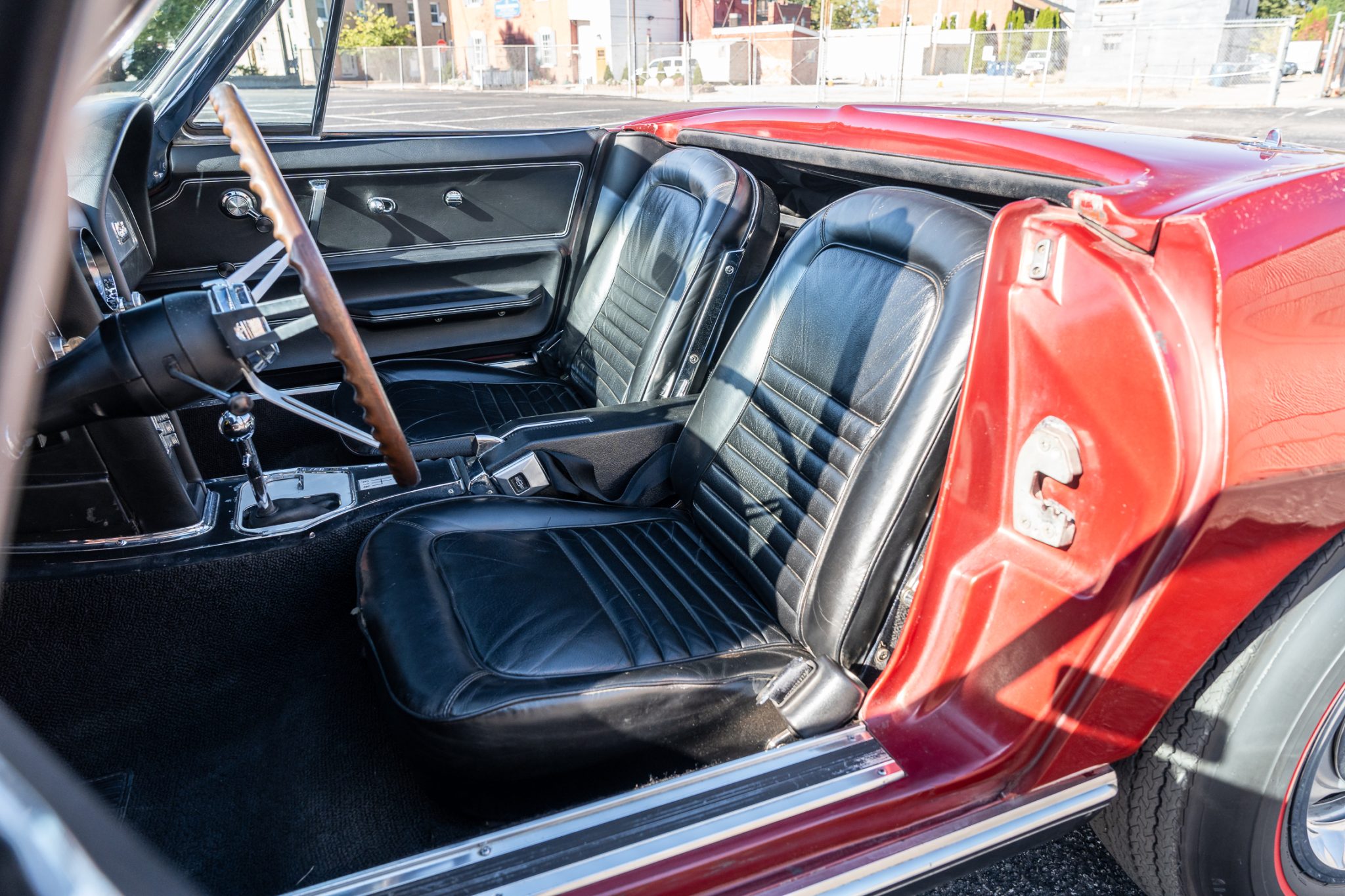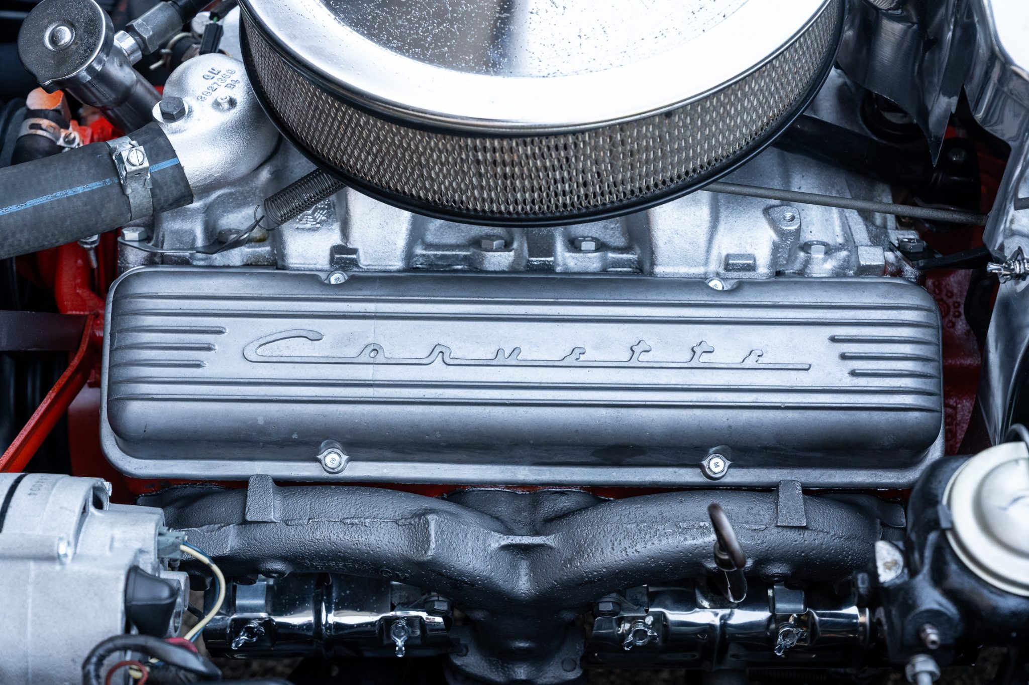 The 327ci L79 V8 was rebuilt The body wears decades-old maroon paint, and the interior is trimmed in black with leather seat upholstery. Equipment includes a four-speed manual transmission, a Positraction differential, four-wheel disc brakes, 15″ Rally wheels with redline tires, a dual exhaust system, a telescoping steering wheel, and an AM/FM radio. This Corvette convertible is now offered with a copy of its original title document, its tank sticker