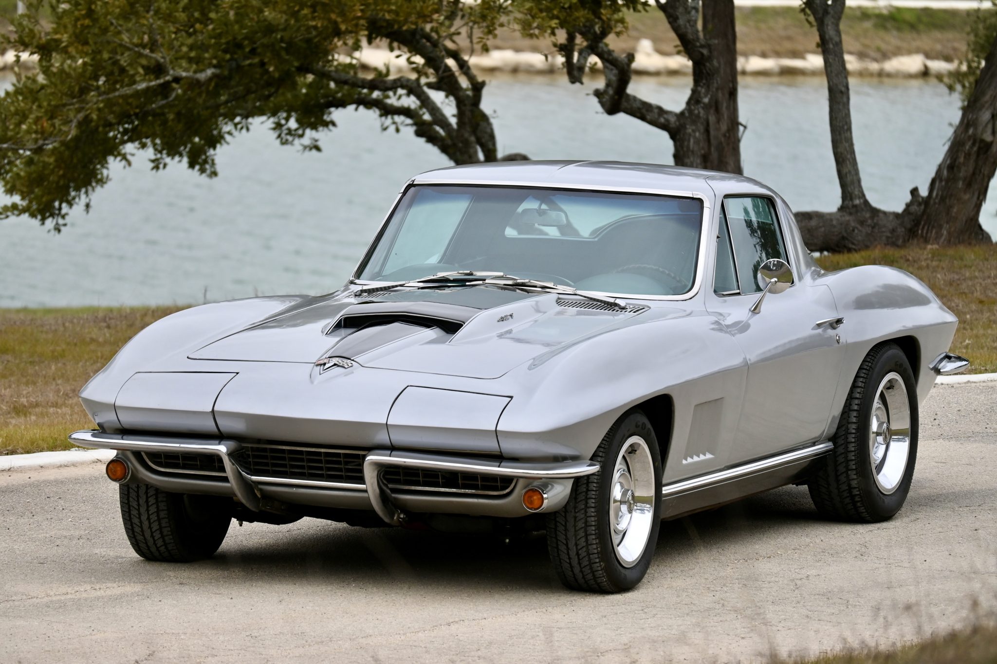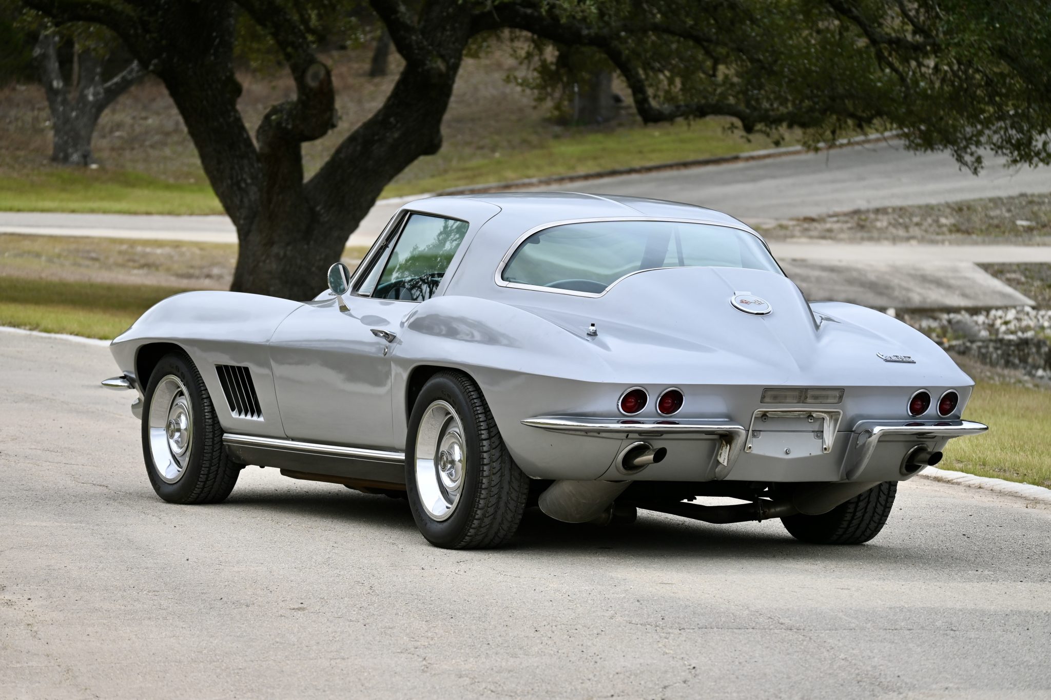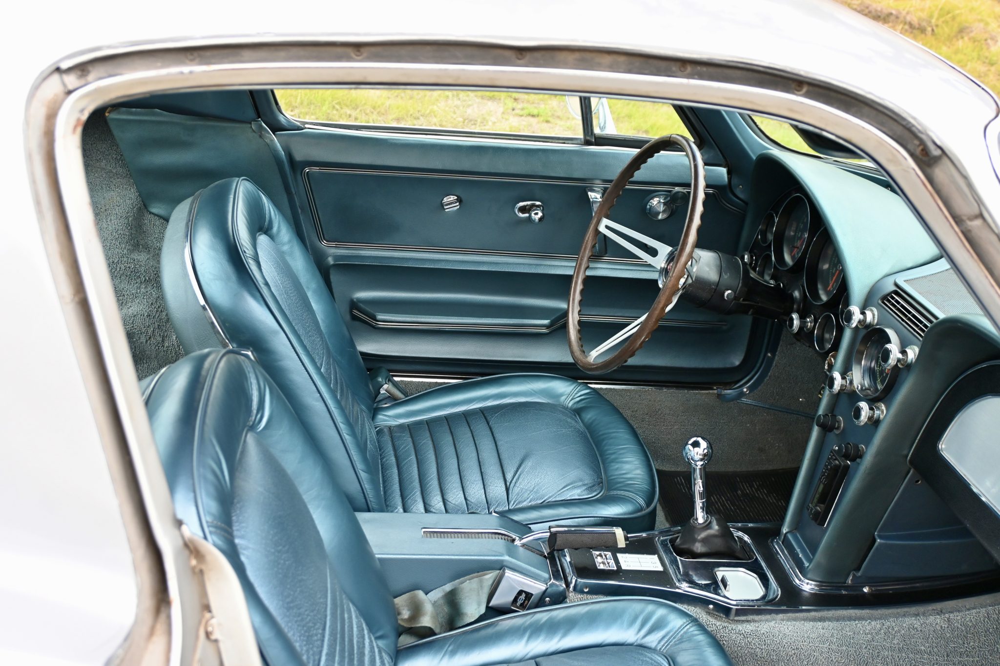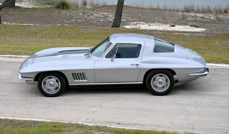 This 1967 Chevrolet Corvette coupe had a 454ci V8 installed and a five-speed manual transmission installed The car is finished in silver over Teal Blue leather upholstery and features three Holley two-barrel carburetors, Hooker Super Competition exhaust headers, a Positraction differential, 15″ Rally wheels, power-assisted four-wheel disc brakes, power steering, power windows, a cassette stereo, Panasonic rear speakers, chrome bumpers, and retractable headlights.