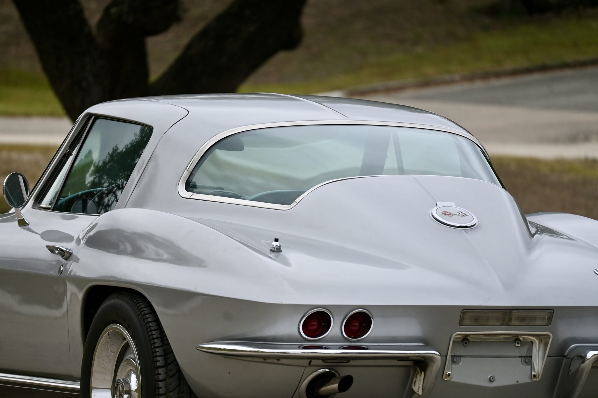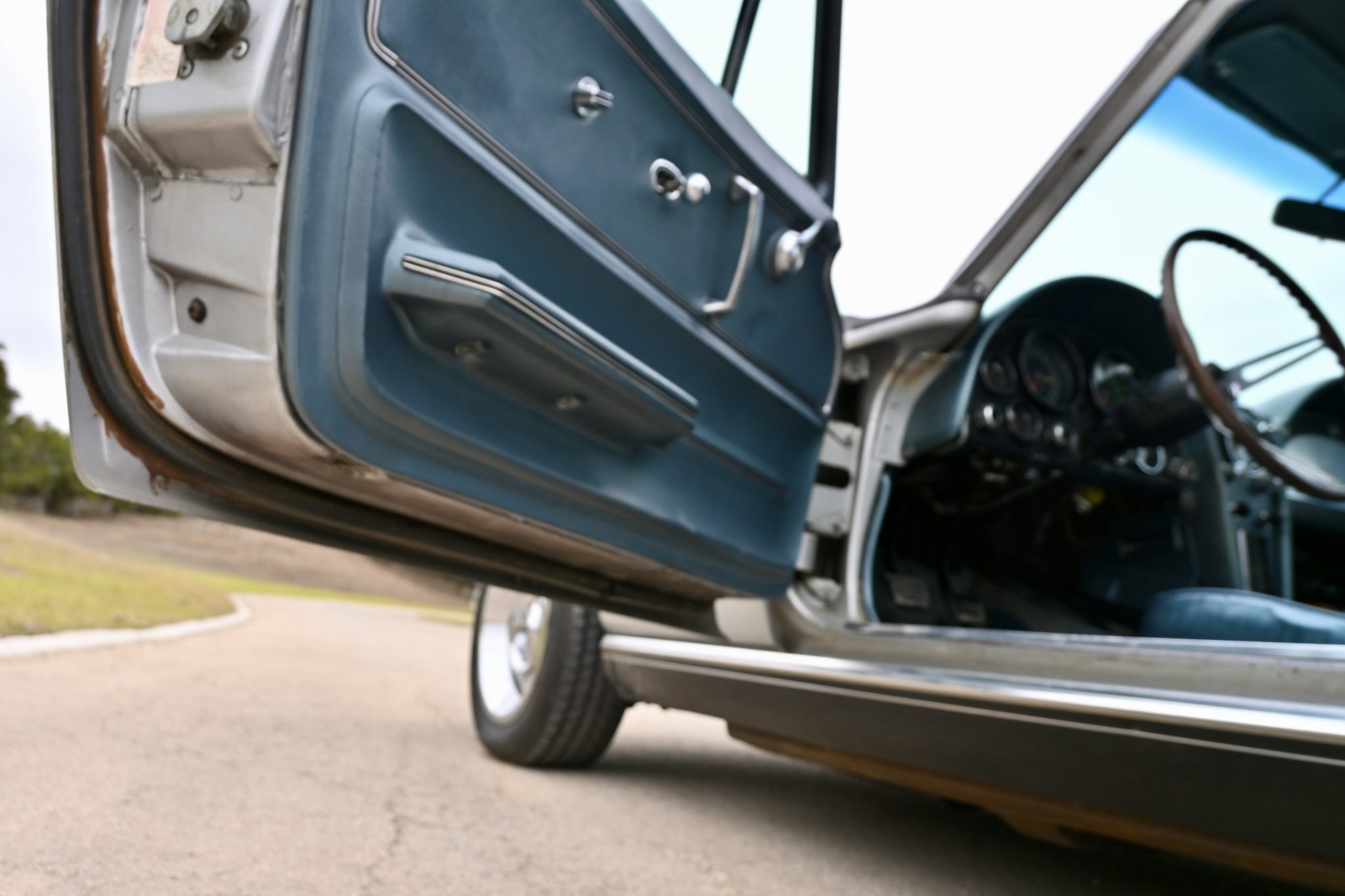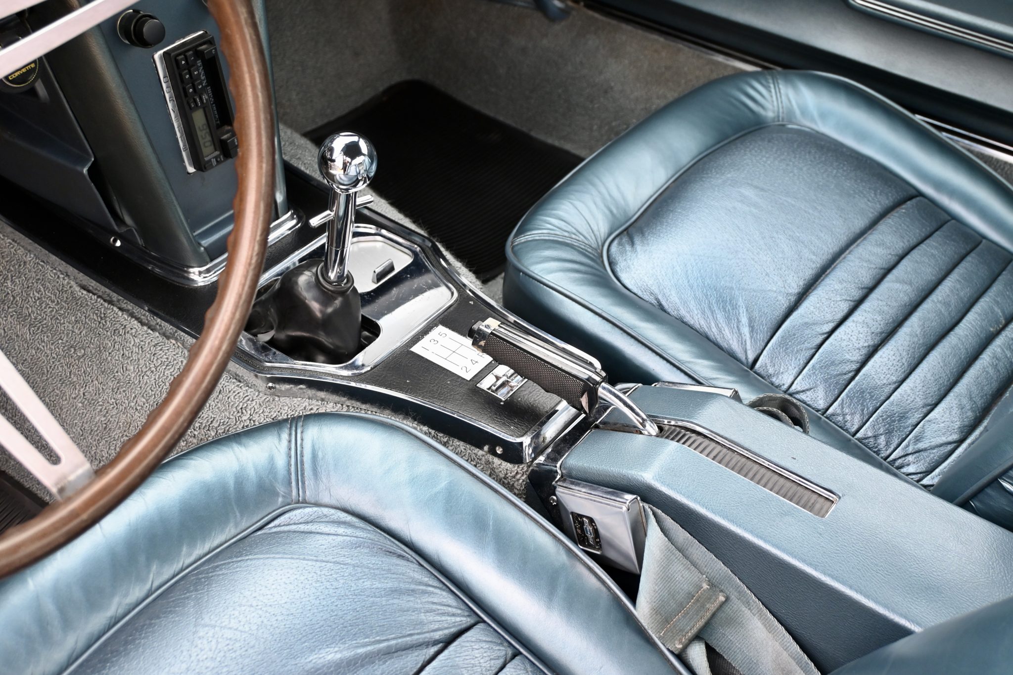 This 1967 Chevrolet Corvette coupe had a 454ci V8 installed and a five-speed manual transmission installed The car is finished in silver over Teal Blue leather upholstery and features three Holley two-barrel carburetors, Hooker Super Competition exhaust headers, a Positraction differential, 15″ Rally wheels, power-assisted four-wheel disc brakes, power steering, power windows, a cassette stereo, Panasonic rear speakers, chrome bumpers, and retractable headlights.