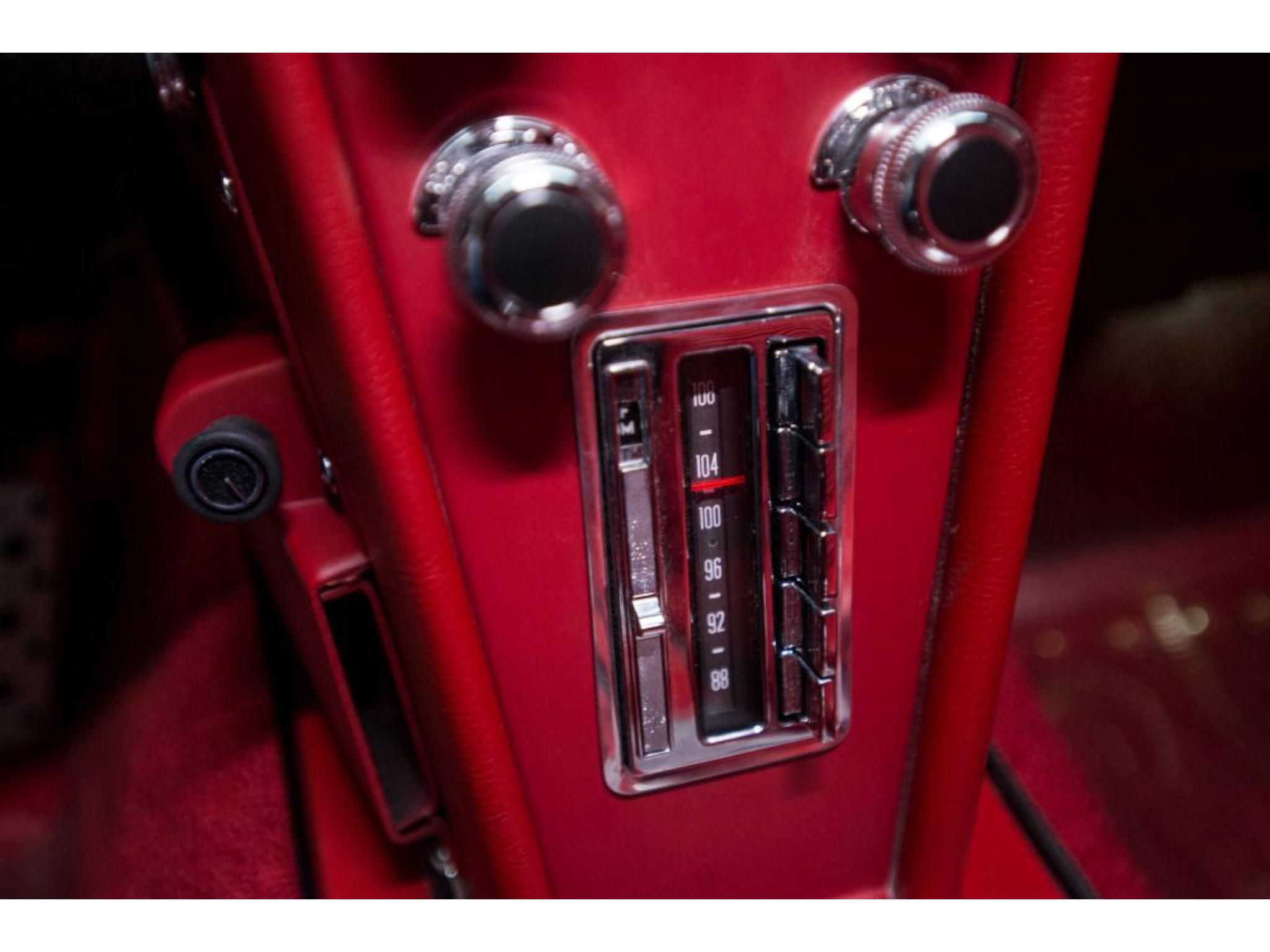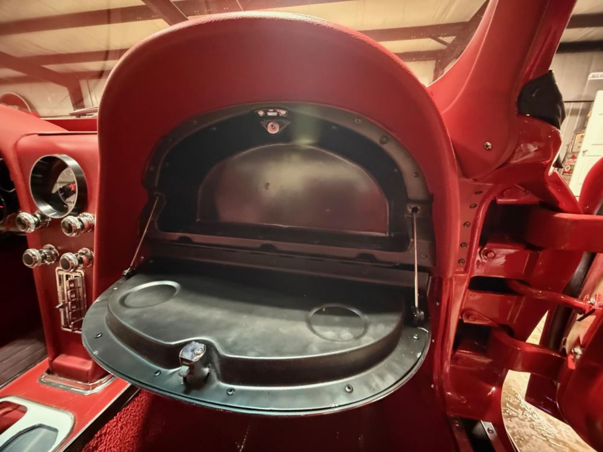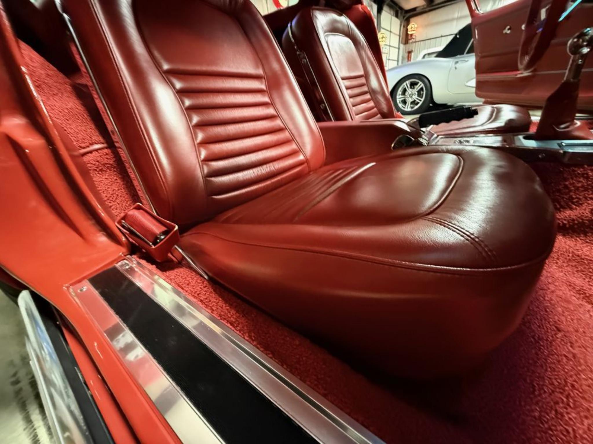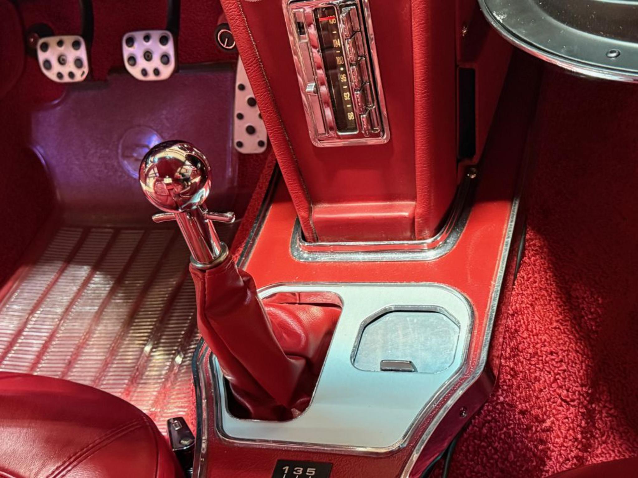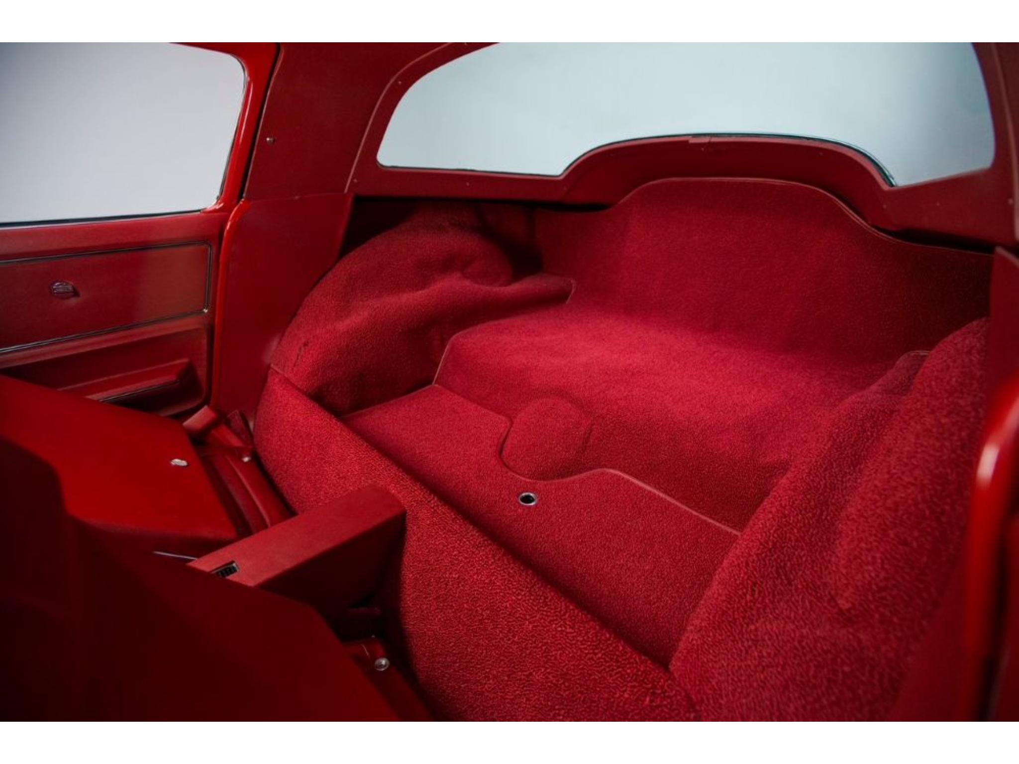 The body was refinished in red and mounted on a Street Shop chassis with C4 Corvette-style suspension components, rack-and-pinion steering, and hydroboost-assisted four-wheel disc brakes. A 6.0-liter LS2 V8 is installed along with a Tremec five-speed manual transmission and a limited-slip differential assembly. Additional build details include a stinger-style hood, side exhaust pipes, 17″ American Racing wheels, Dakota Digital gauges, and a Vintage Air climate control system.
